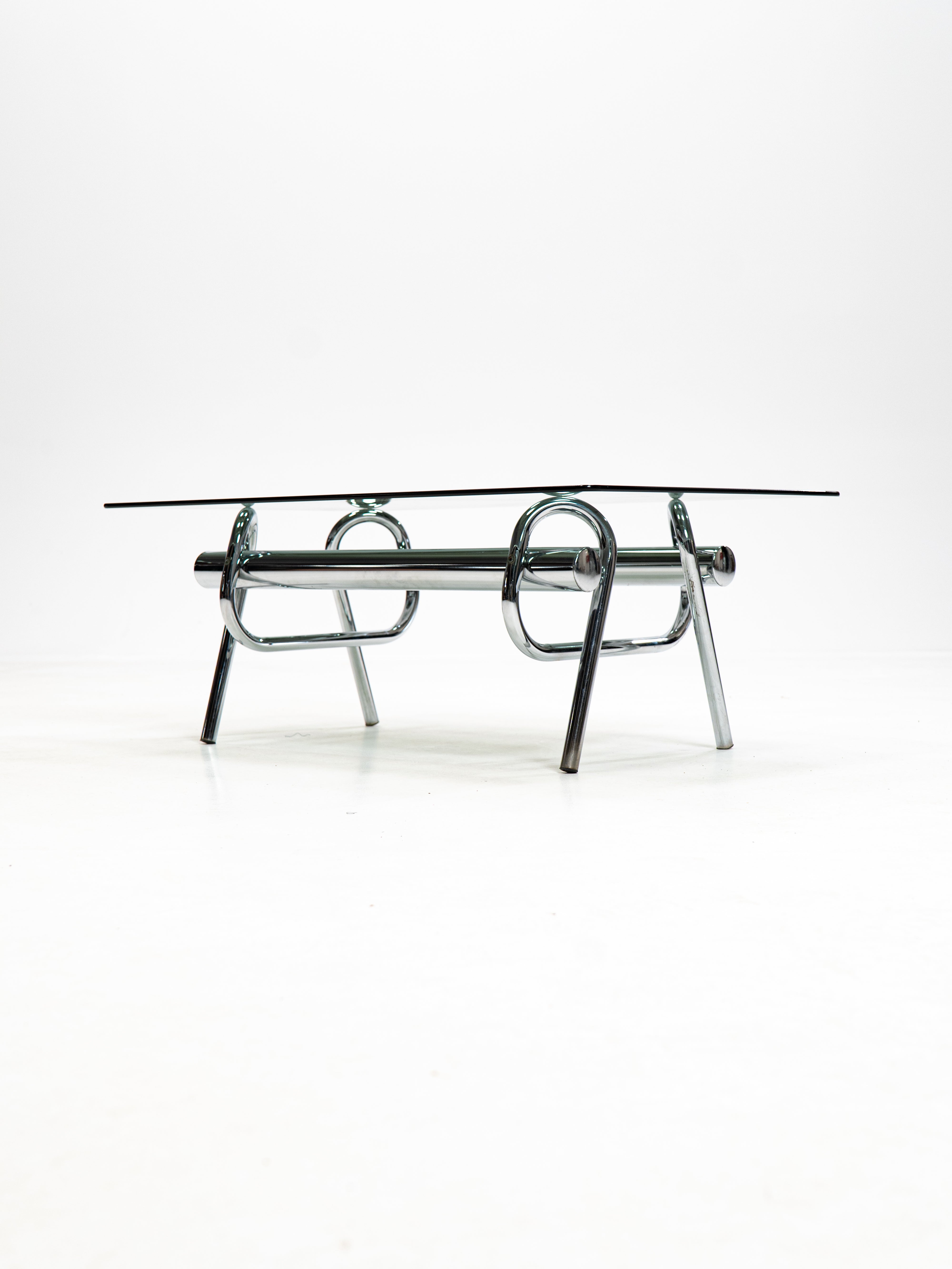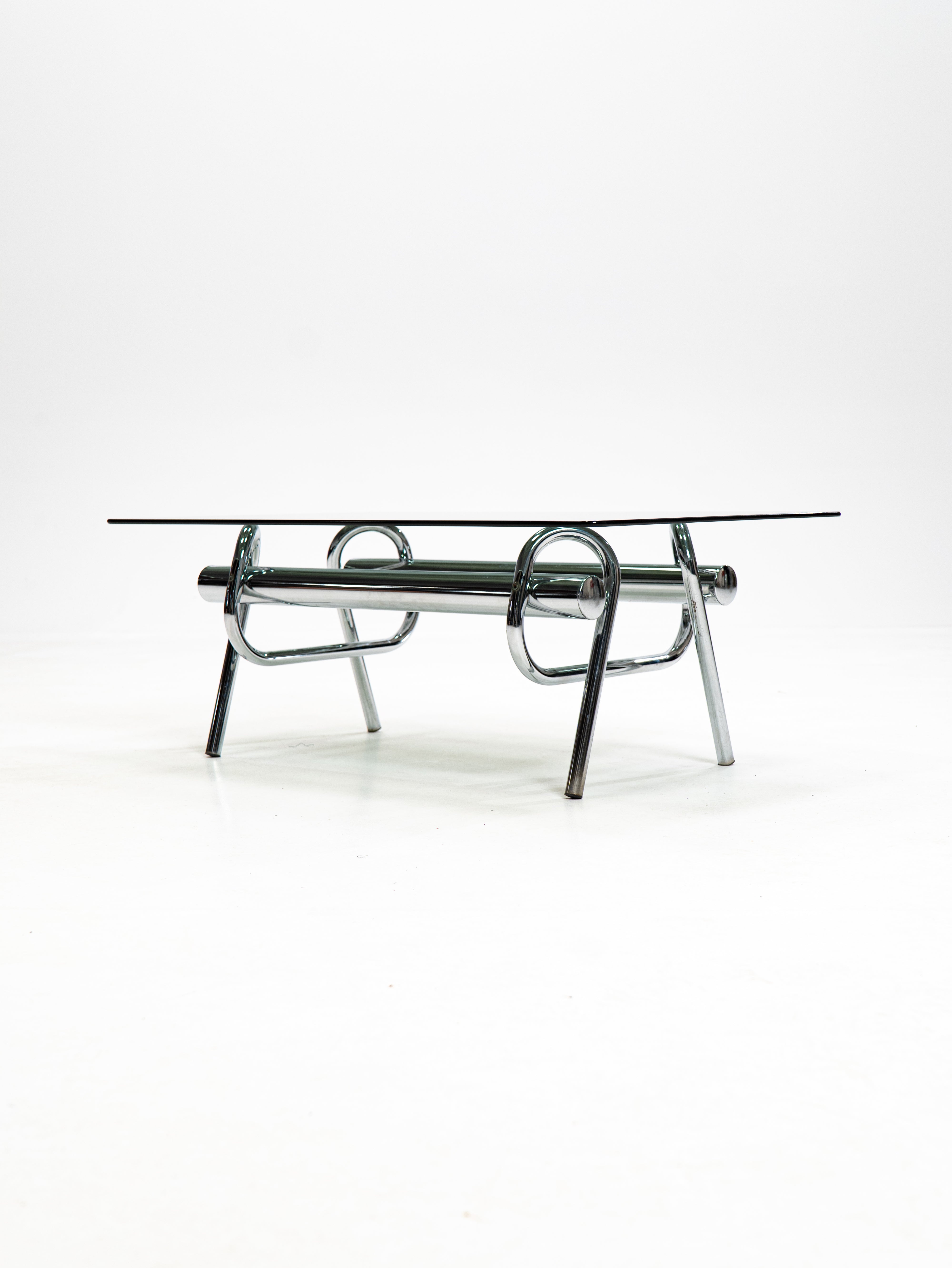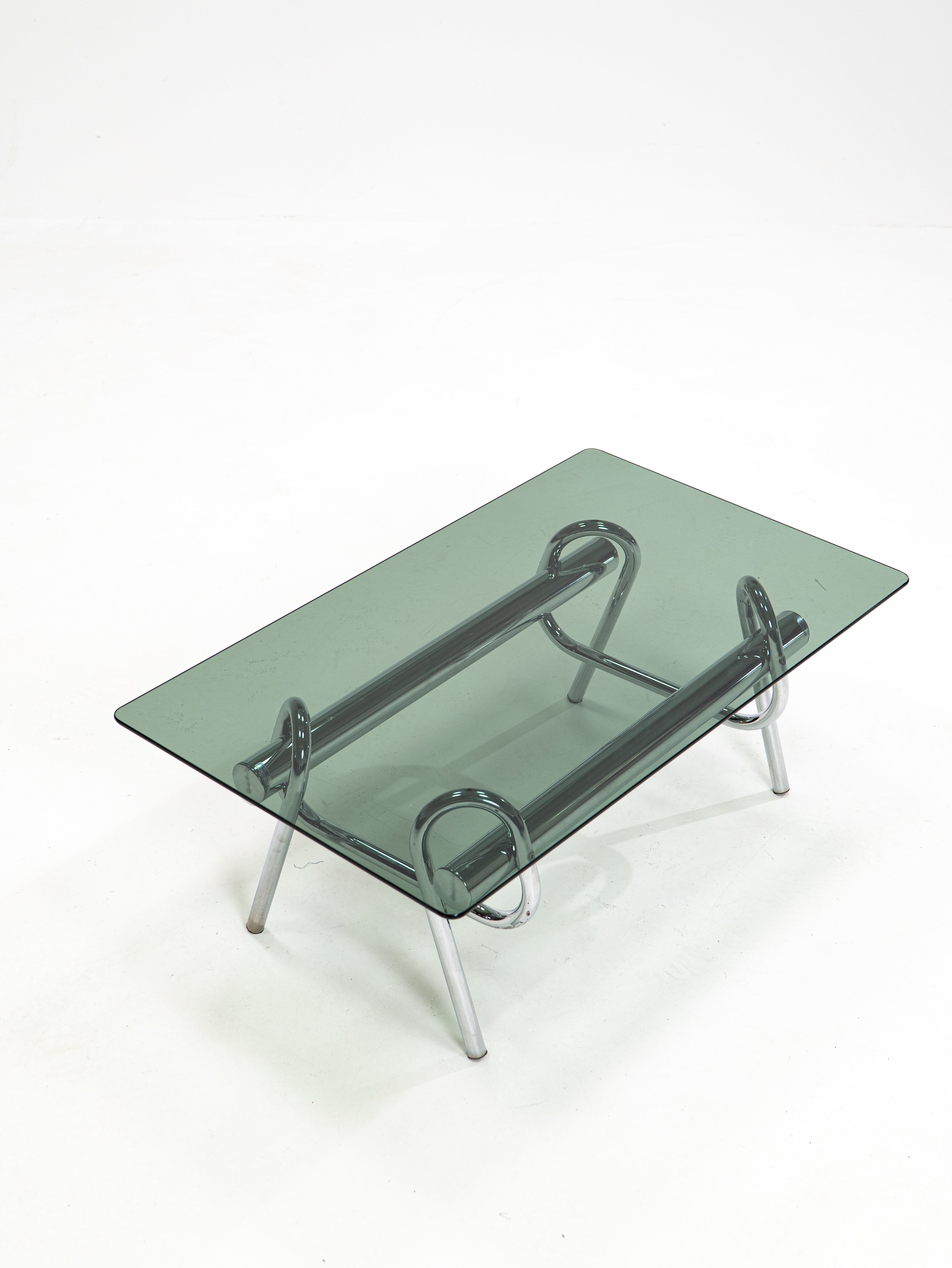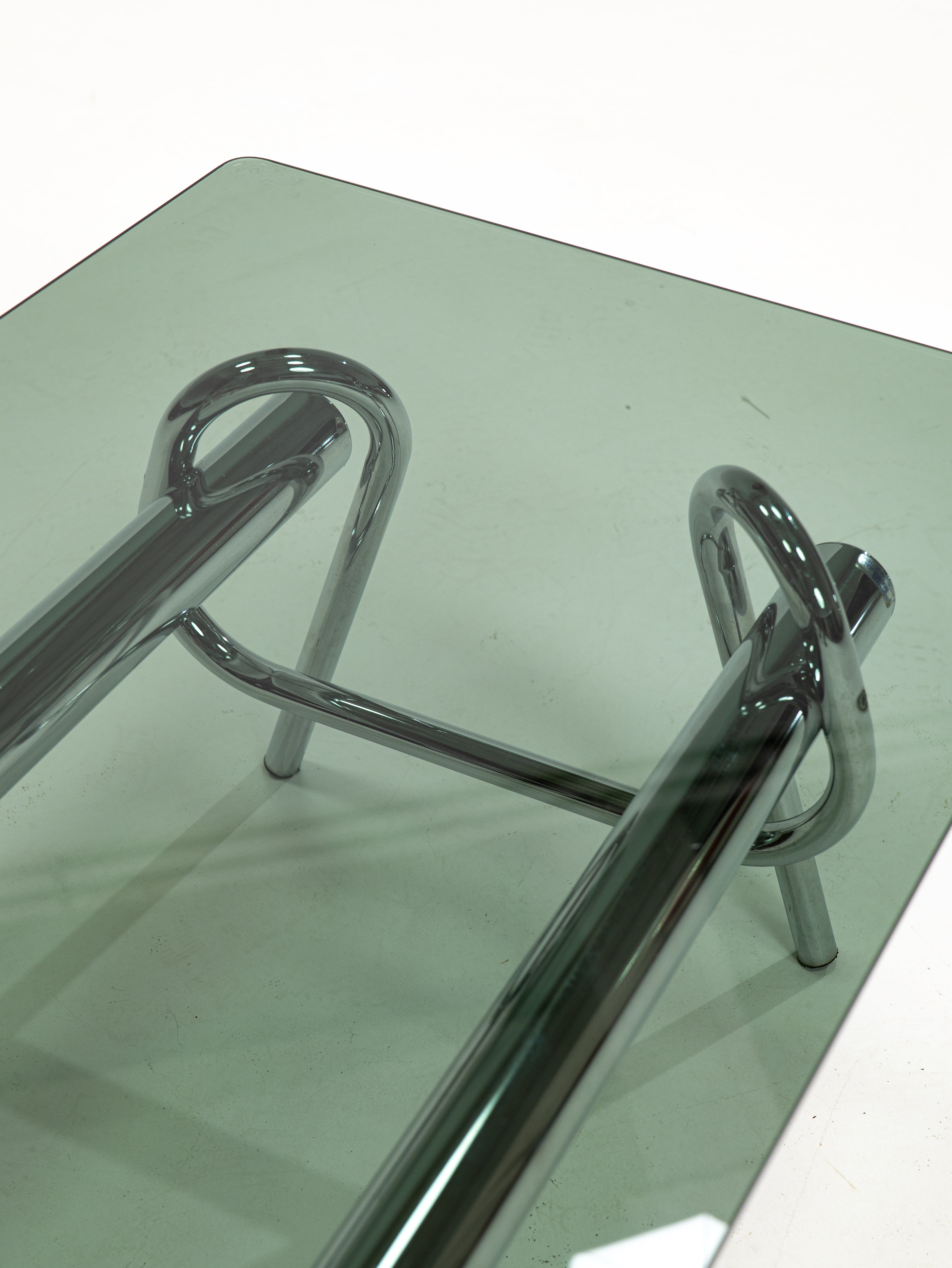 Rare and highly sought after design. In excellent vintage condition. Hard to find a second shelf on any of these seventies pieces, great for storage of magazines etc. Bold horizontal tubes in a dual formation with a wrapped ‘spaghetti style’ loop detail connection the splayed legs.