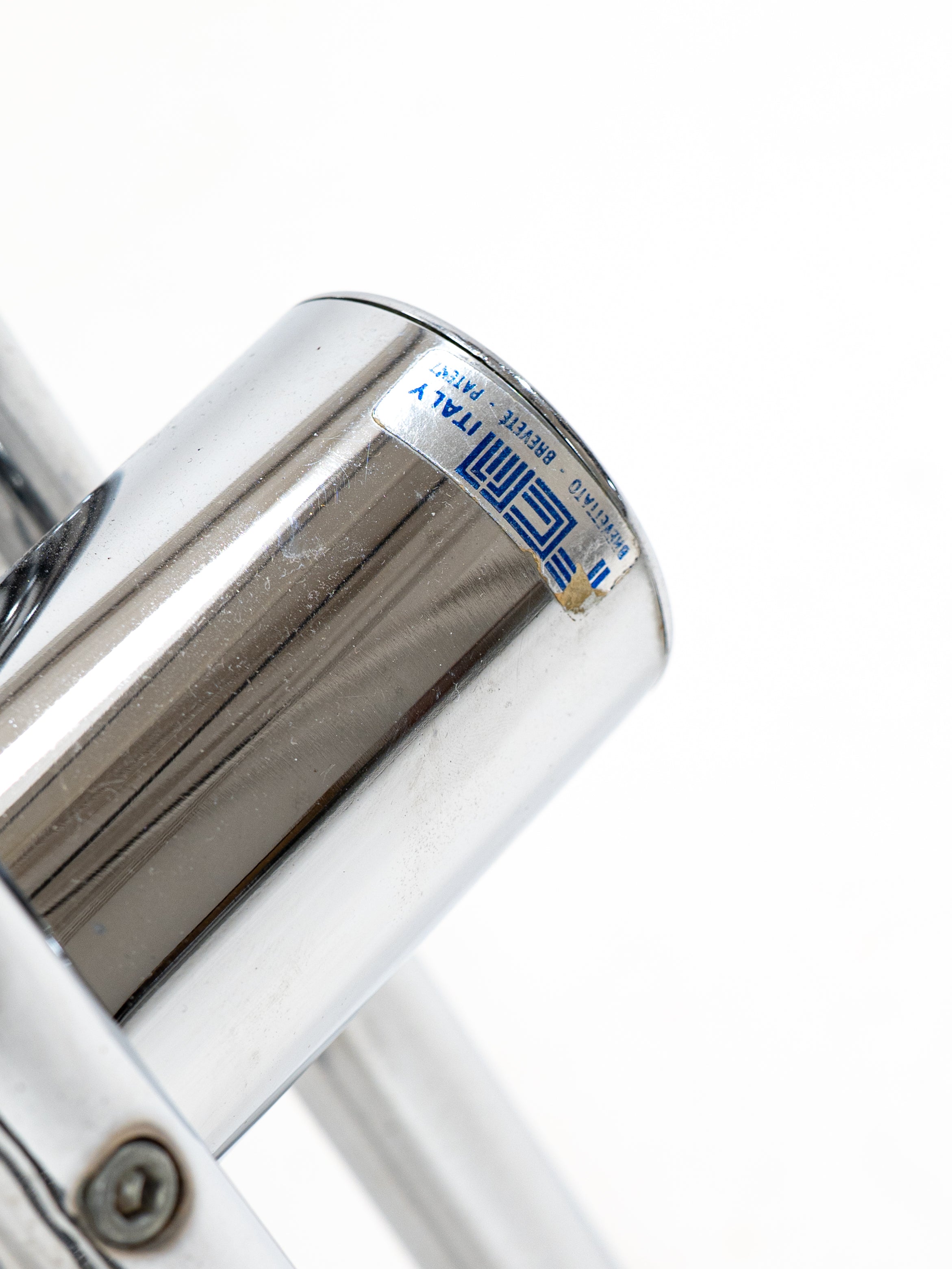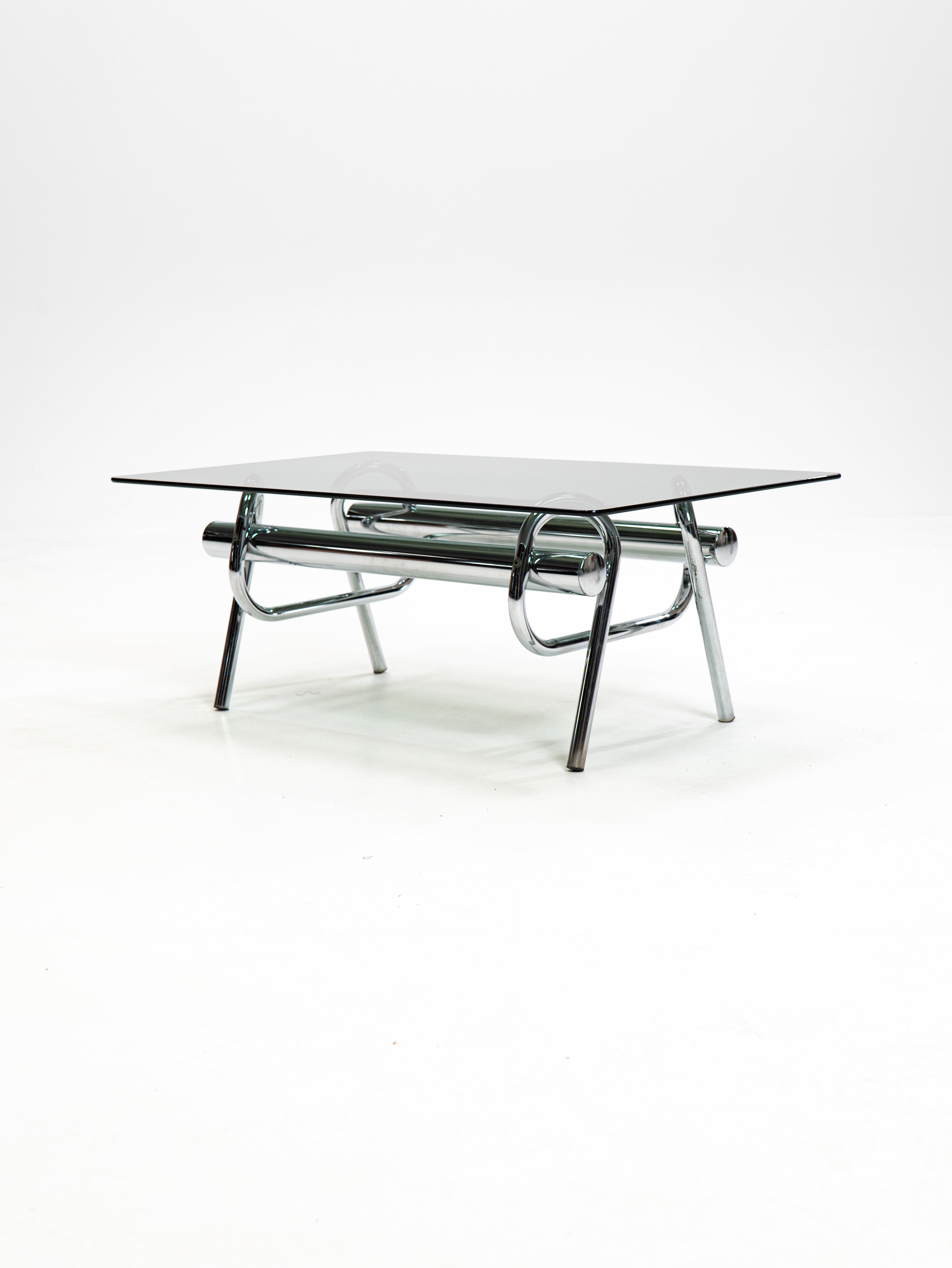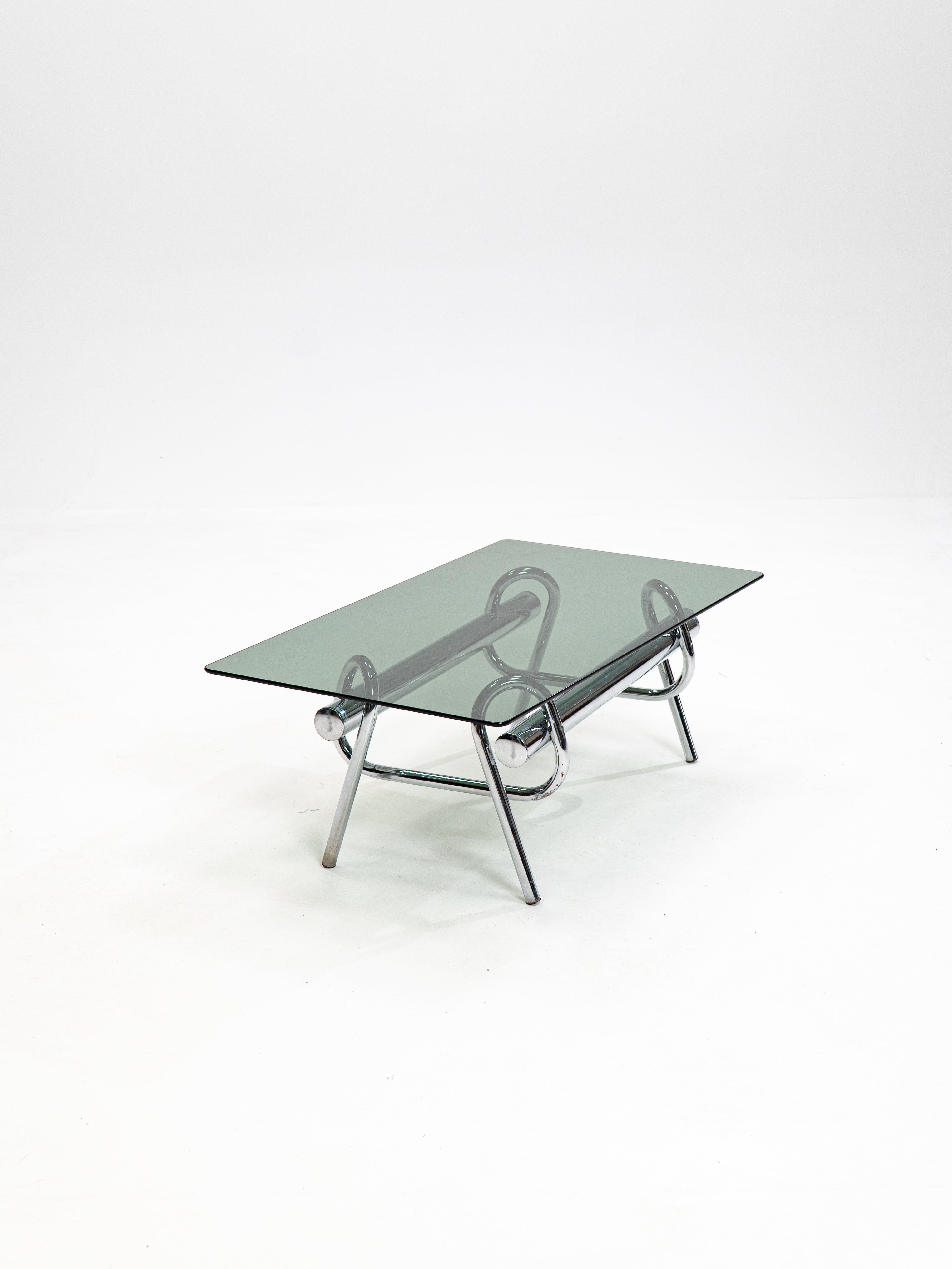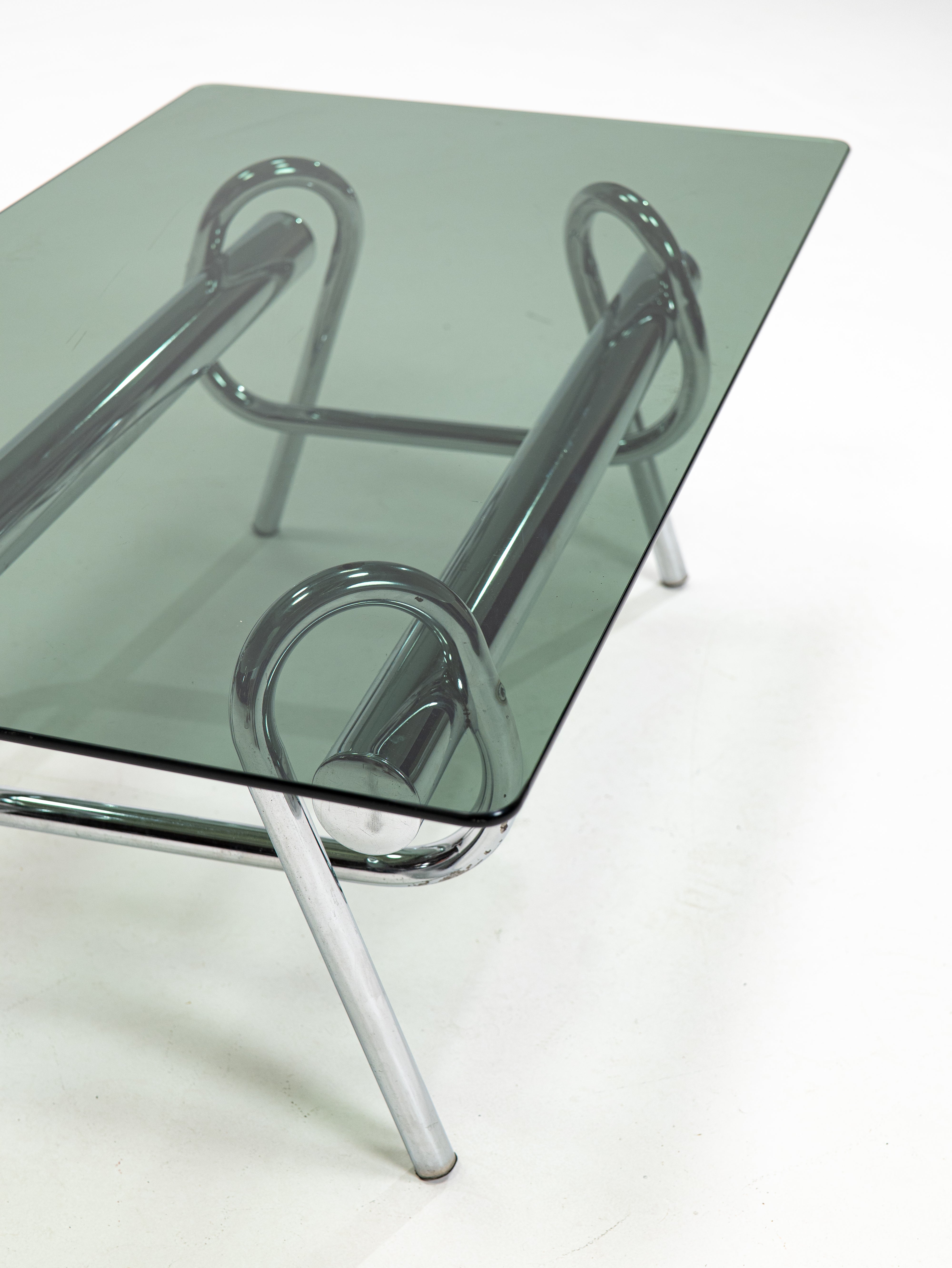 Rare and highly sought after design. In excellent vintage condition. Hard to find a second shelf on any of these seventies pieces, great for storage of magazines etc. Bold horizontal tubes in a dual formation with a wrapped ‘spaghetti style’ loop detail connection the splayed legs.