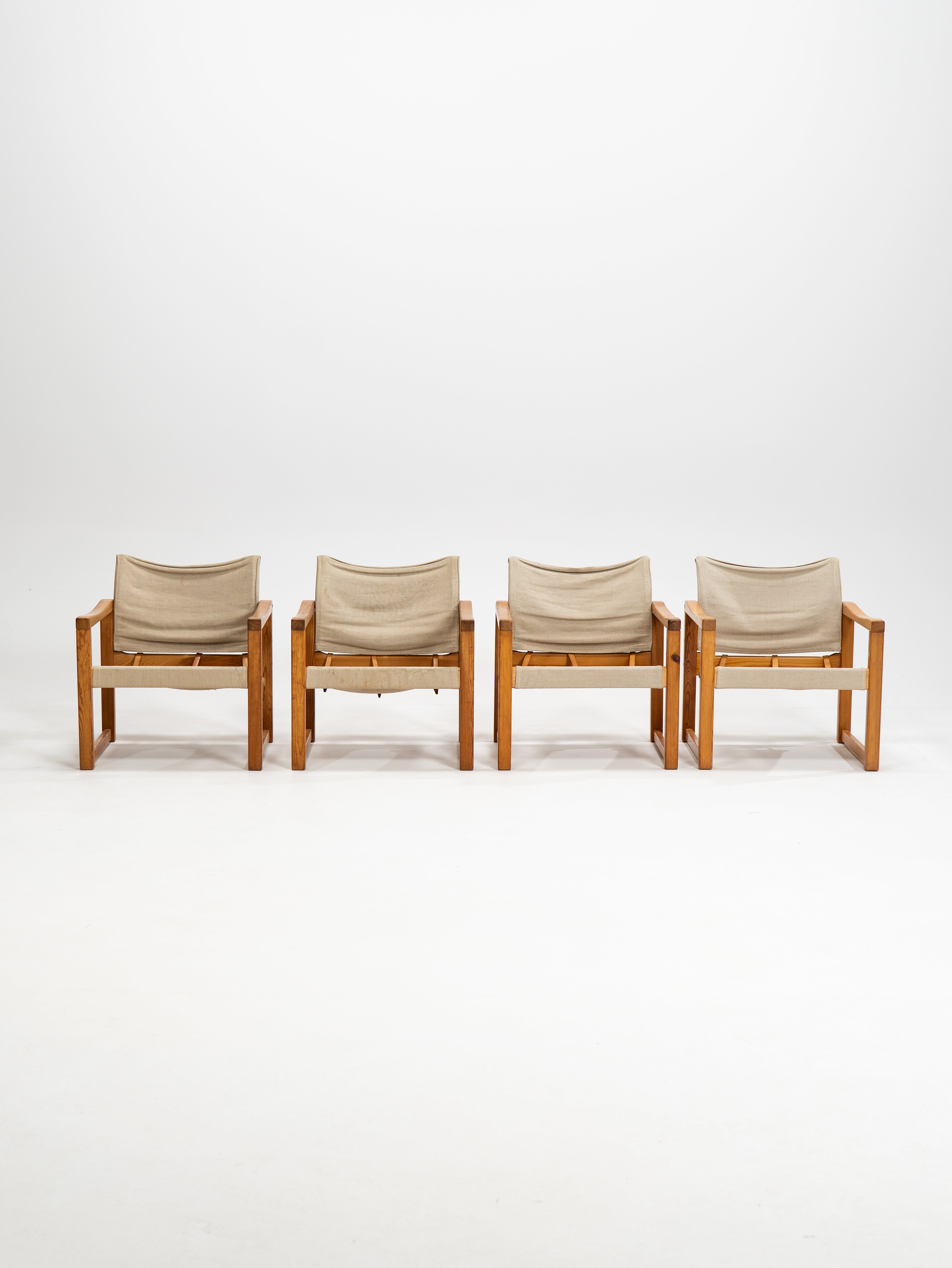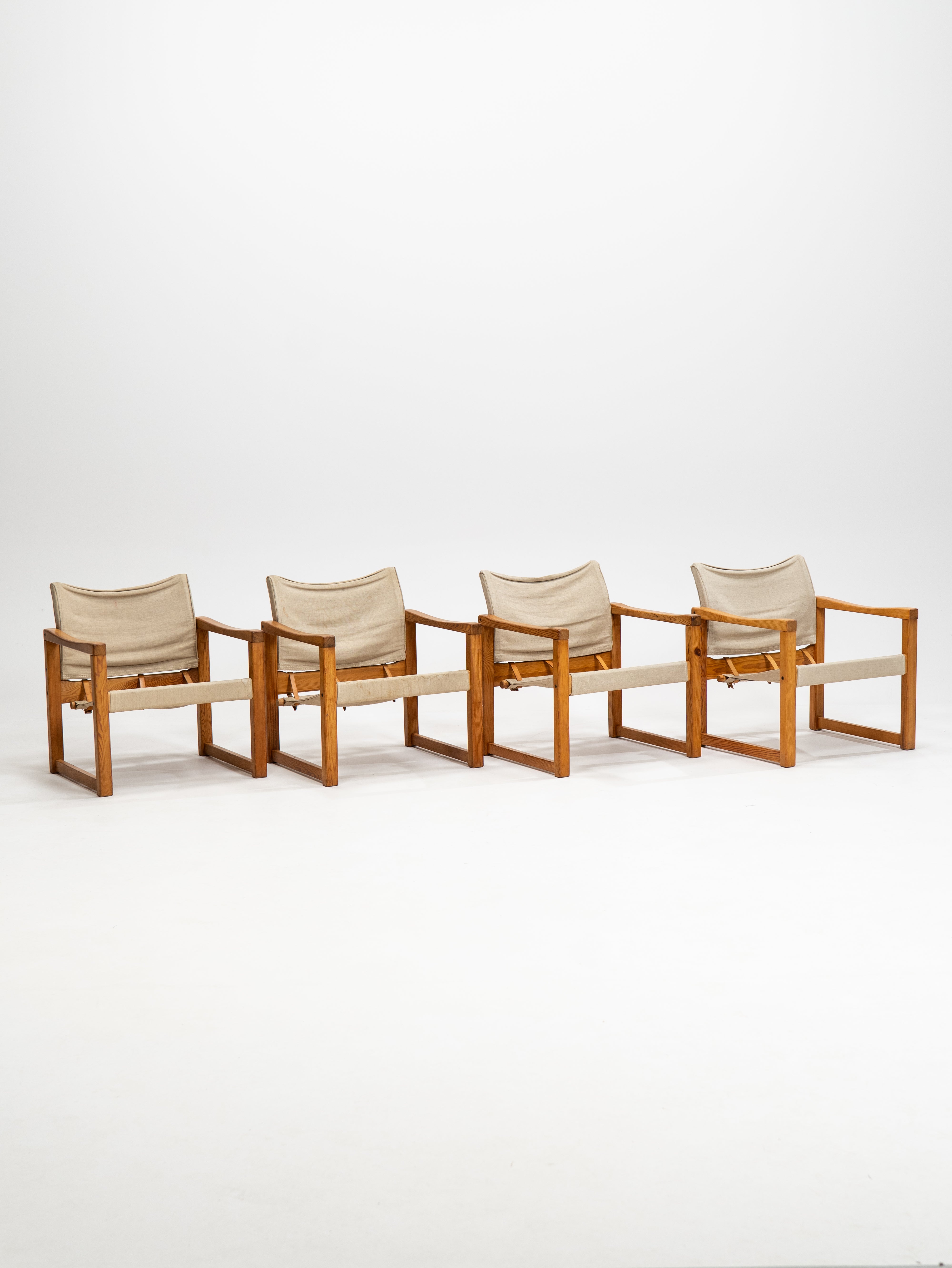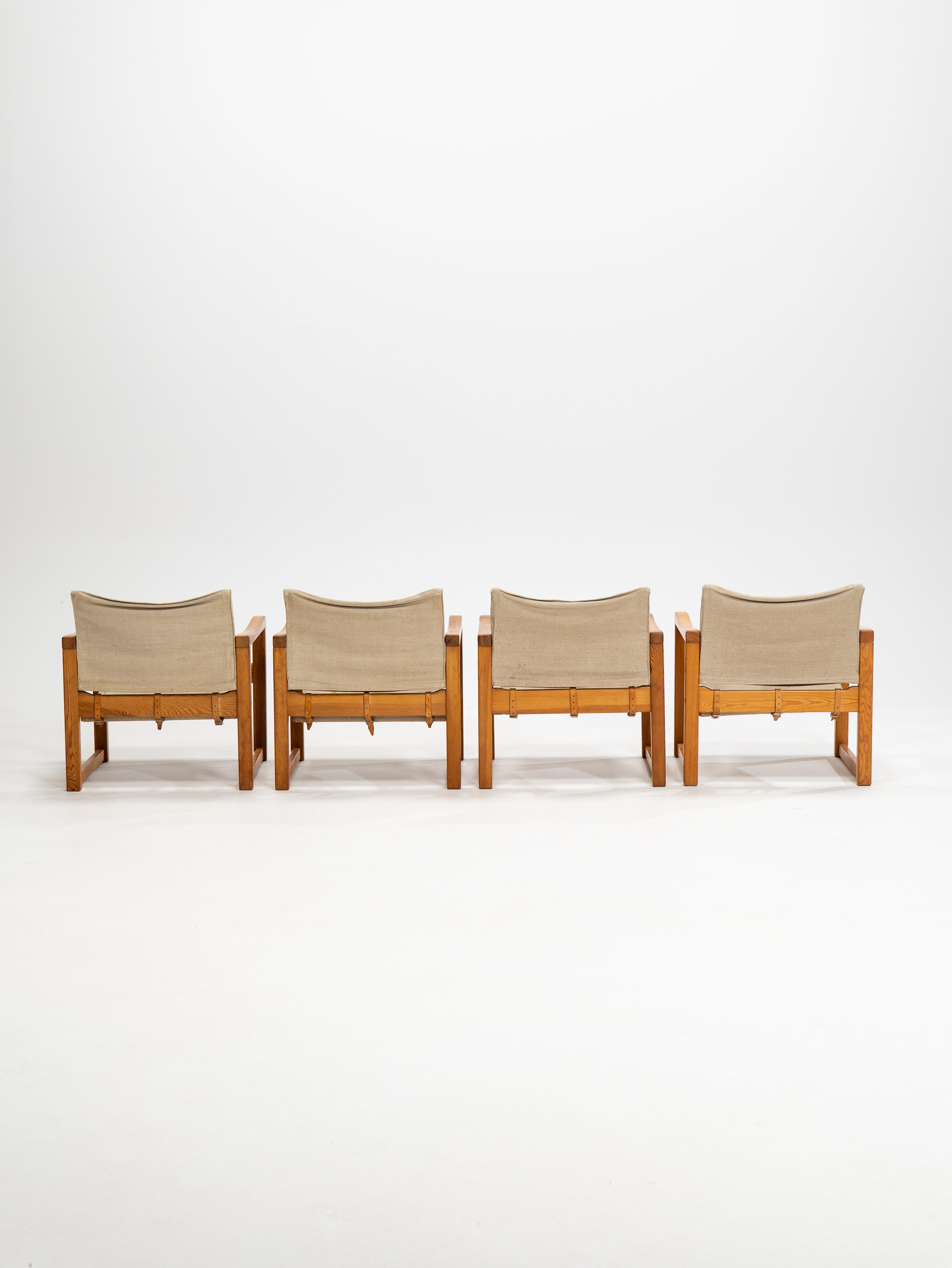Armchairs model Diana designed by Karin Mobring, 1974. Produced by Ikea in Sweden. The frame is made in lacquered pine, and the upholstery is made in new quality Swedish linen. Good / fair vintage condition. Great patina,The upholstery on two of the chairs has a few coffee stains, the other two are in excellent condition.