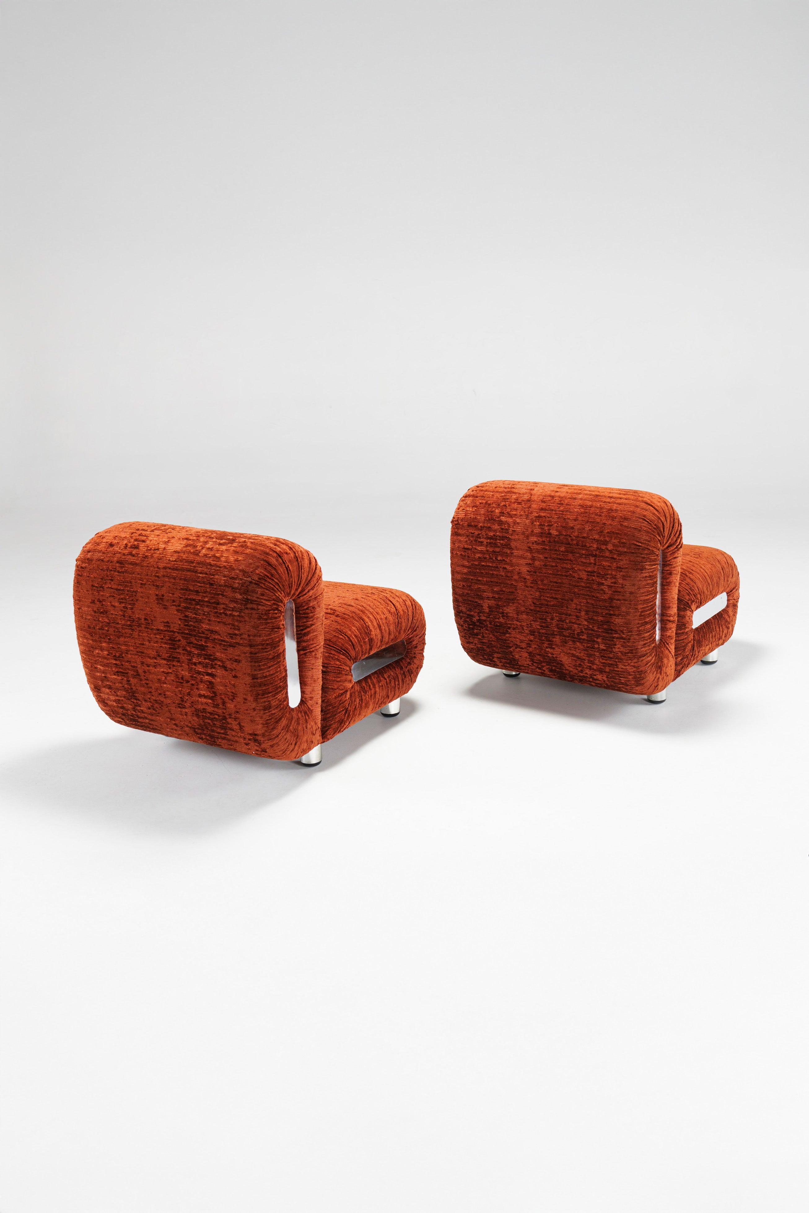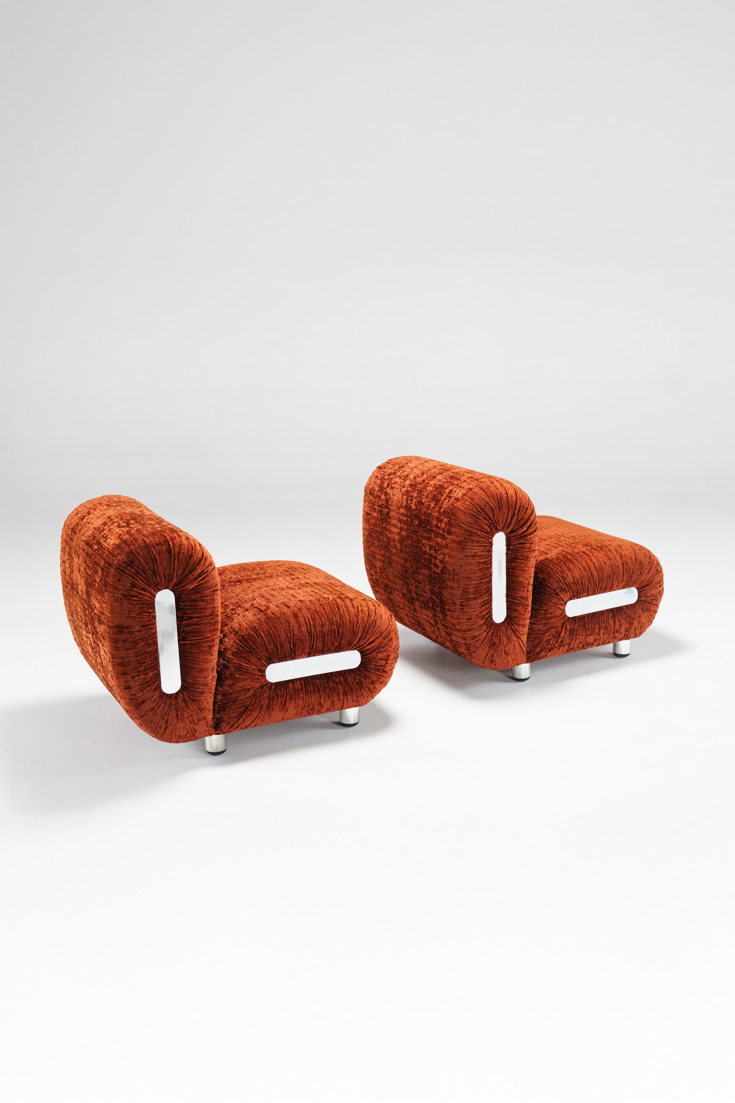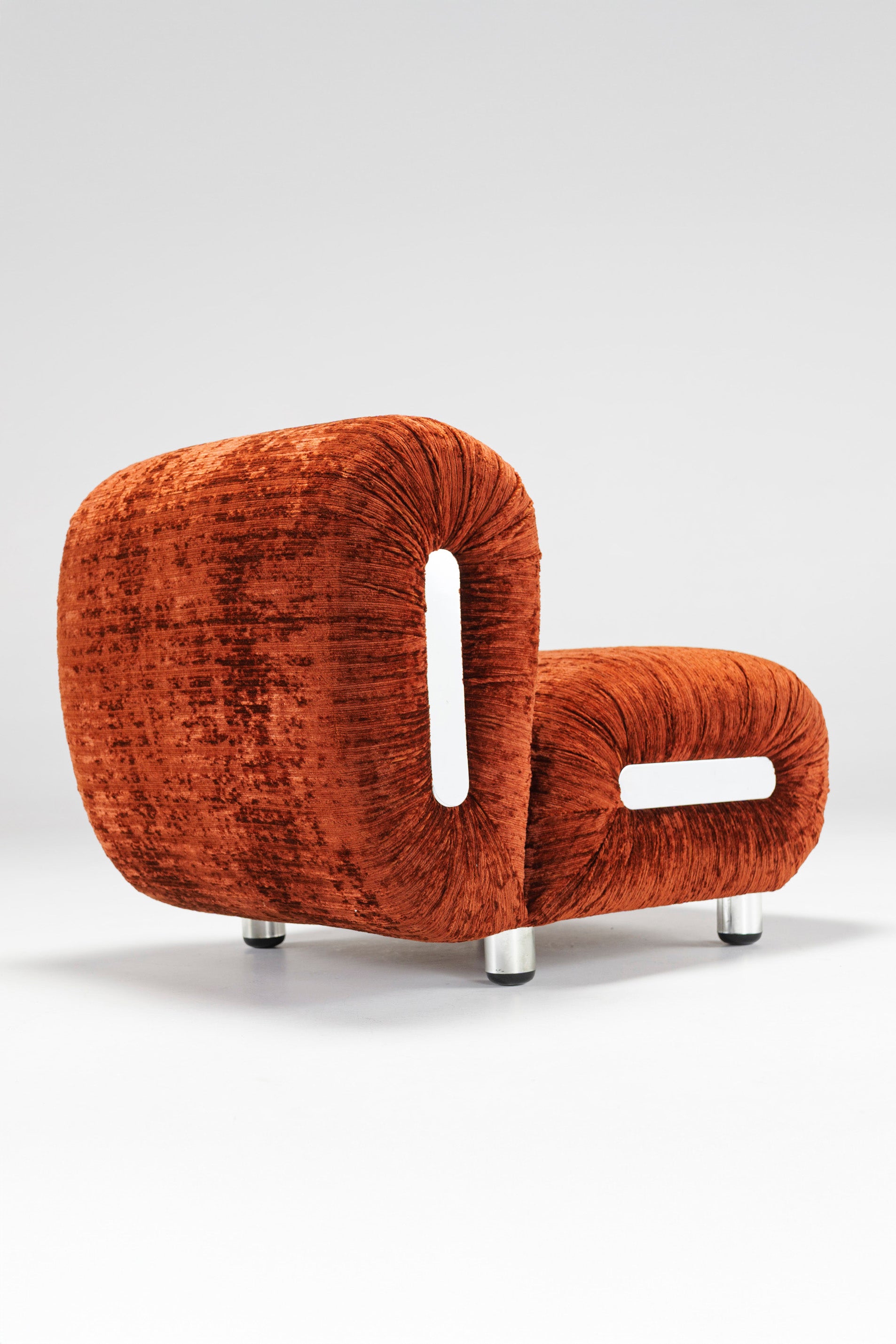 Somewhat similar to Rodolfo Bonetto's Boomerang lounge chair, due to the chrome-plated plastic side ornaments, this lounge chair offer a better sitting experience through a technical twist in its design: the backrest is fitted with two powerful springs which adjust its inclination, thus allowing anyone to recline comfortably, regardless of their shape and size. The velvet which covers the chairs is in excellent shape, and it is very pleasant to the touch. The four legs are also chrome-plated plastic, giving the illusion of floating chair.