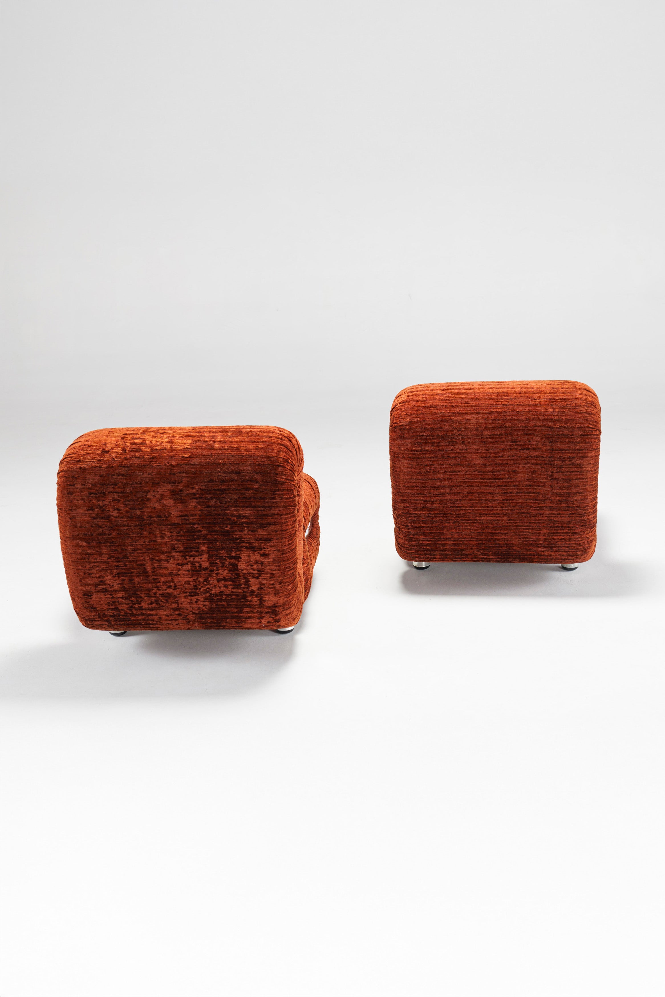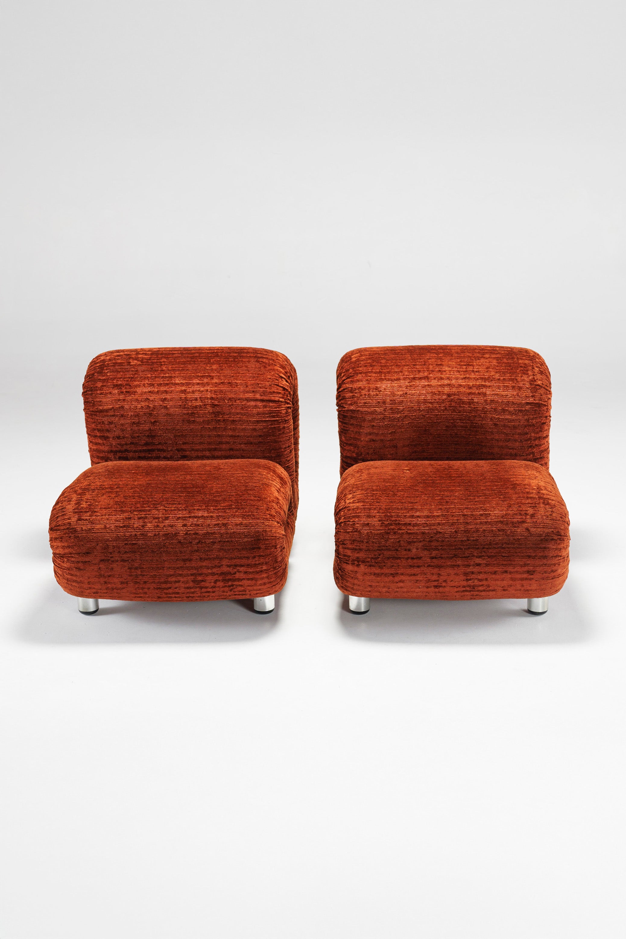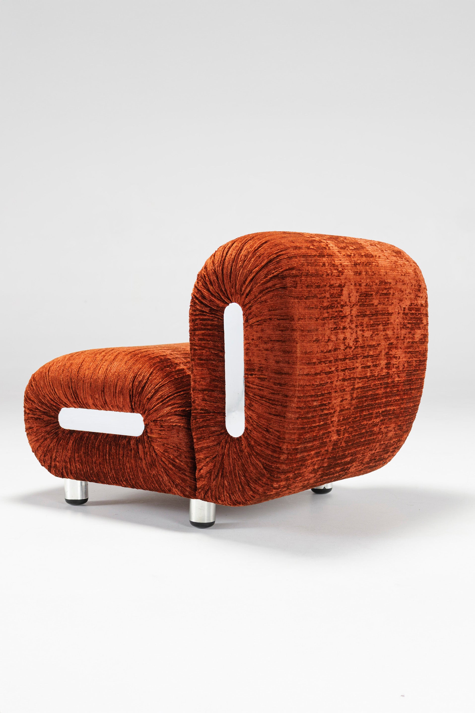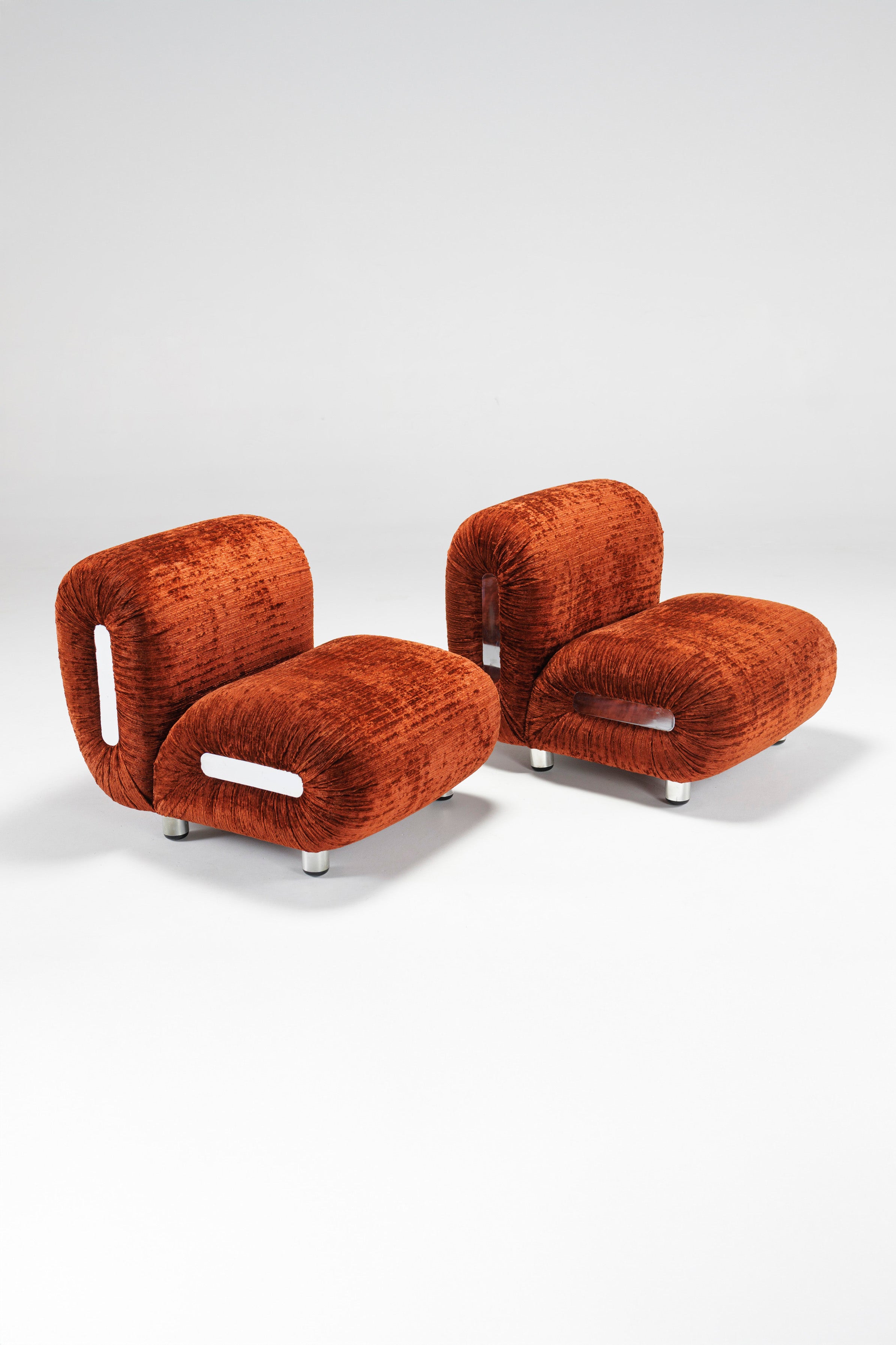 Somewhat similar to Rodolfo Bonetto's Boomerang lounge chair, due to the chrome-plated plastic side ornaments, this lounge chair offer a better sitting experience through a technical twist in its design: the backrest is fitted with two powerful springs which adjust its inclination, thus allowing anyone to recline comfortably, regardless of their shape and size. The velvet which covers the chairs is in excellent shape, and it is very pleasant to the touch. The four legs are also chrome-plated plastic, giving the illusion of floating chair.