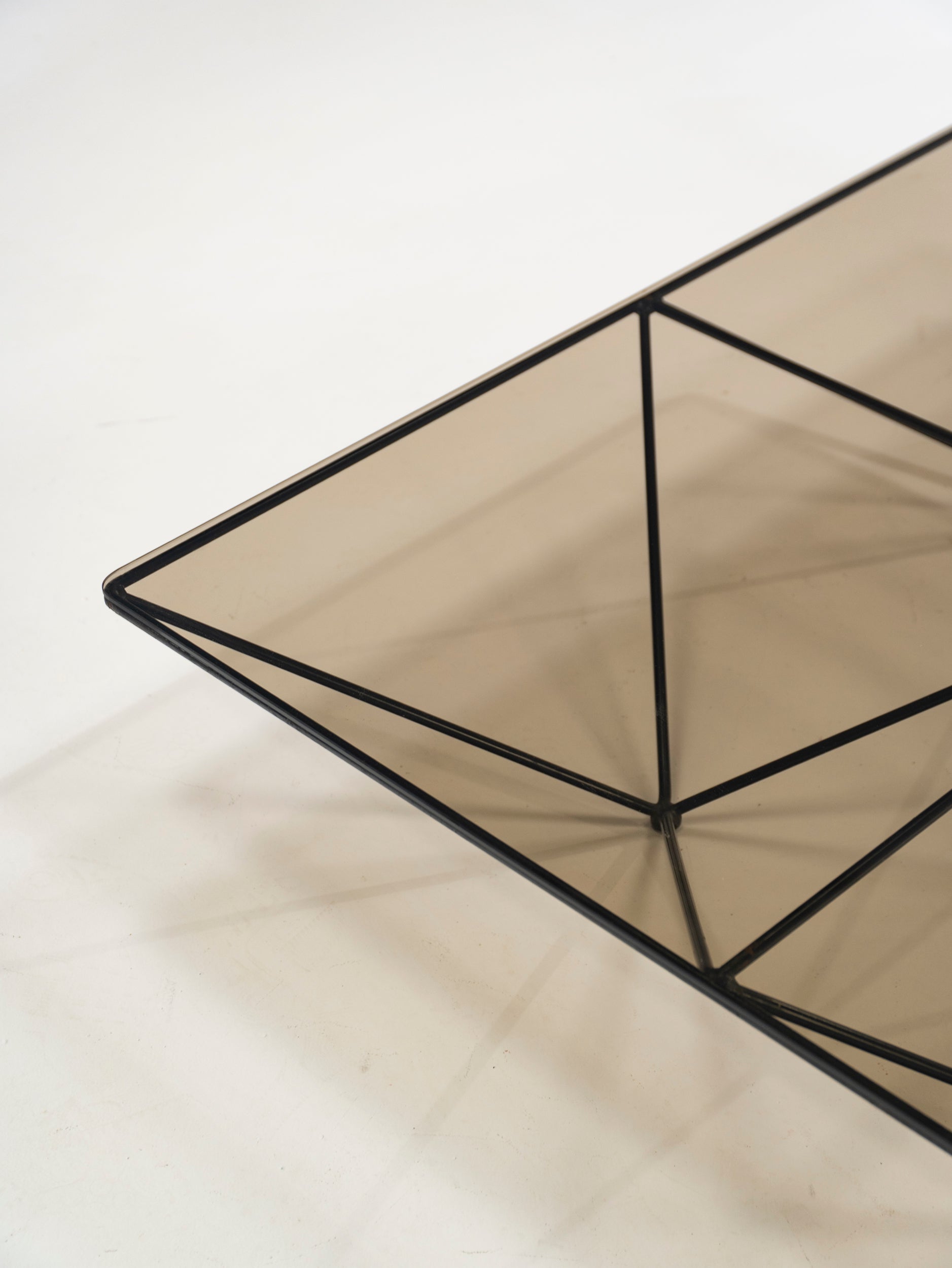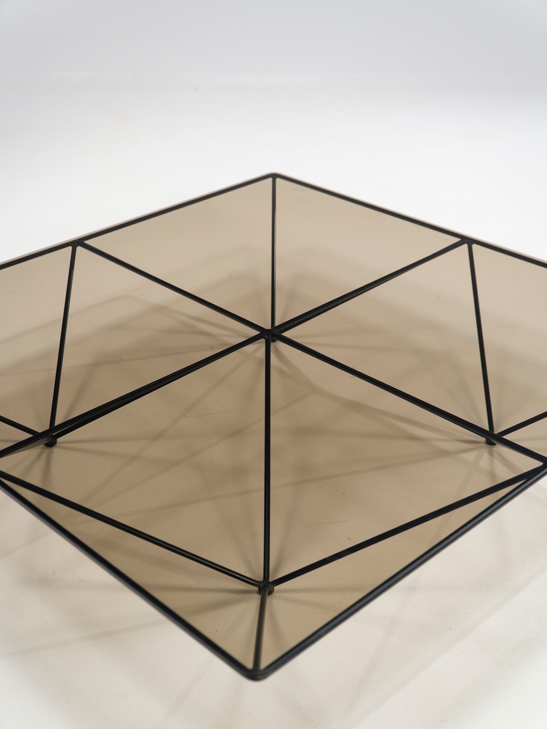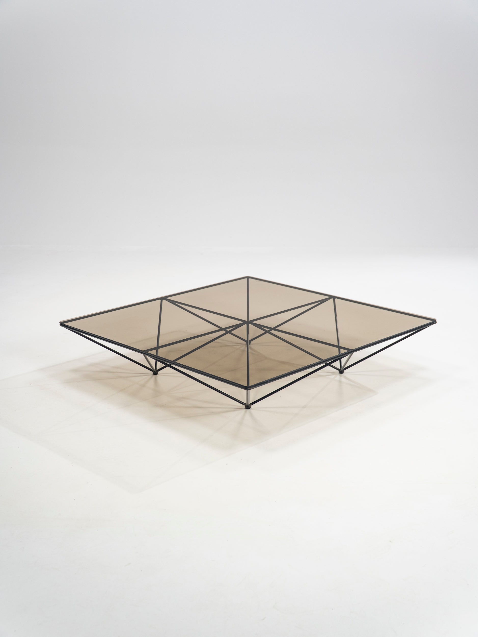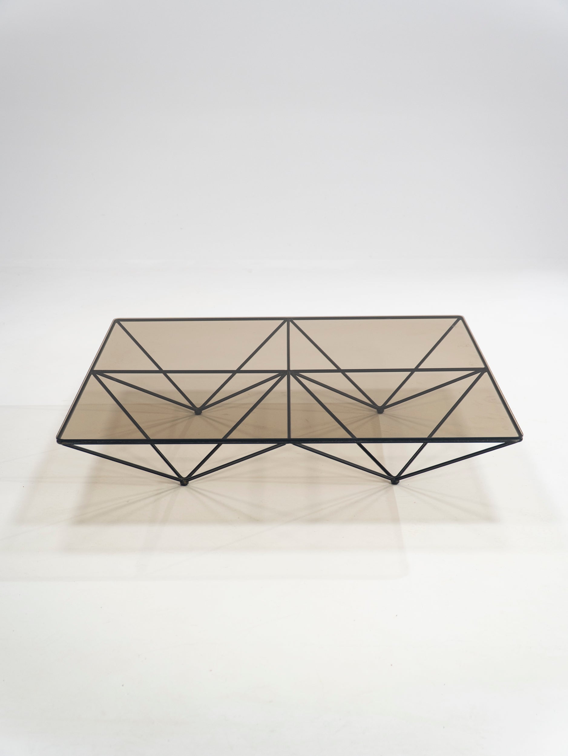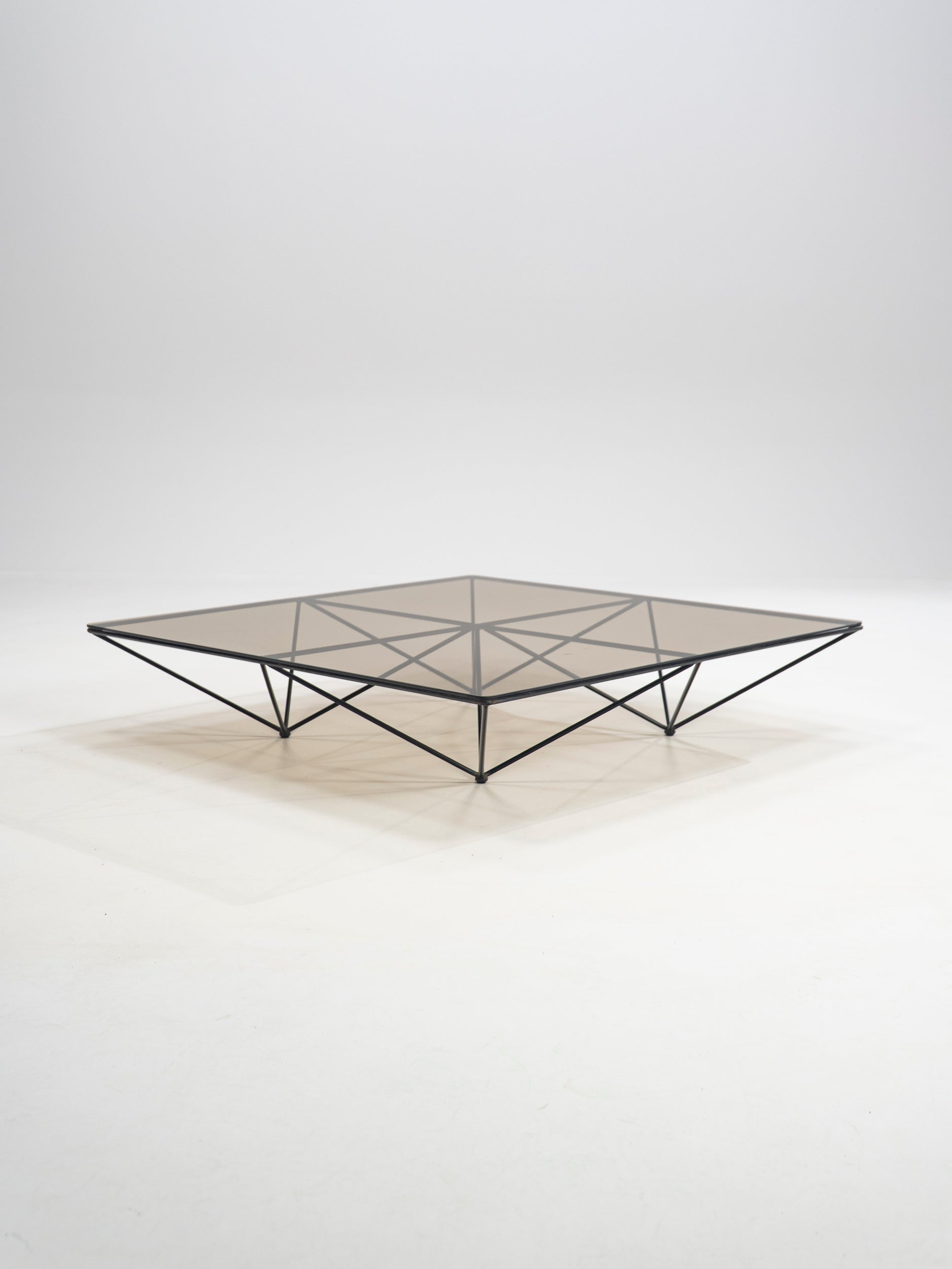 Once again we wonder at the power of simple, sleek design. Paolo Piva joined four pyramids, turned them upside down, fitted a glass top and entered the design books. Just like that, this thin metal wire construction is both useful and beautiful. The frame is in very good condition, retaining its original black paint.