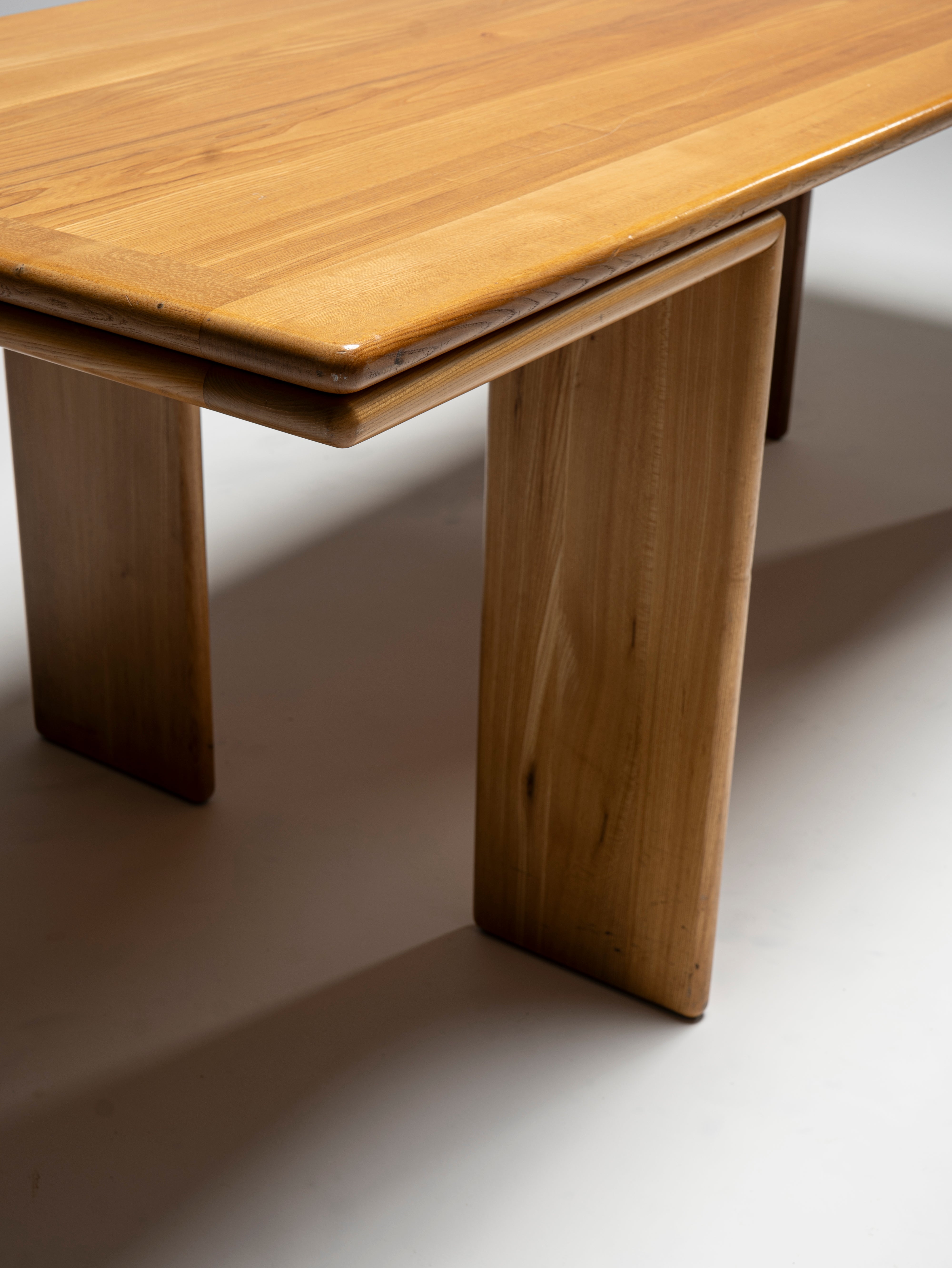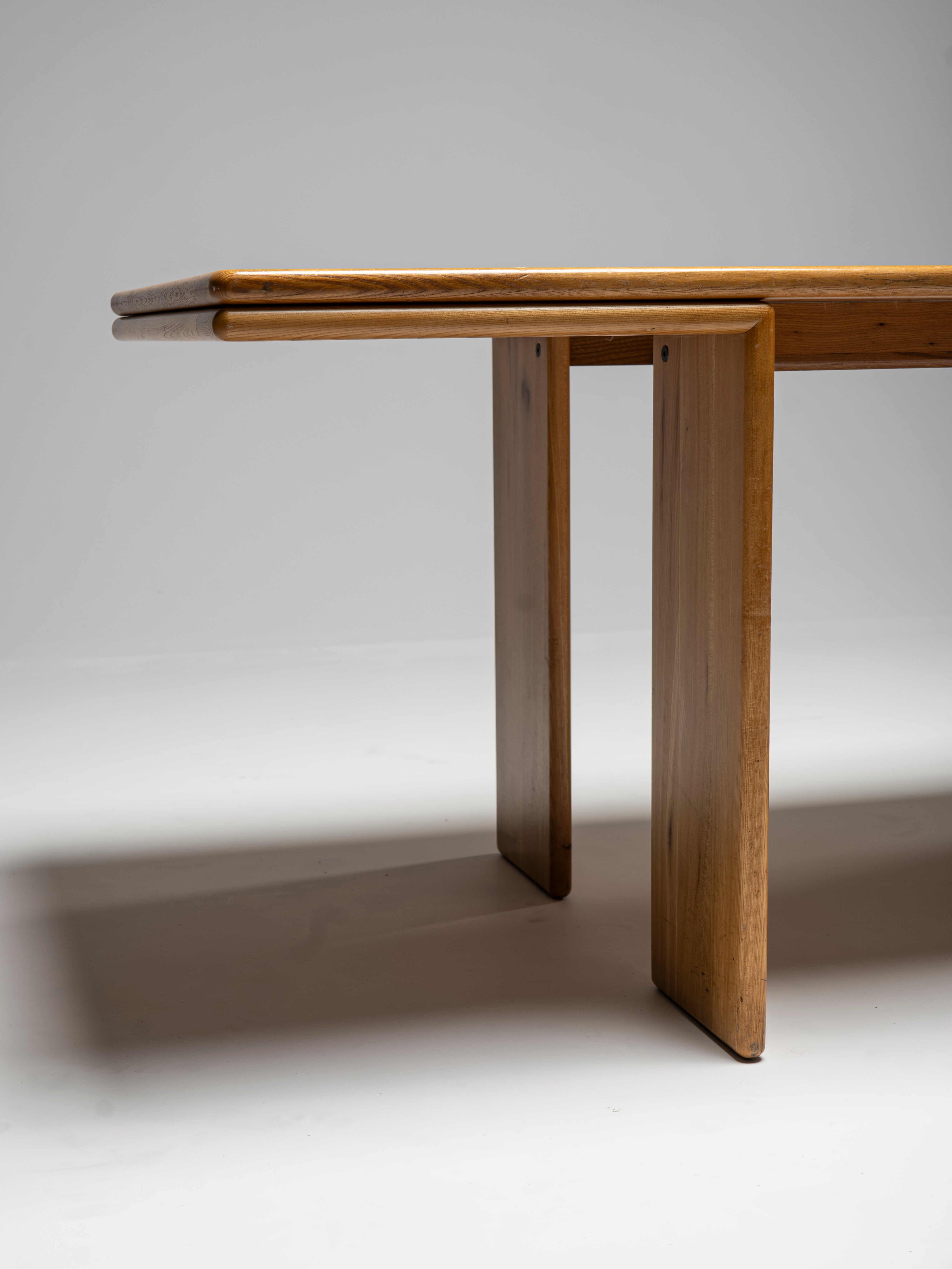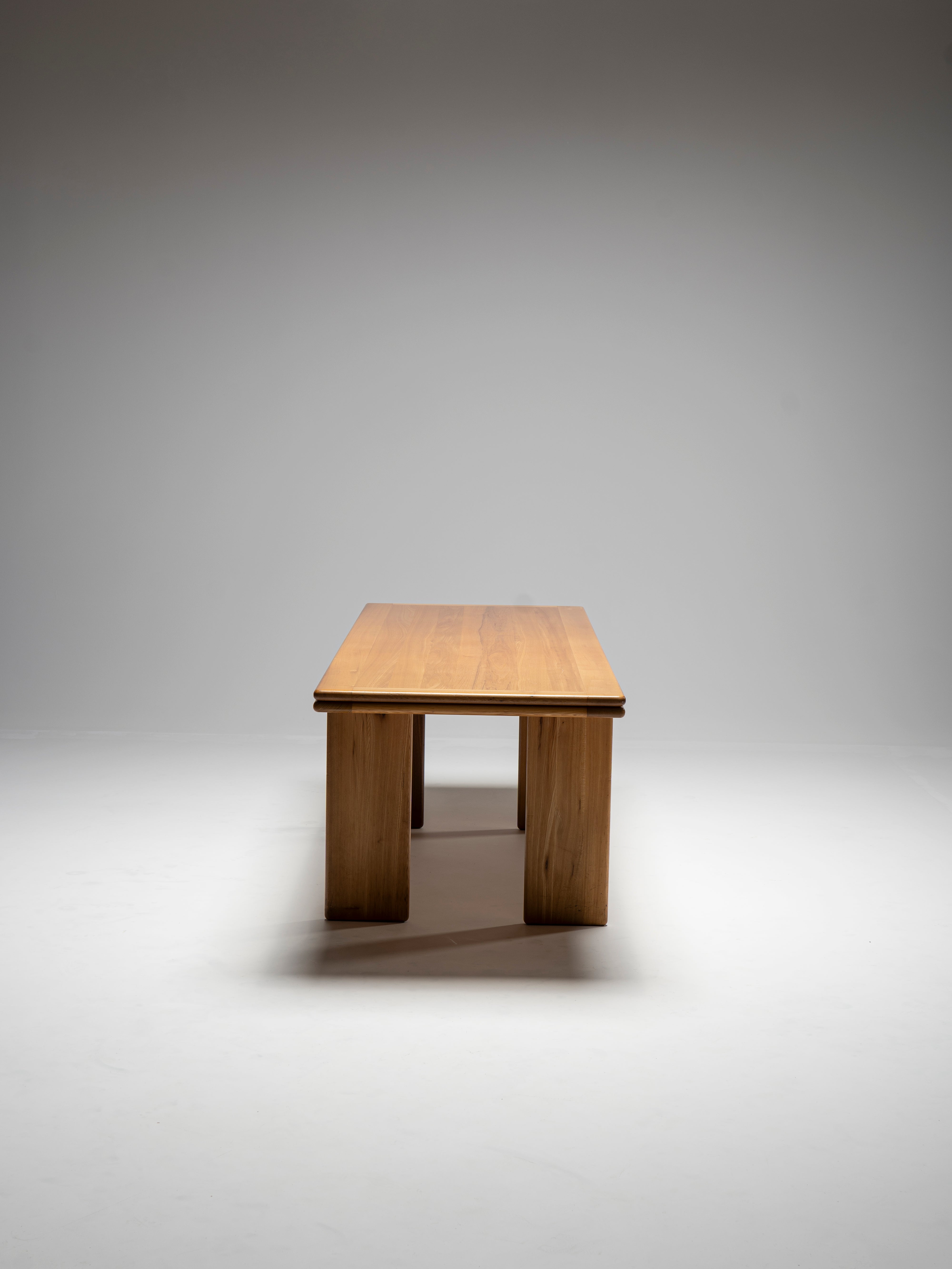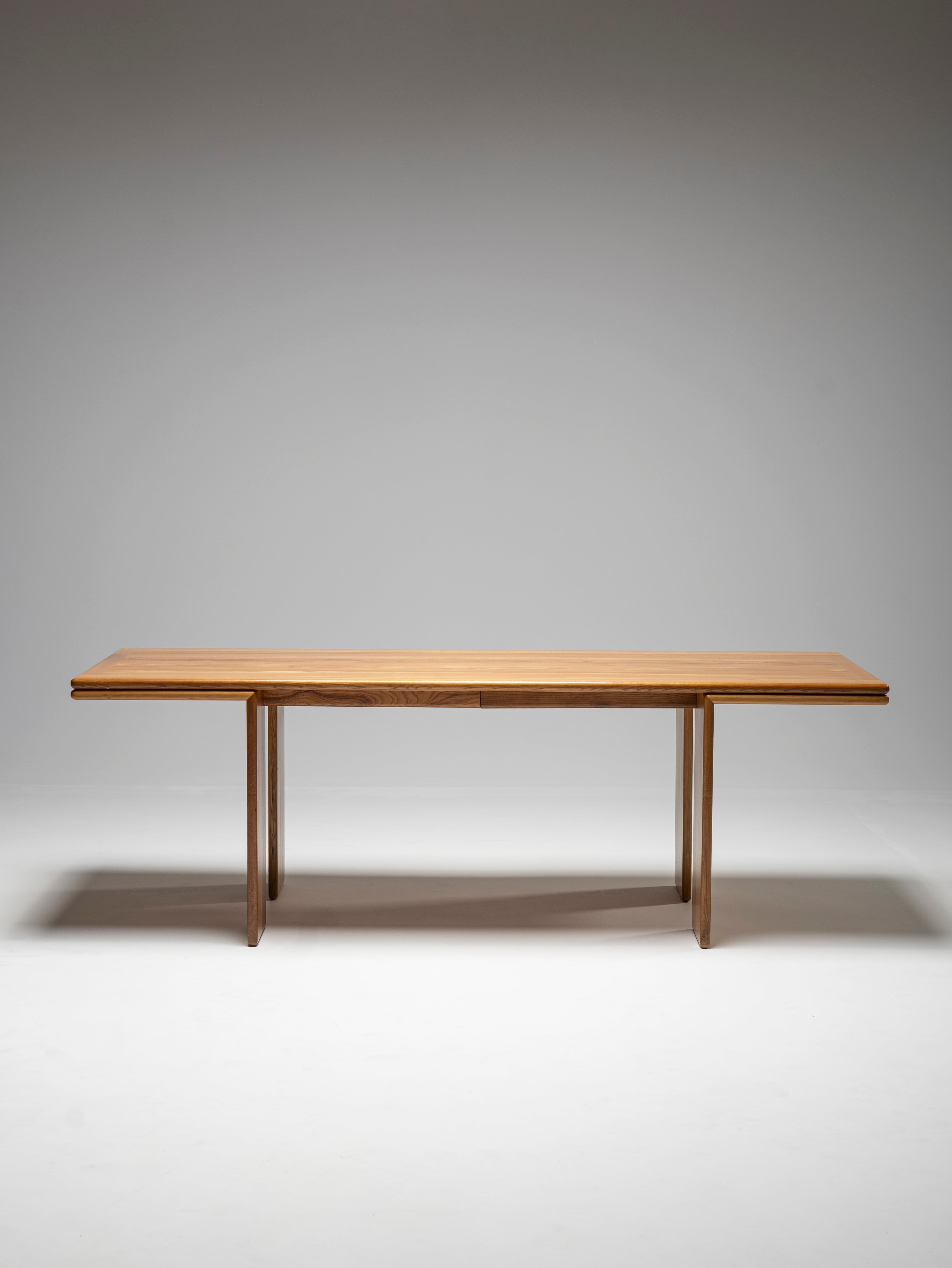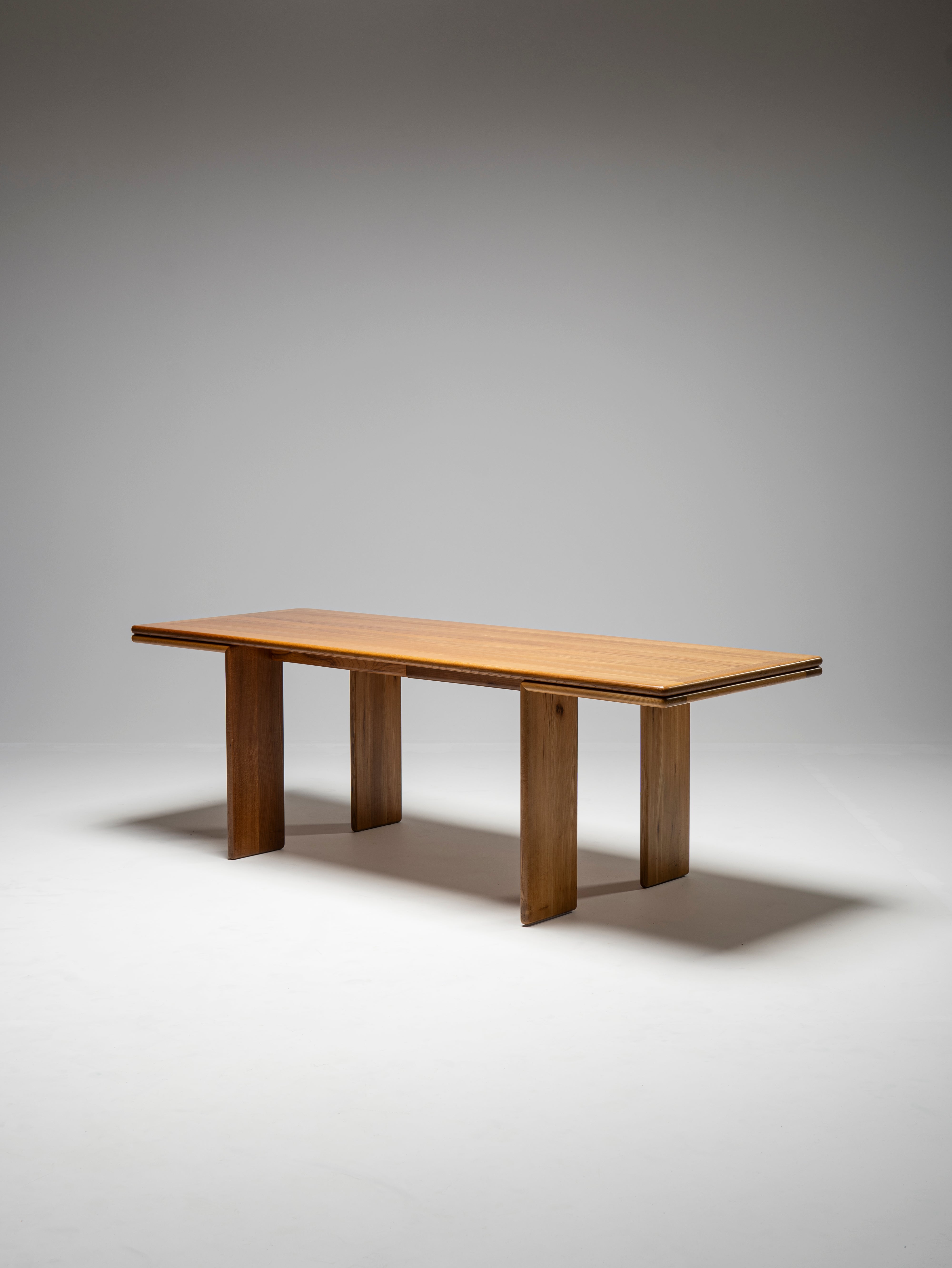 This wonderfully slender dining table attributed to Mario Marenco is a homage to the structural strength of wood. Though the first thing that one notices is how thin all its components are, never does it appear to be frail, nor is it so. The 220 cm span is well reinforced by means hidden from view, and the only visible, and reassuring, hint that the designer has left for us is the manner in which the legs turn at a right angle once they reach the tabletop, only to safely accompany it to its extremities. All the visible pieces are made of the same wood, with the same thickness, colour, and tastefully beveled edges.