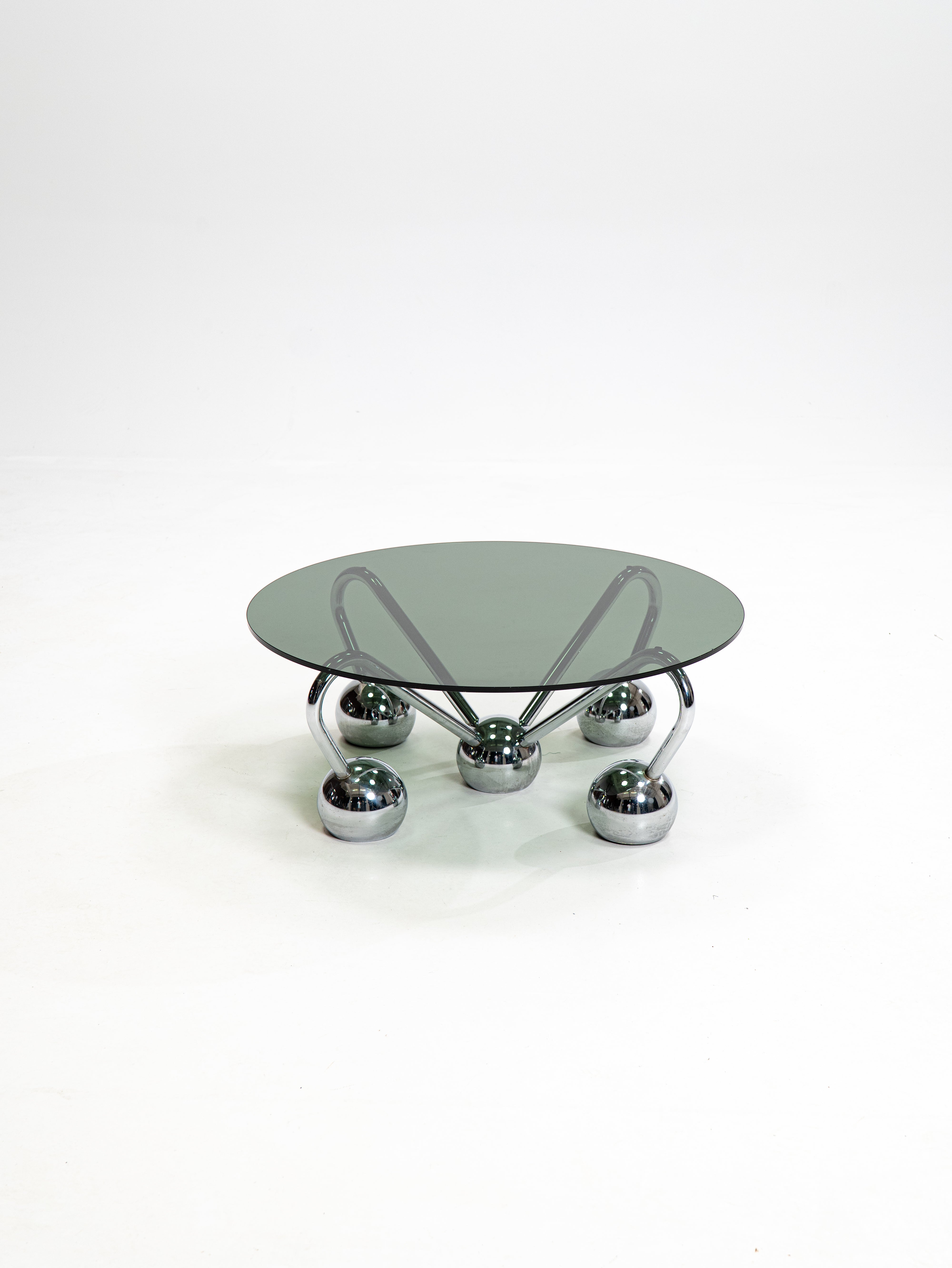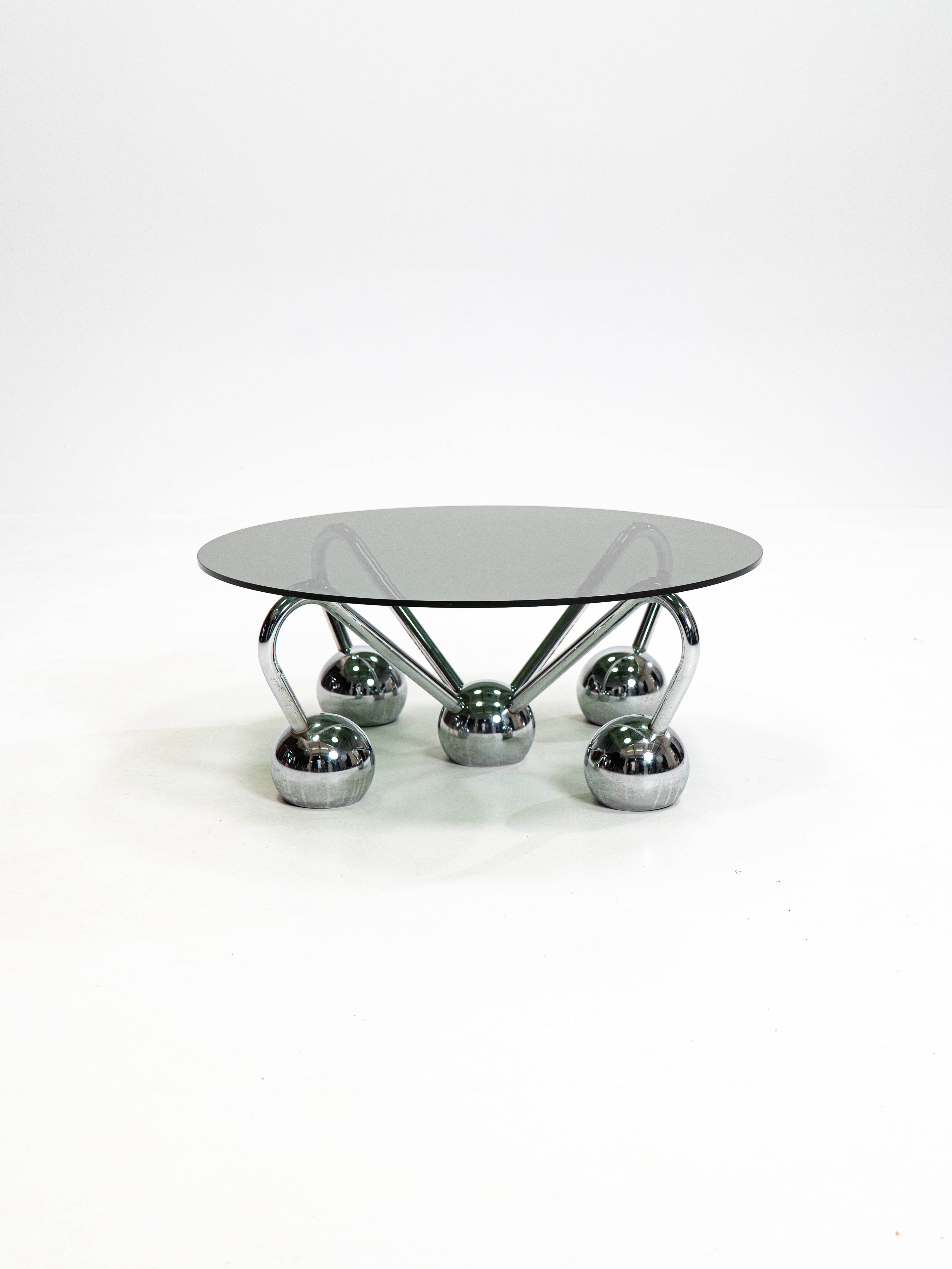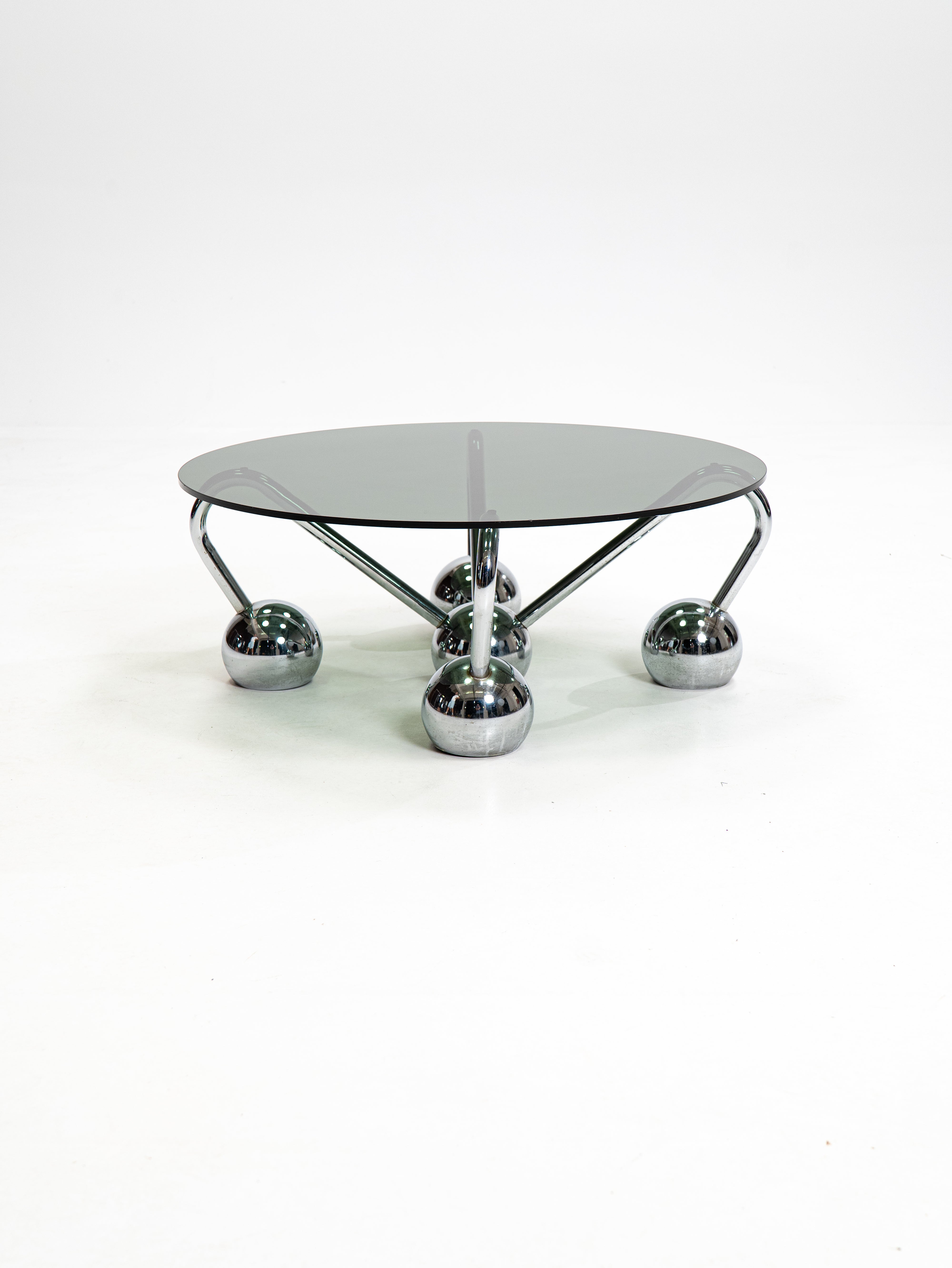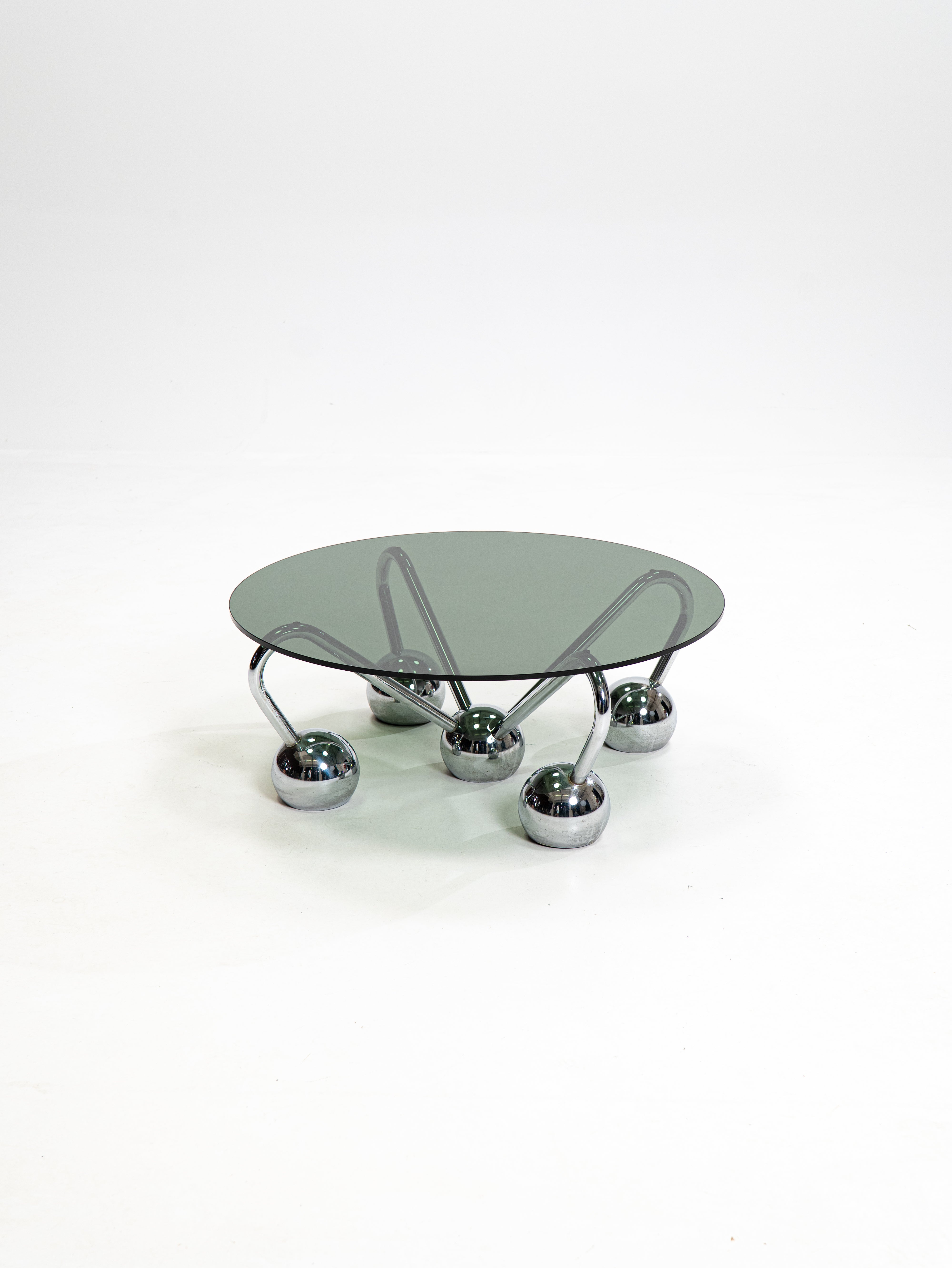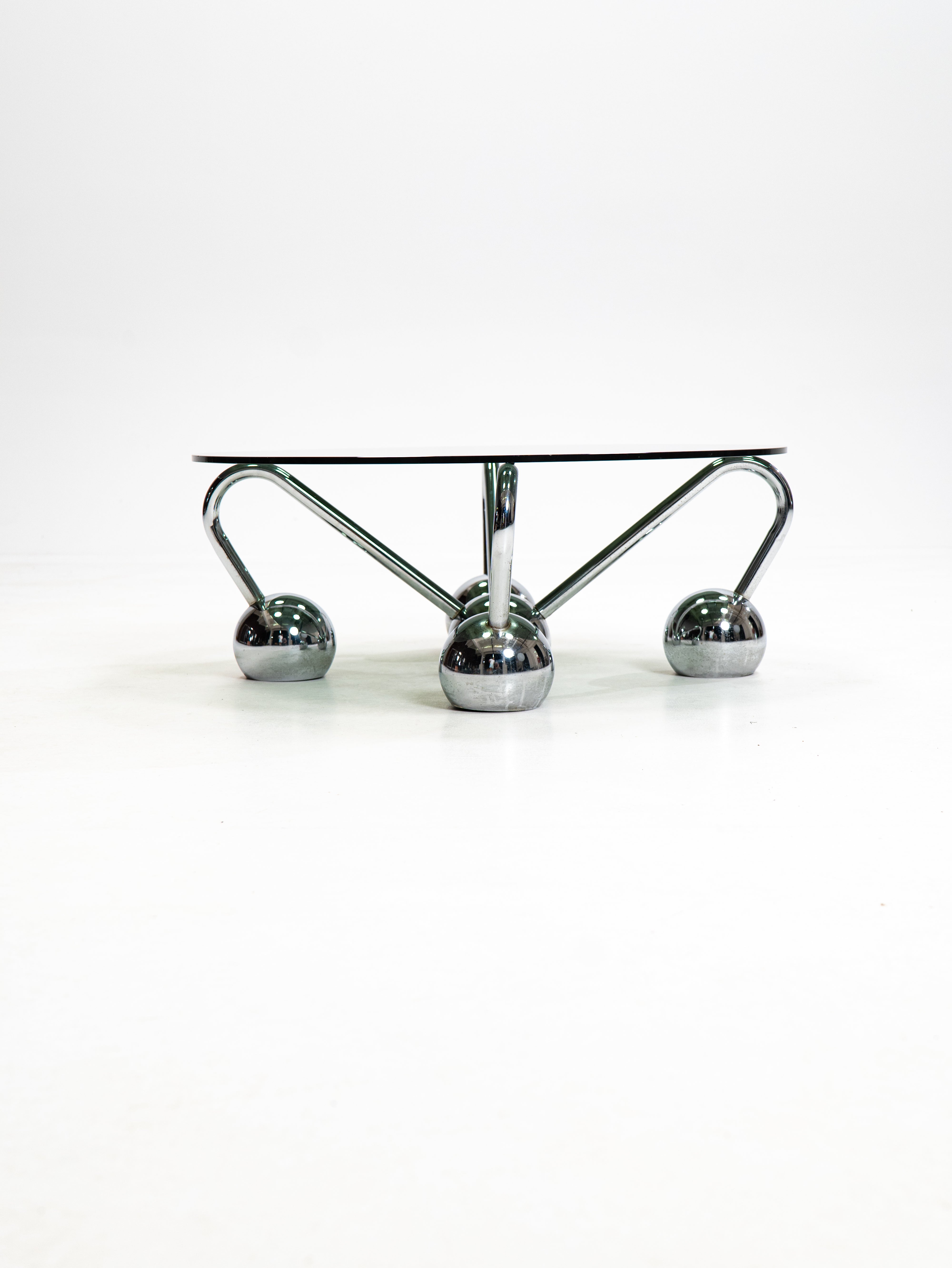 Intriguing, timeless and well preserved coffee table in chromed metal with a smoked glass top. Well executed, with an unusual and attractive design with four spider-like legs, ending in five chromed metal spheres. Typically 1970s, but will look great in any interior thanks to its clean lines. It is well preserved and has only the minor expectable signs of the time, including patina and small scratches. The top is not chipped or cracked.