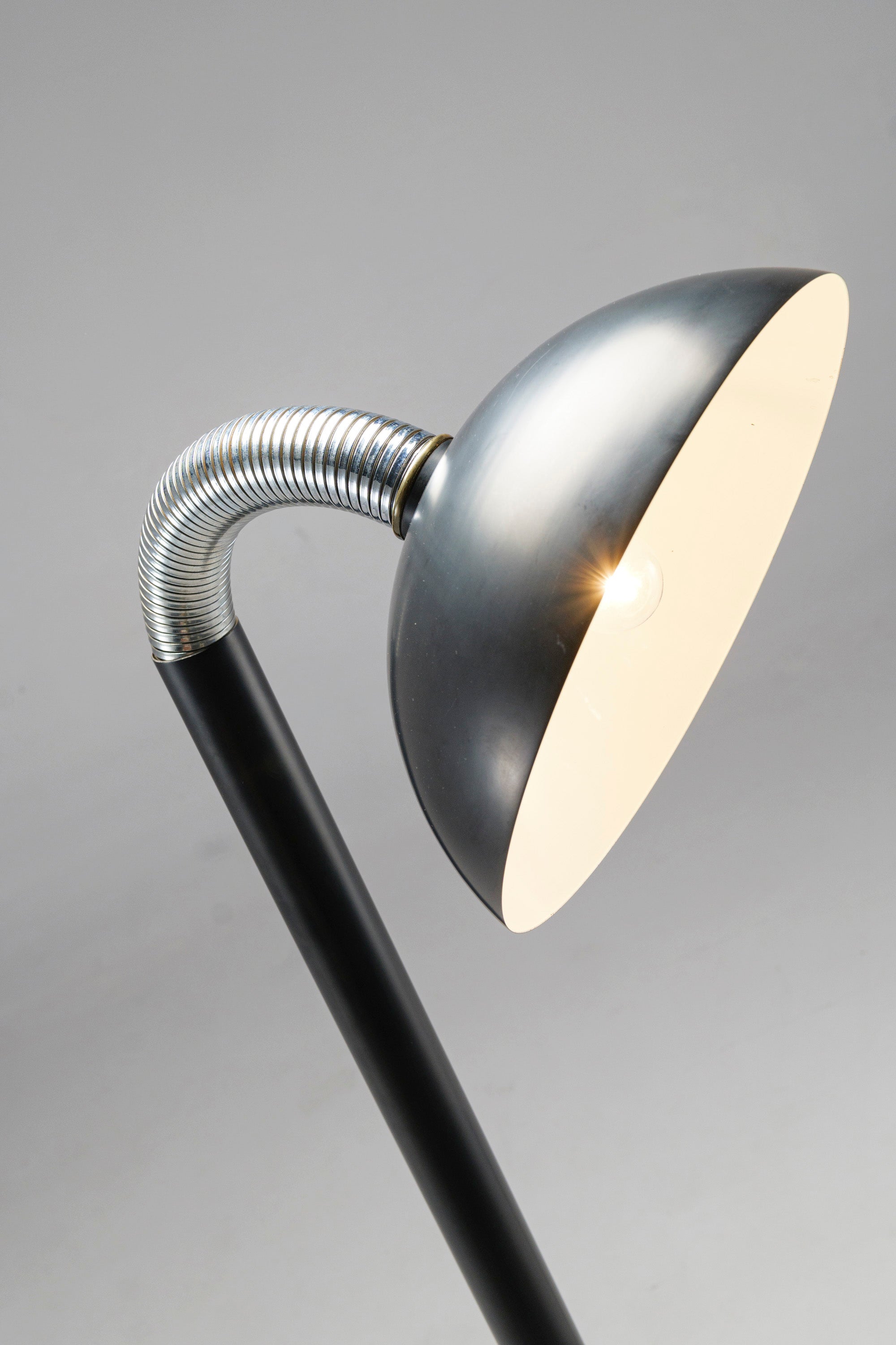 Tall, dark and solemn at first glance, the model P-482 by Luci Illuminazione hides a playful, and useful trick up its sleeve: the lampshade can be adjusted and, in doing so, reveals its flexible, chrome-plated shaft. This simple idea turns the P-482 into a highly versatile lamp, suited for multiple purposes and possibilities.