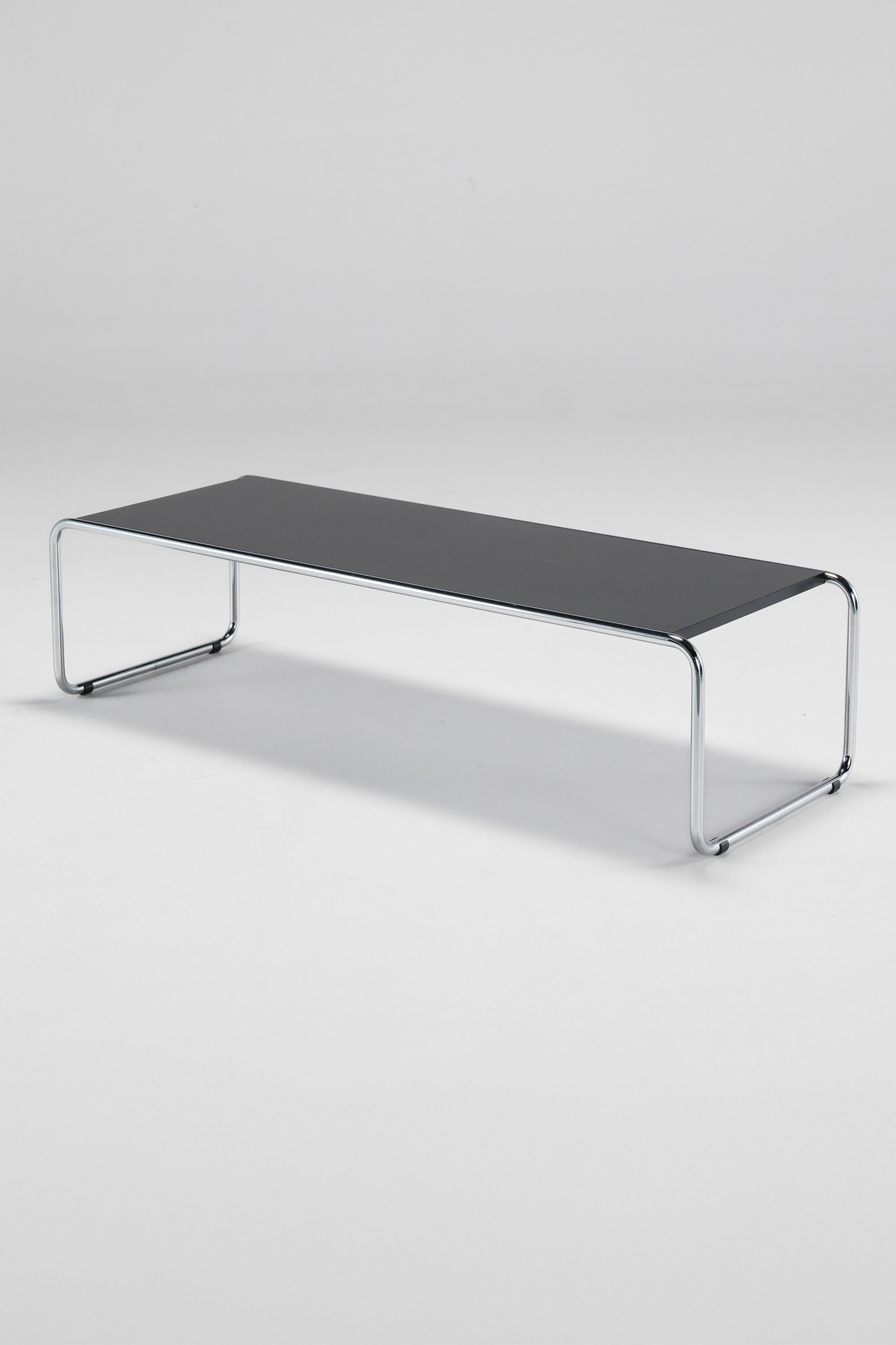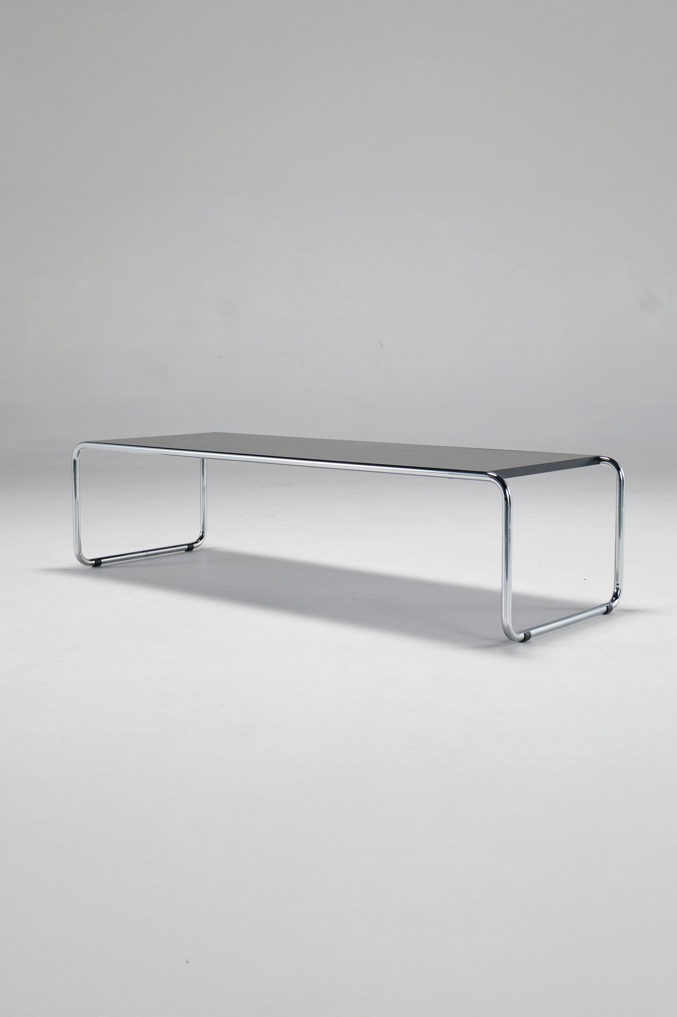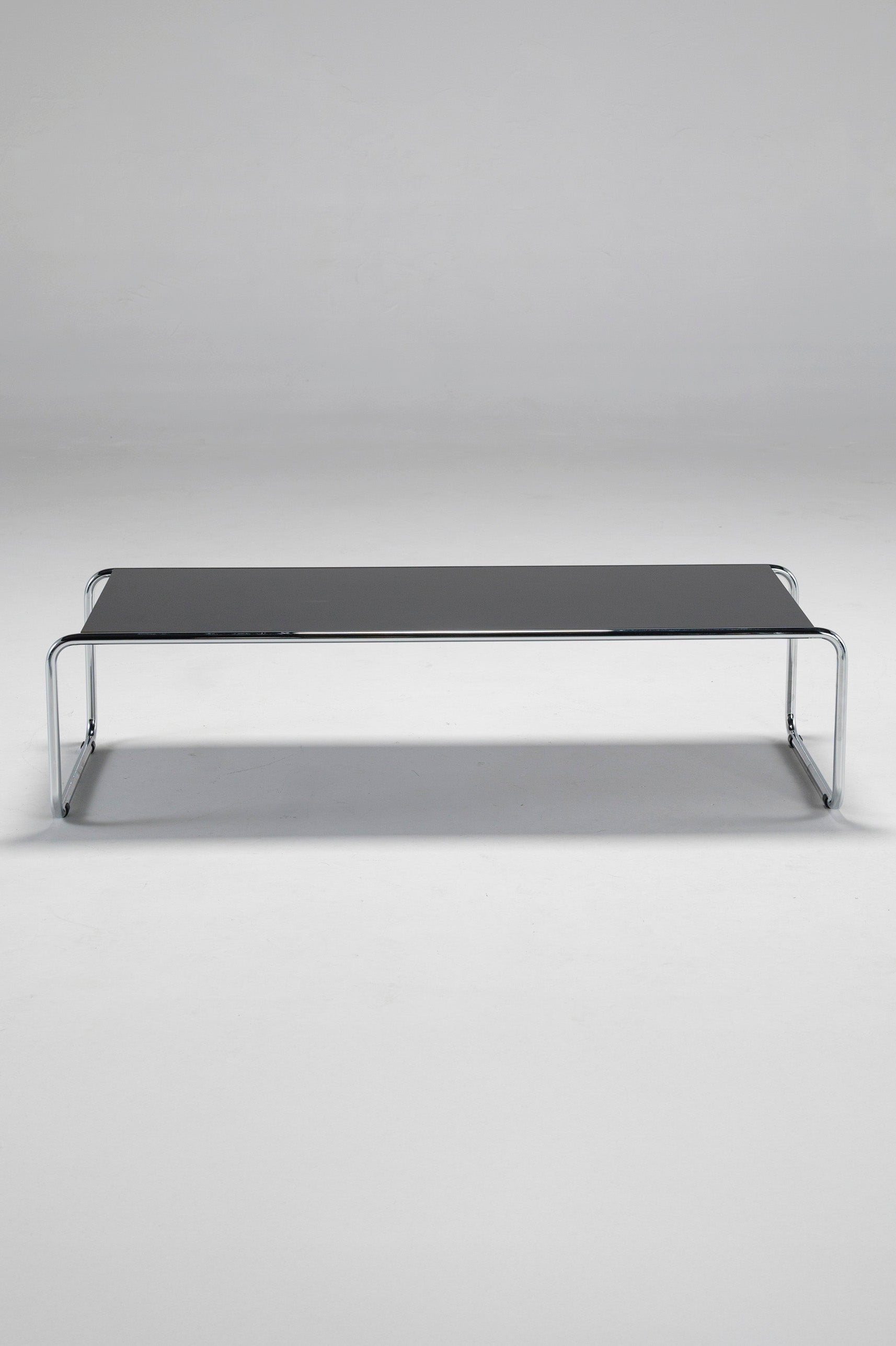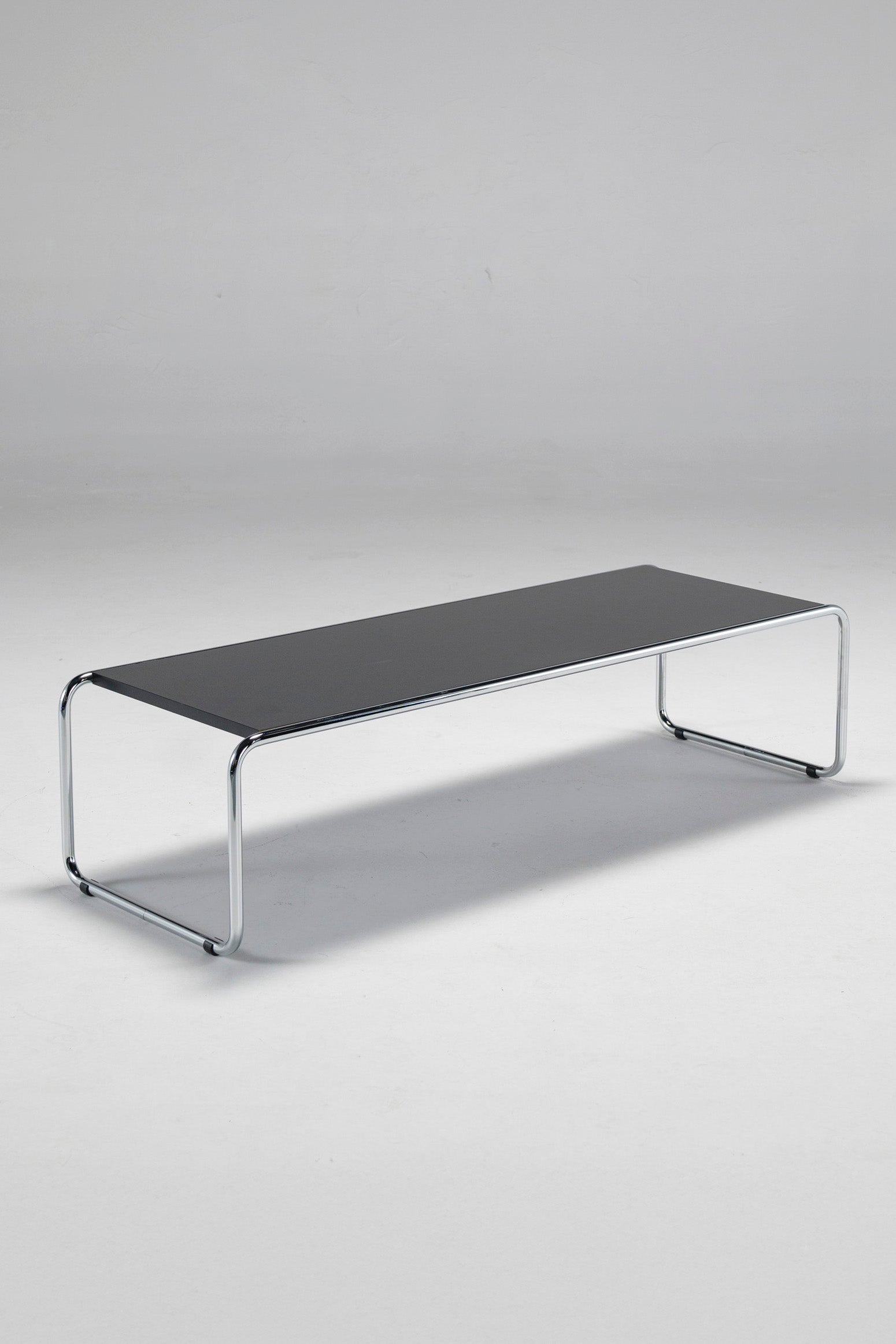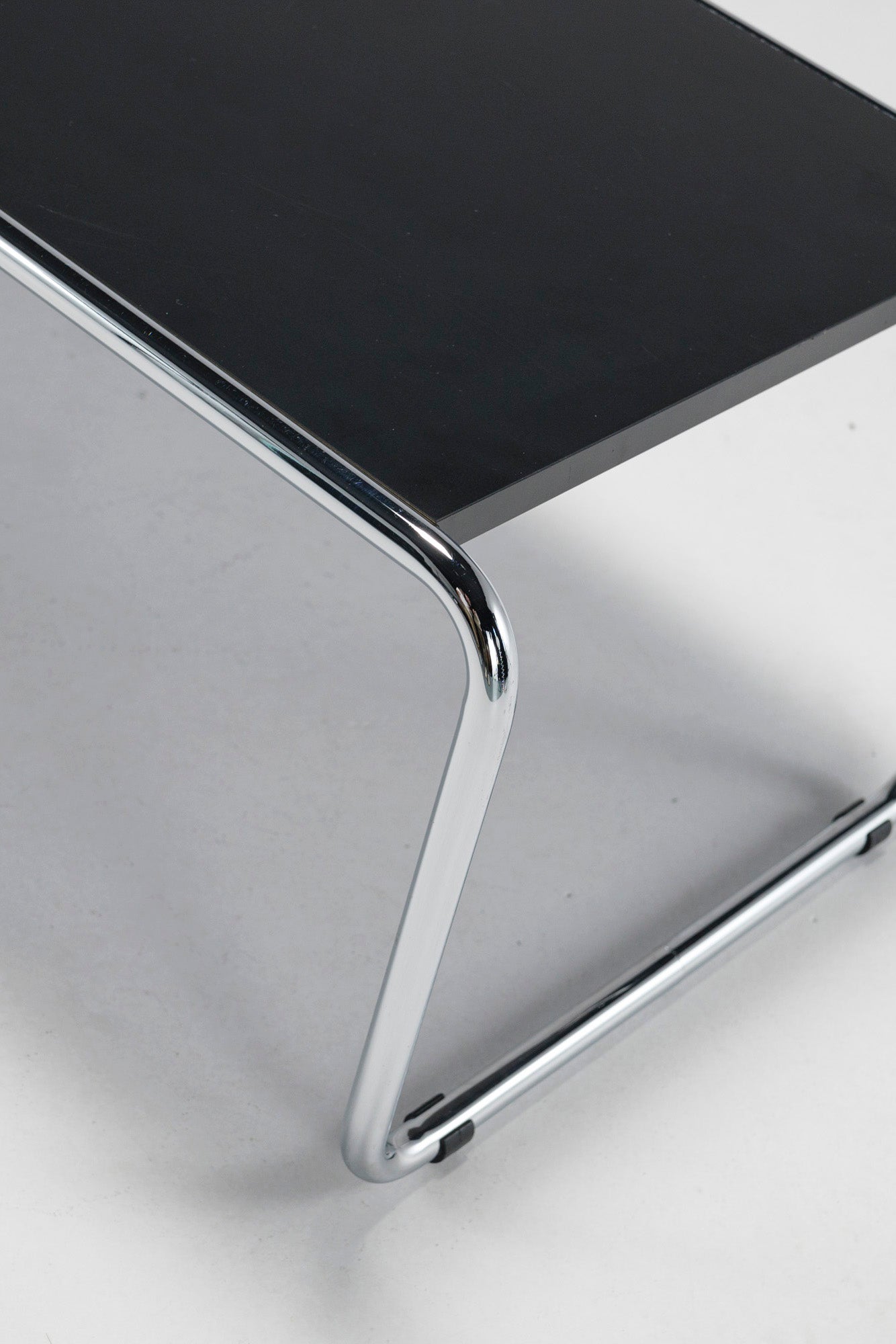 When one thinks Bauhaus, this is what they see: rigorous use of bent steel tubing holding up simple, precise shapes. Marcel Breuer is one of Bauhaus' top-tier designers, and the Laccio, produced by Gavina in Italy during the 1960s is a prime example of his wildly elegant approach to furniture-making. The frame is made up of one piece of tubing running along the entire course, and the long sides of the black laminated top feature concave grooves, so that the tubing fits perfectly. Both are in good condition.