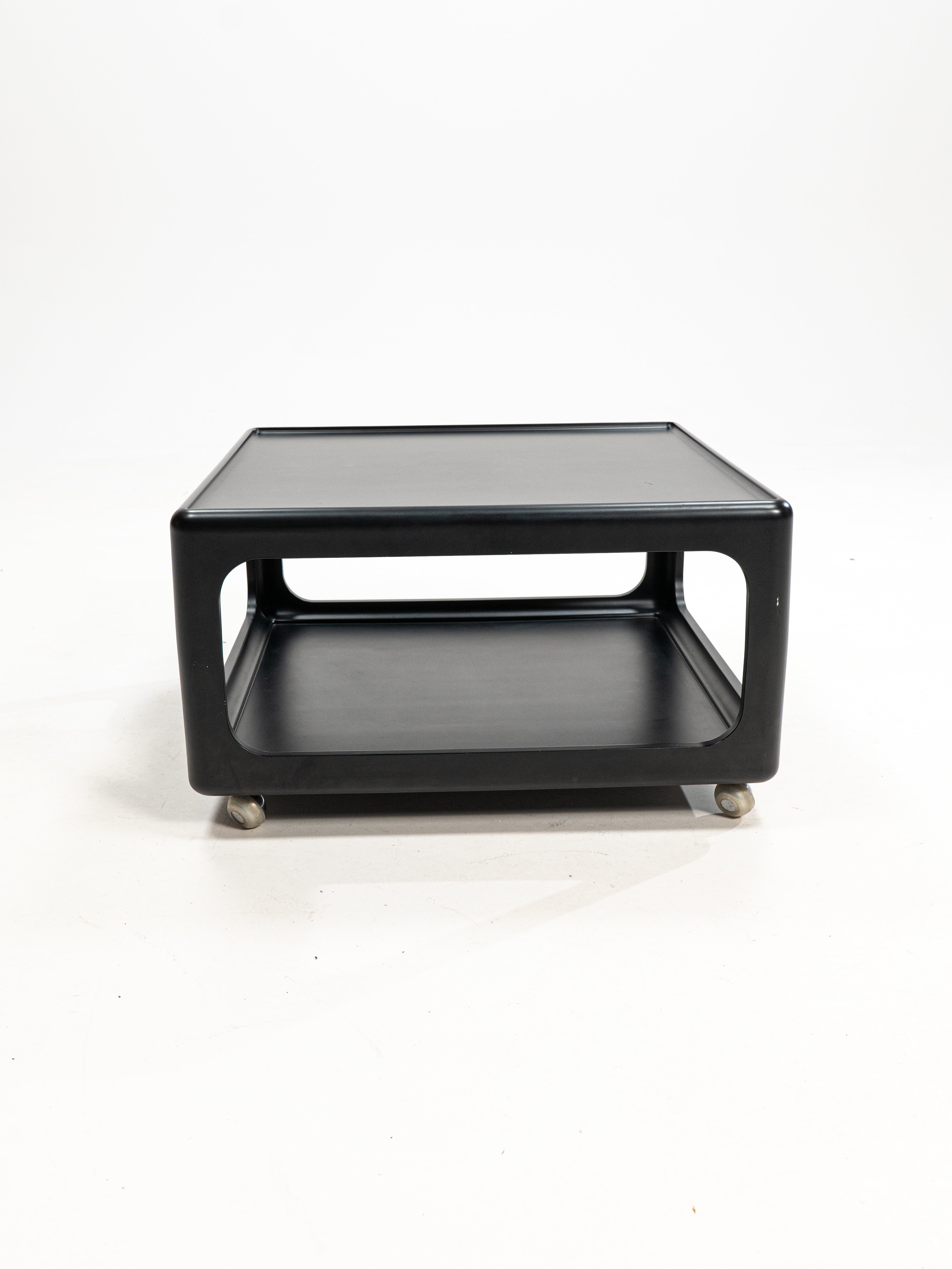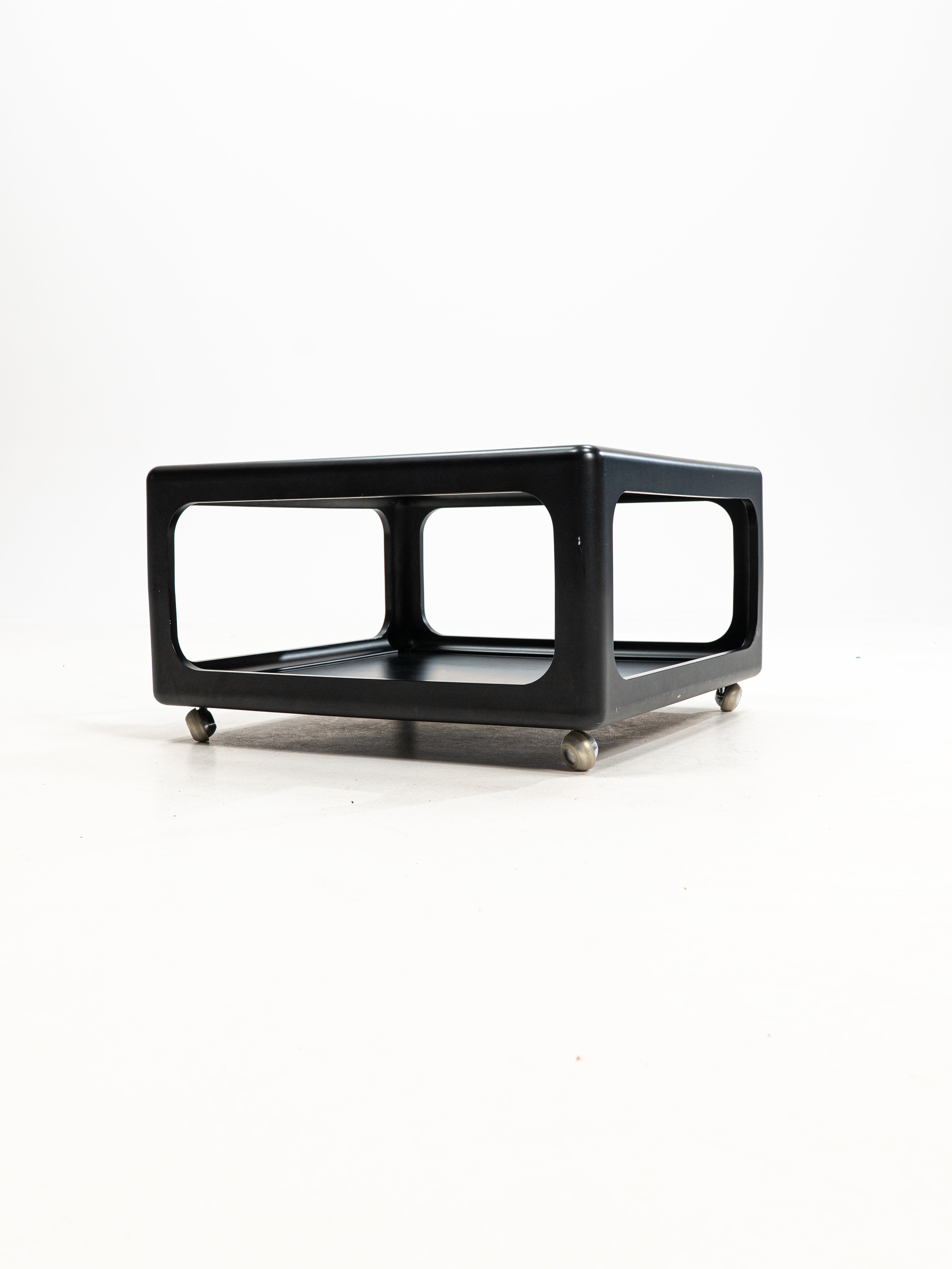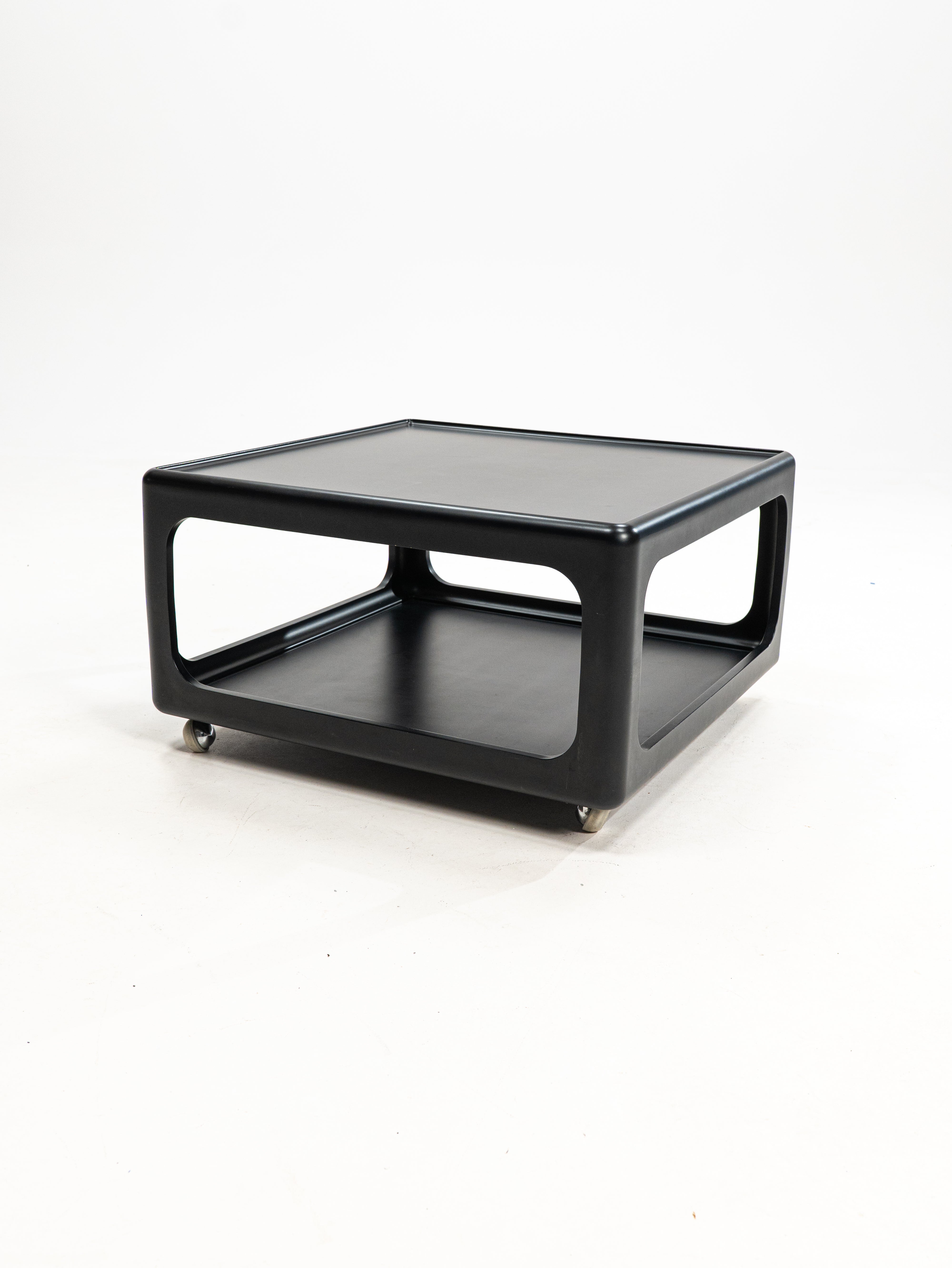Vintage coffee table designed by Peter Ghyczy for his Horn Collection, produced in Germany during the 1970s [2.2, 2.3]. This particular model is made from black lacquered polyurethane and typically features chromed casters