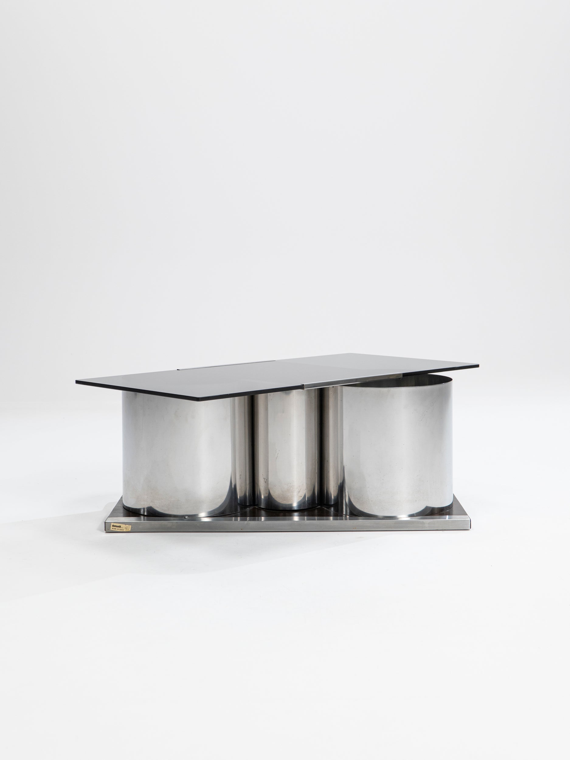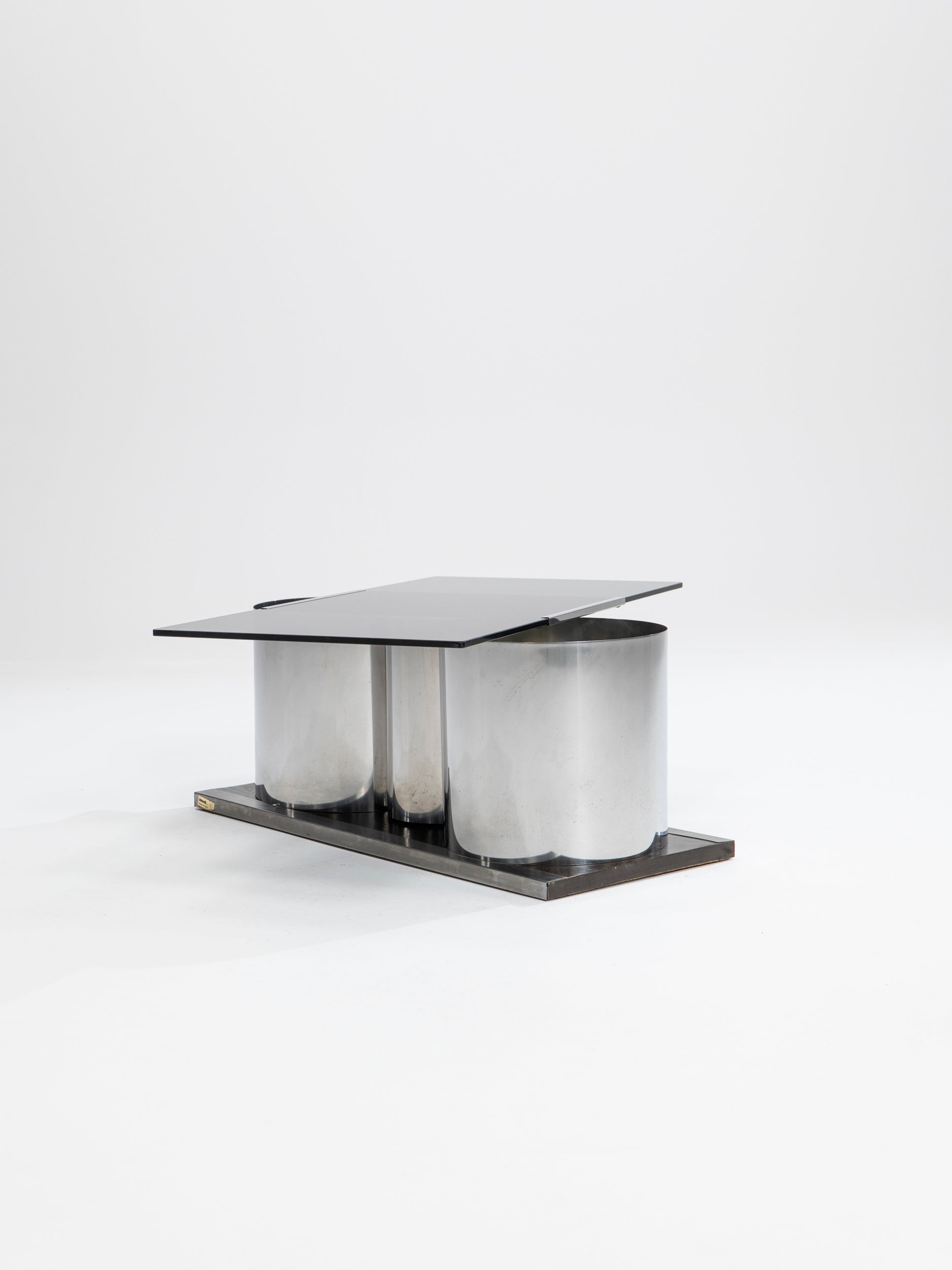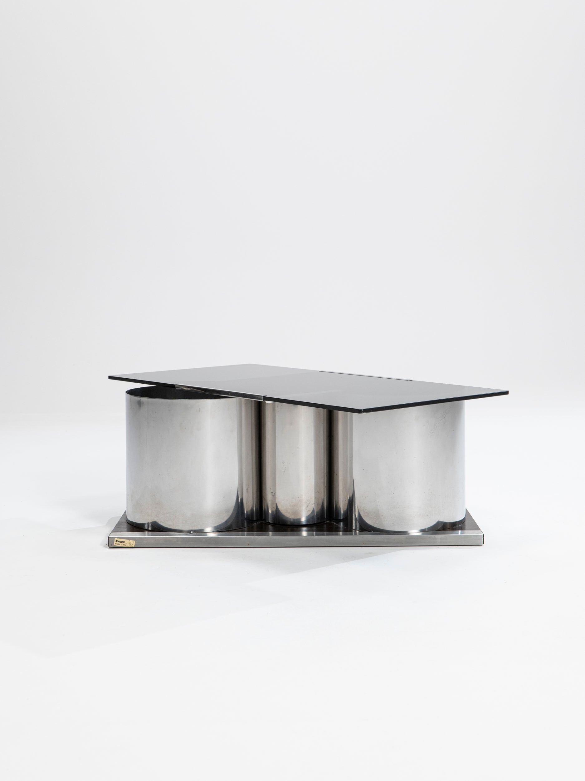 Two sheet metal cylinders to hold drinks, one to hold the revolving smoked glass top, all set upon a laminated wood base with metal-plated side, and flawless proportions. No one can deny that Lodovico Acerbis' design is as cool as they get.