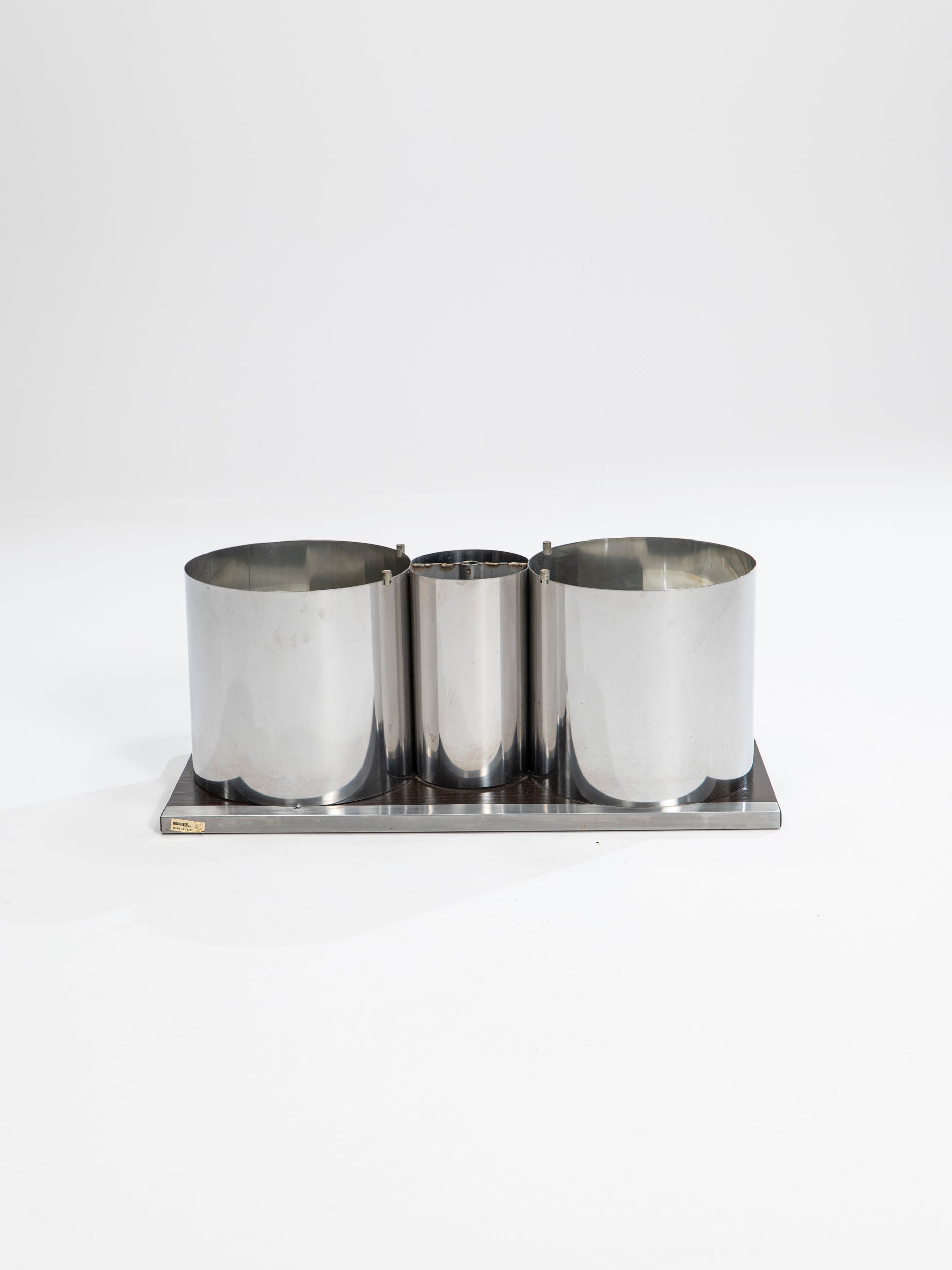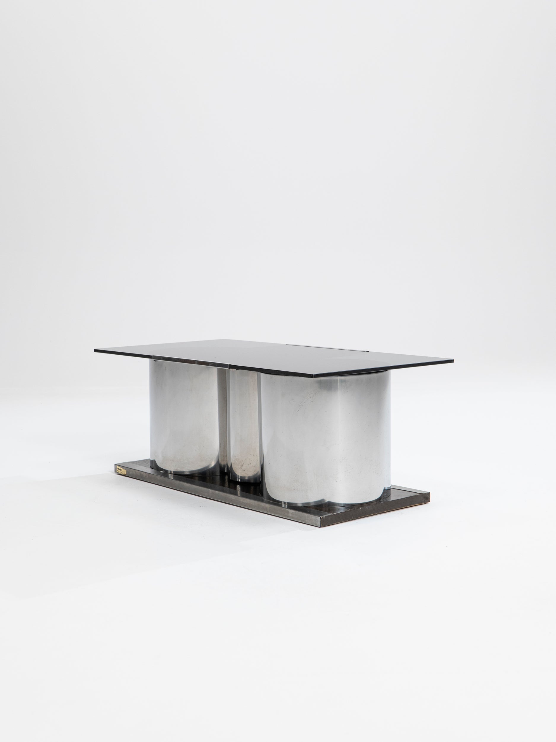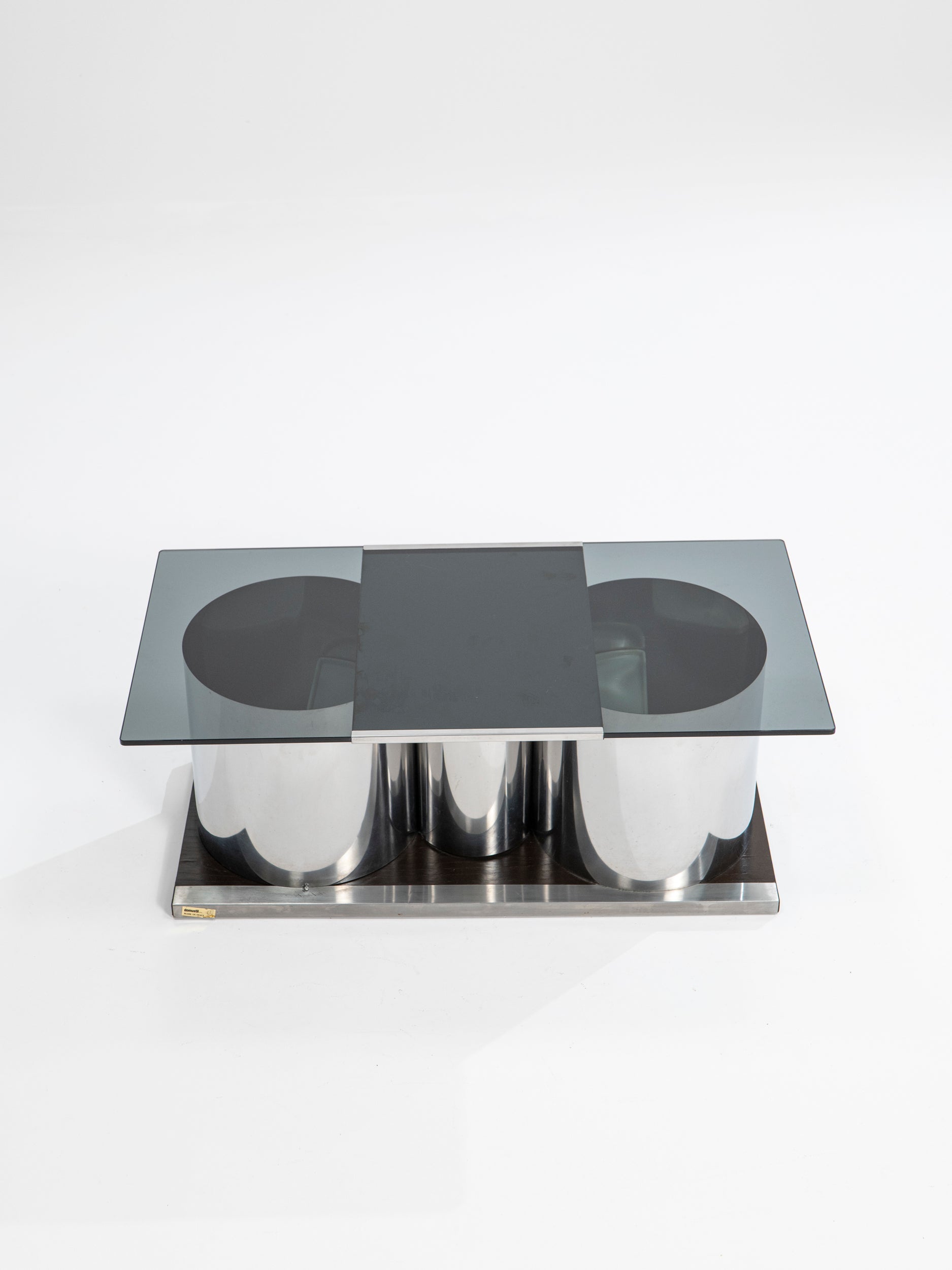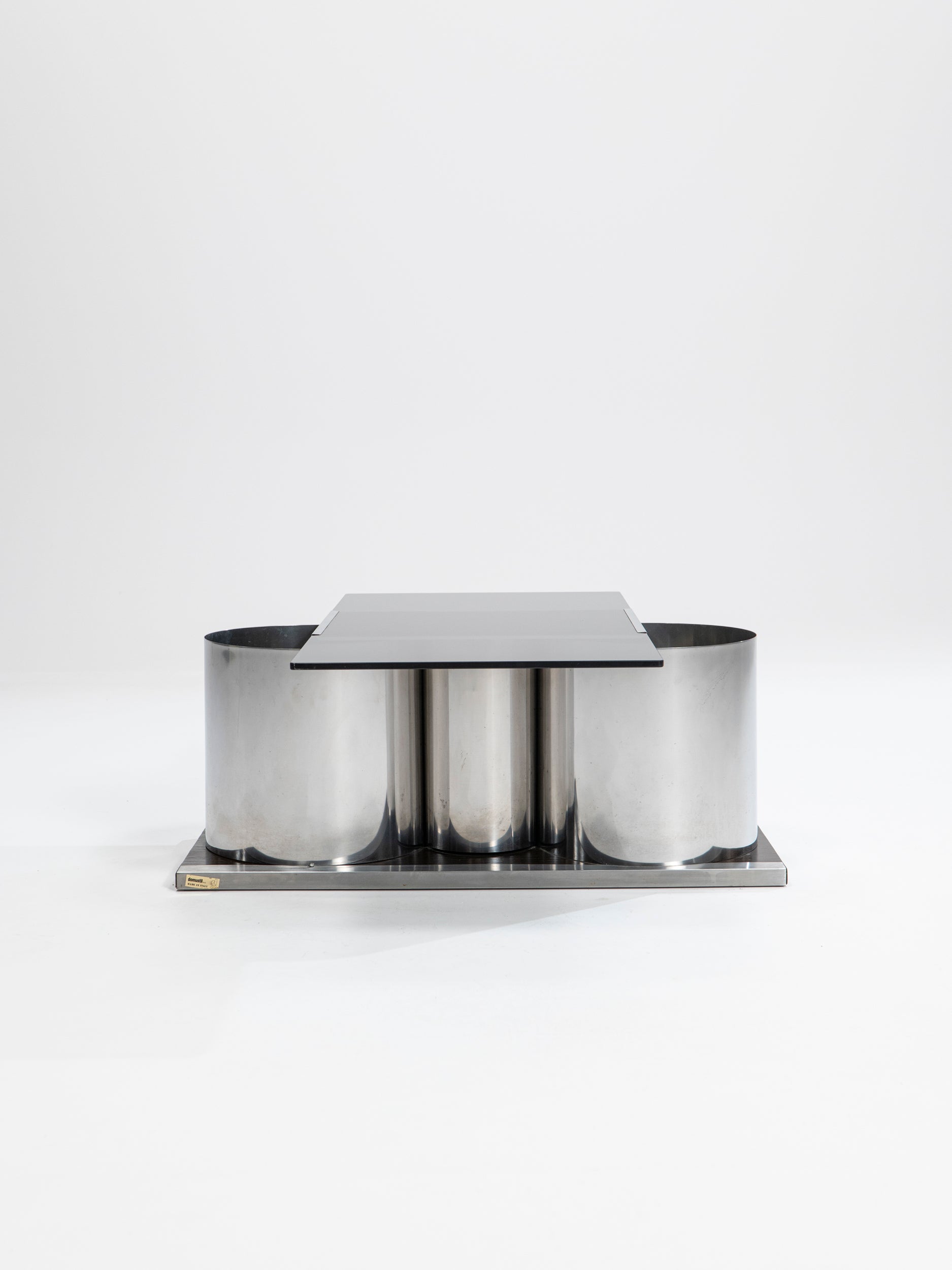 Two sheet metal cylinders to hold drinks, one to hold the revolving smoked glass top, all set upon a laminated wood base with metal-plated side, and flawless proportions. No one can deny that Lodovico Acerbis' design is as cool as they get.
