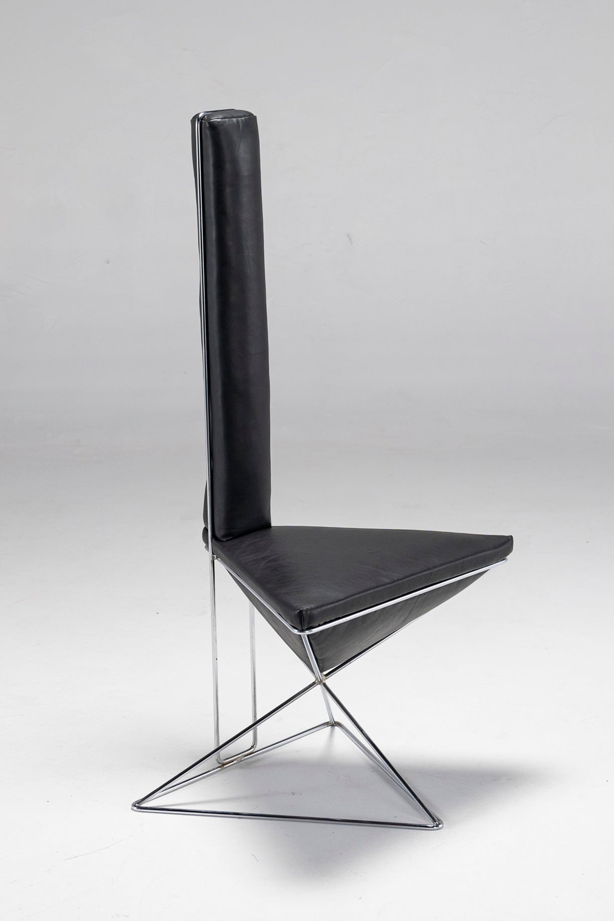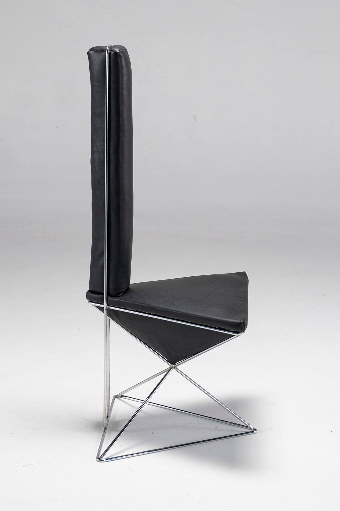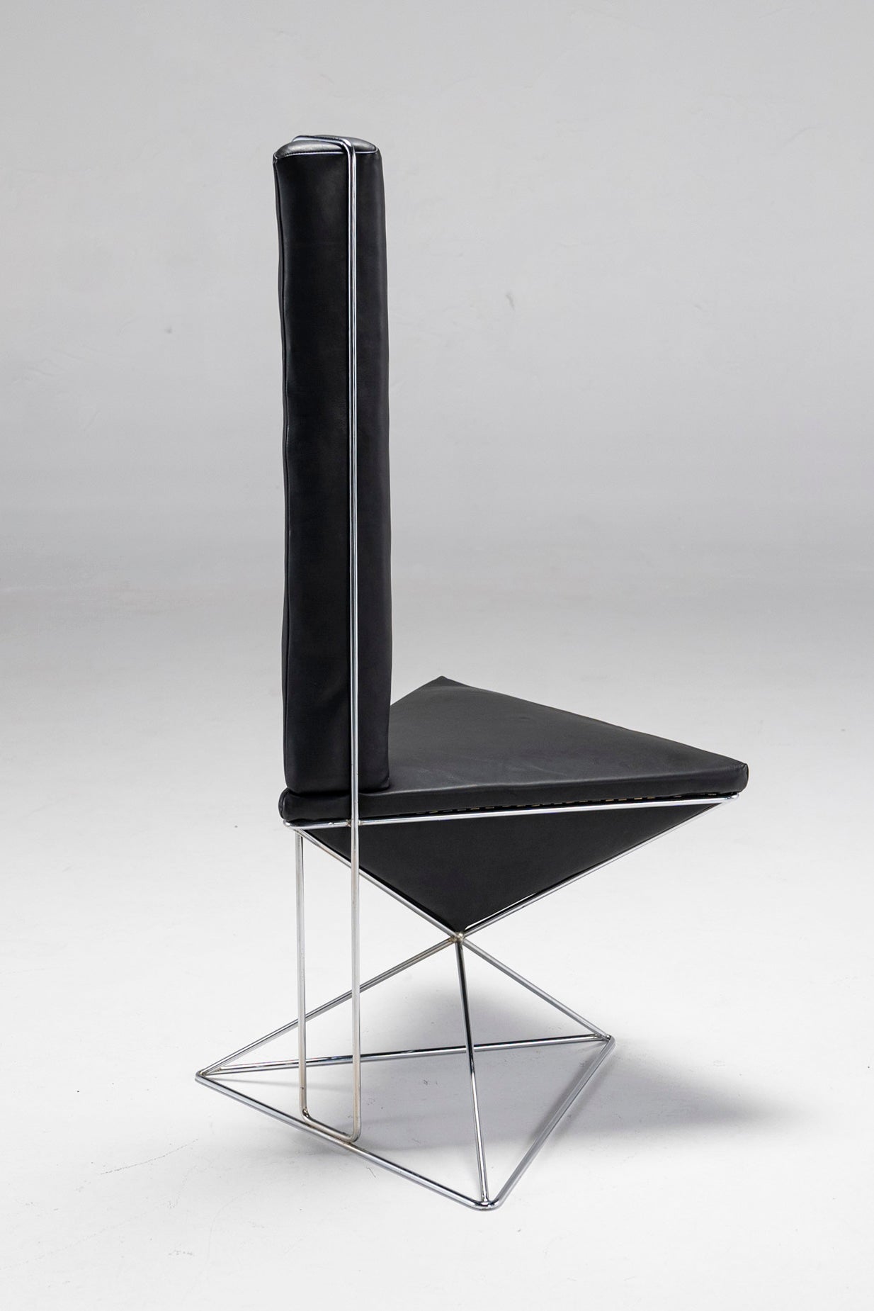 Featuring a chrome-plated wireframe, an inverted black leather pyramid seat and an elongated triangular black leather prism for a backrest, this accent chair does what it was made to do - it draws attention to itself. Place it in any space, and this large, dark arrow will let people know where it's at. The chair is also surprisingly comfortable, as both the seat and the backrest are filled with a soft, cushy material.