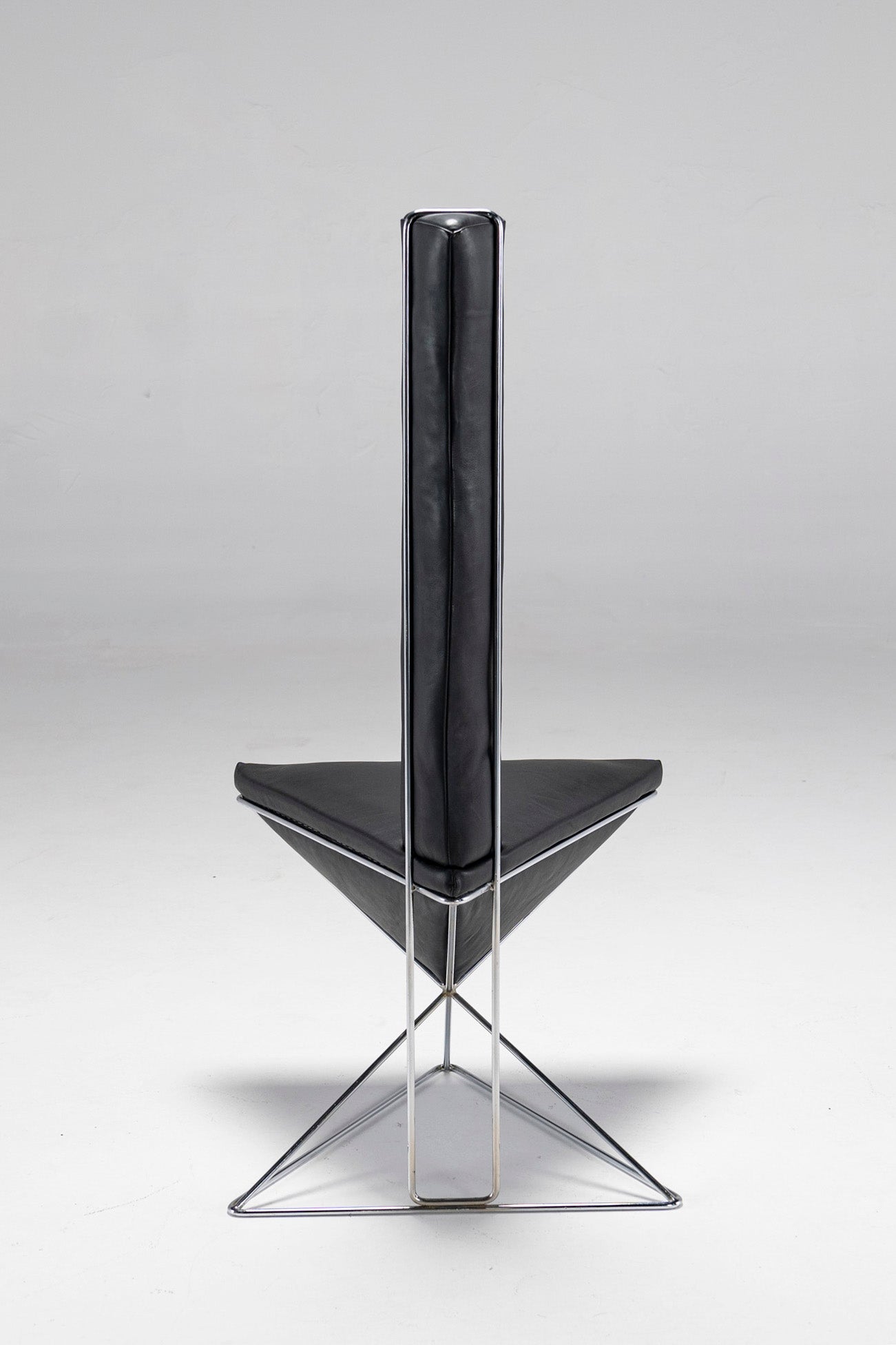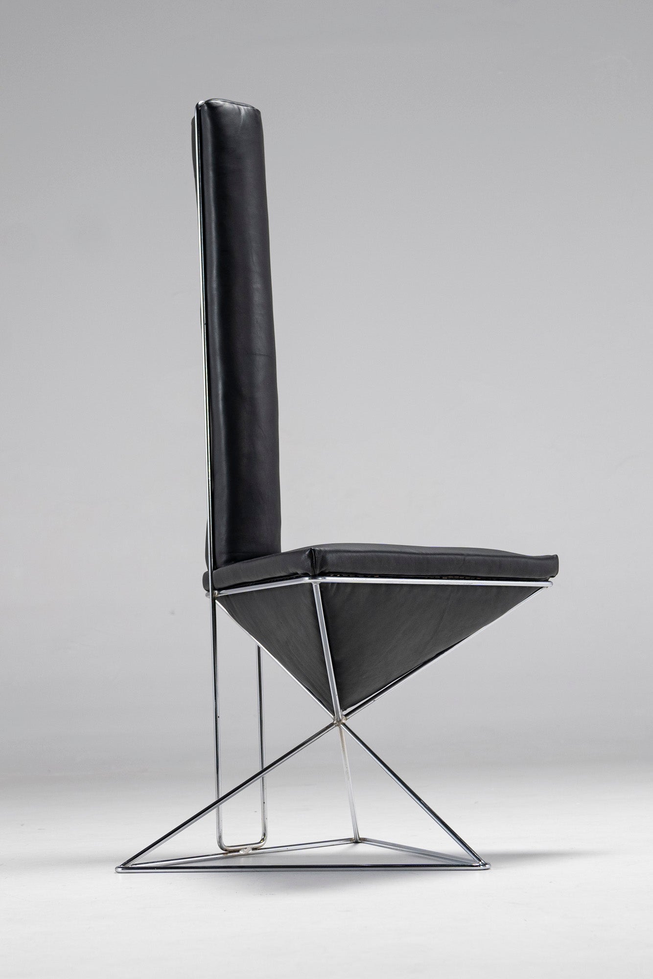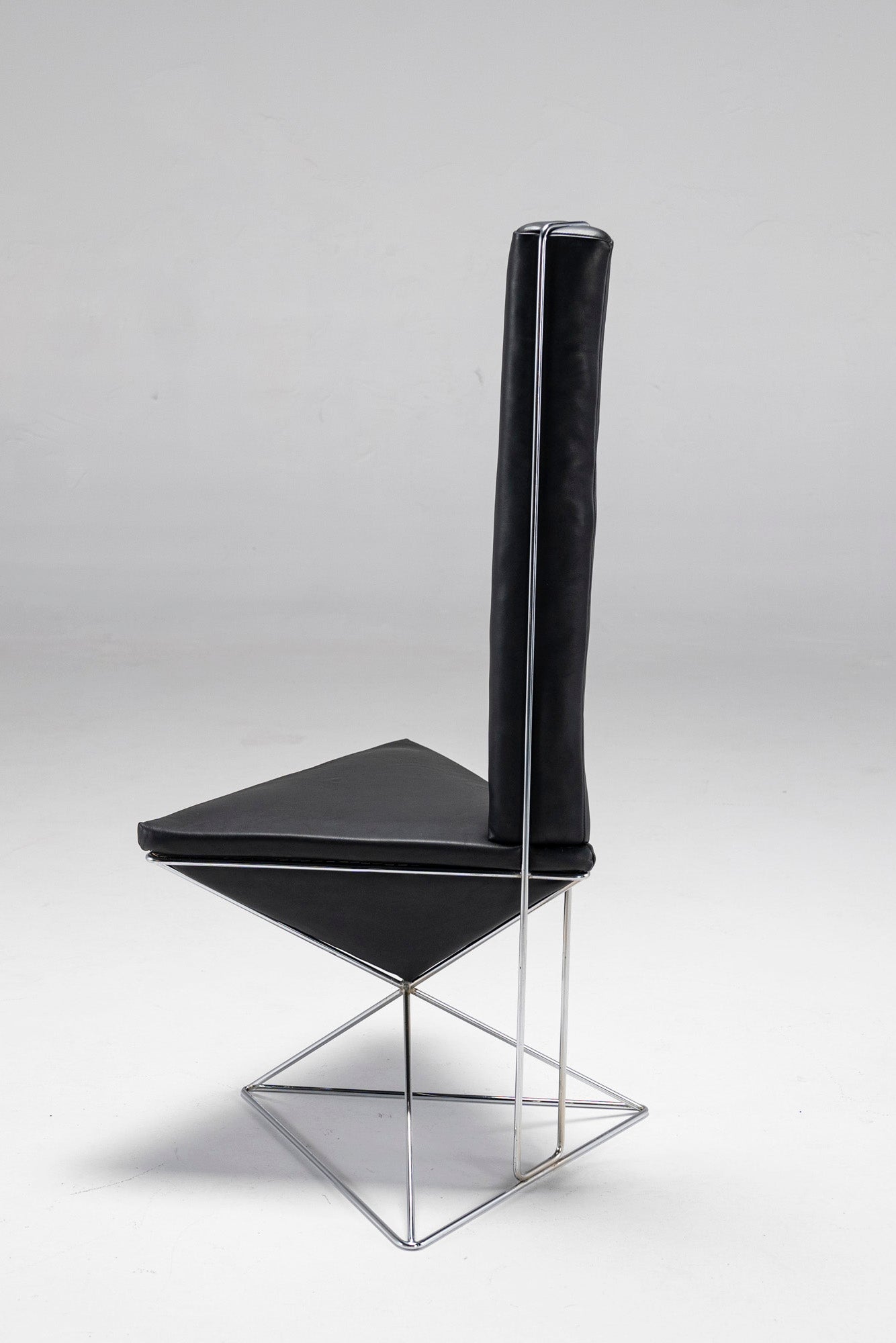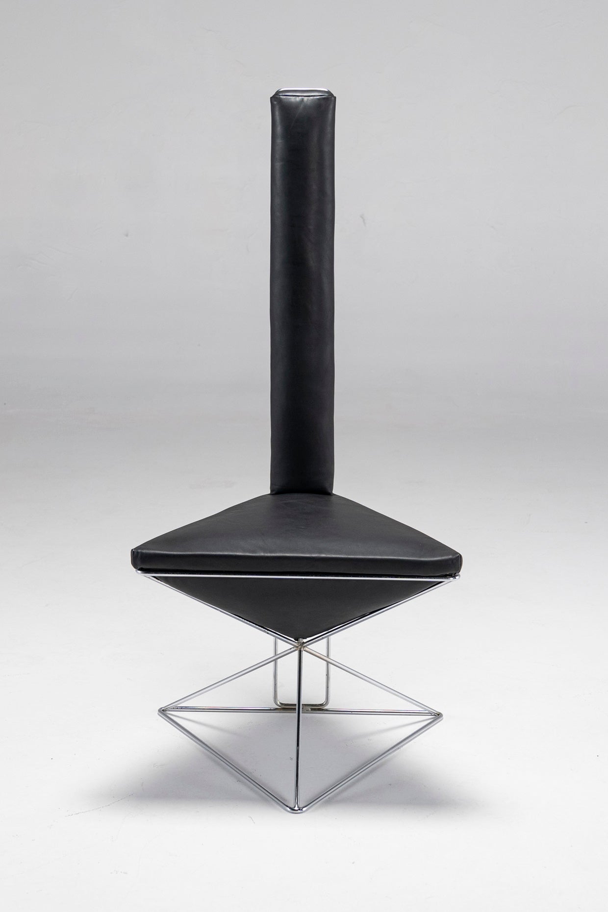 Featuring a chrome-plated wireframe, an inverted black leather pyramid seat and an elongated triangular black leather prism for a backrest, this accent chair does what it was made to do - it draws attention to itself. Place it in any space, and this large, dark arrow will let people know where it's at. The chair is also surprisingly comfortable, as both the seat and the backrest are filled with a soft, cushy material.
