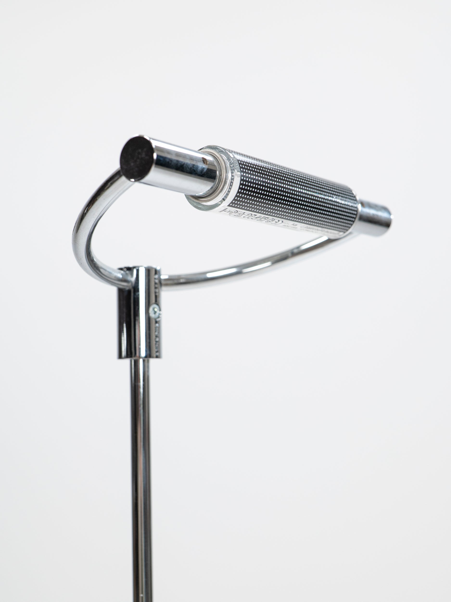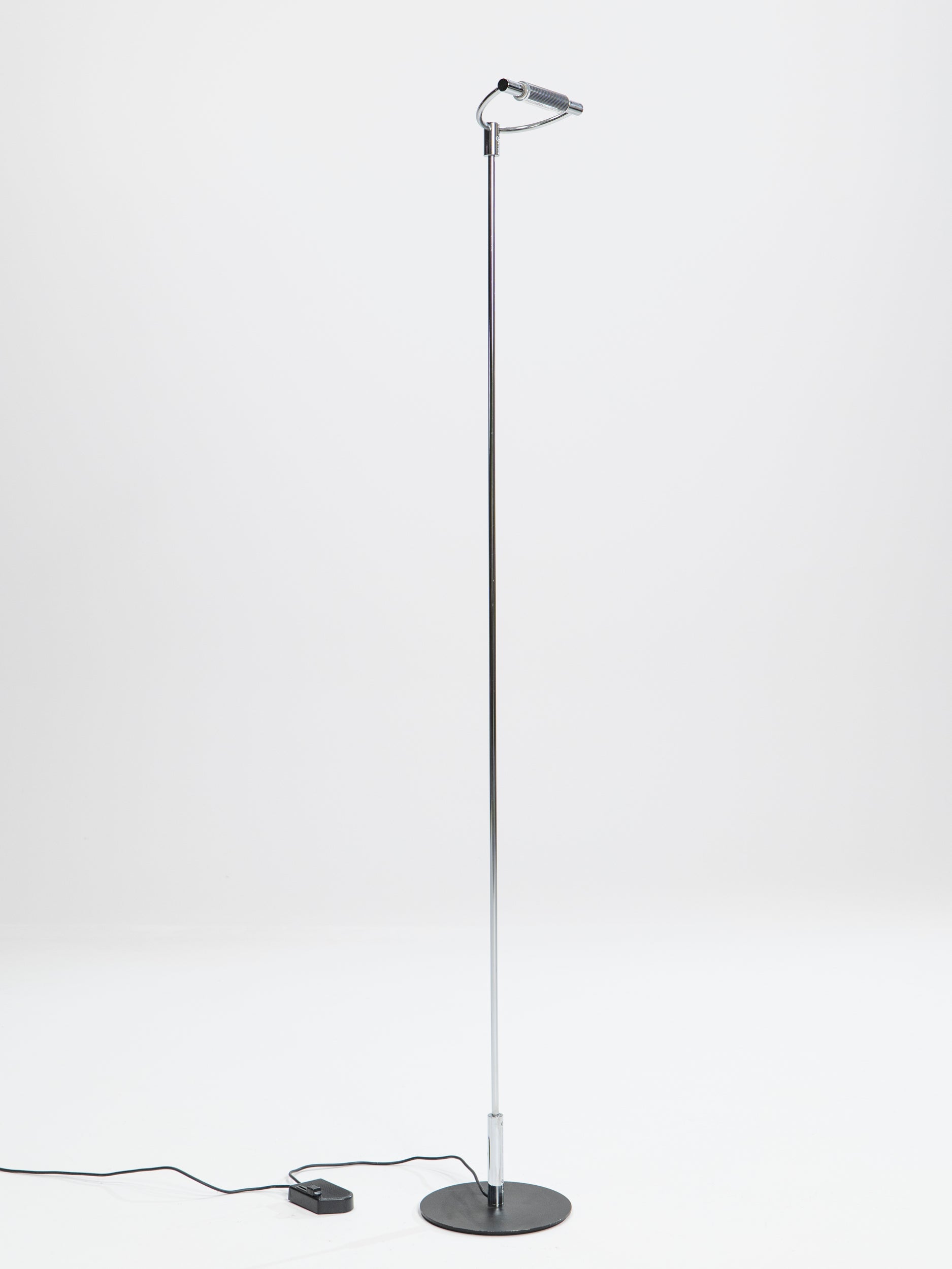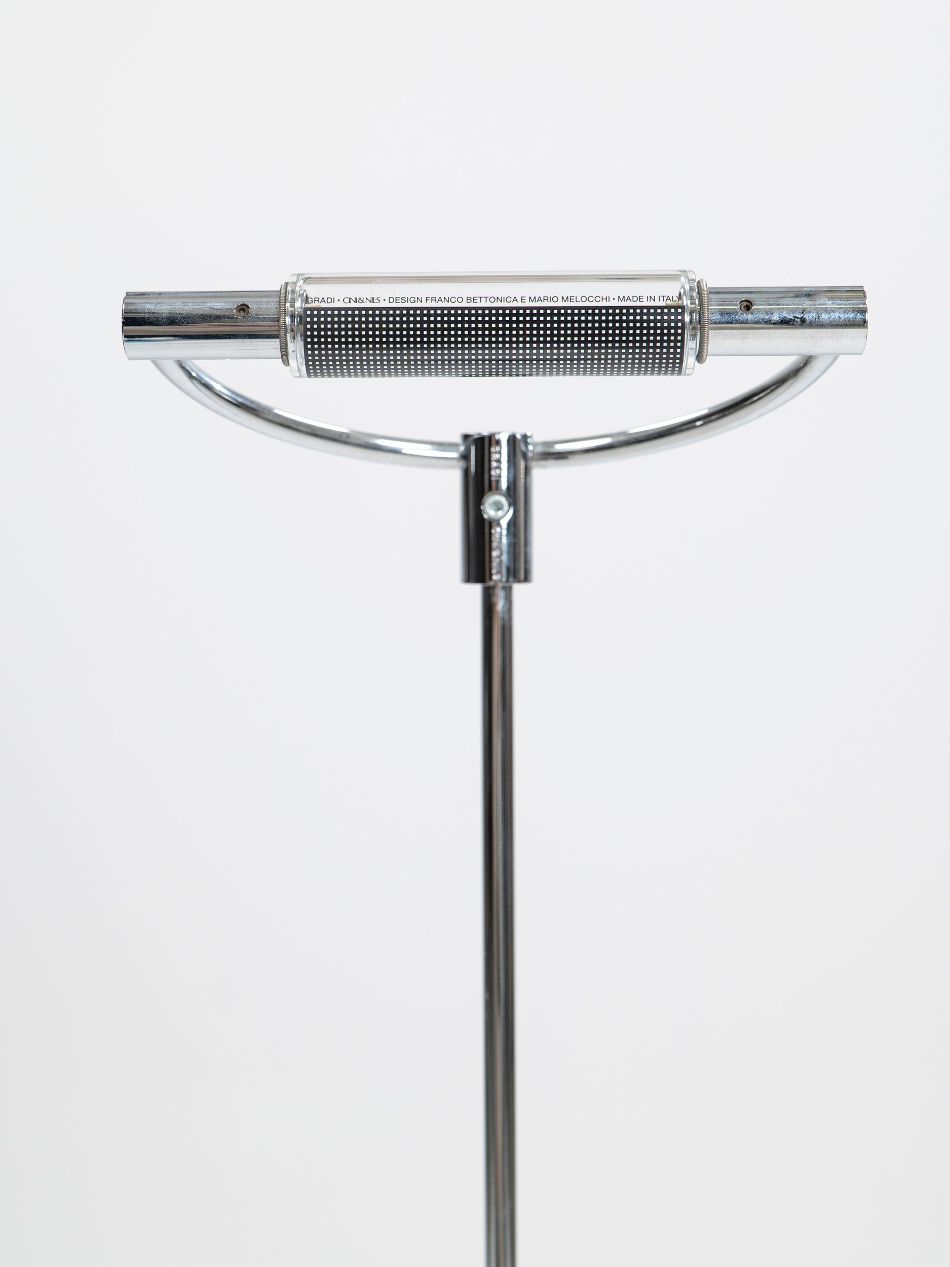 Designed in 1990 by Franco Bettonica and Mario Melocchi and produced by Cini & Nils, Gradi is a nickel-plated piece of alien technology that found its way to the human design market. This unforgettable piece, strongly reminiscent of the Neuralyzer used by the Men In Black to erase unsuspecting witnesses' memory, casts a warm, pleasant light through its borosilicate glass cylindrical diffuser, which can be adjusted by rotating the semicircle it's fixed upon. This easy-to-use and a-pleasure-to-look-at mechanism is fixed upon a slender nickel-plated column that descends into a matte black metal disc base.