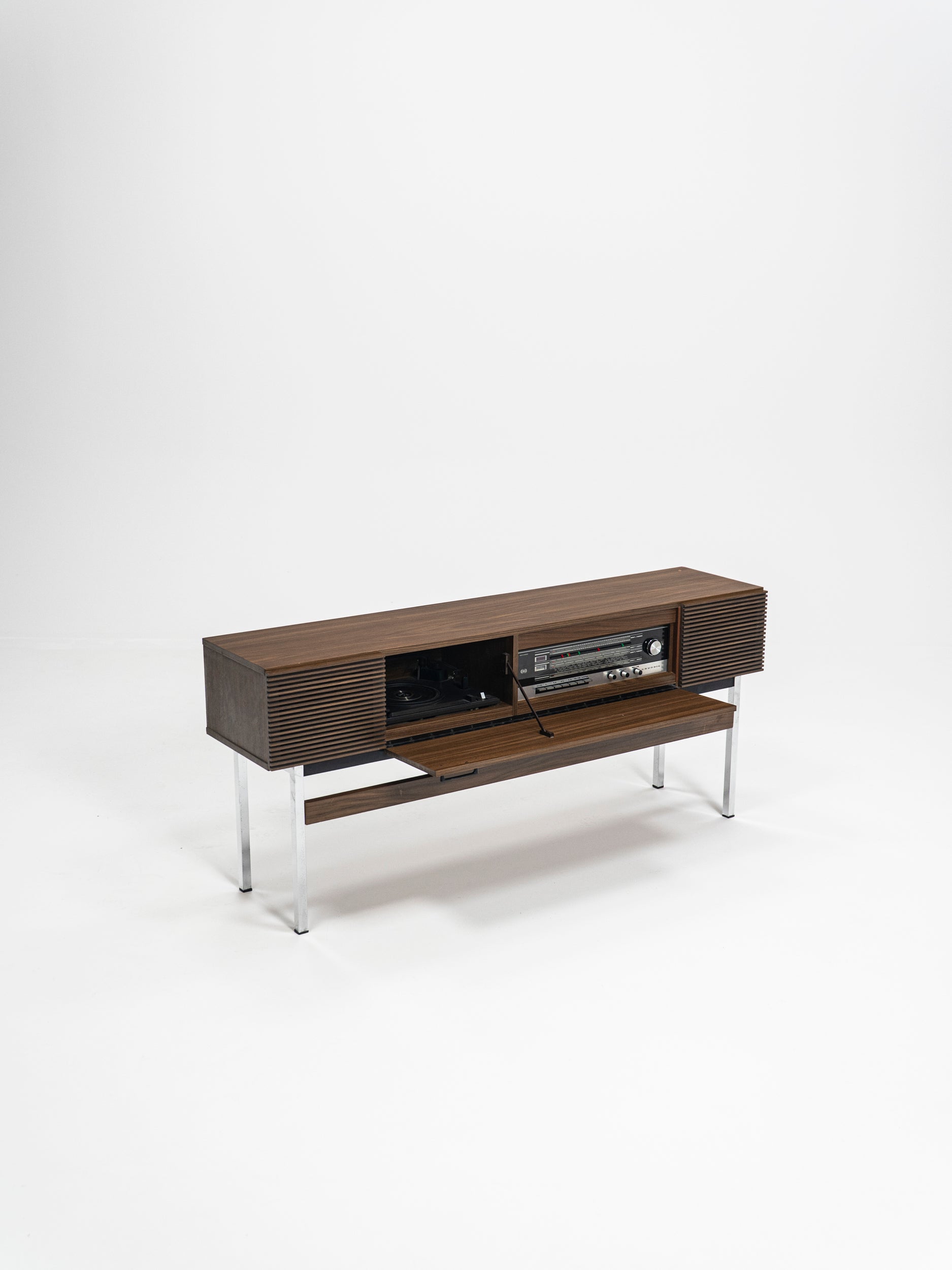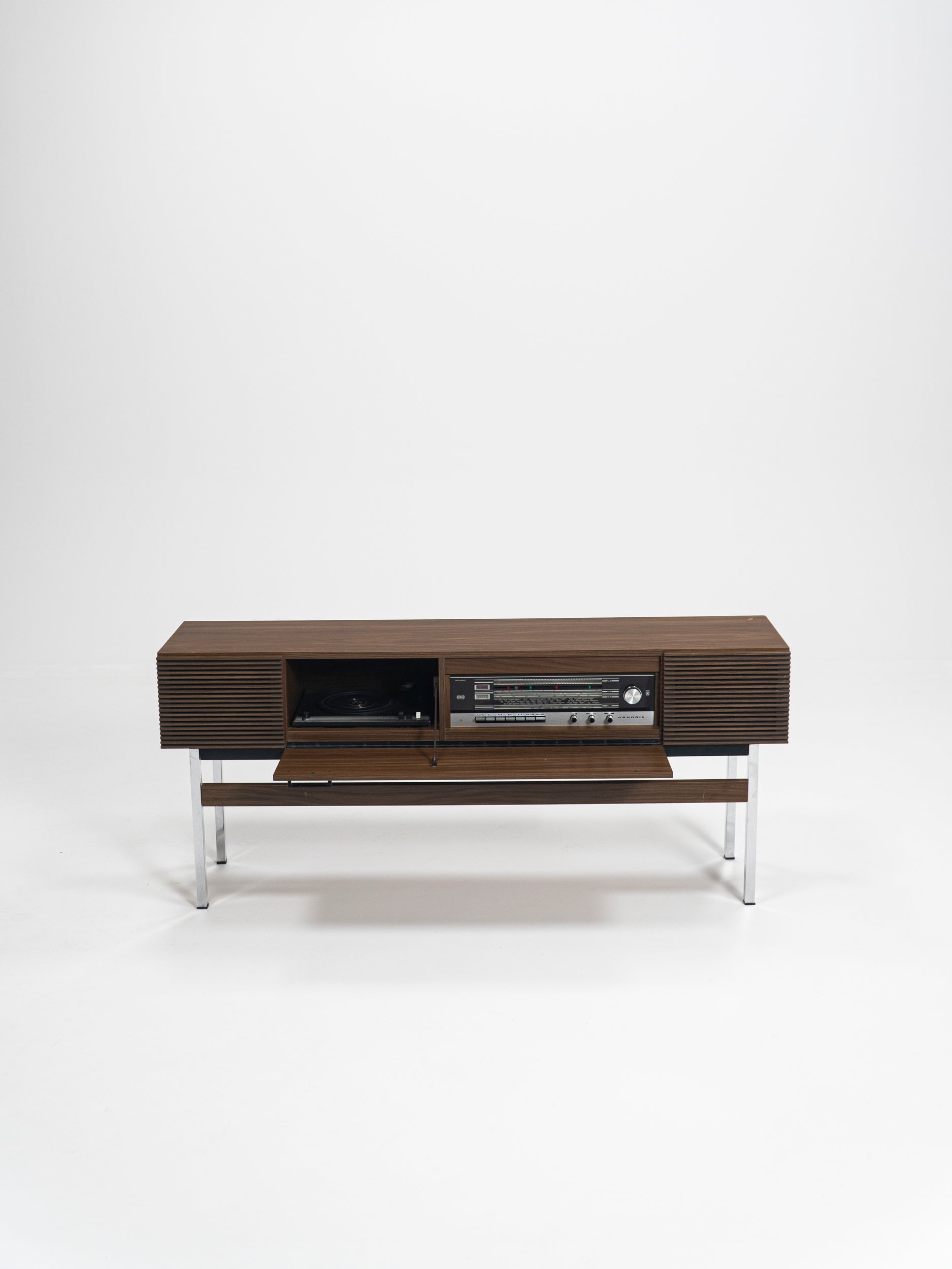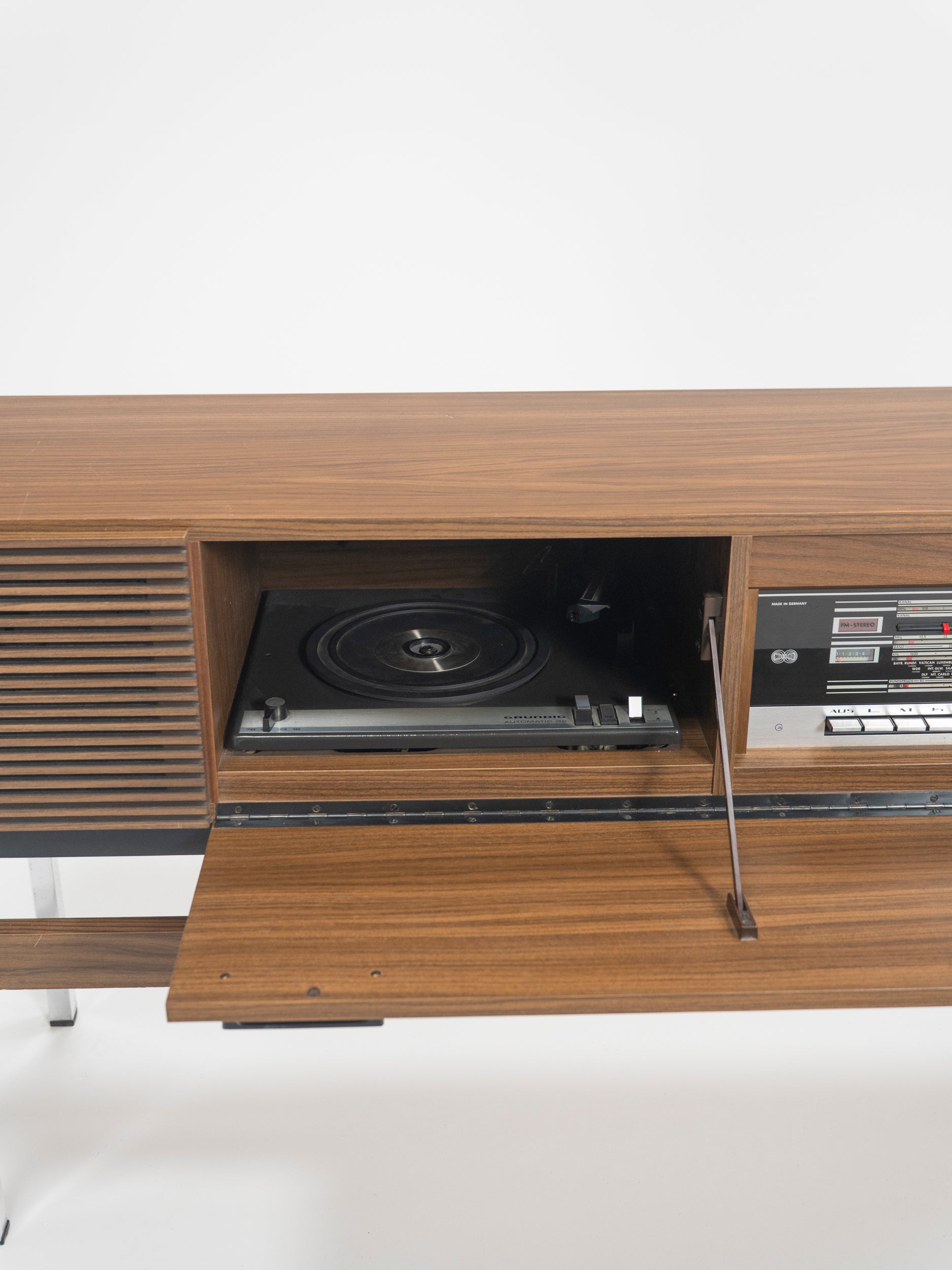 Nobody can deny that the 1970s yielded some of the most formidable electronics design, the best being West German. This Grundig audio sideboard, boasting a radio, record player and stereo speakers, is proof enough. Done in metal, wood veneer and black glass, this piece is all about slim, straight horizontal lines. The four control knobs and the turntable are about the only round shapes you'll encounter, as the 70s did away with the dreamy, fluid shapes of the previous decade, and established a more hard-nosed approach to life and, as we can see, design. Fifty years on, the machine lights up when you turn it on, but it needs an expert's touch in order to be fully working again.