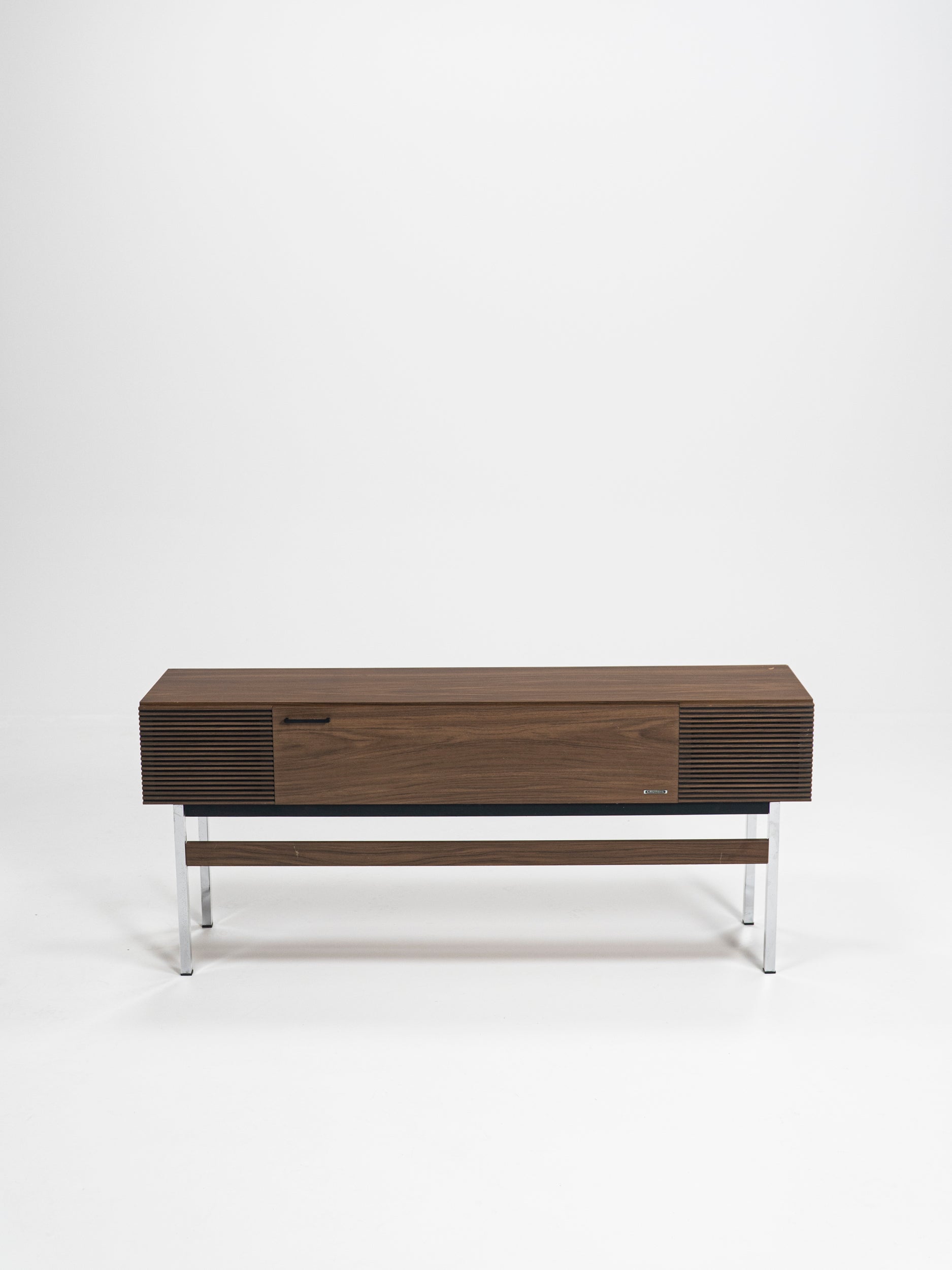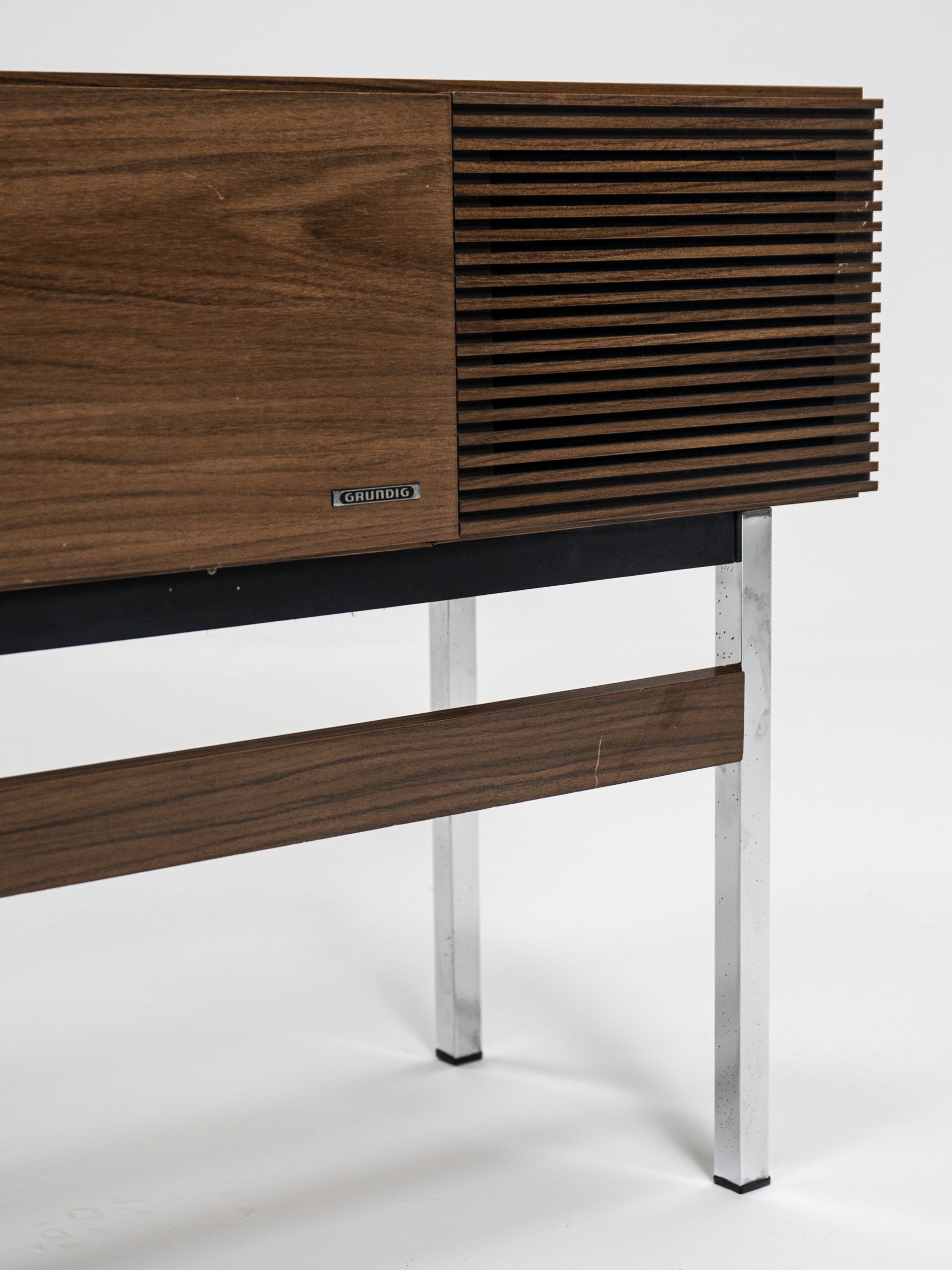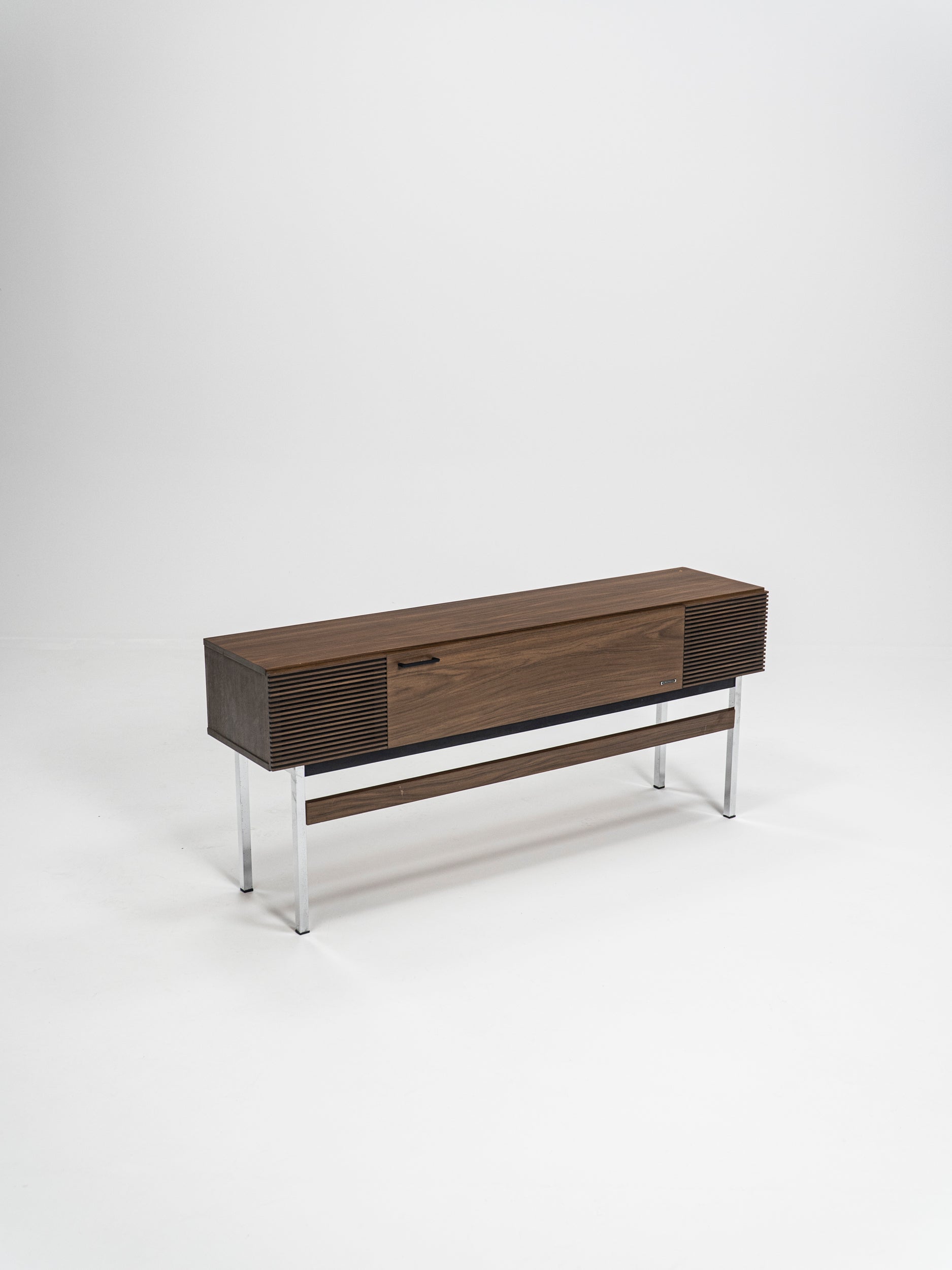 Nobody can deny that the 1970s yielded some of the most formidable electronics design, the best being West German. This Grundig audio sideboard, boasting a radio, record player and stereo speakers, is proof enough. Done in metal, wood veneer and black glass, this piece is all about slim, straight horizontal lines. The four control knobs and the turntable are about the only round shapes you'll encounter, as the 70s did away with the dreamy, fluid shapes of the previous decade, and established a more hard-nosed approach to life and, as we can see, design. Fifty years on, the machine lights up when you turn it on, but it needs an expert's touch in order to be fully working again.