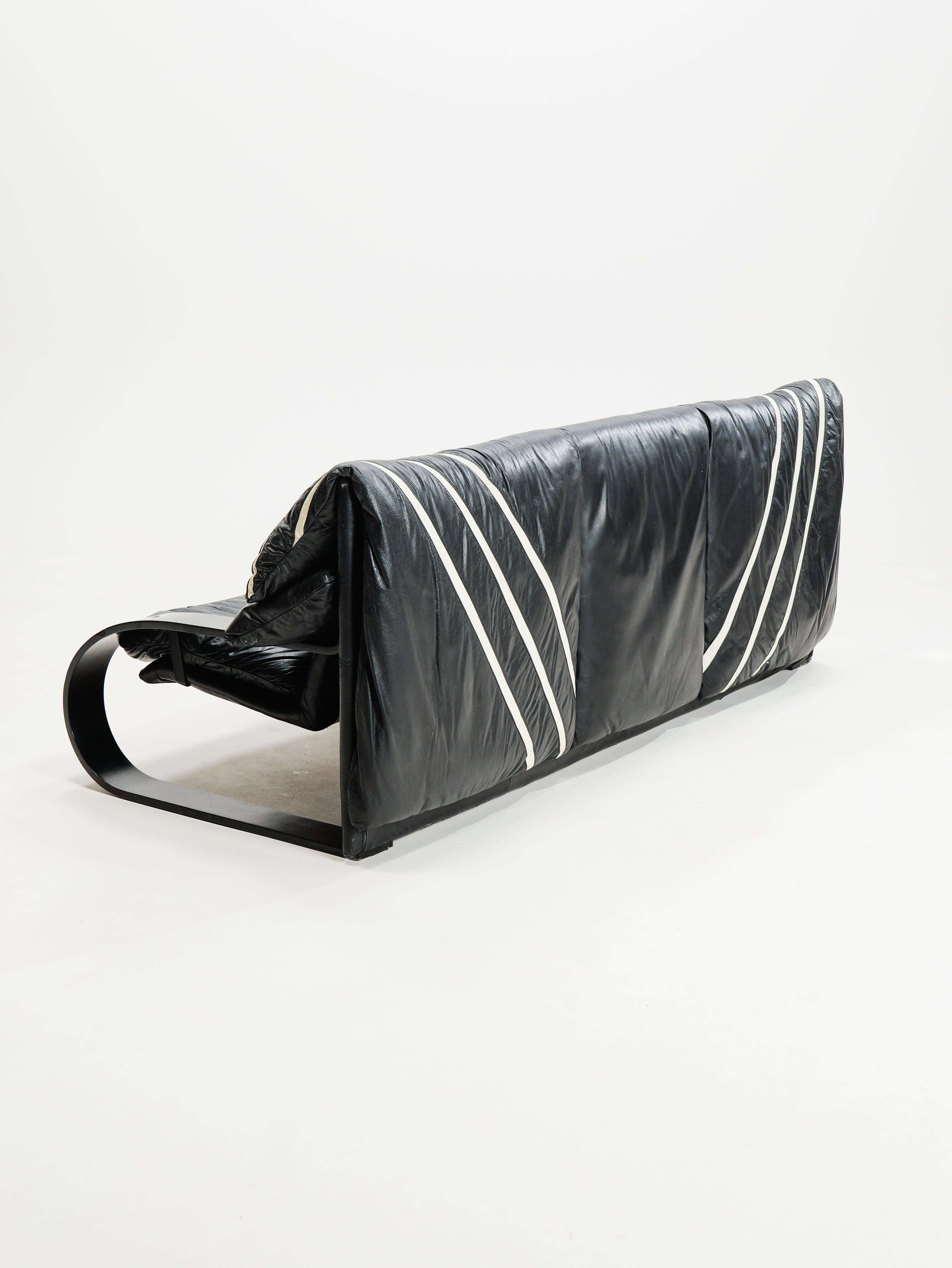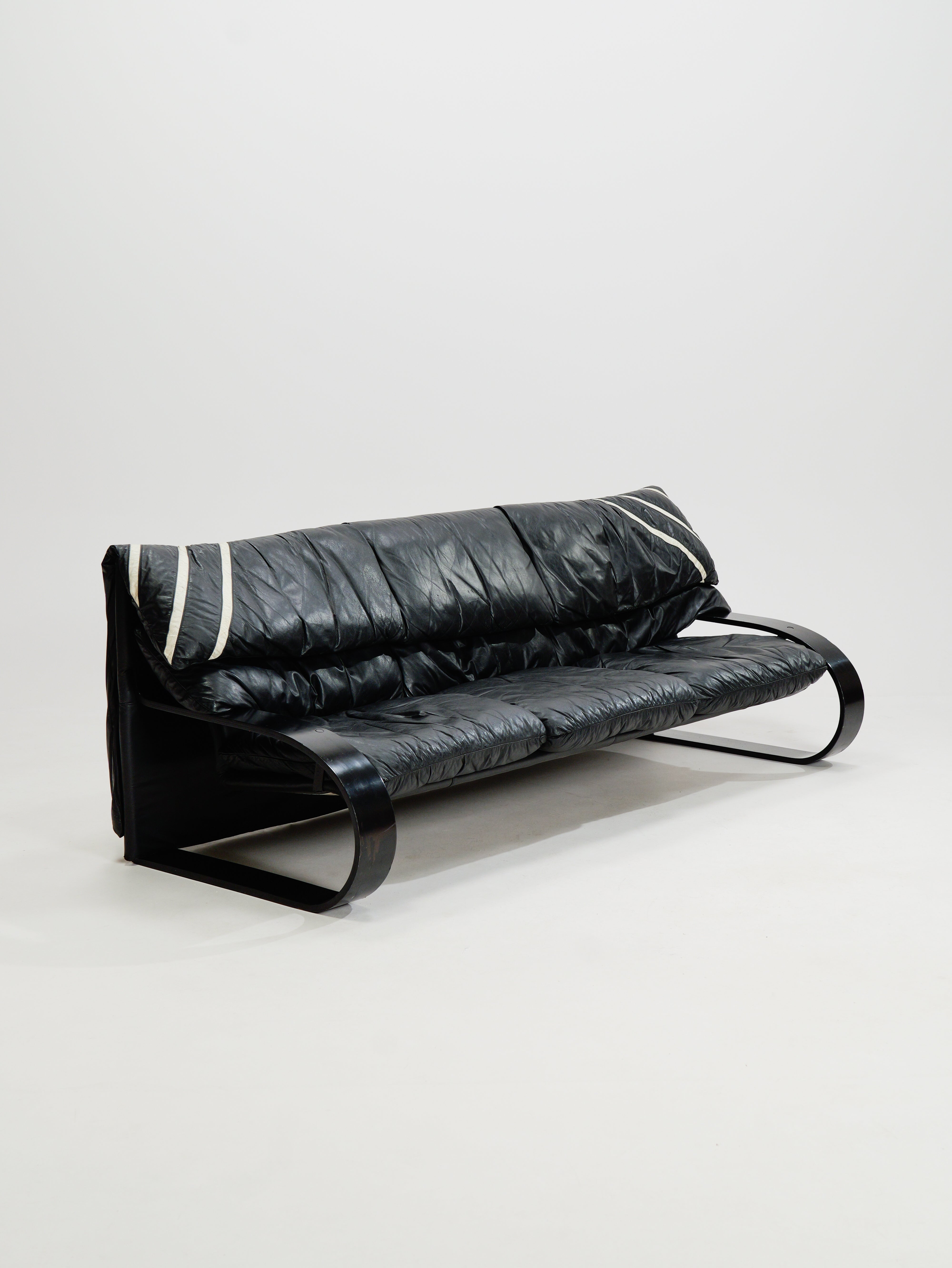 "Coralba" three-seater sofa, featuring black ebonized wood armrests.