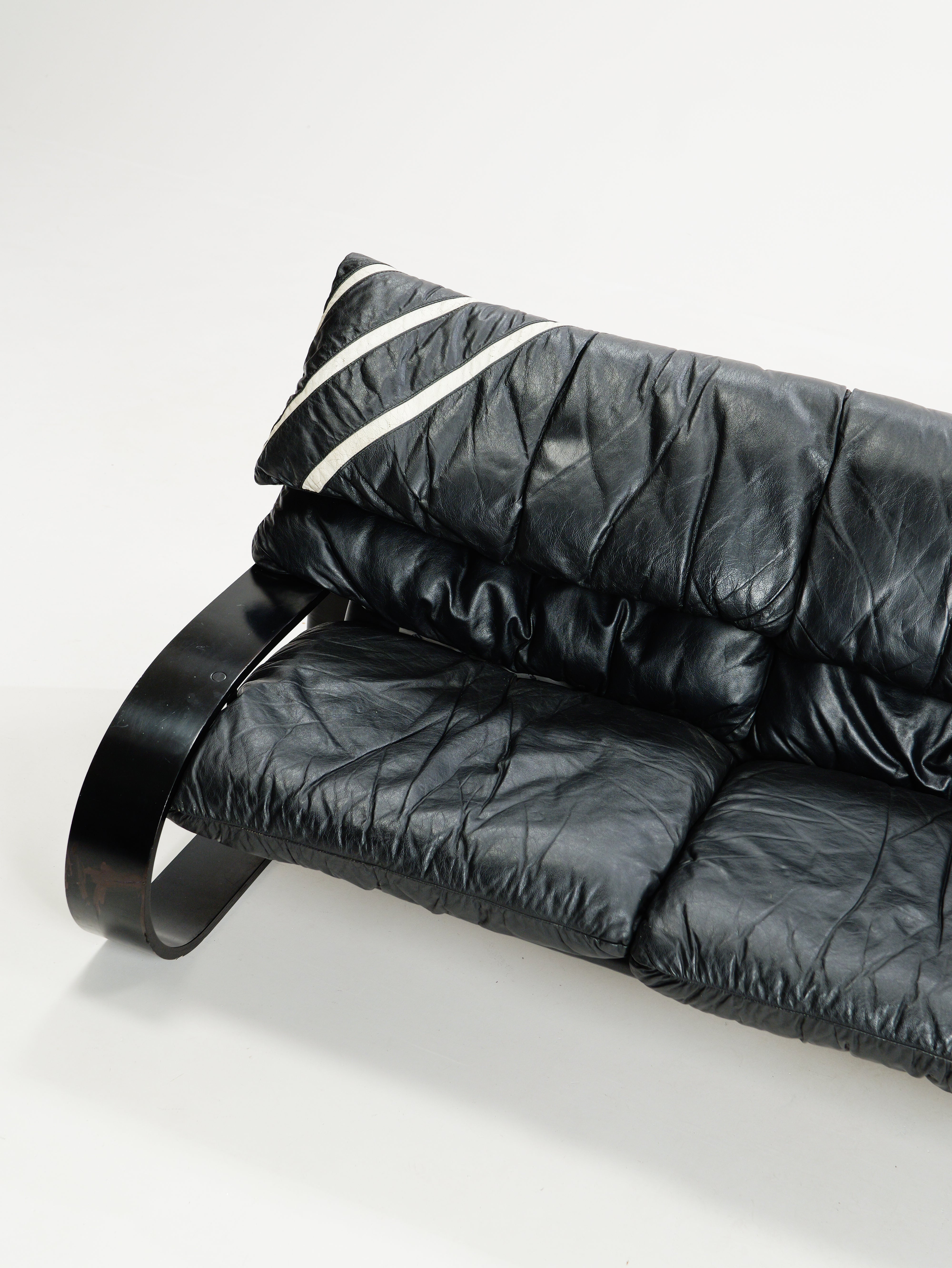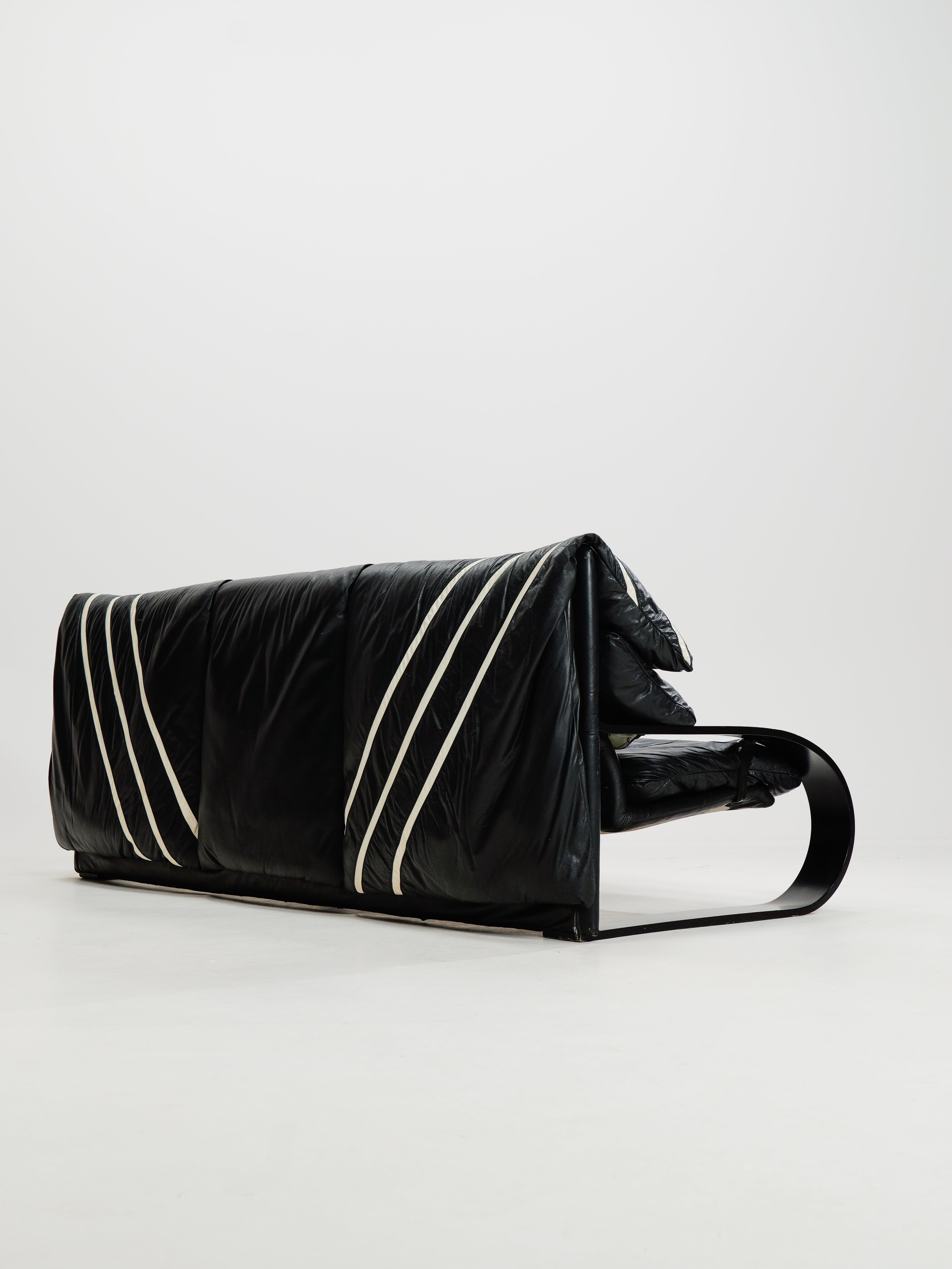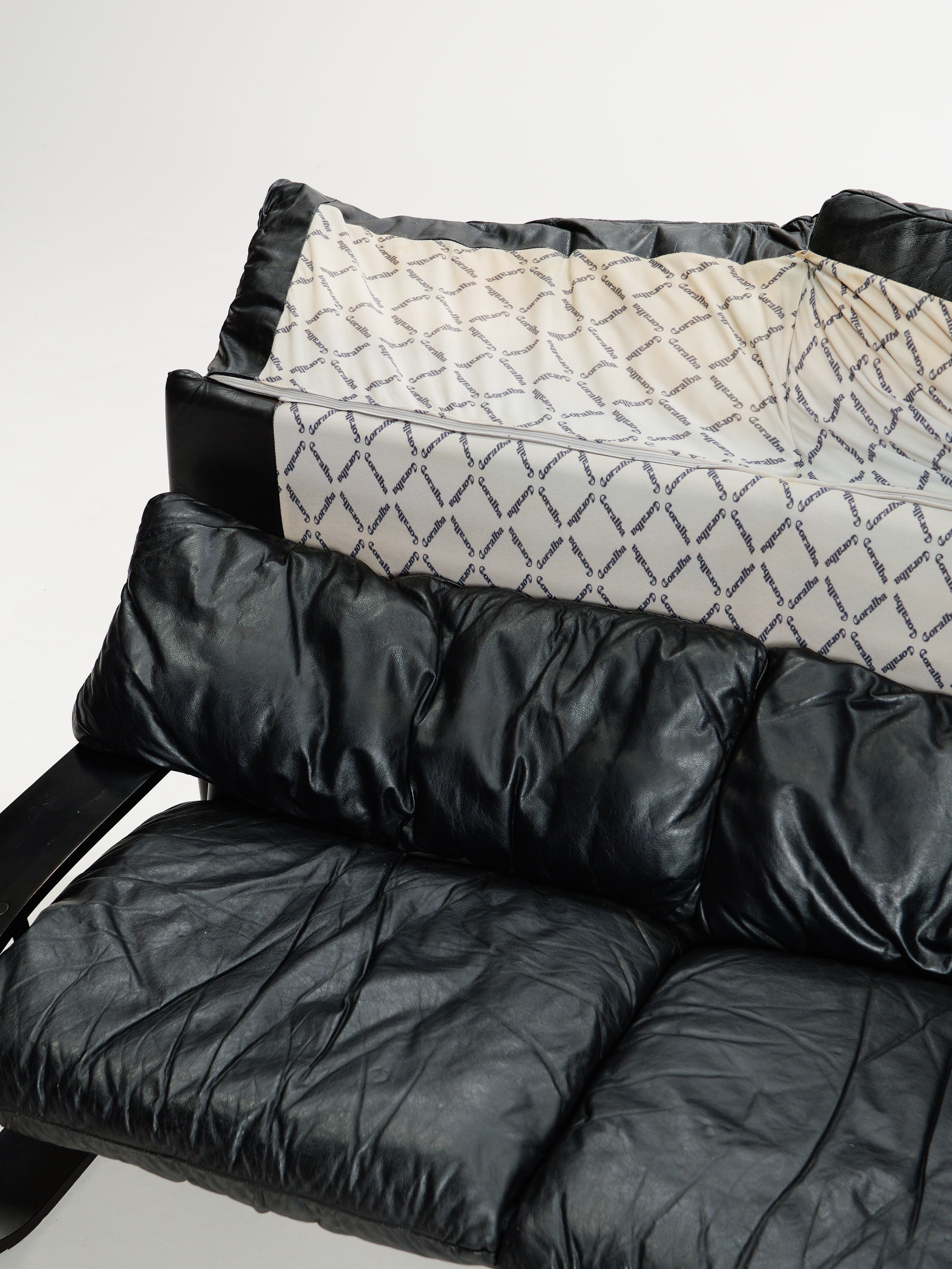 The Coralba sofa stands out through its modern, refined design with subtle industrial influences. Upholstered in high-quality black leather, it offers an elegant appearance and a comfortable seating experience. The generously padded seat and backrest feature visible stitching that adds texture and visual depth.