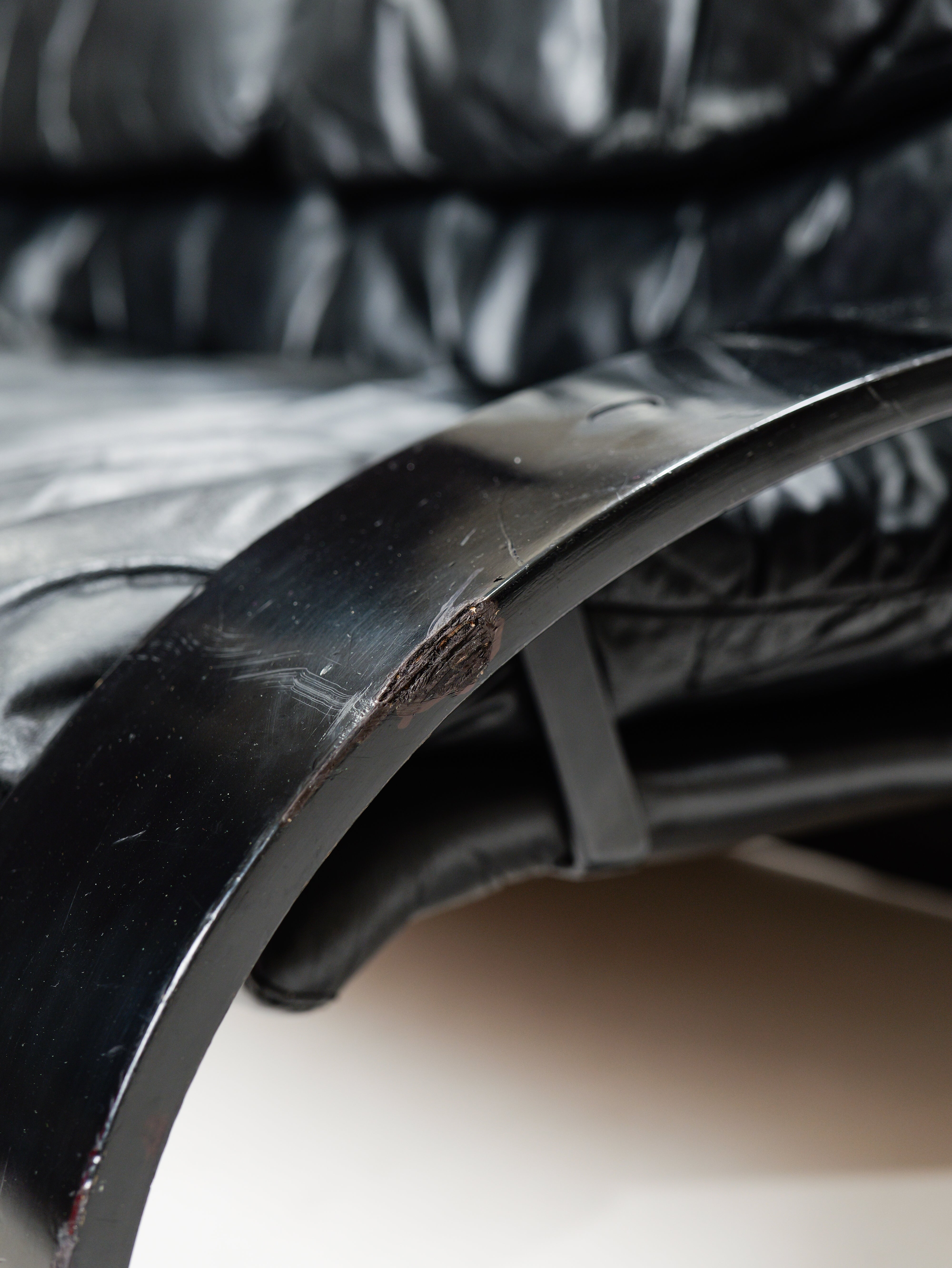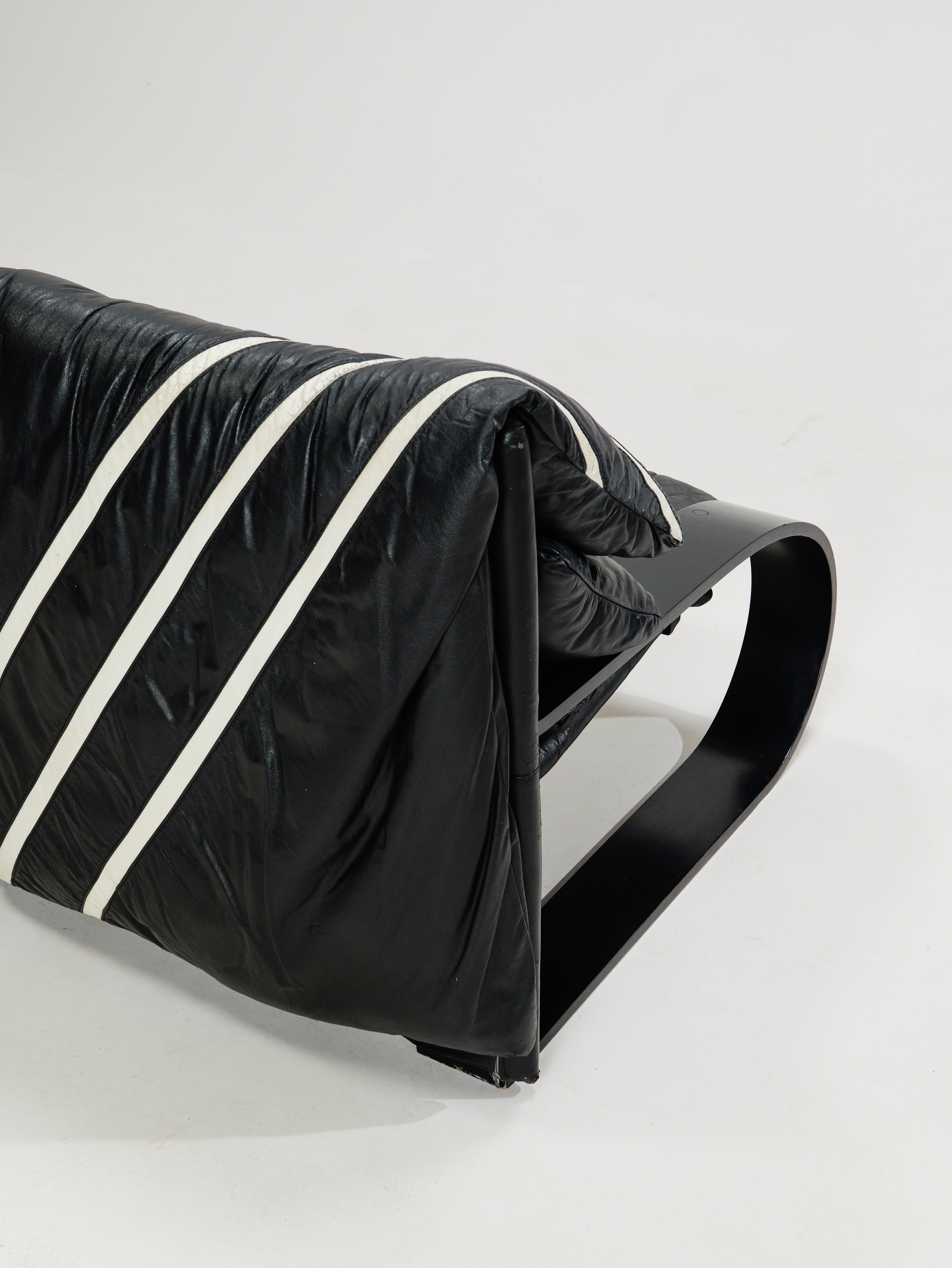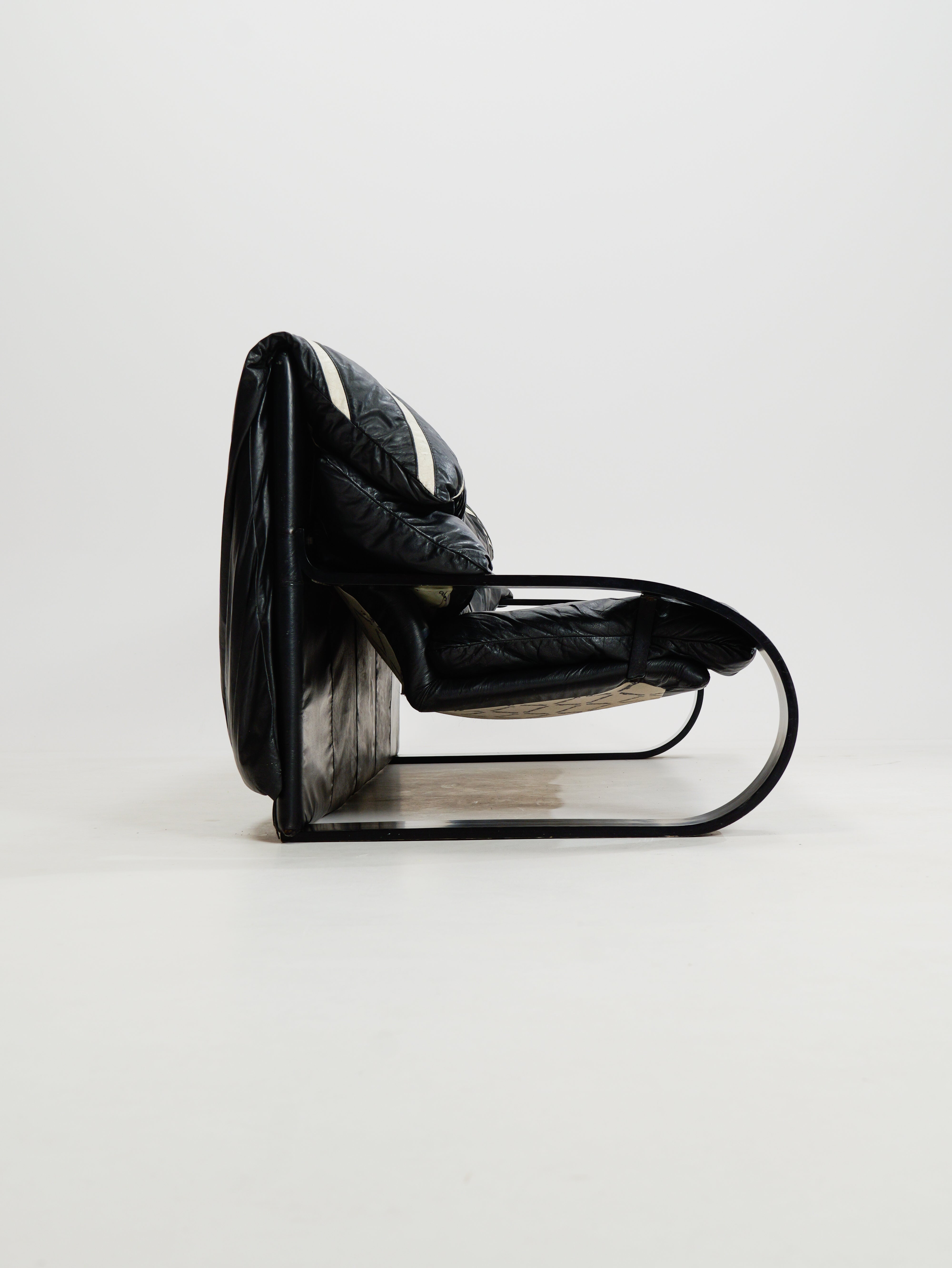 The Coralba sofa stands out through its modern, refined design with subtle industrial influences. Upholstered in high-quality black leather, it offers an elegant appearance and a comfortable seating experience. The generously padded seat and backrest feature visible stitching that adds texture and visual depth.