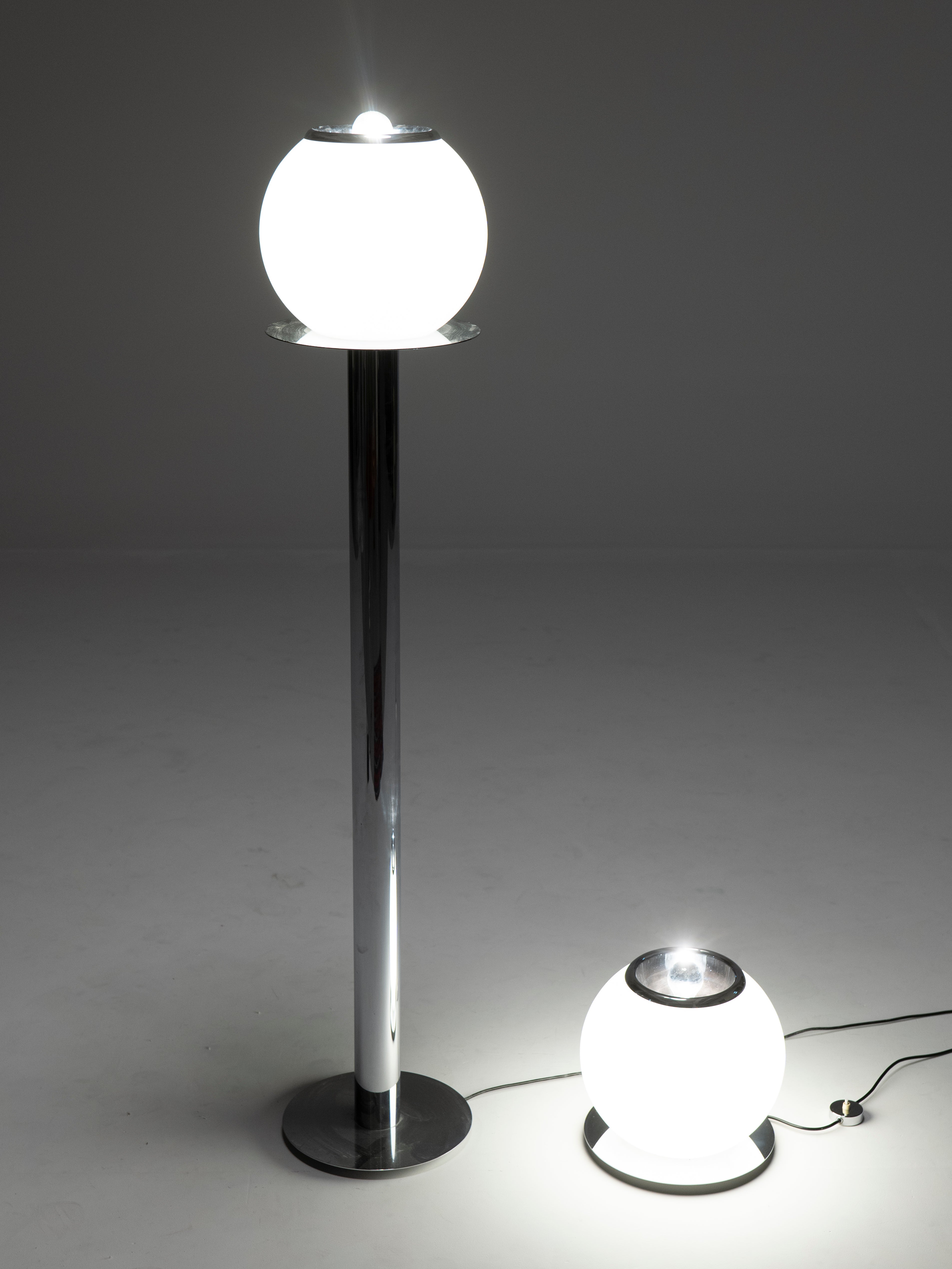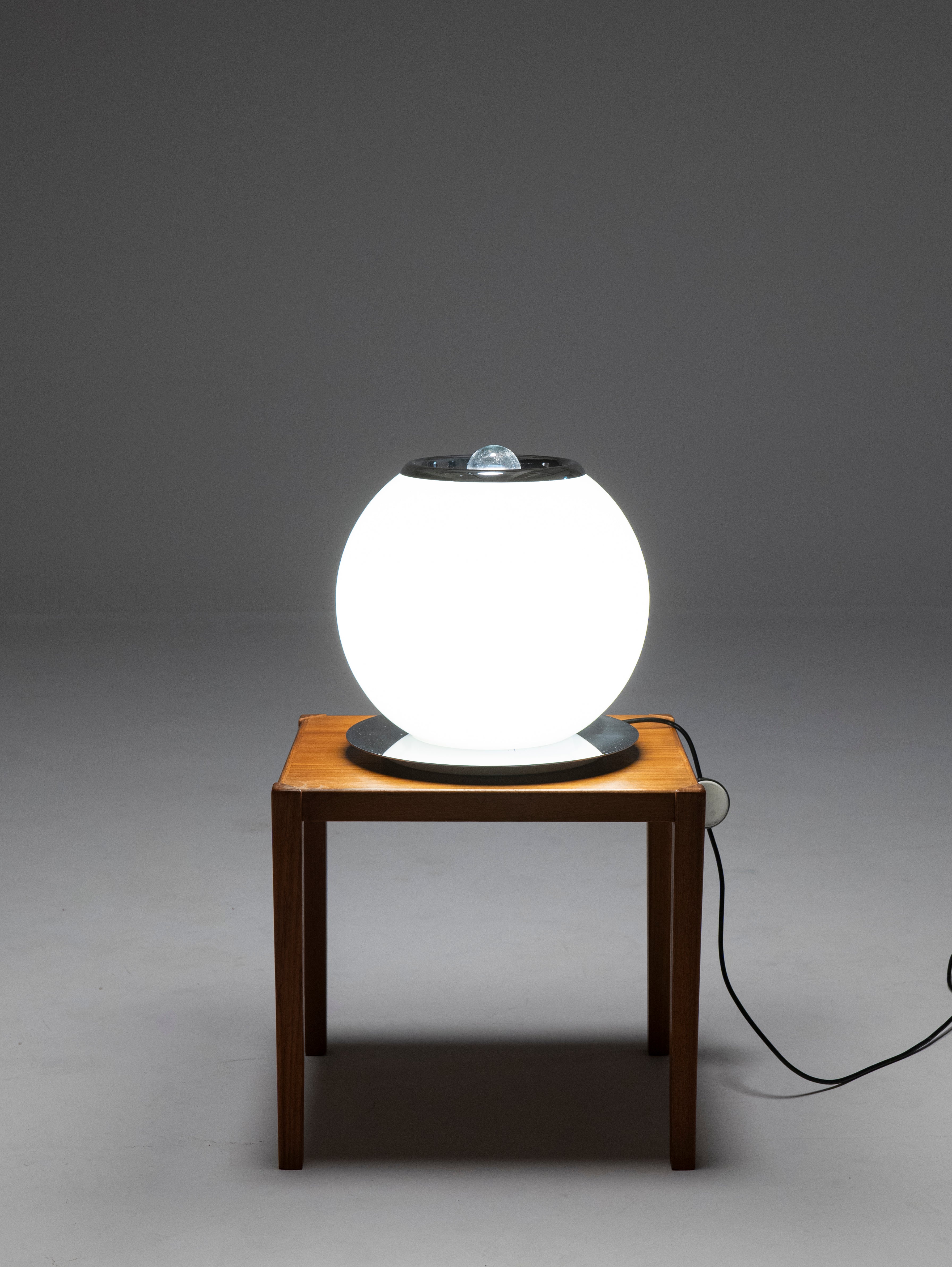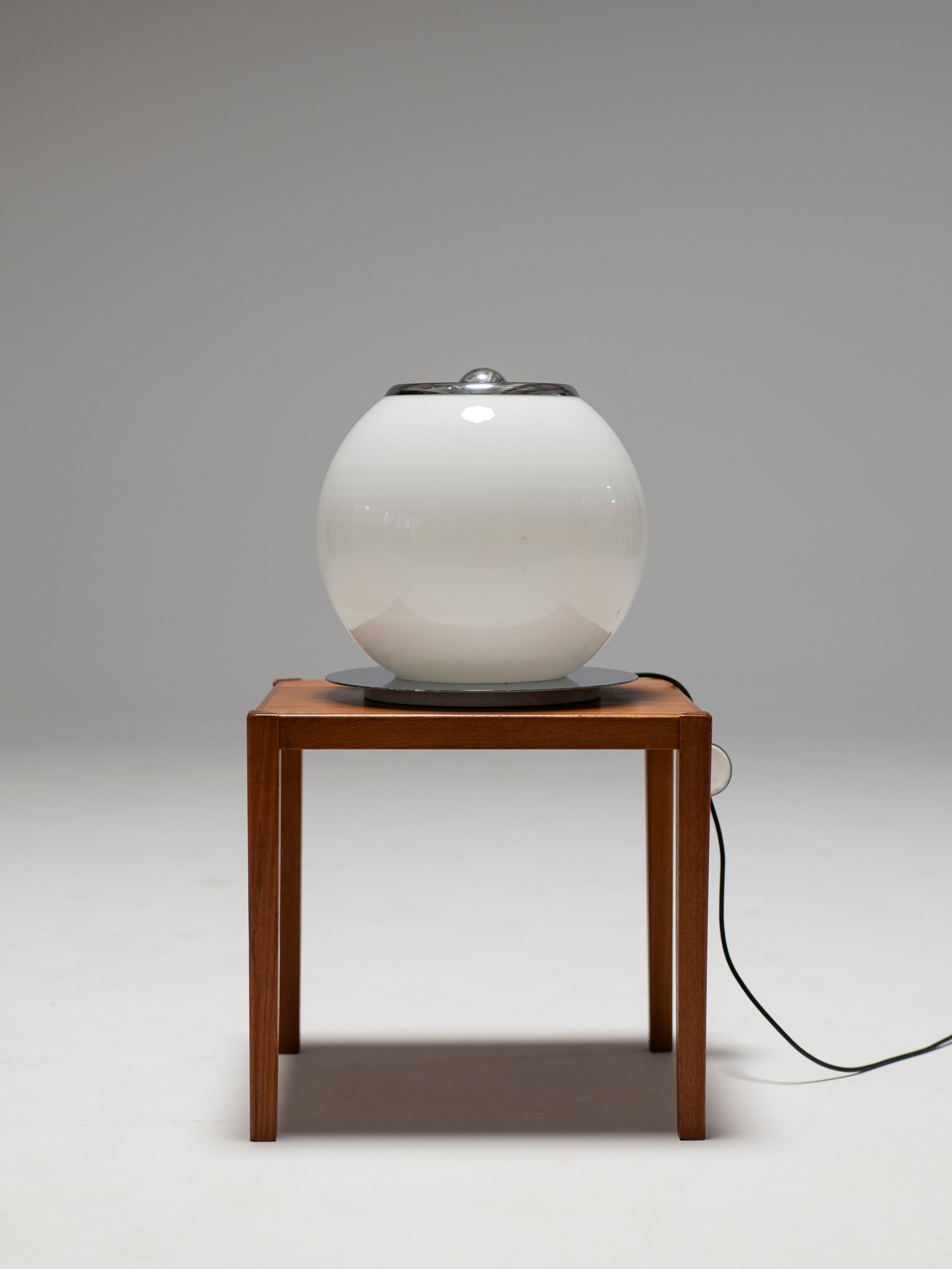 For their next magic trick, Giuliana Gramigna and Sergio Mazza set a large, lit opaline sphere upon a chrome disc, sunk a chrome hemisphere into its top, screwed in another lightbulb and there you have it - Micol - one of Space Age's best lighting designs. Produced by Quattrifolio in the 70s, this table lamp still works like a charm and, thanks to its two-button switch, the bulbs inside the opaline and the bulb on top can be operated independently.