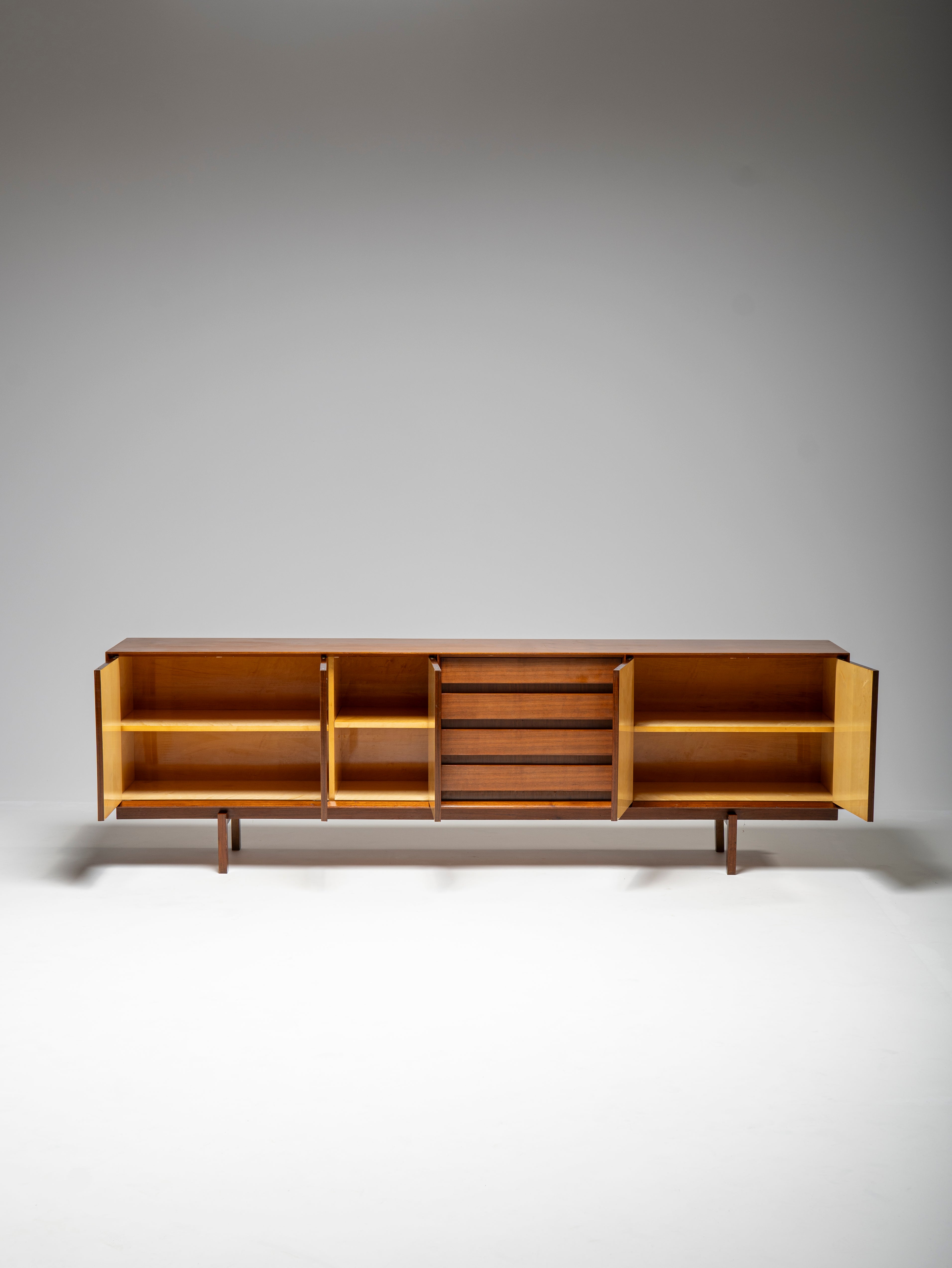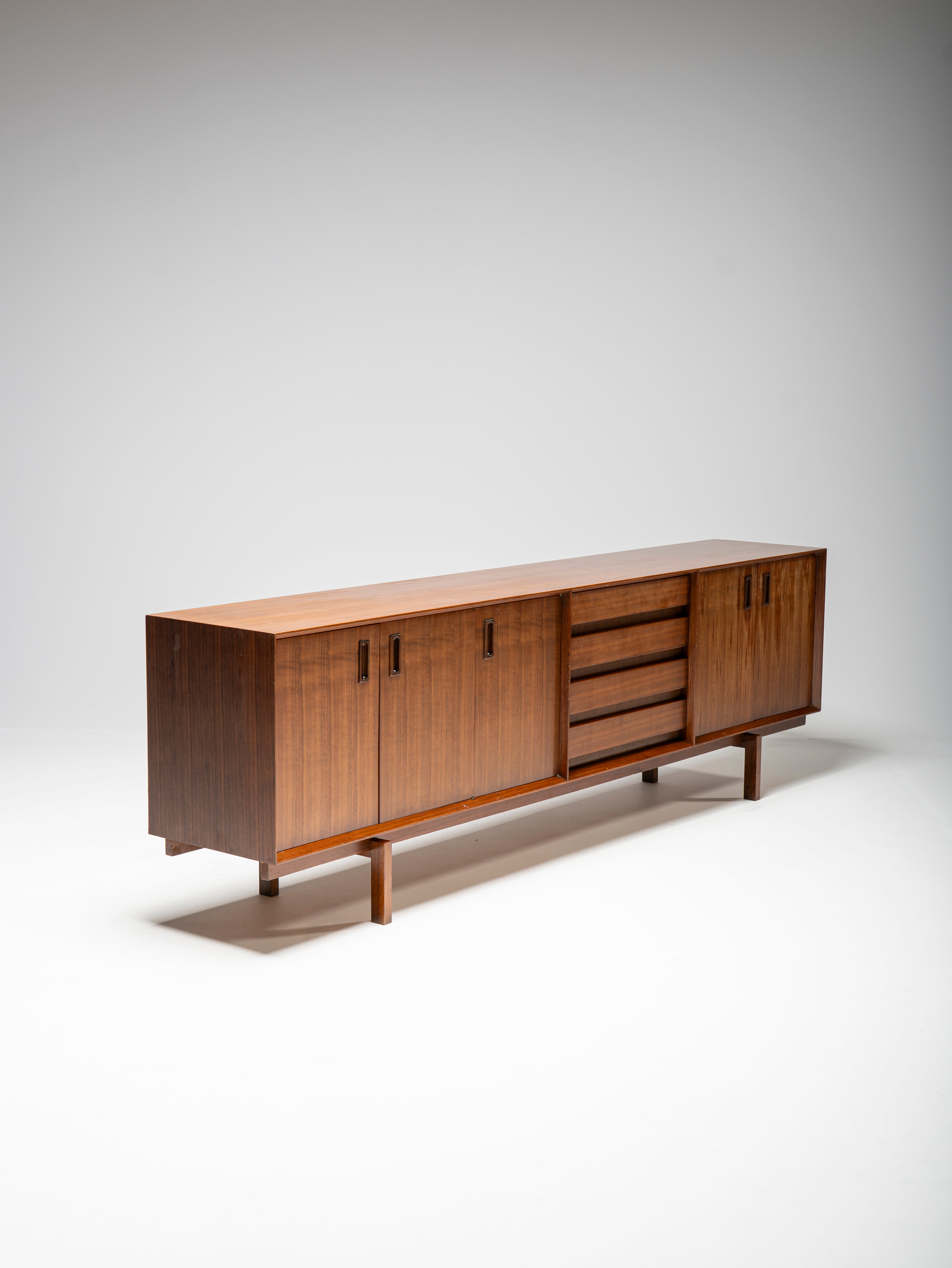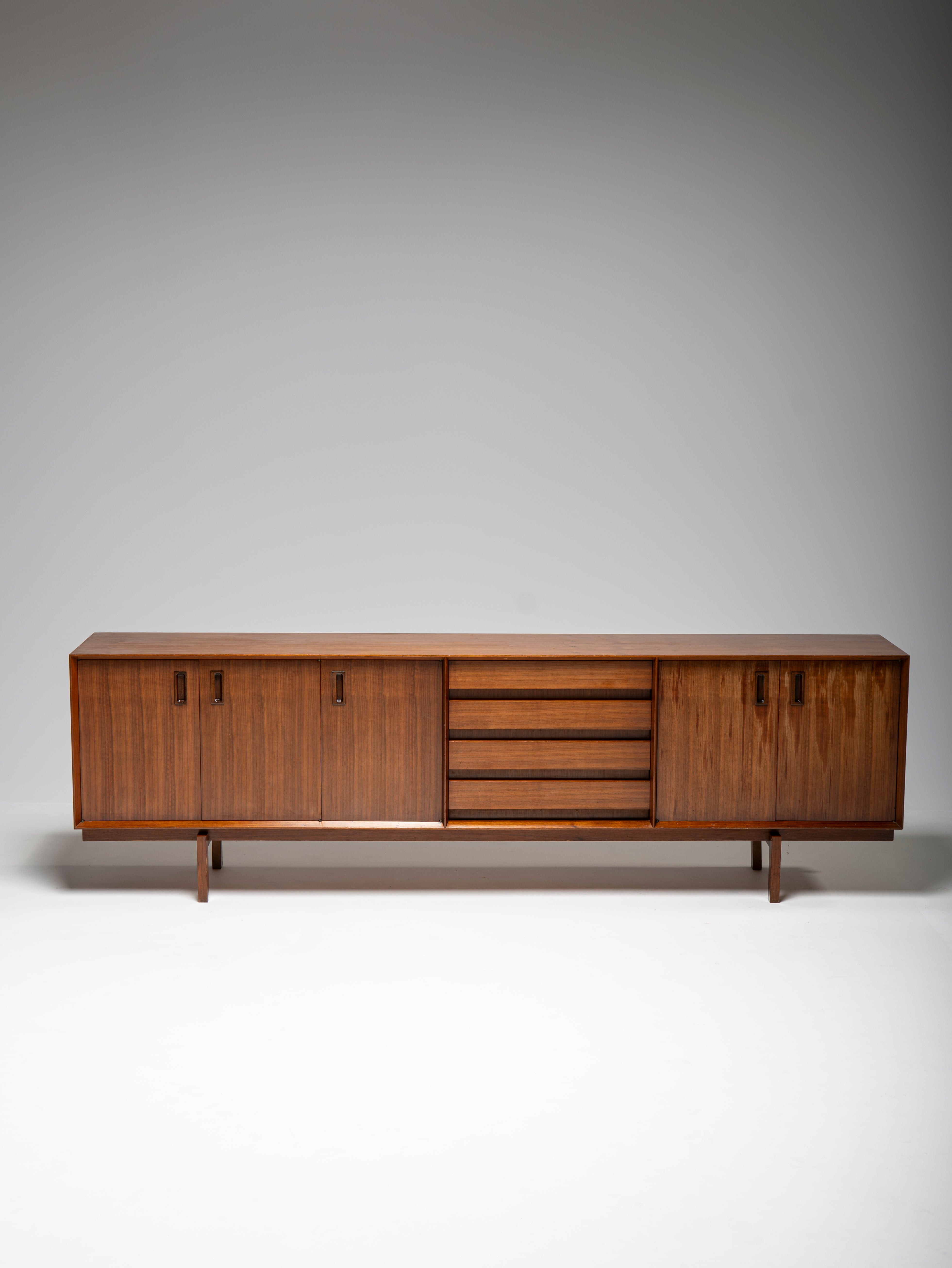 Massive, yet somehow managing to appear slender, this teak sideboard is a telling example of Scandinavian craft. Asymmetrically placed, the five side doors open to reveal copious amounts of light-coloured storage space. Their solid wood recessed handles bear a sculptural presence. The four drawers, sporting a wonderfully simple recessed handle, are also capacious. The doors and drawers are framed by a wooden strip inclined at a skillfully chosen angle, which serves to give the sideboard's outer walls a slim feel.