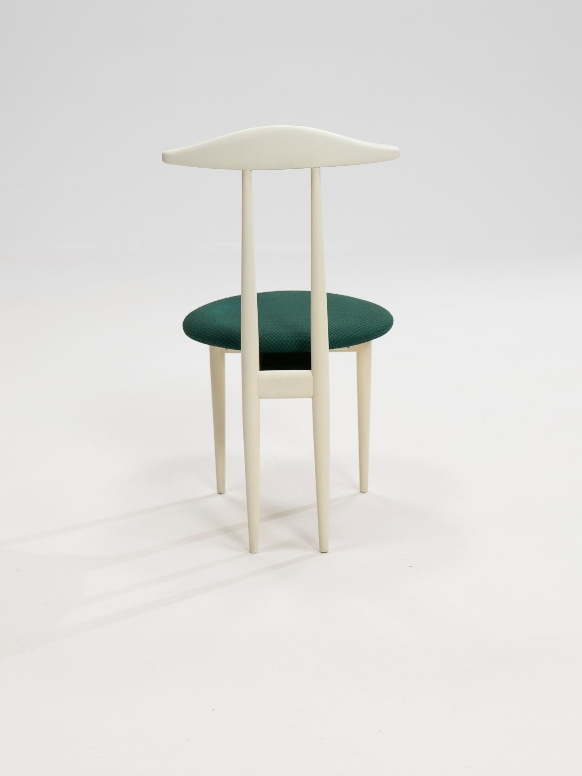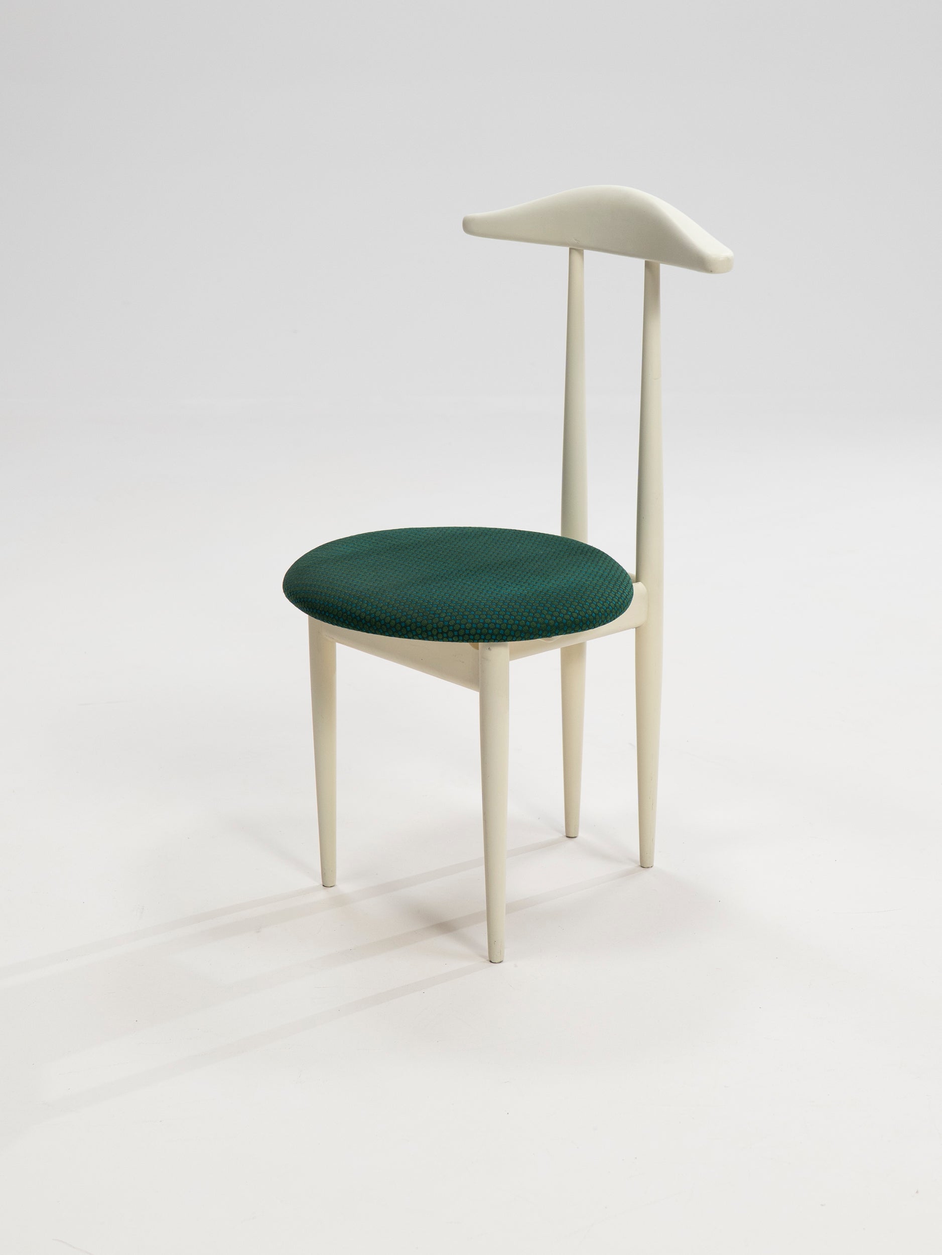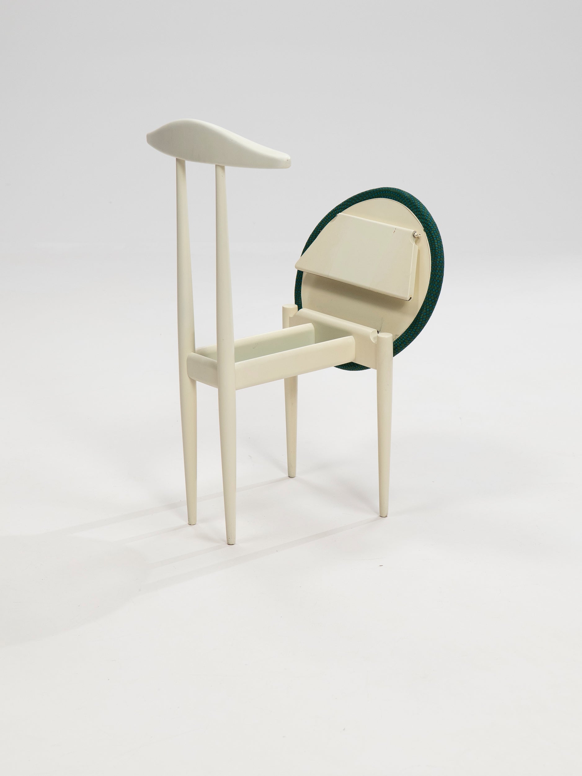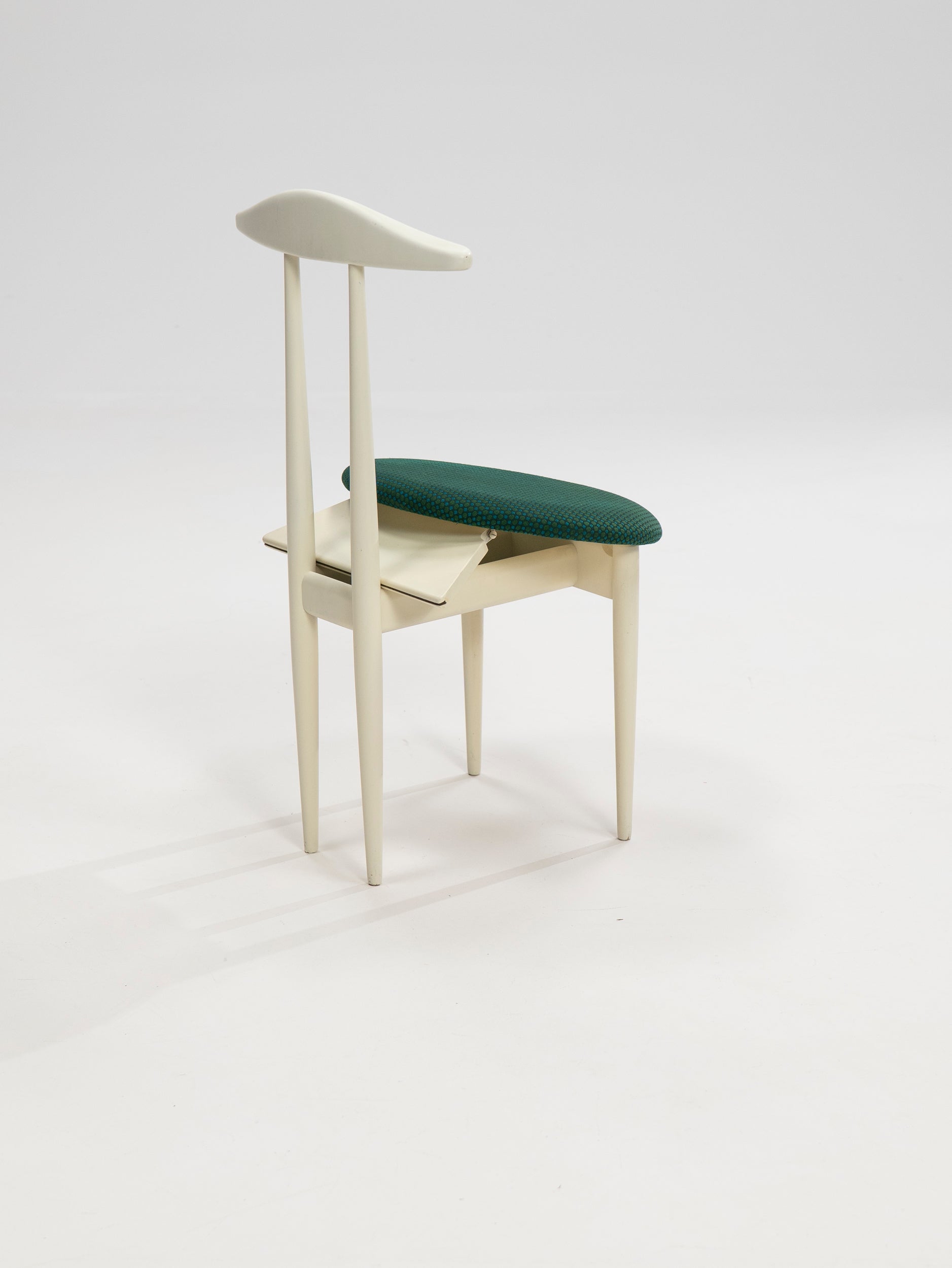 What's a valet chair, you might be wondering. Well, the backrest's shape should give you the first hint - it's a coat hanger. There you can hang you coat or shirt that's not quite in need of washing, nor is it clean enough to go back in the closet. Once you lift up the seat and turn that trapezoidal bit of wood towards you - that there holds your pants, folded once and set there to be used the next day. Maybe there's even more ways to use it than we were able to think up, we invite you to give it a go. Last, but not least, one can also use this valet chair for sitting.