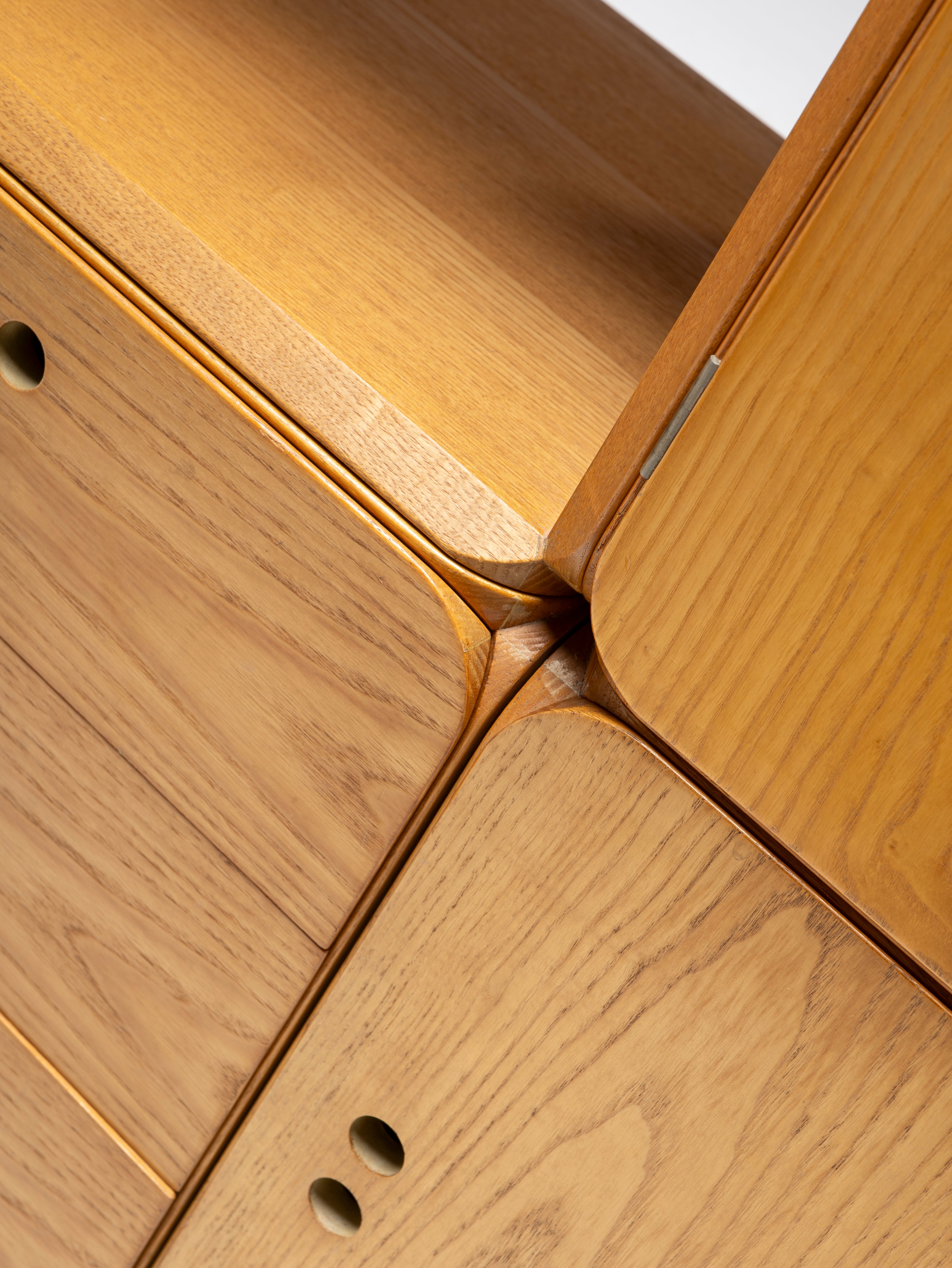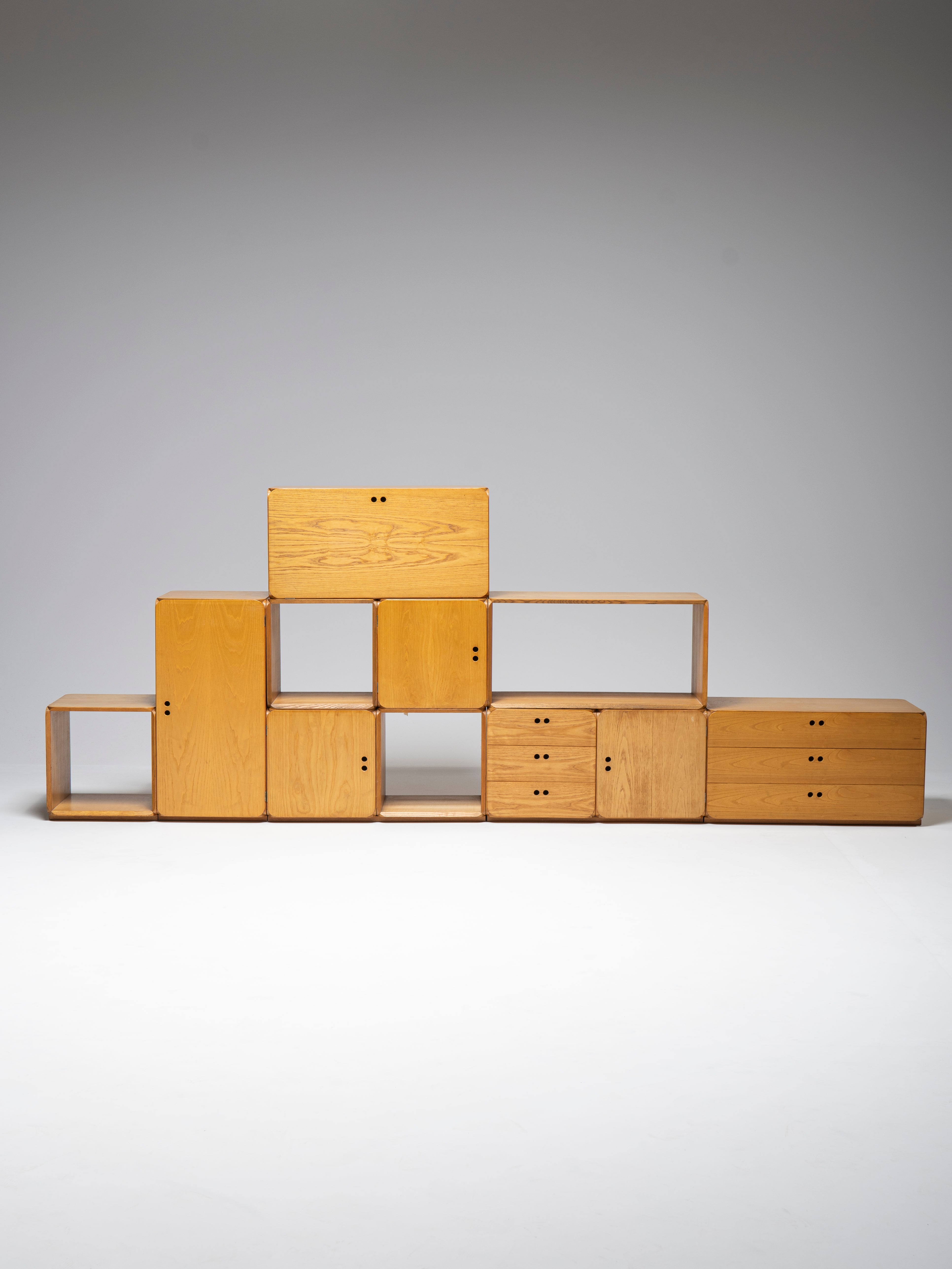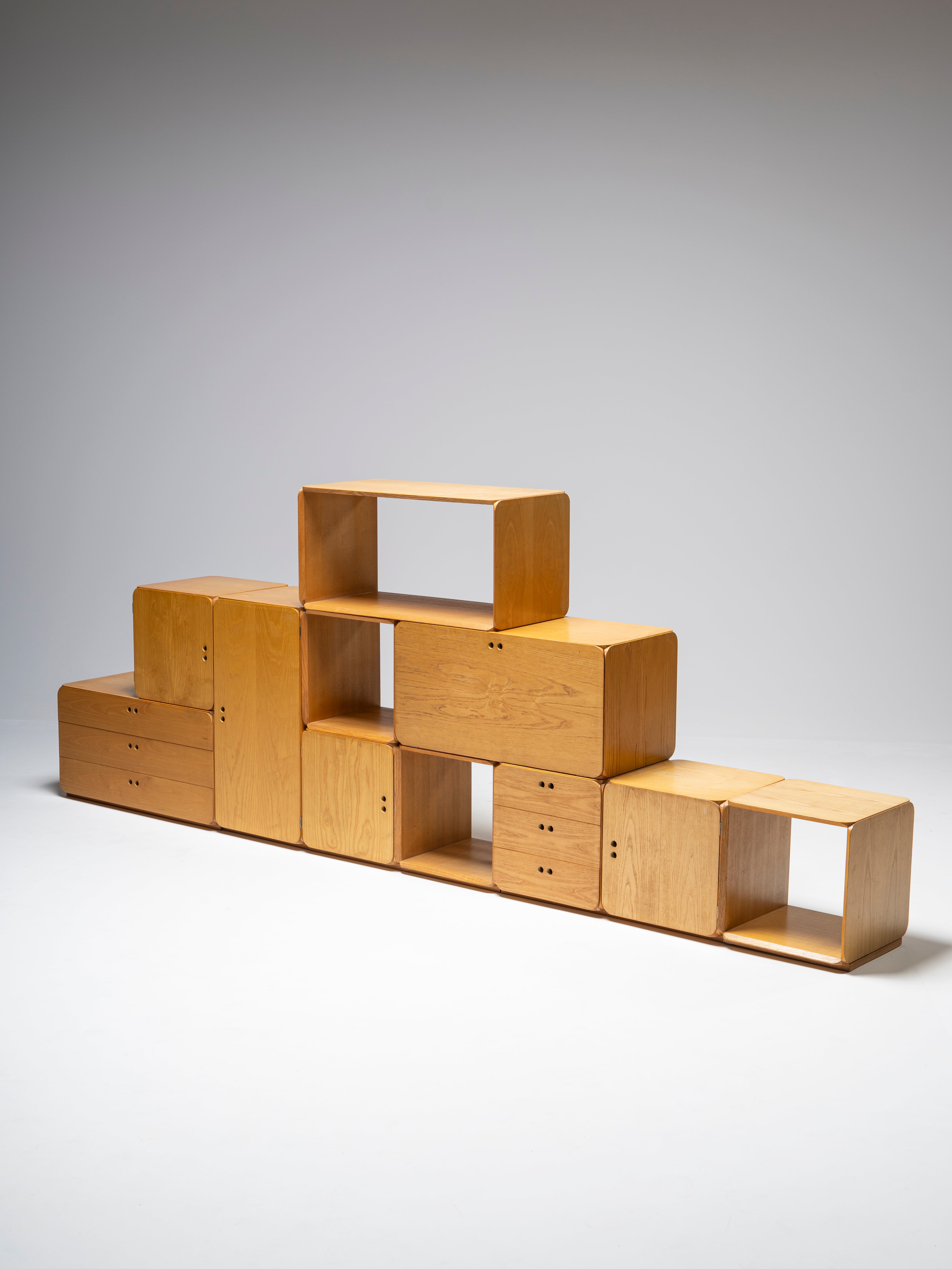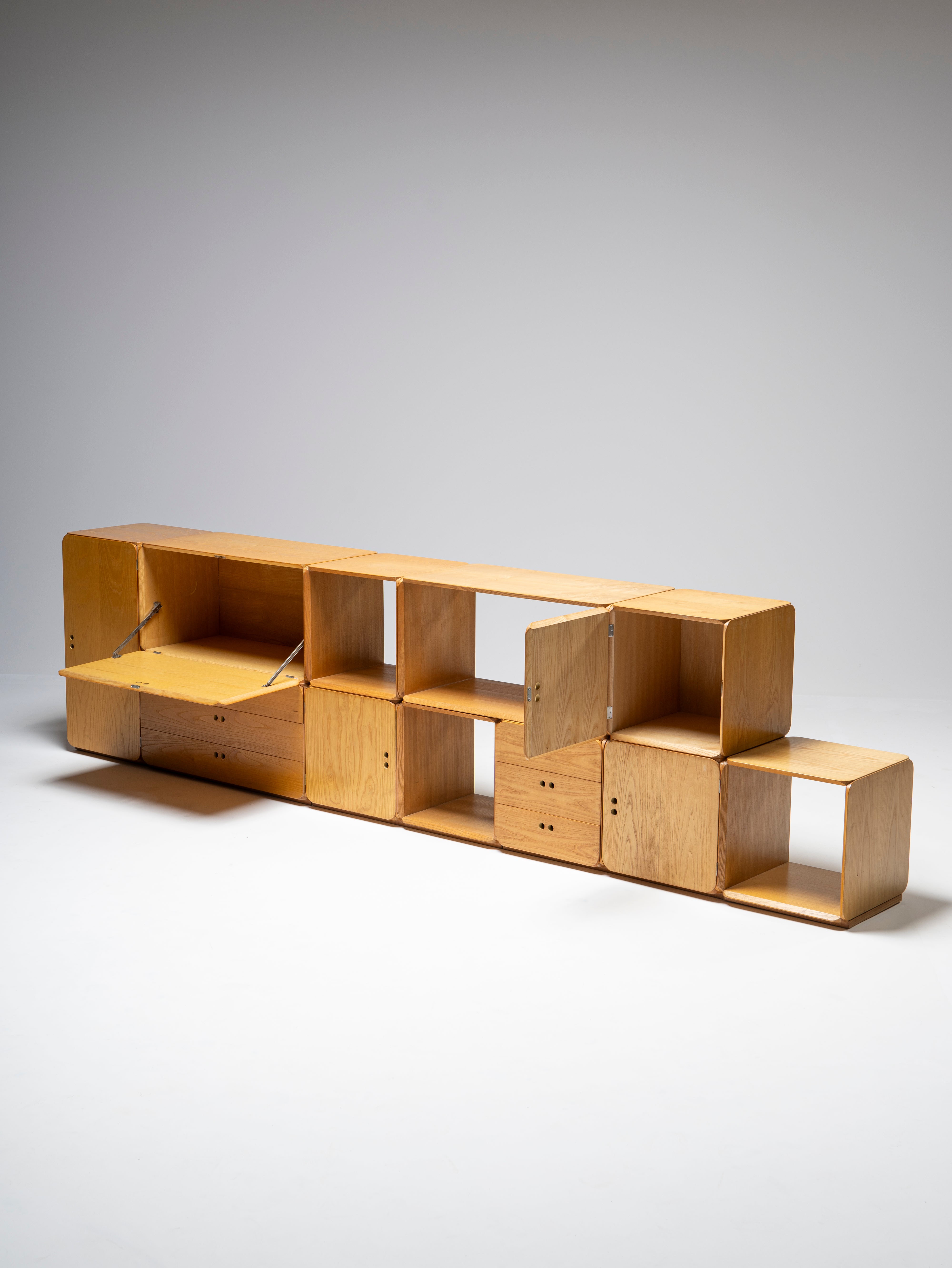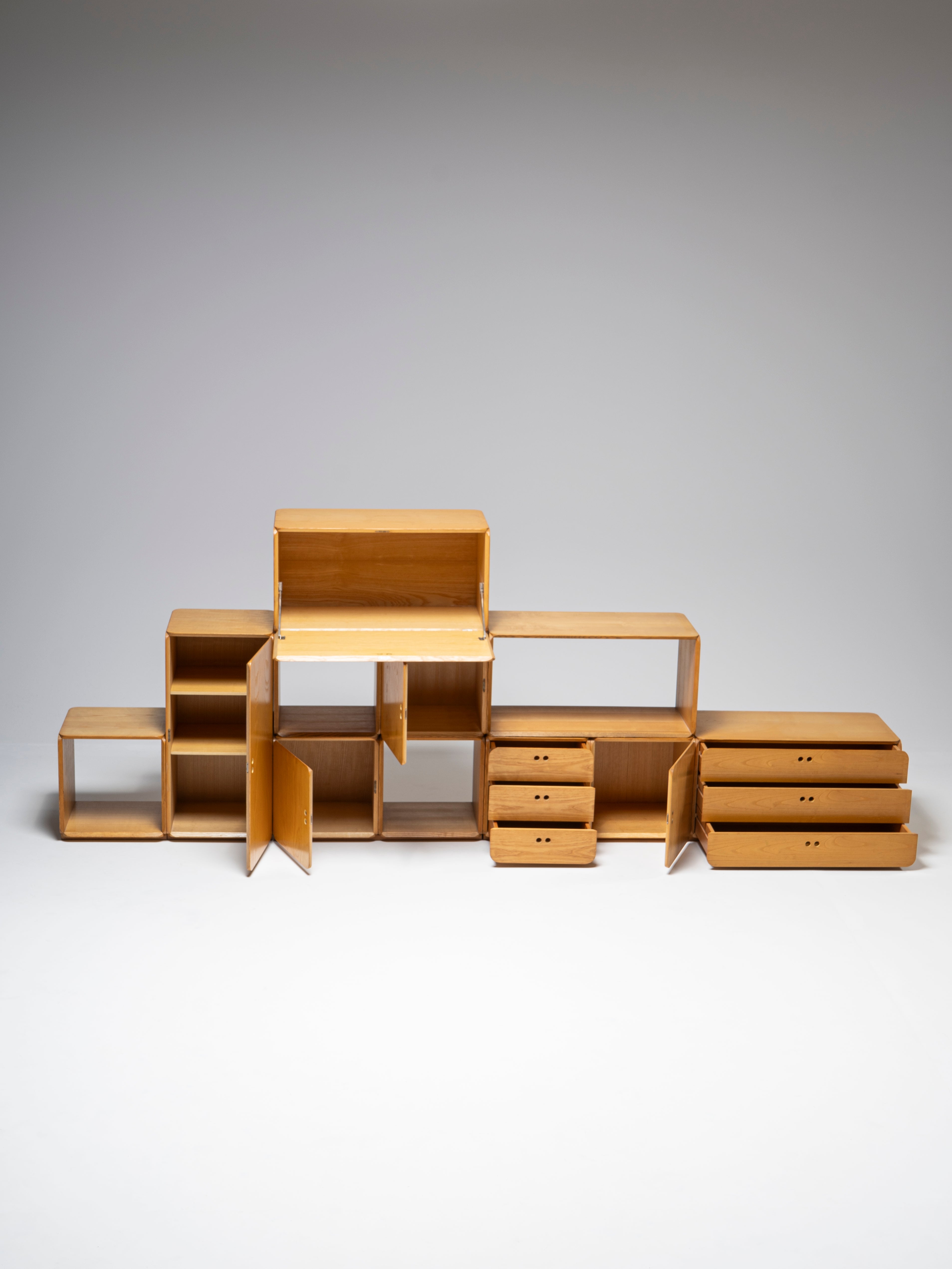 The set is comprised of 11 pieces, featuring four open modules (three squares and one rectangle) and seven closed modules (simple, with drawers and a drop-down door). Due to its straightforward design, it is impossible to go wrong while testing out different configurations, but we do invite you to try.