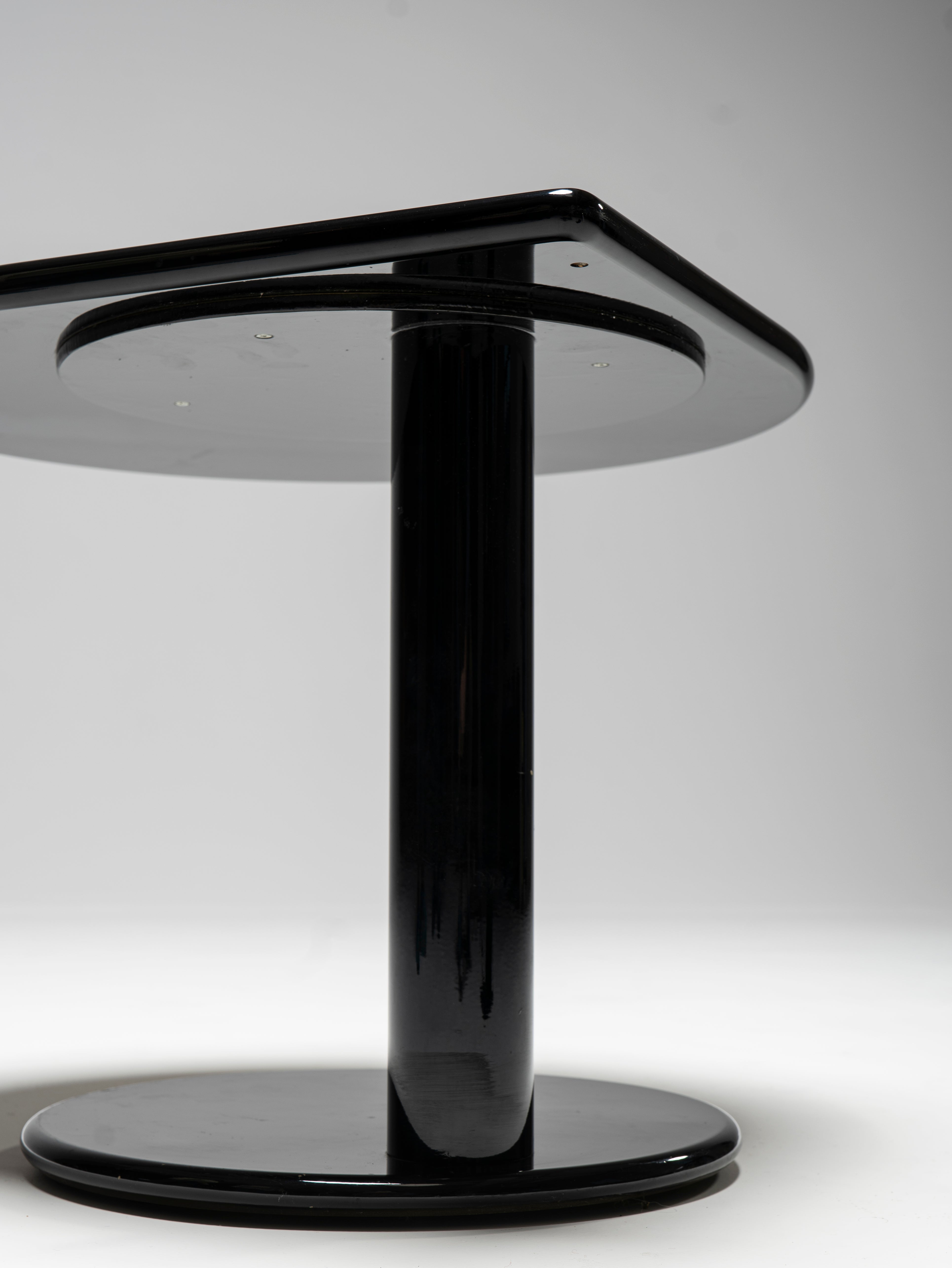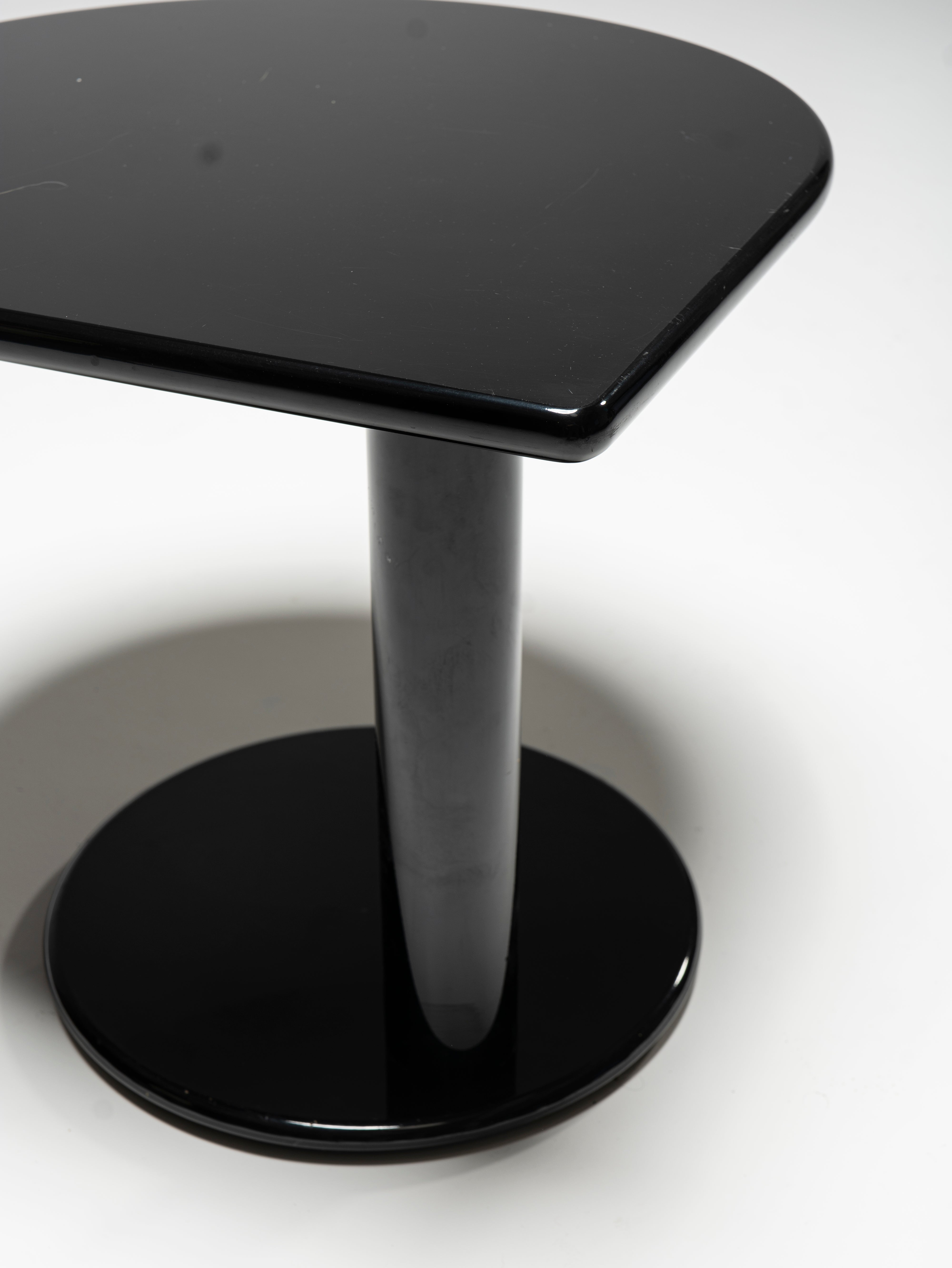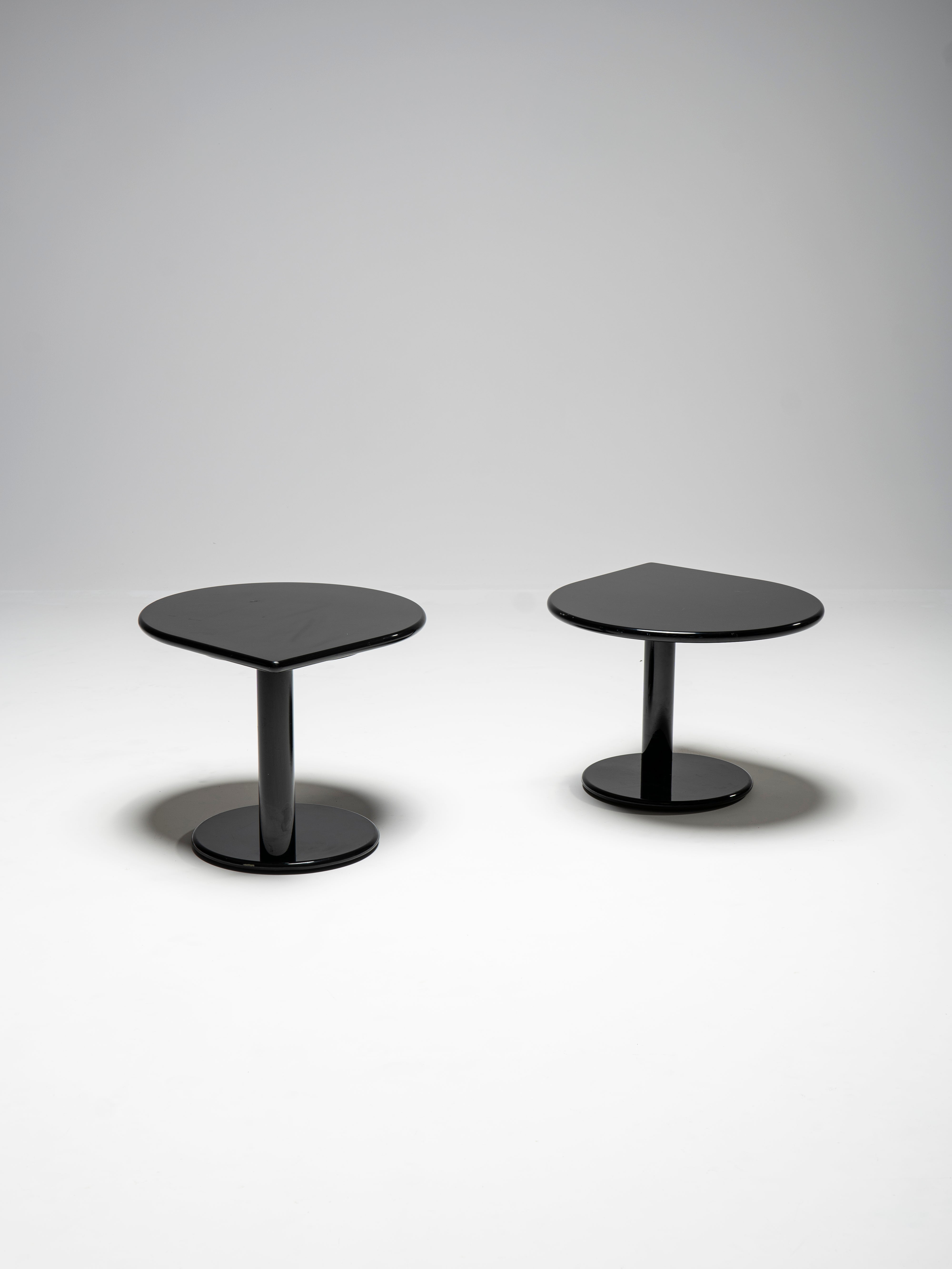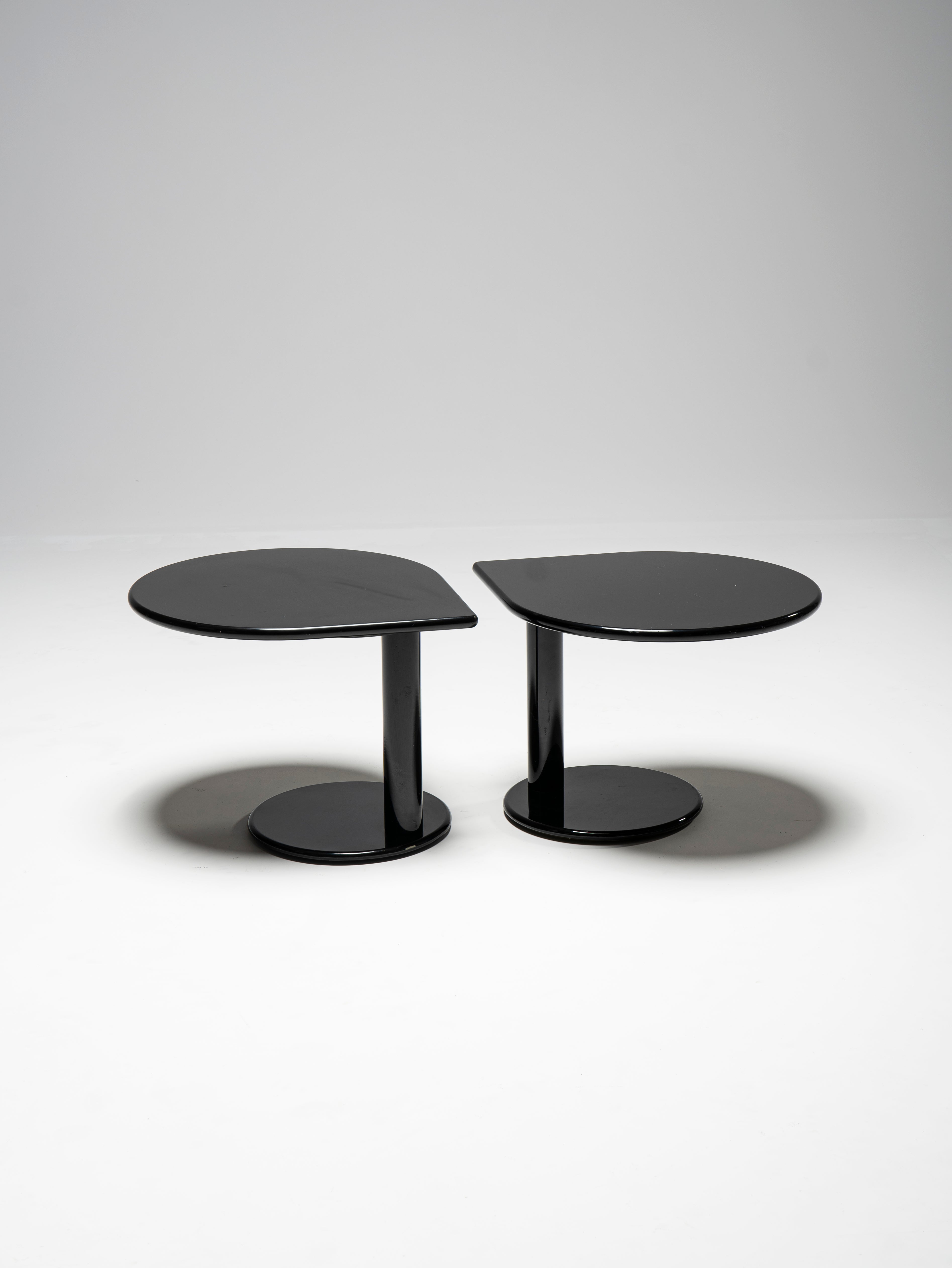Two sleek and classy black lacquered wood consoles, fit for a number of spaces and uses. Even though one might look at them and think they aren't stable enough, we assure you that, owing to the sheer weight of the base and legs, these console tables are impossible to knock over. The black lacquer exhibits only minor scratches from decades of use, reinforcing the fact that these two pieces are tougher than nails, despite being tear-shaped.
