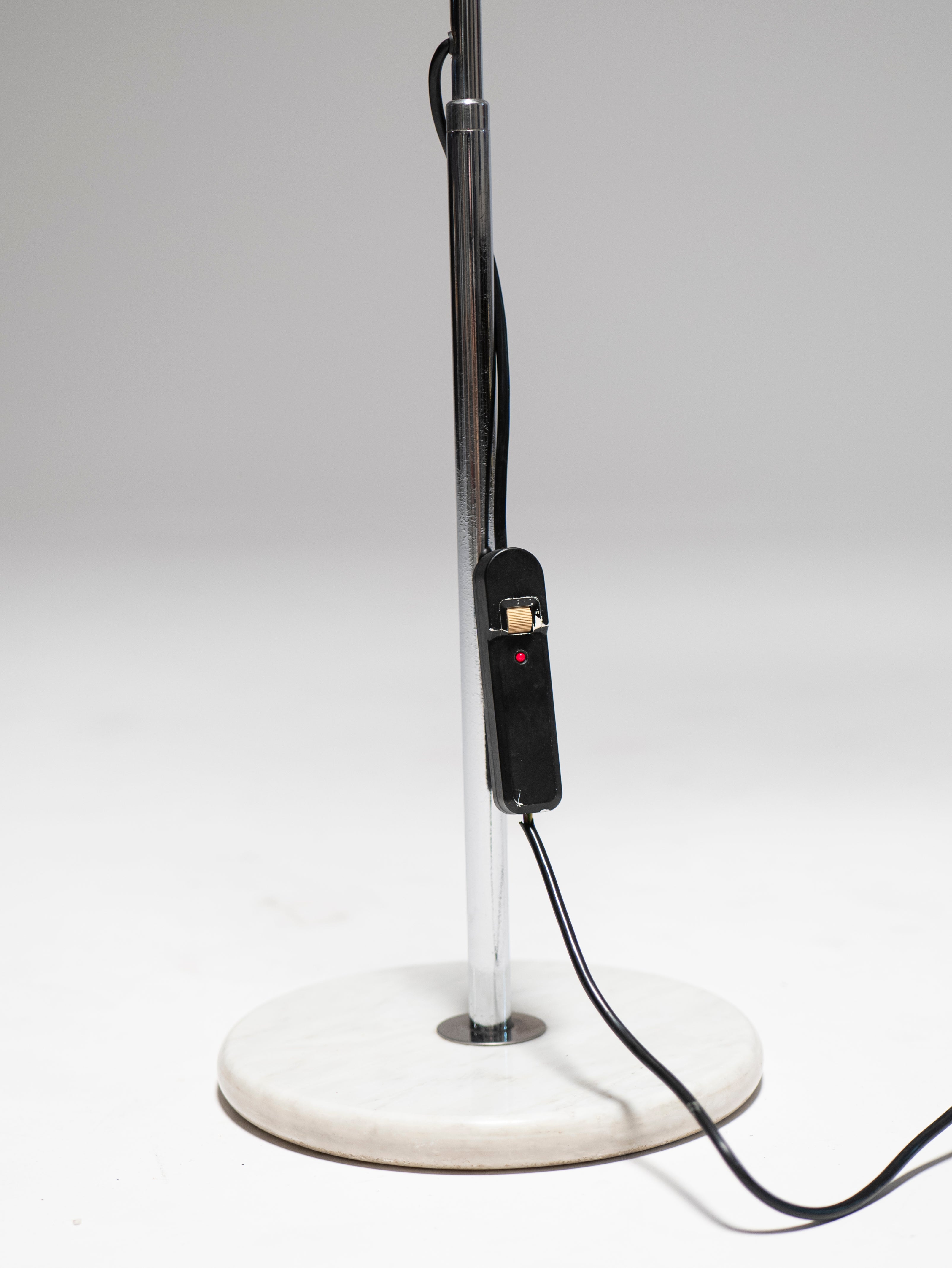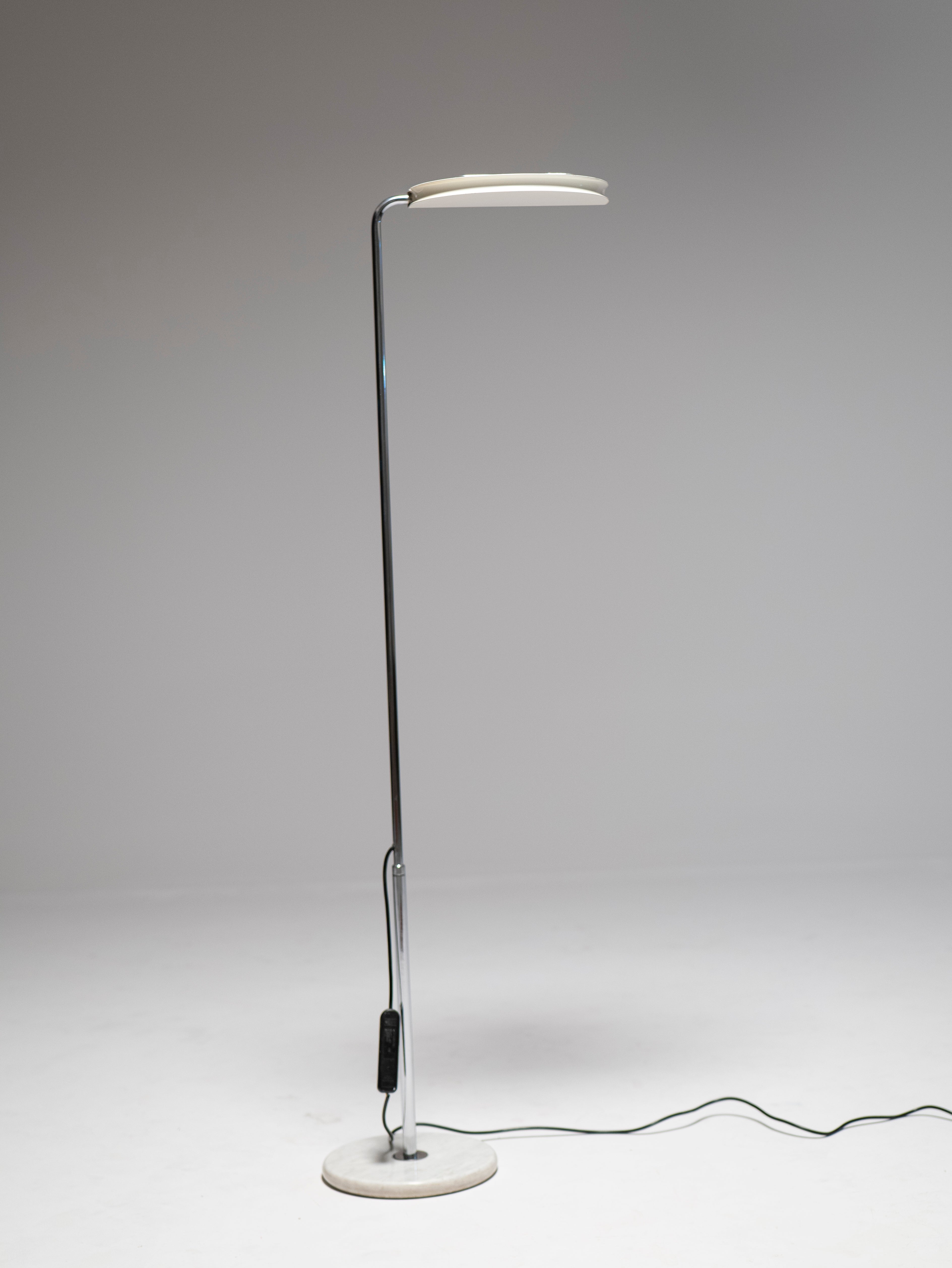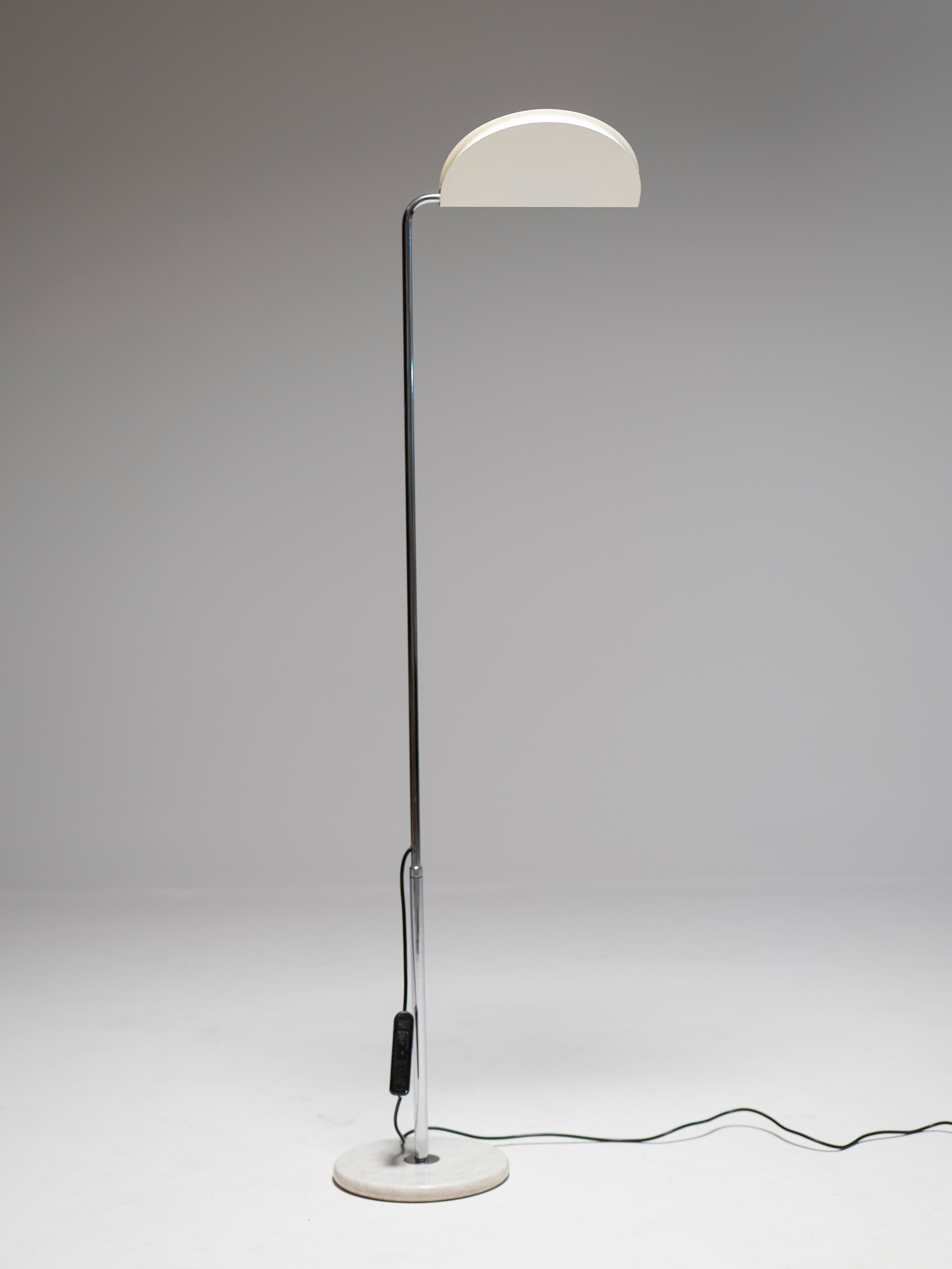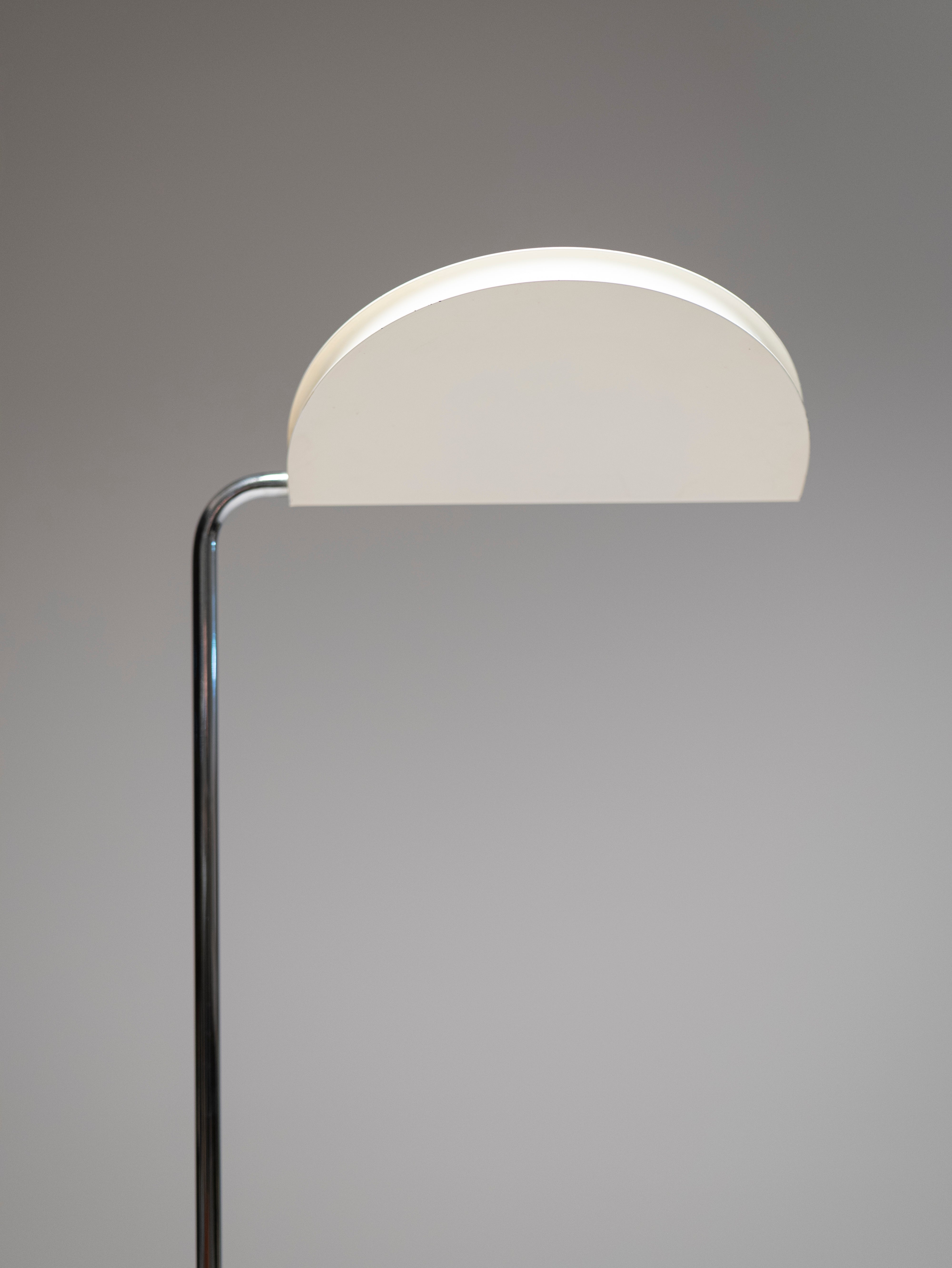 Like all the pieces found in Gecchelin's Gesto collection, these floor lamps are a masterclass in simple, elegant design. The choice of name becomes clear when looking at the lampshade. Featuring the characteristic concave groove along the curved side, the half-moon can be rotated as to cast the light directly upwards or sideways, and also dimmed according to the user's needs and desires. The lamp's height can be adjusted using the telescopic chrome-plated pole, and the heavy, round white marble base ensures that the lamp stays put. As all members of the Gesto family, the Mezzaluna deals in indirect light, making it possible to be admired even when turned on, without blinding its groupies.