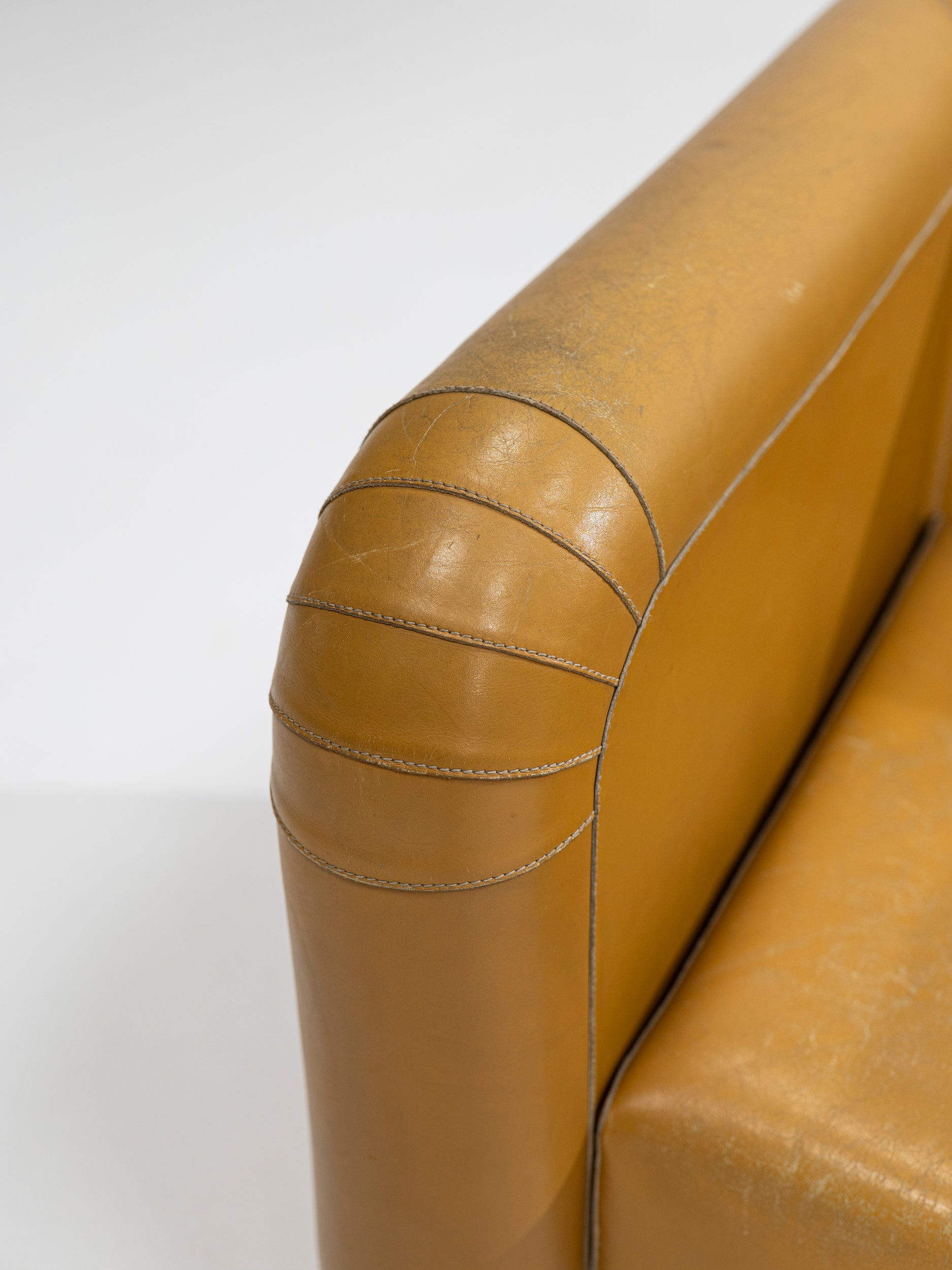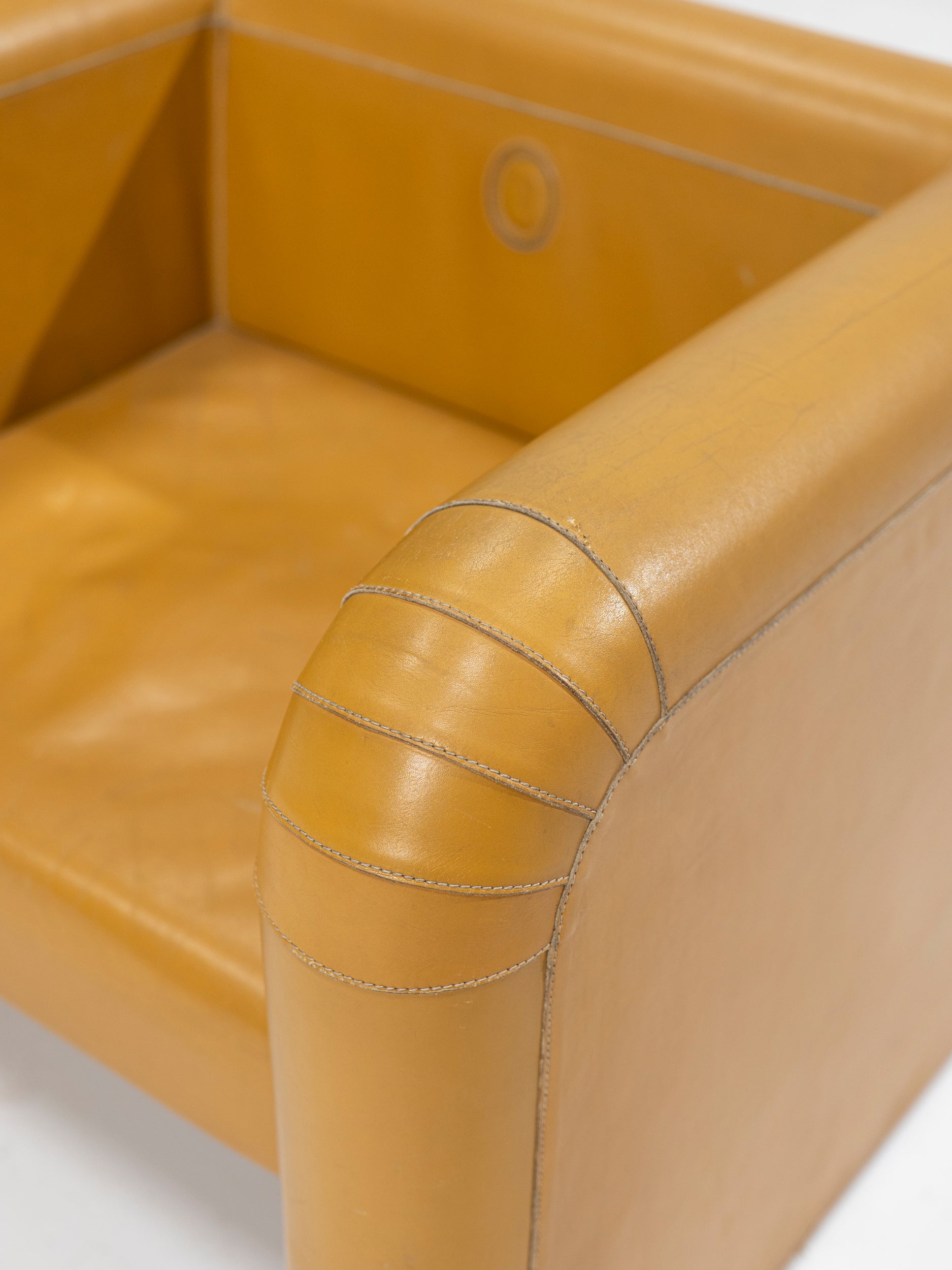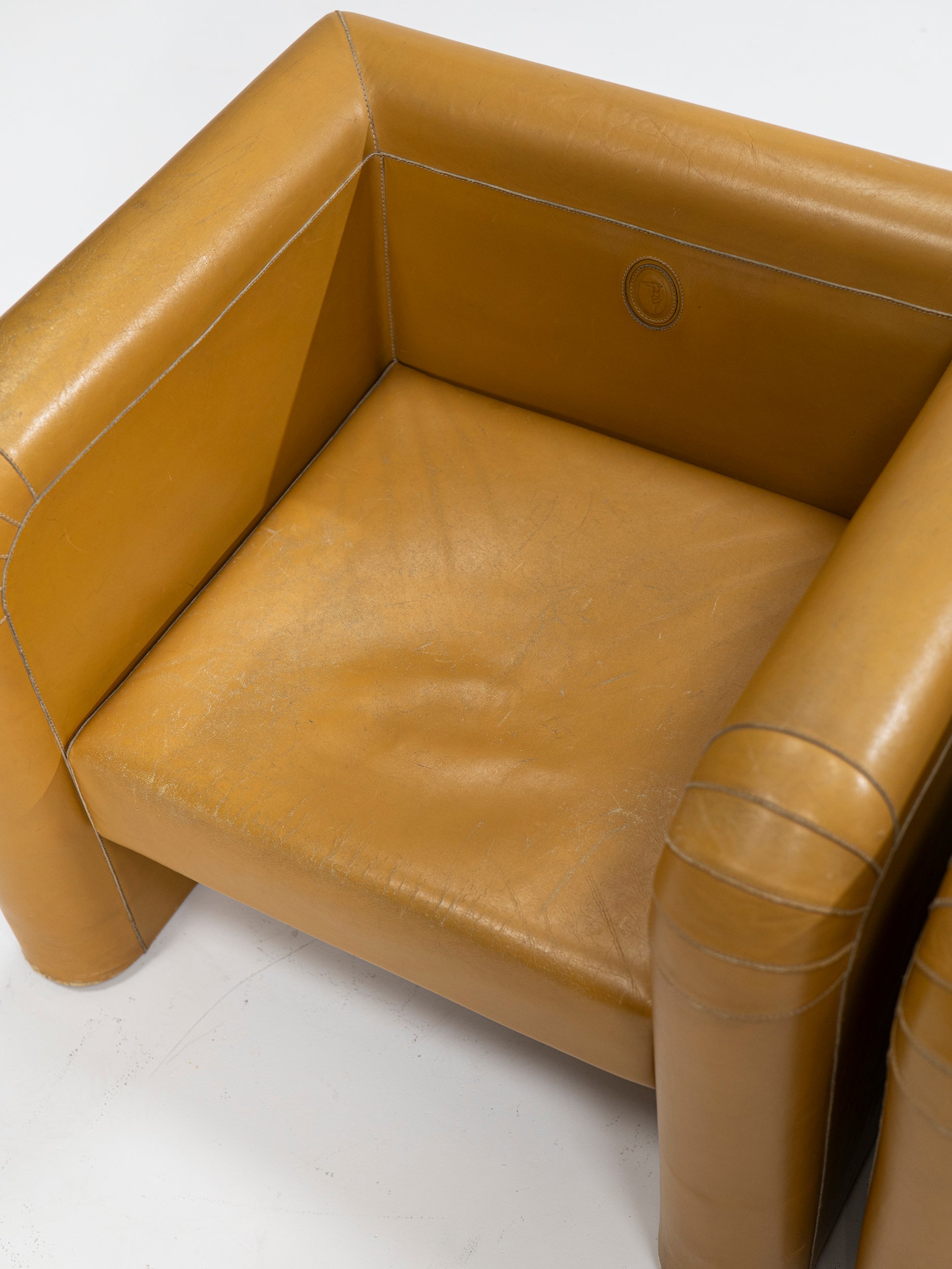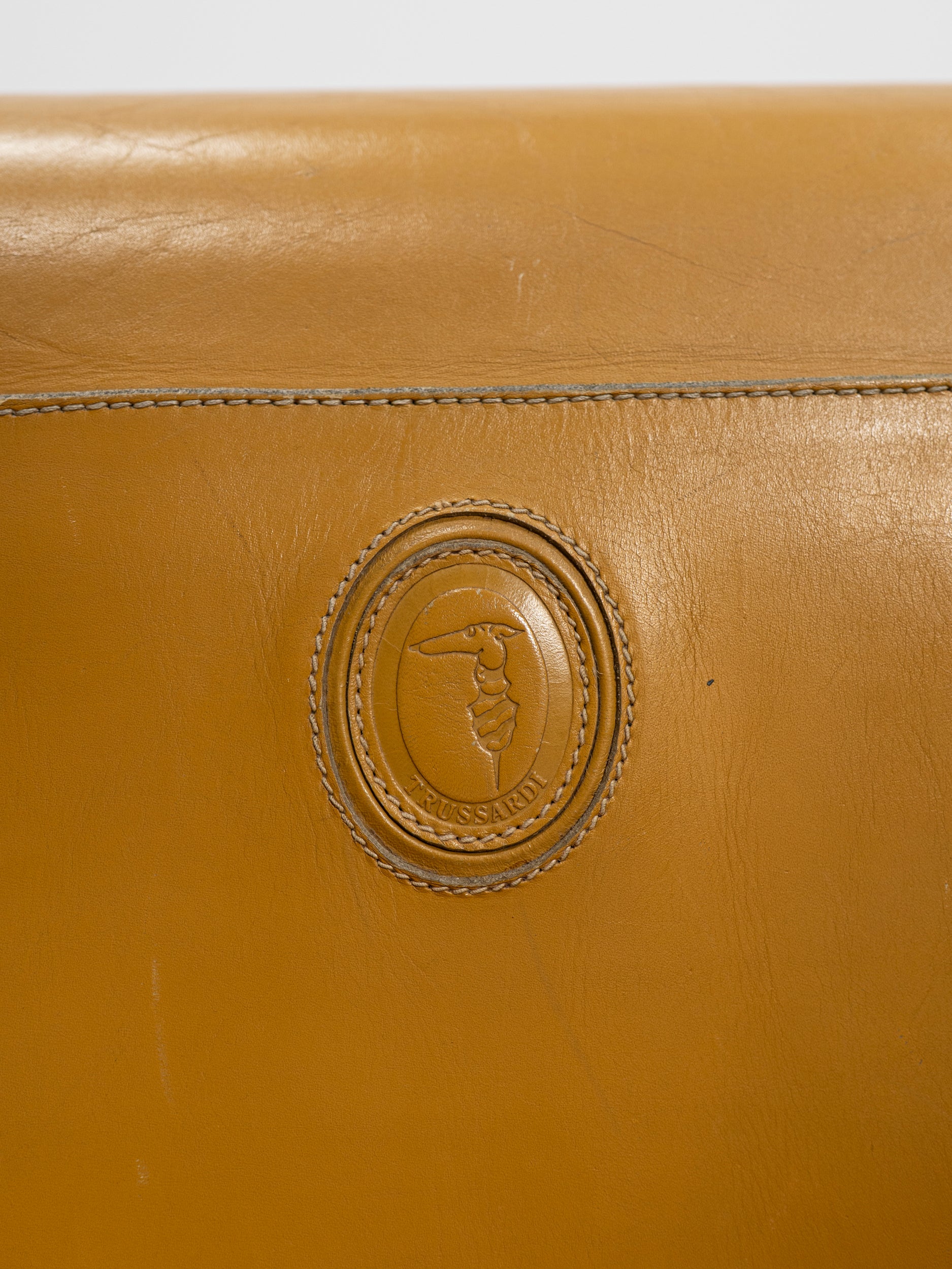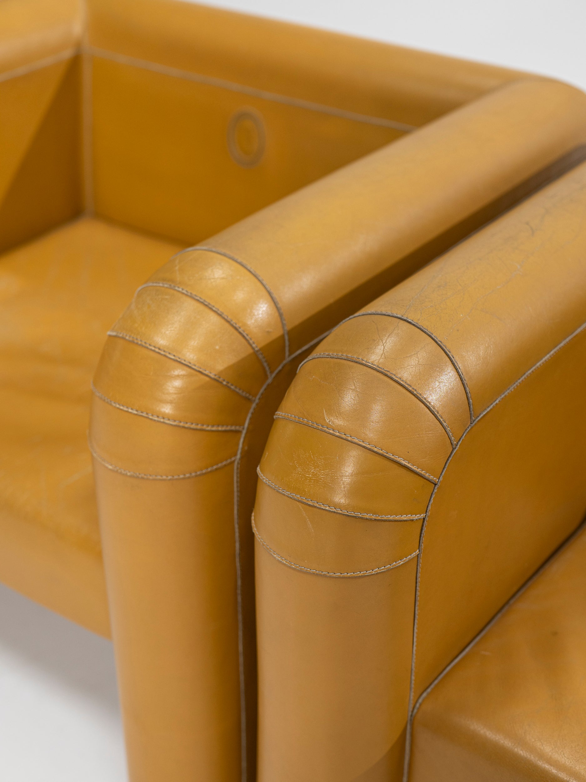 Better known for their top-tier wearable fashion, Trussardi seem to have tried their hand at furniture design, and what they came up with is nothing short of powerful. Decades of experience in leatherwork found their way onto the uncompromising shapes making up these statement pieces, and did so with definite intentions. The rounded corners of the armrests seem to be clad in knight's armour as they make their way to the backrest, shifting course 90° like it's nobody's business. Smack down in the middle stands the Trussardi Greyhound, emblem of sophistication and nobility, forever embossed in quality leather. These rather mean-looking armchairs have a surprising trick up their sleeve - they are very comfortable to sit in. Time seems to have had its way with the camel-painted leather at the back, sticking a tape of some sort onto it. However, we won't be responsible for involving ourselves in any restoration efforts, fearing that the colour and patina cannot possibly be replicated.