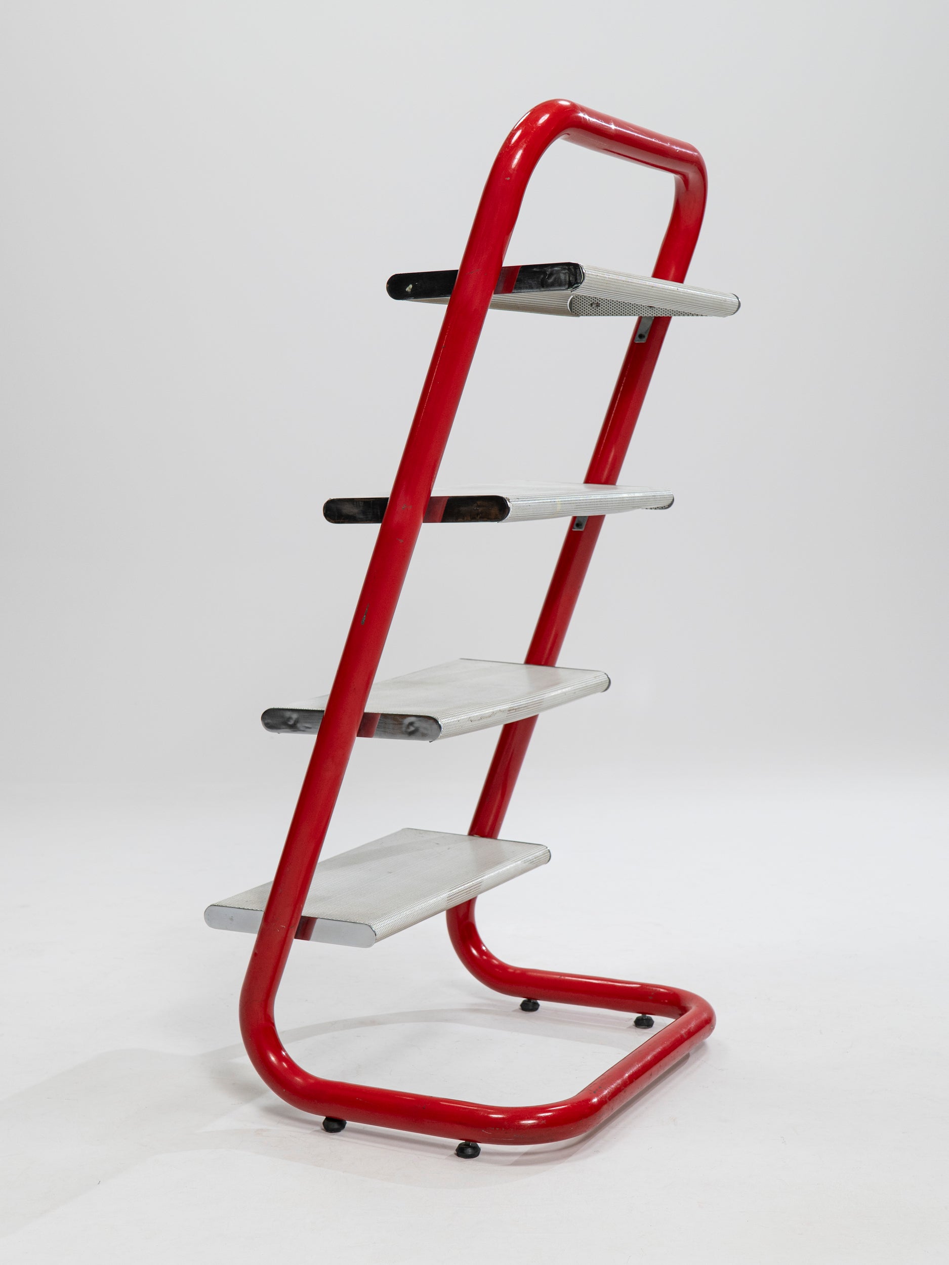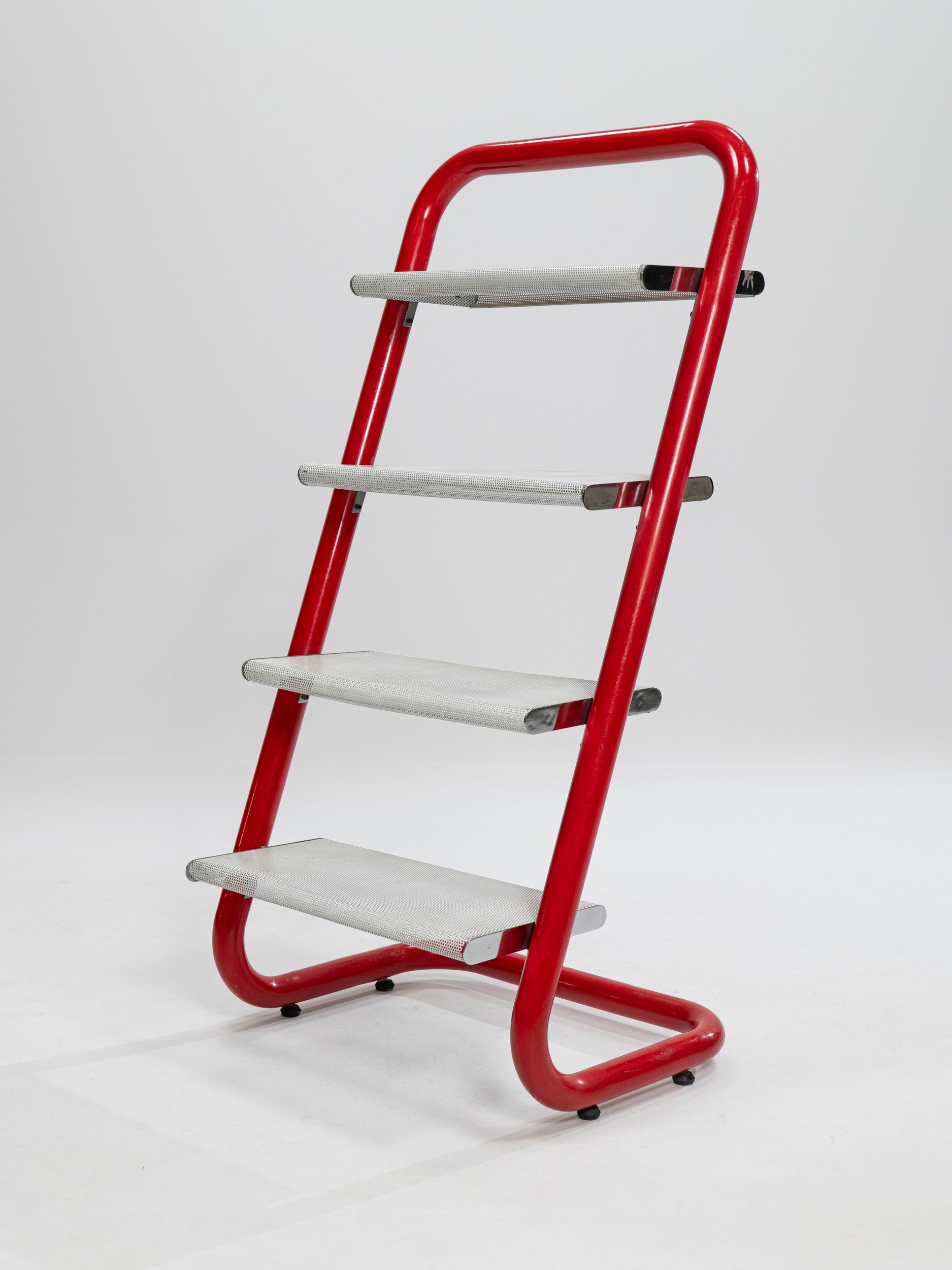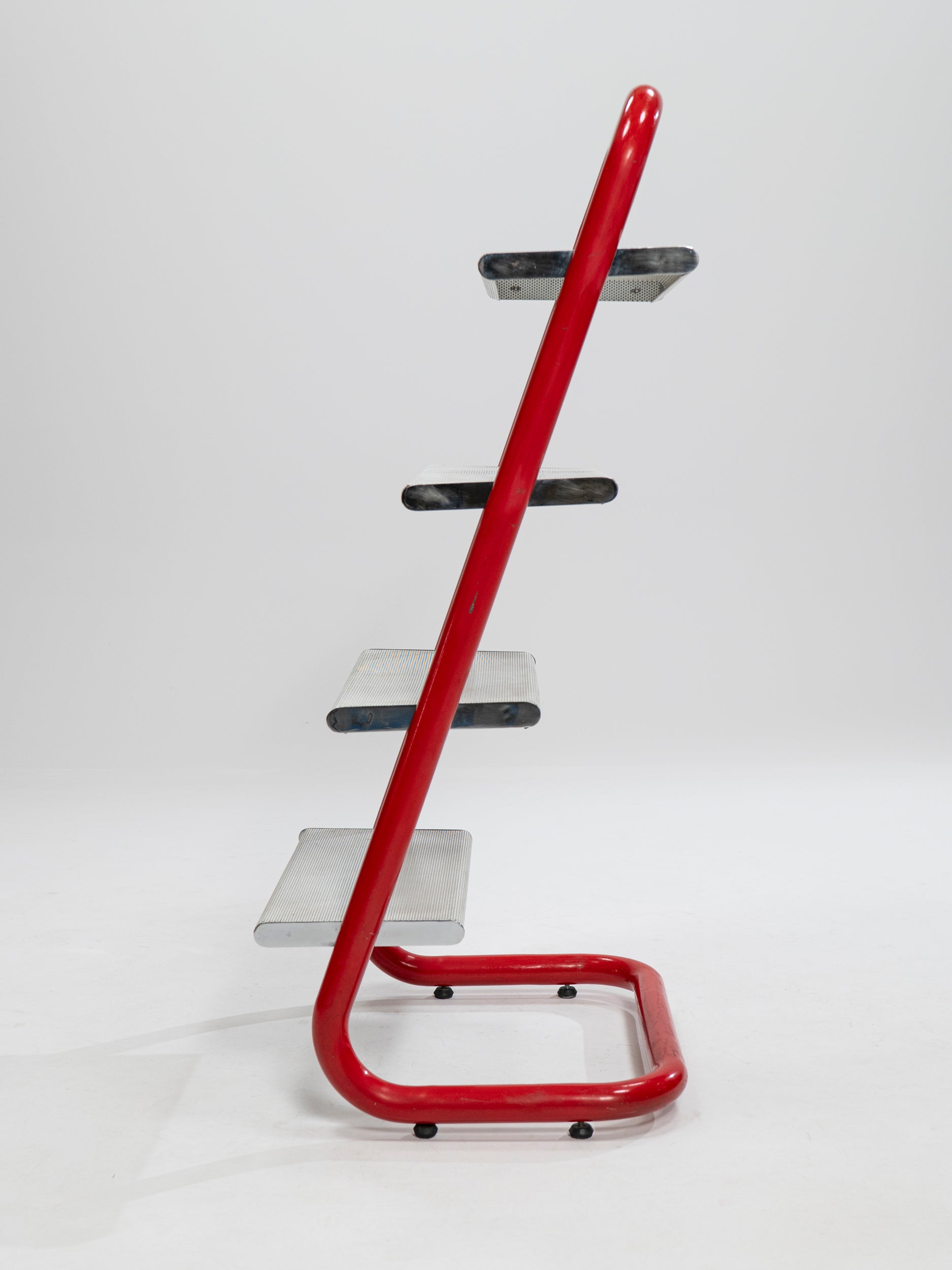 This seemingly simple shelving unit is made up of two components - the red tubular frame which bends backwards until the unit is balanced, and the metal shelves. The shelves are themselves made up of two bits: the perforated sheet metal body and the chrome-plated sides. All the elements are rounded, including the small rubber bits it stands upon, making this unit a friendly sight. Were it not painted red, but something more neutral, this fine piece of design would be almost benign, but we are glad that this is not the case and this shelving unit cannot be mistaken for purely functional design.