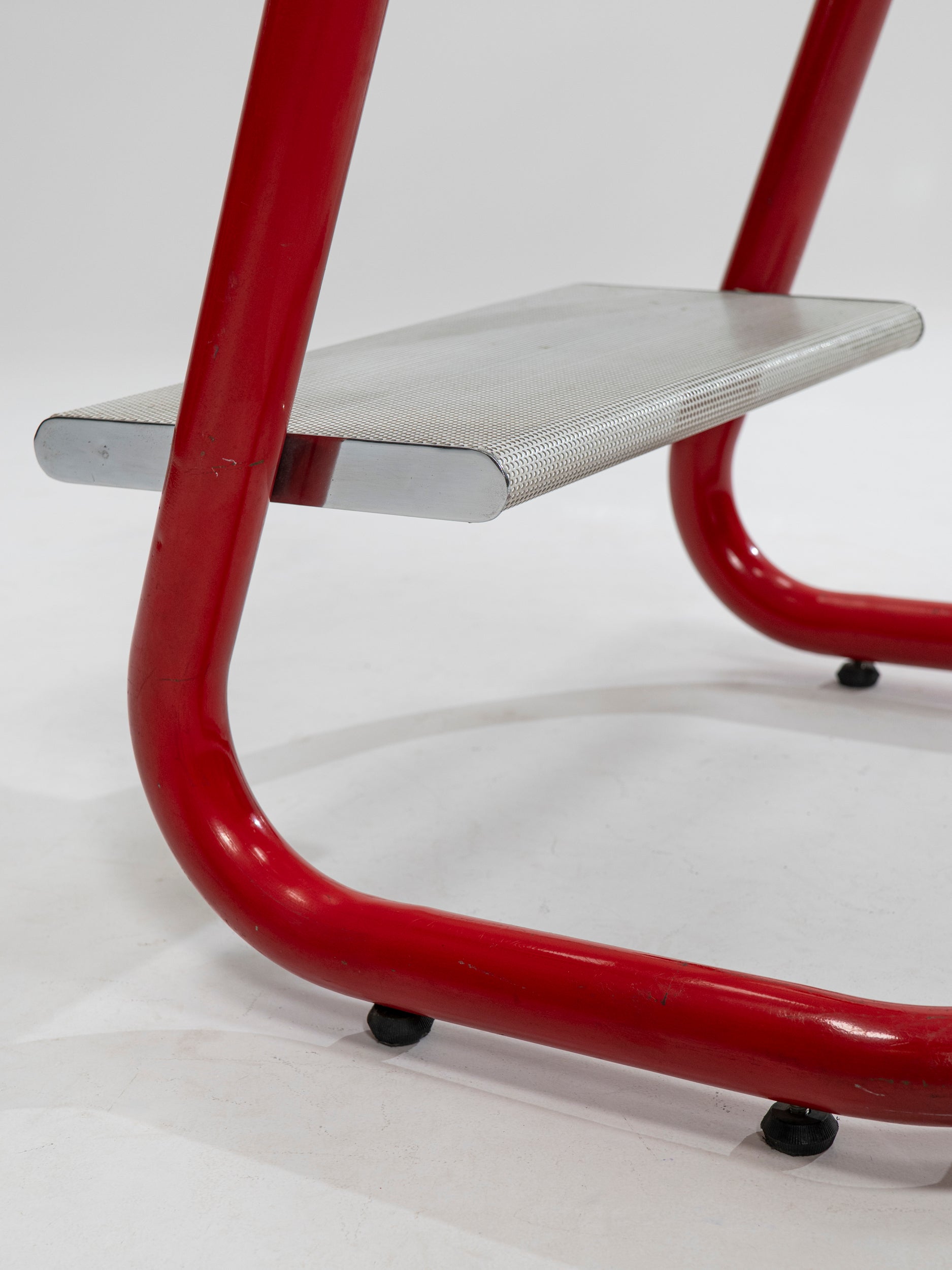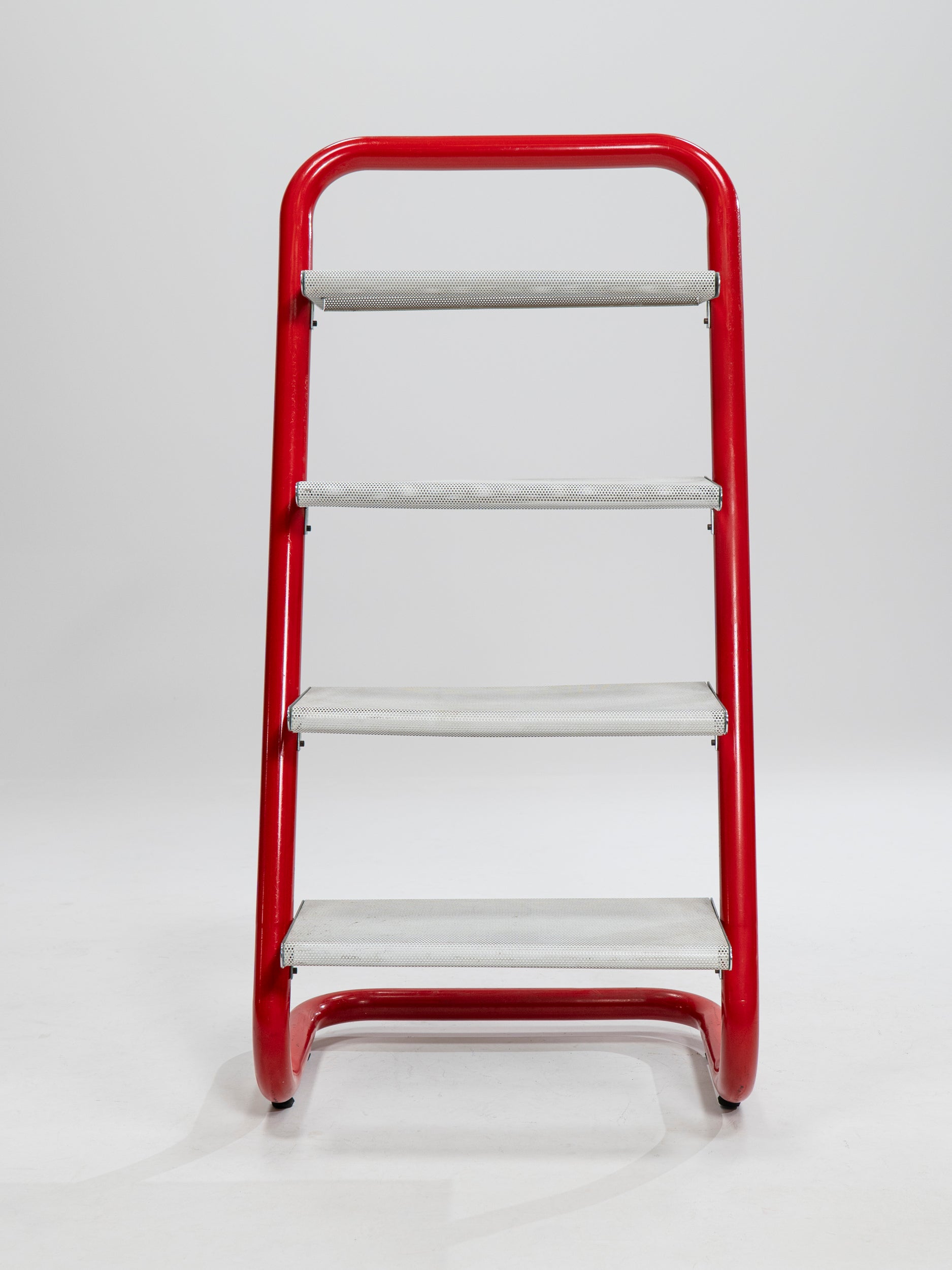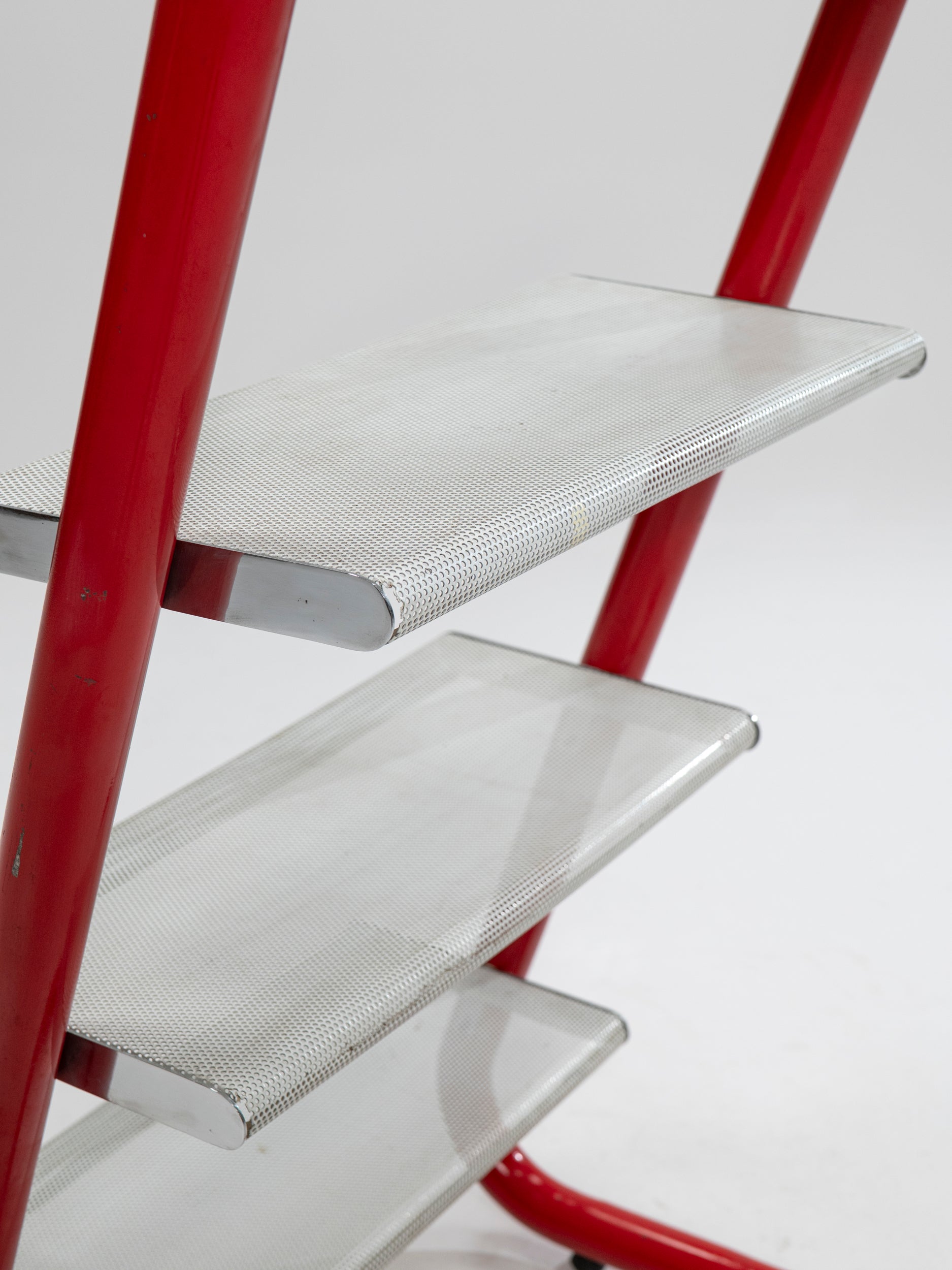 This seemingly simple shelving unit is made up of two components - the red tubular frame which bends backwards until the unit is balanced, and the metal shelves. The shelves are themselves made up of two bits: the perforated sheet metal body and the chrome-plated sides. All the elements are rounded, including the small rubber bits it stands upon, making this unit a friendly sight. Were it not painted red, but something more neutral, this fine piece of design would be almost benign, but we are glad that this is not the case and this shelving unit cannot be mistaken for purely functional design.