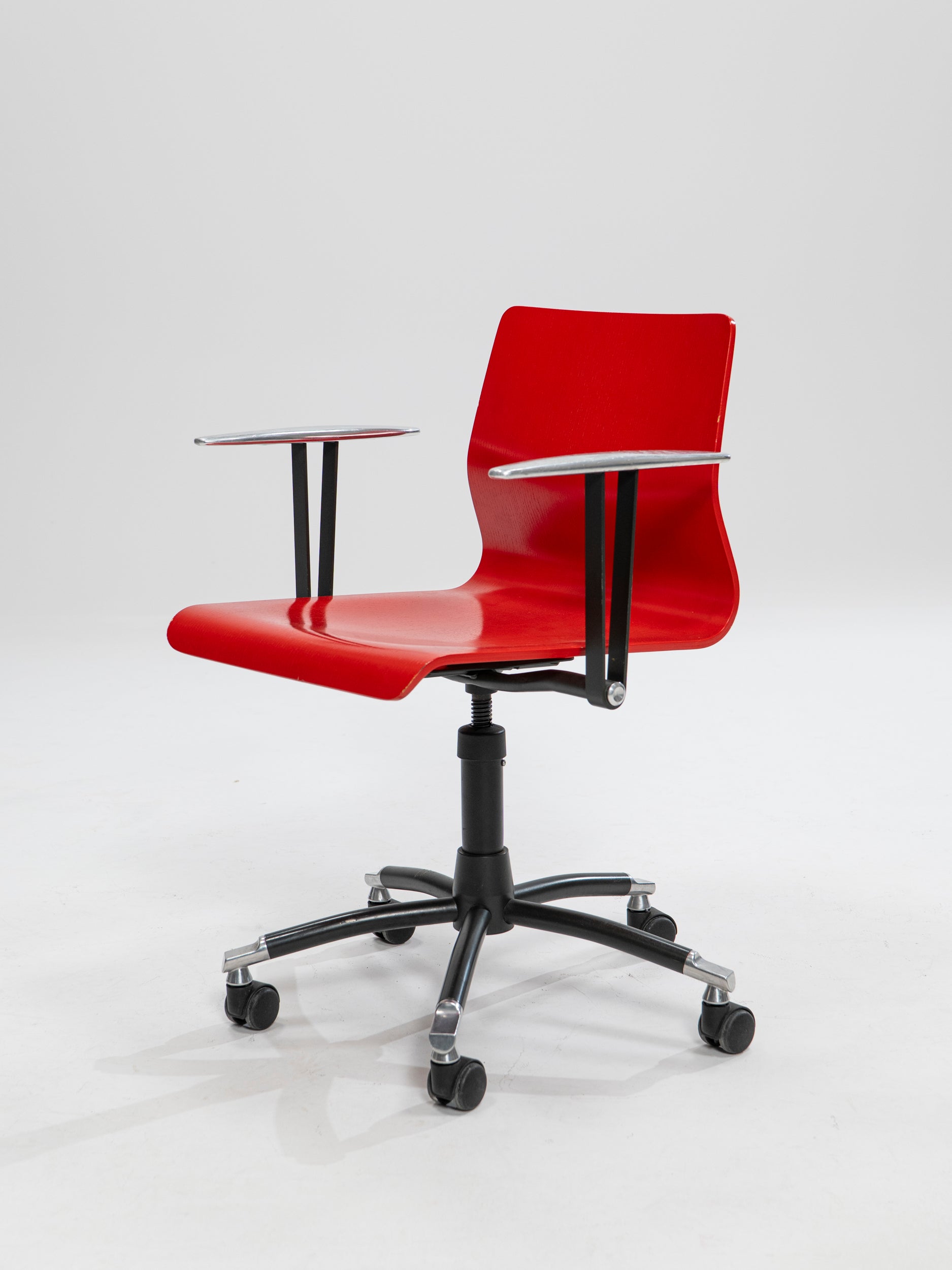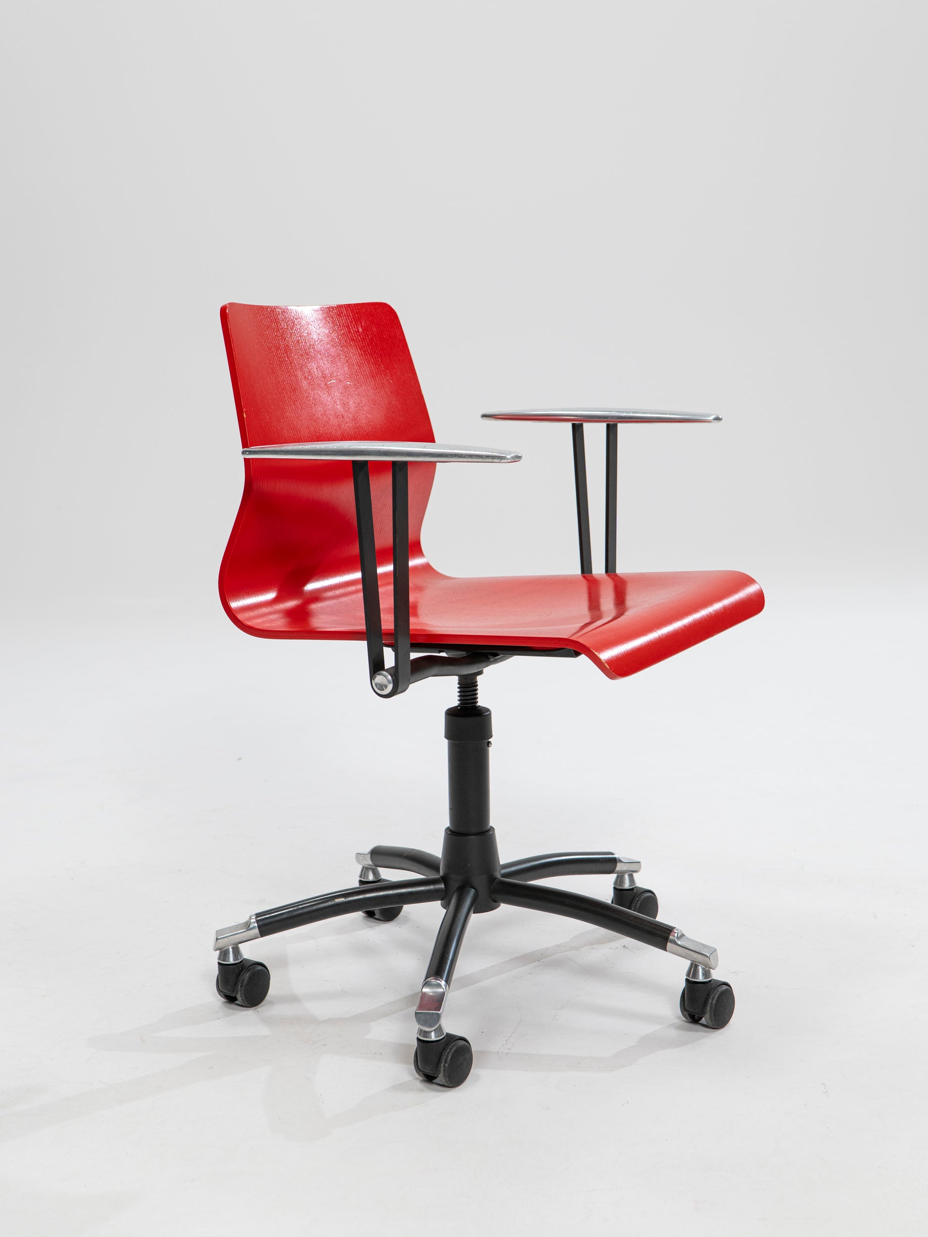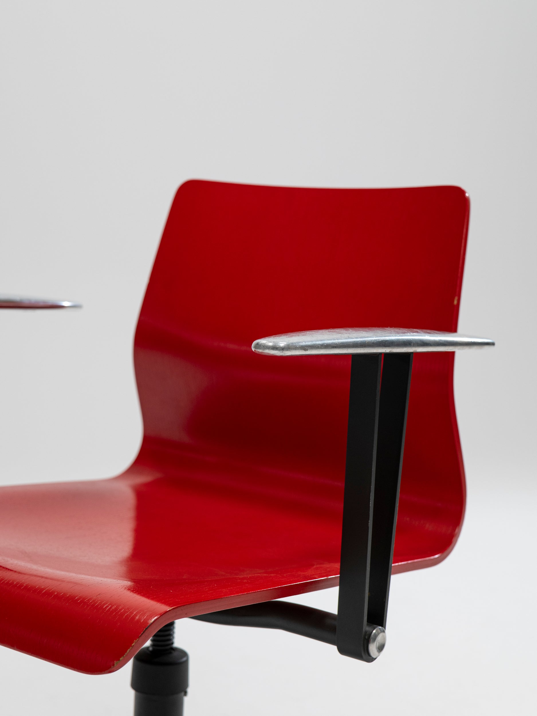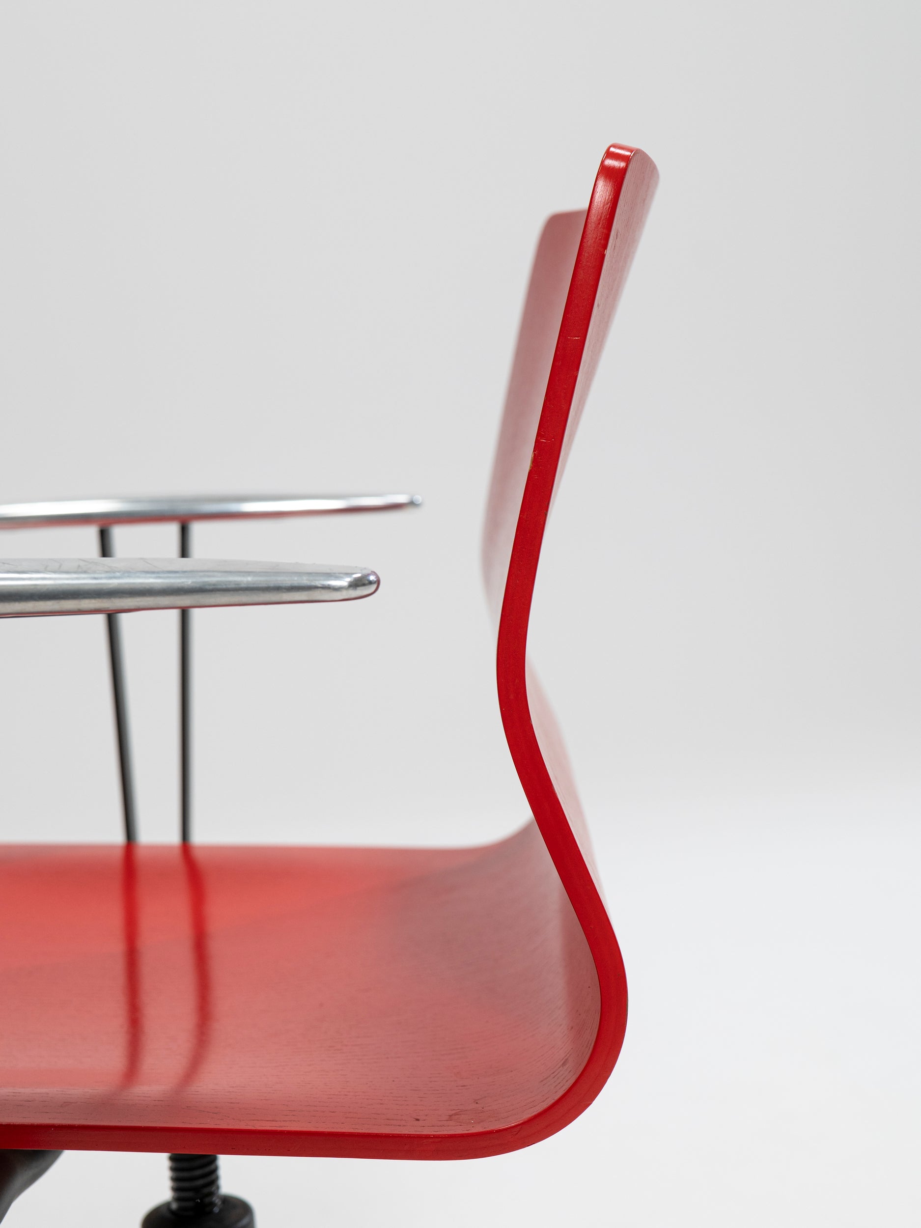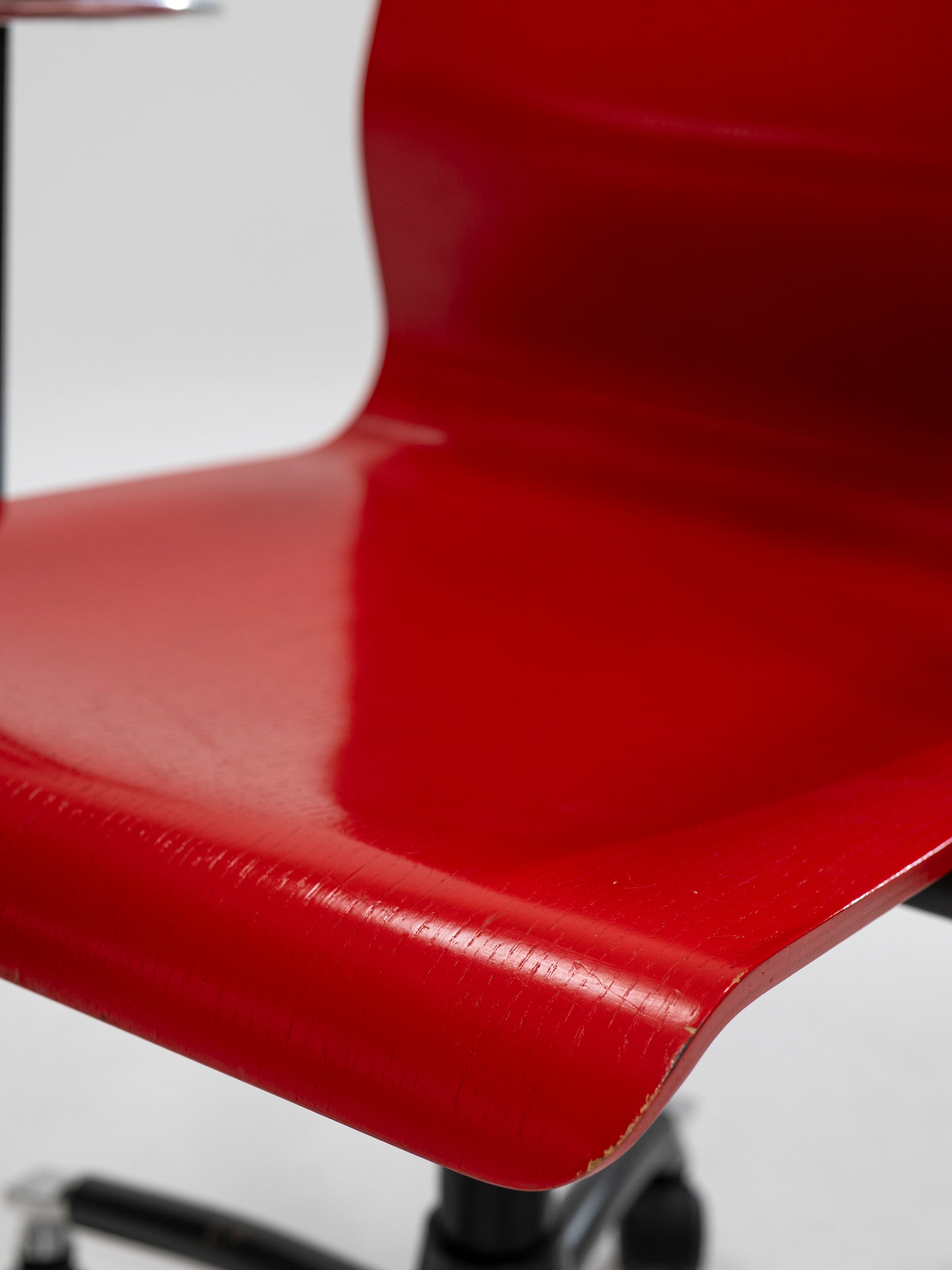 Desk chairs don't get much sexier than this beaut, with its triad of black matte metal, polished metal and masterfully-bent plywood painted red. Not to mention that it swivels, allowing its user to adjust the height. This unusual desk chair is comfortable, in working order and in a great condition