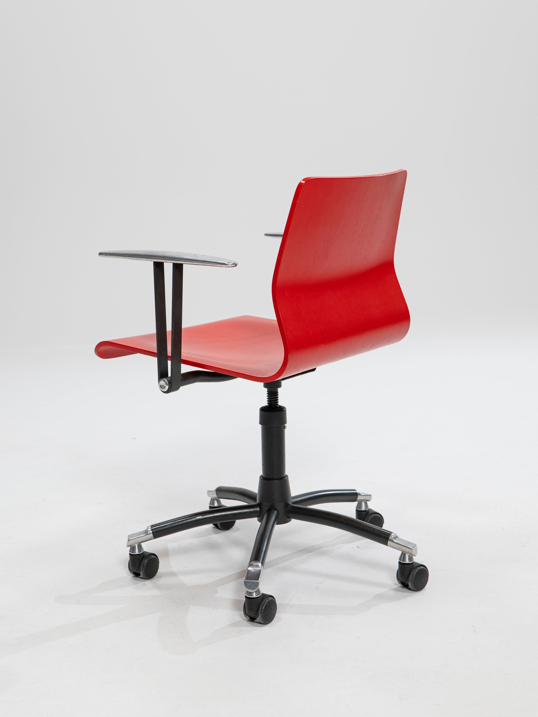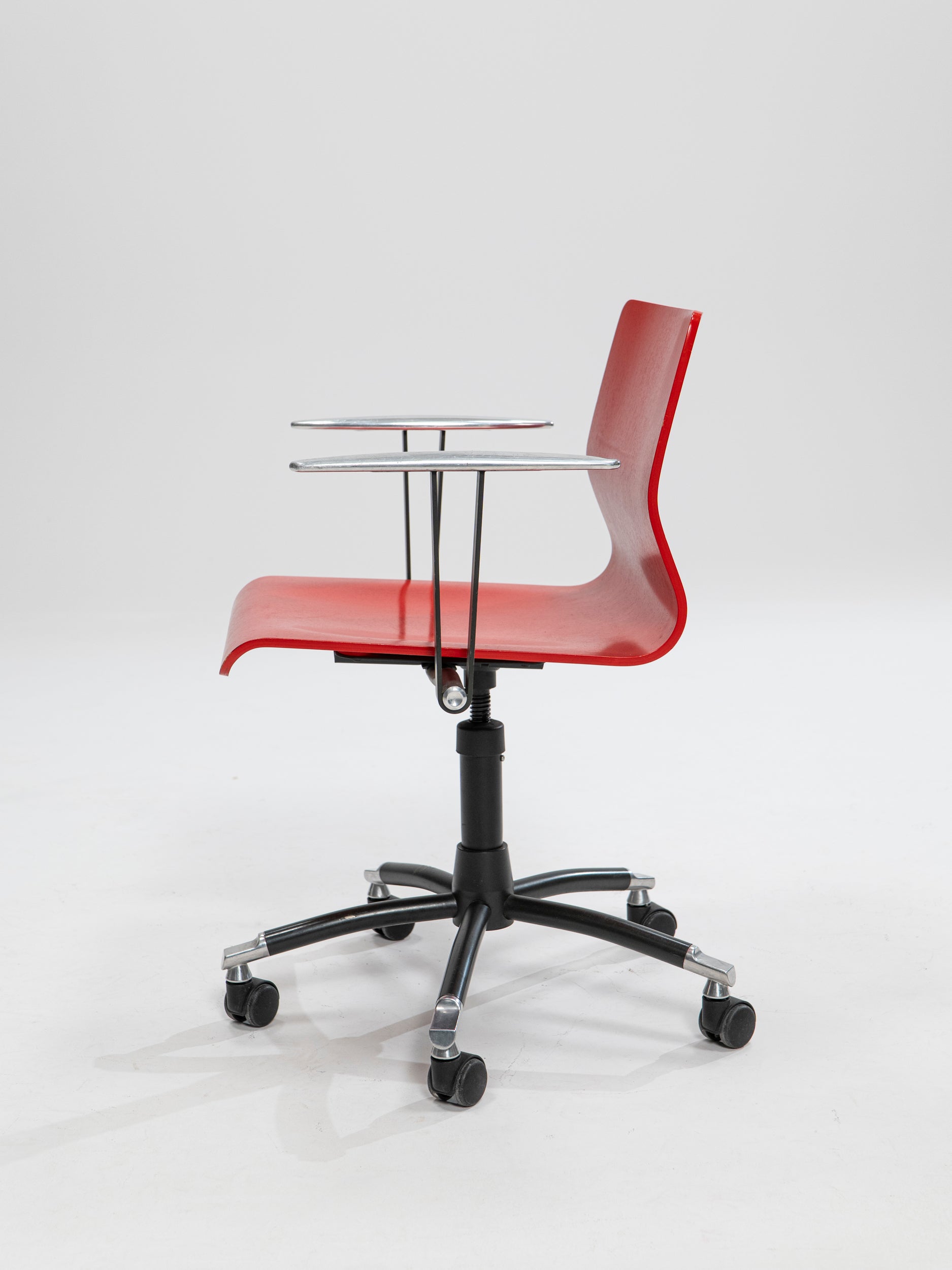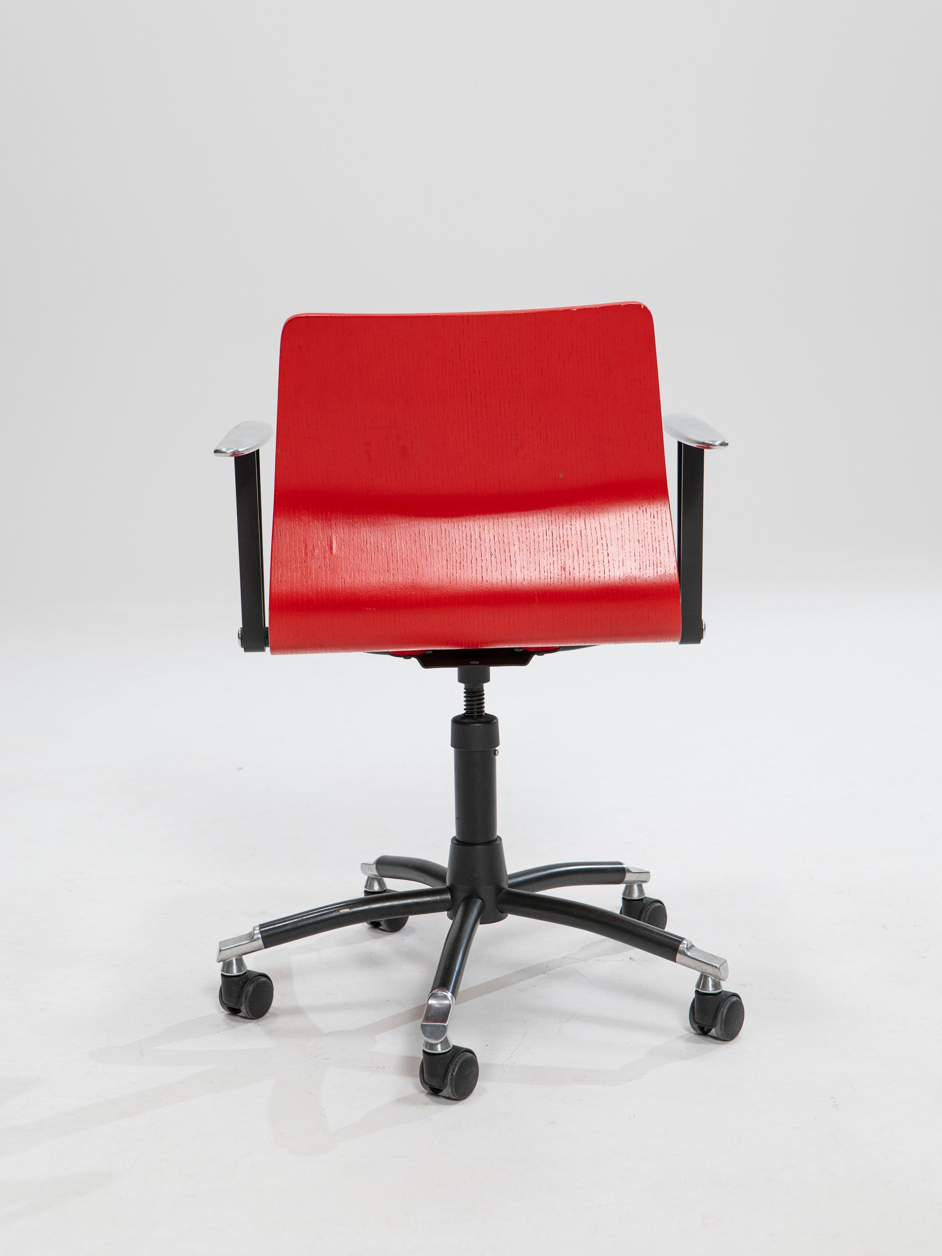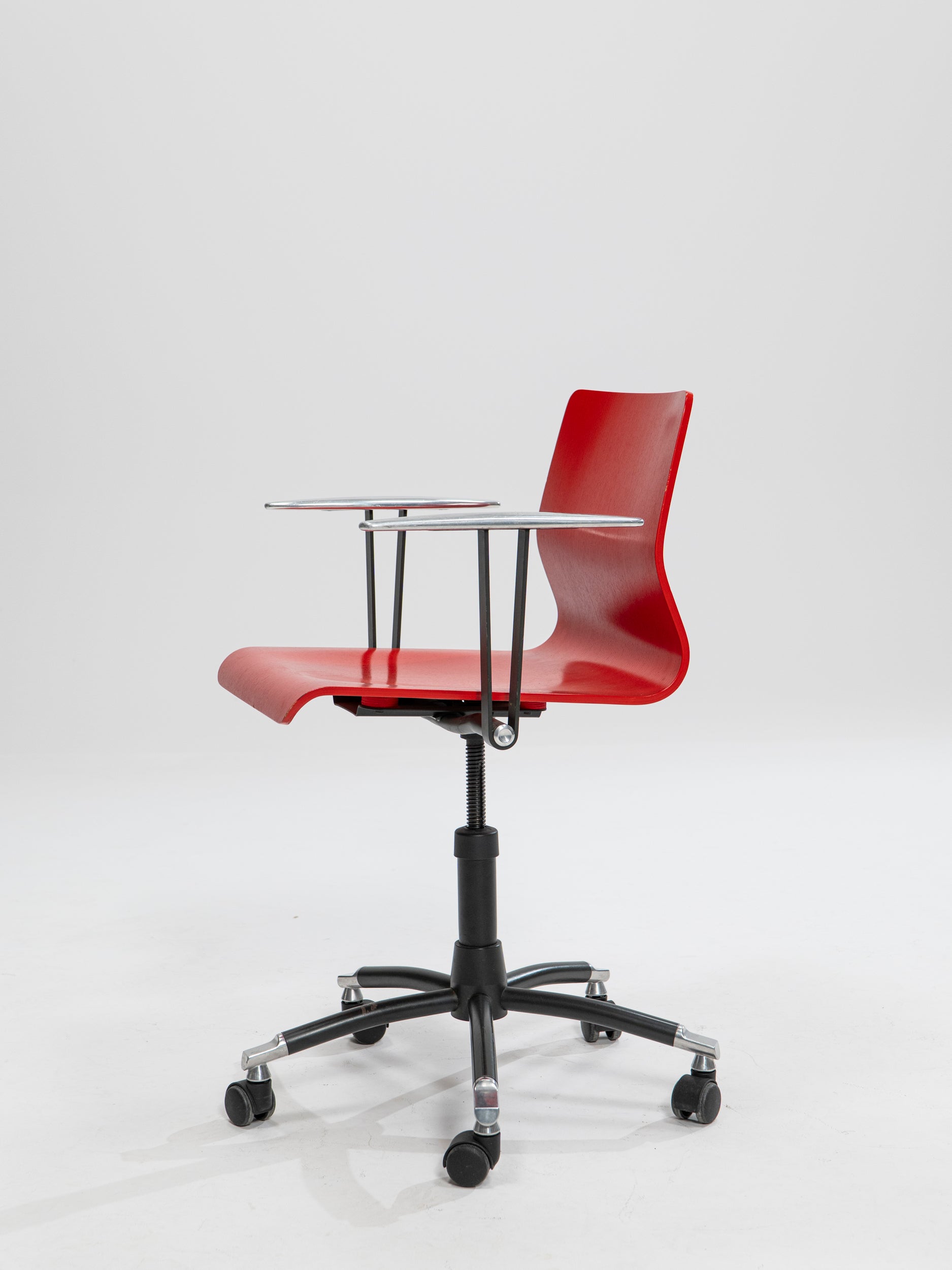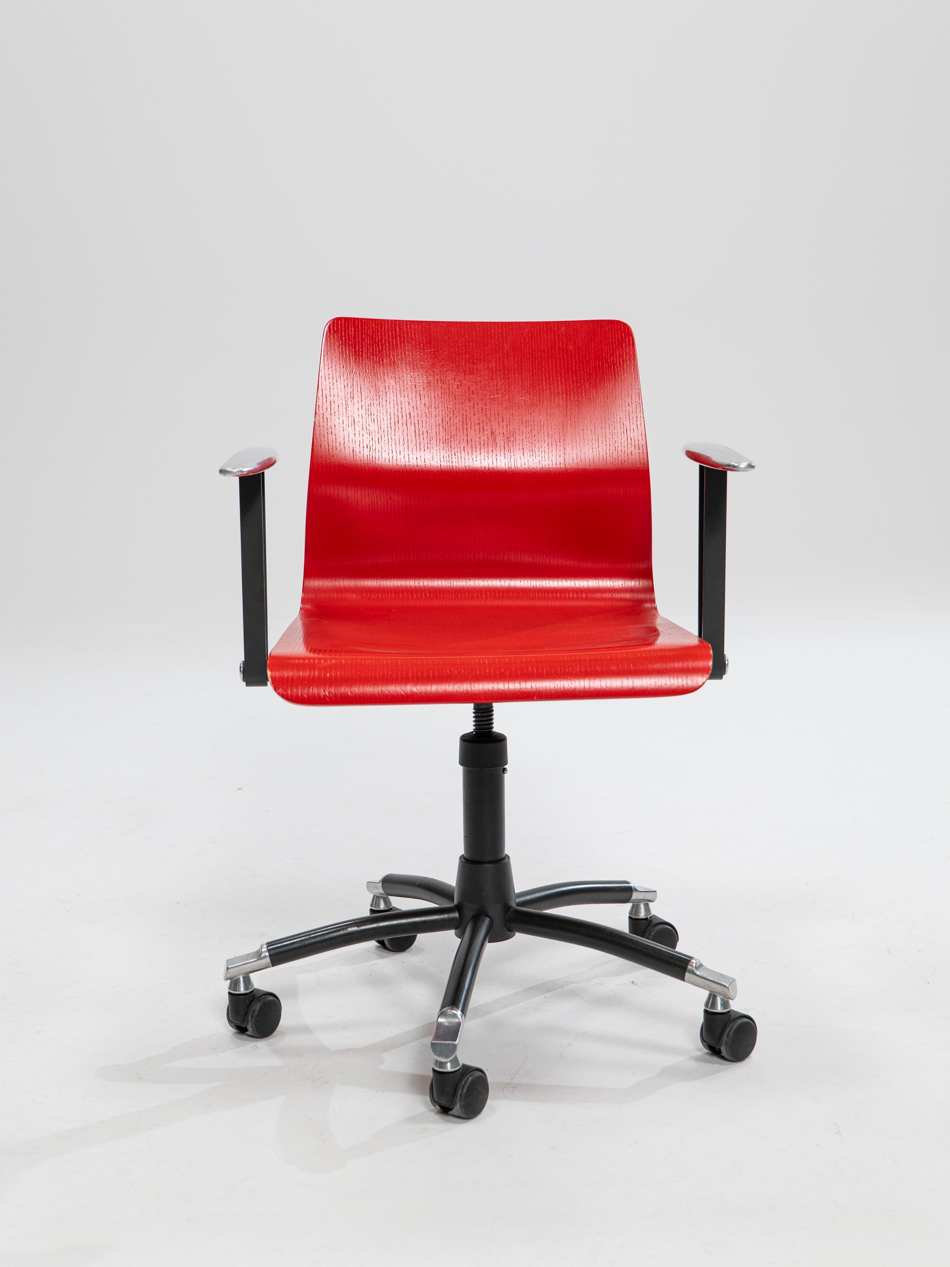 Desk chairs don't get much sexier than this beaut, with its triad of black matte metal, polished metal and masterfully-bent plywood painted red. Not to mention that it swivels, allowing its user to adjust the height. This unusual desk chair is comfortable, in working order and in a great condition
