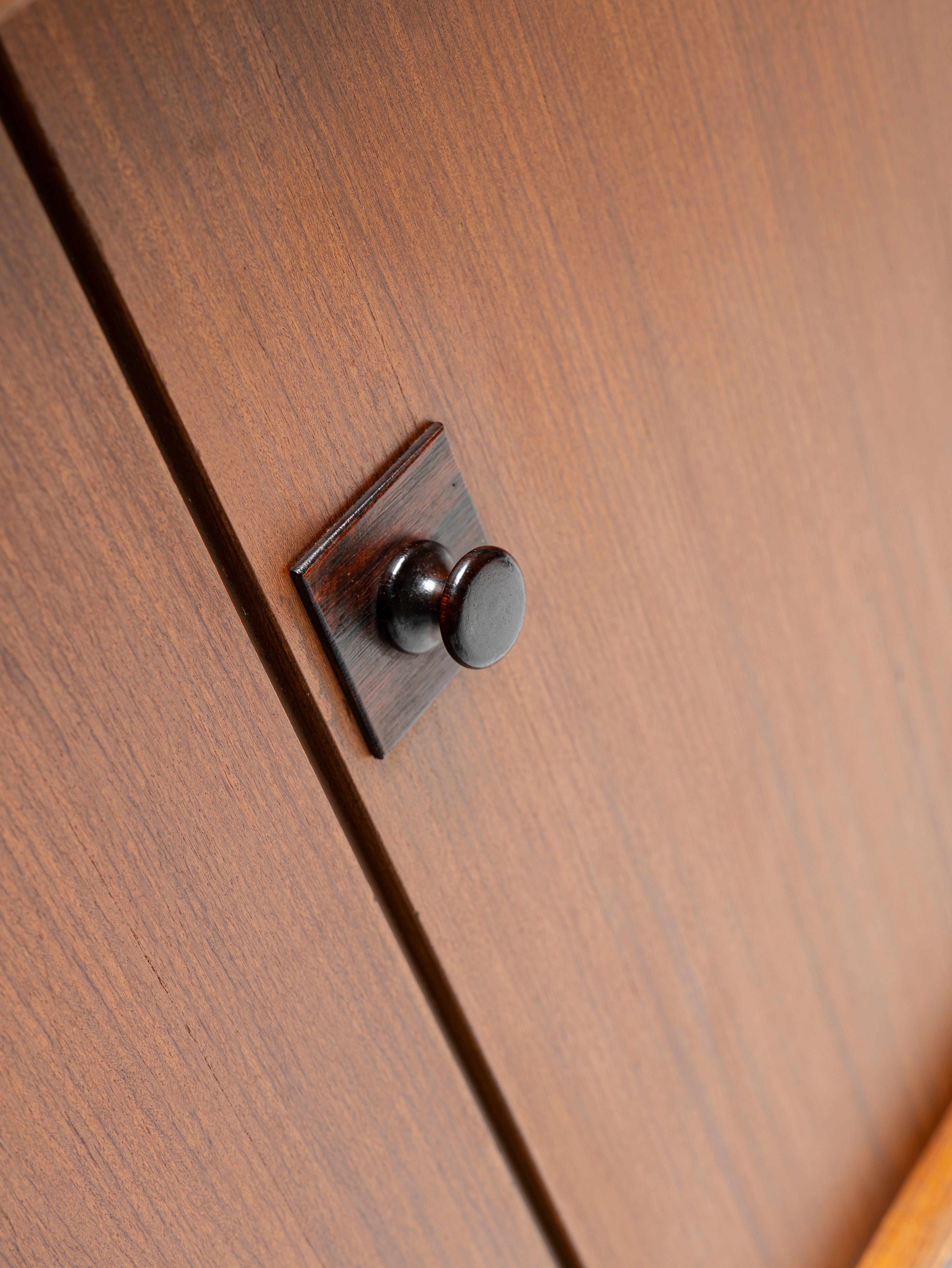 Inspired by Scandinavian design simplicity, this sideboard produced by the Barovero furniture factory as part of the Selex series is as elegant as it is massive. The brown teak veneer wood and elegant design features such as black painted brass hinge inserts, handles in bronzed brass, and alternating veneer colours make it a subtle piece of furniture that becomes quite vocal once you turn your attention to it. It features four side doors with internal compartments and a central section consisting of three large drawers alternating with two smaller ones.