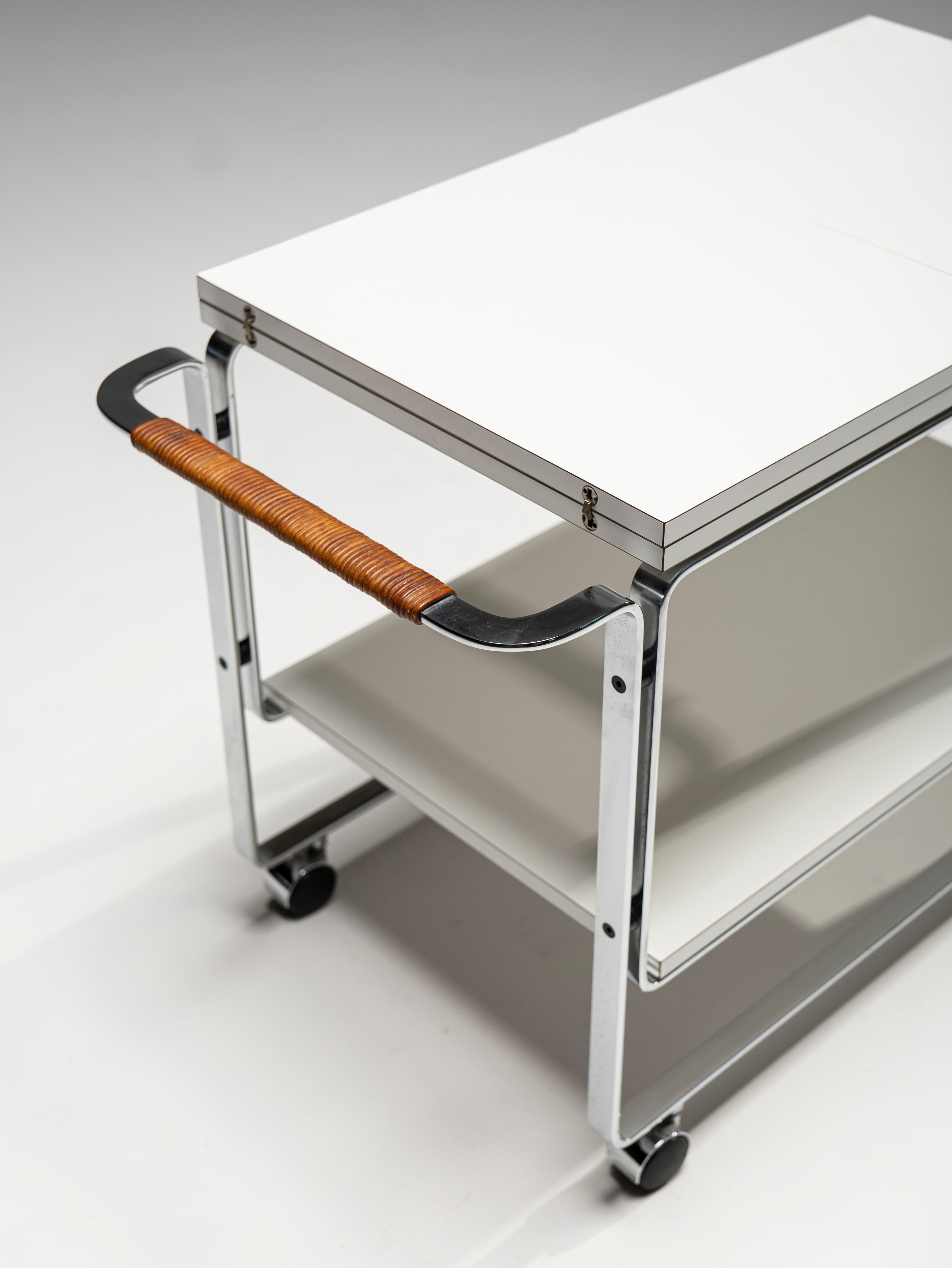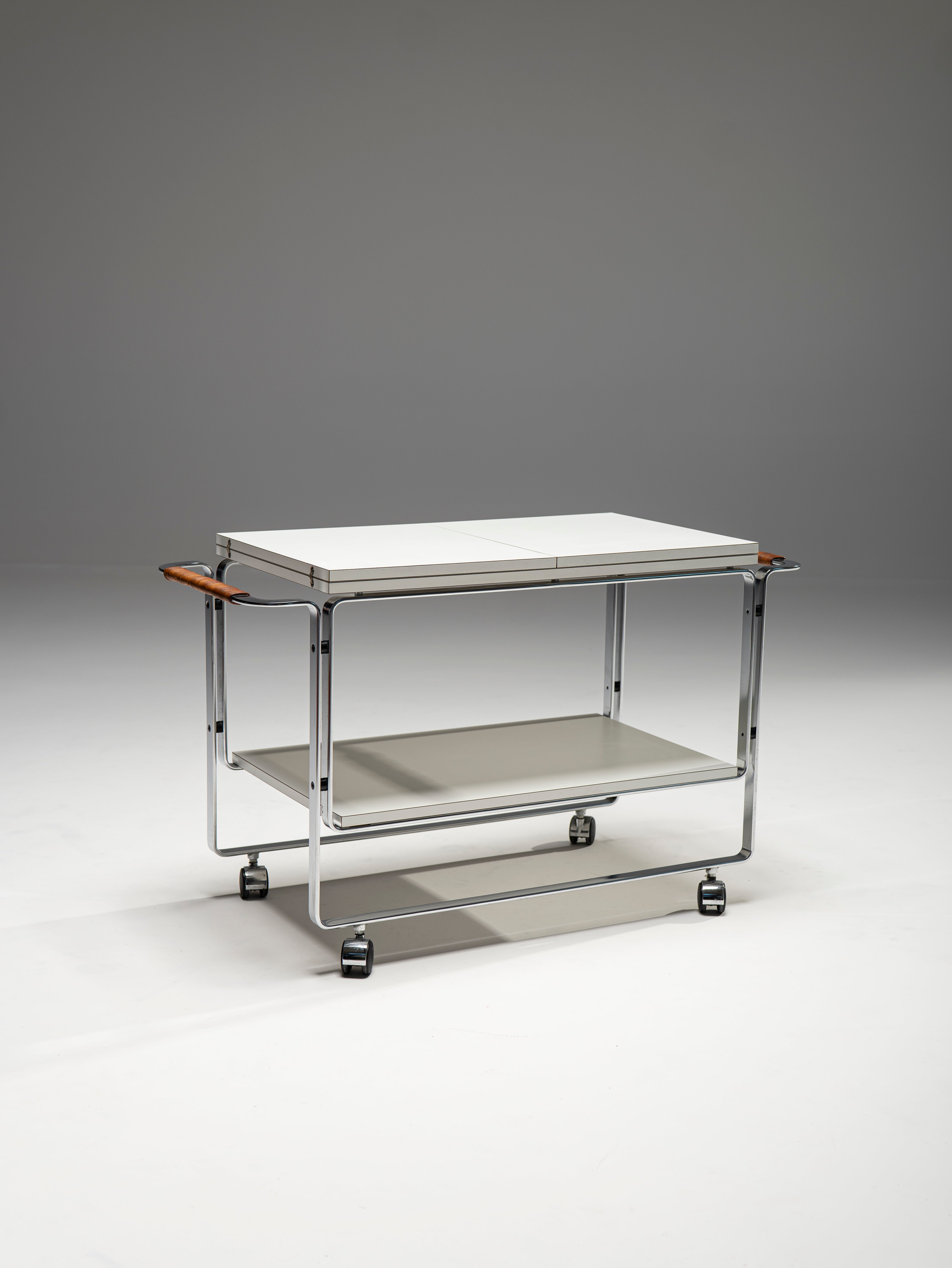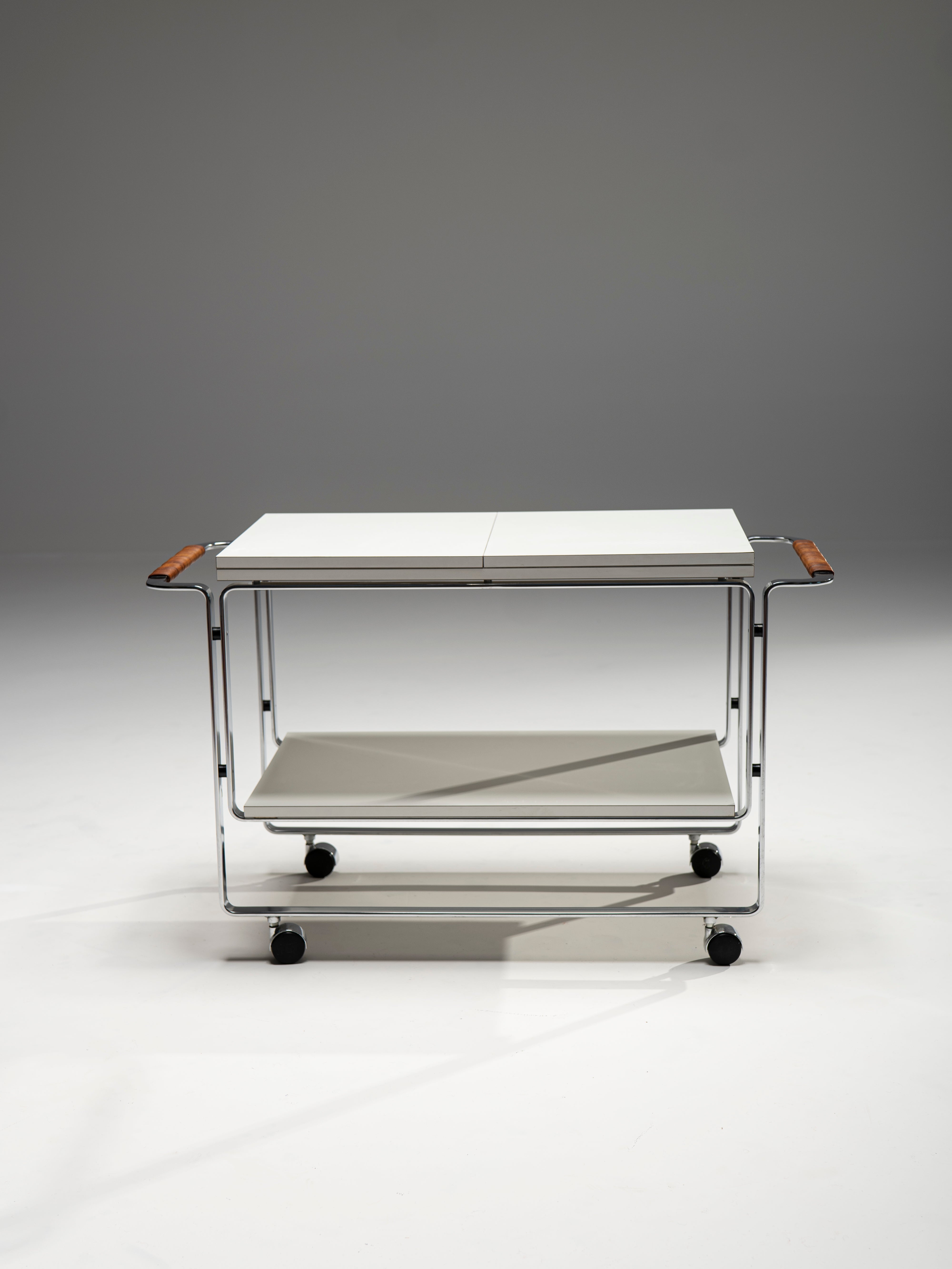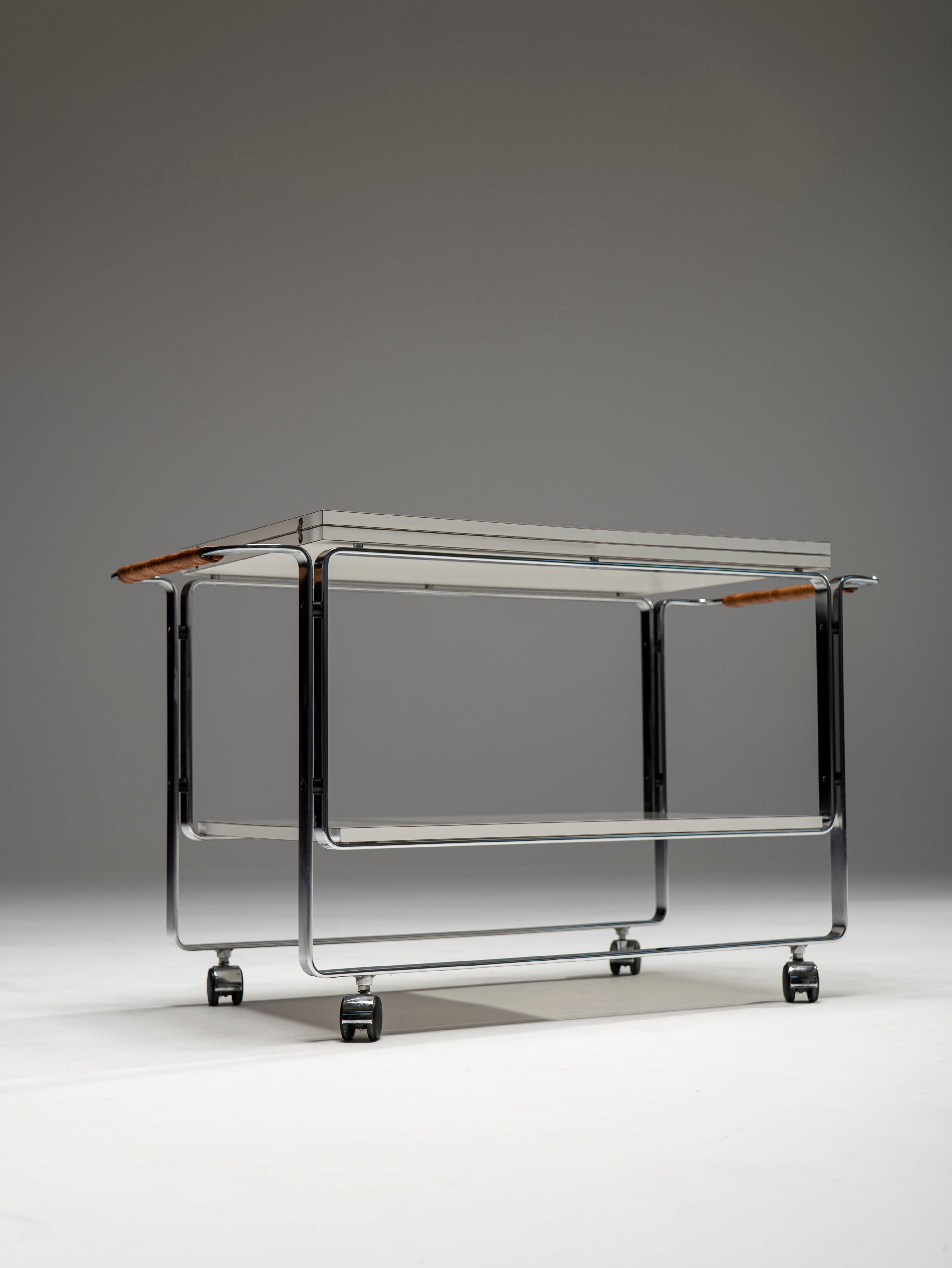 This powerful example of Bauhaus furniture comes not from the 1930s, but was designed by Horst Brüning in the 60s. Nevertheles, this serving trolley displays the same preference for elegant, purposefully-bent steel frames and modern materials, in this case, laminate wood for the plates. The top blate can be extended to reach a length of 156 cm. A personal touch of Brüning's are the leather-wrapped handles which, apart for ensuring a better, warmer grip, provide an organic material to the otherwise cold composition.