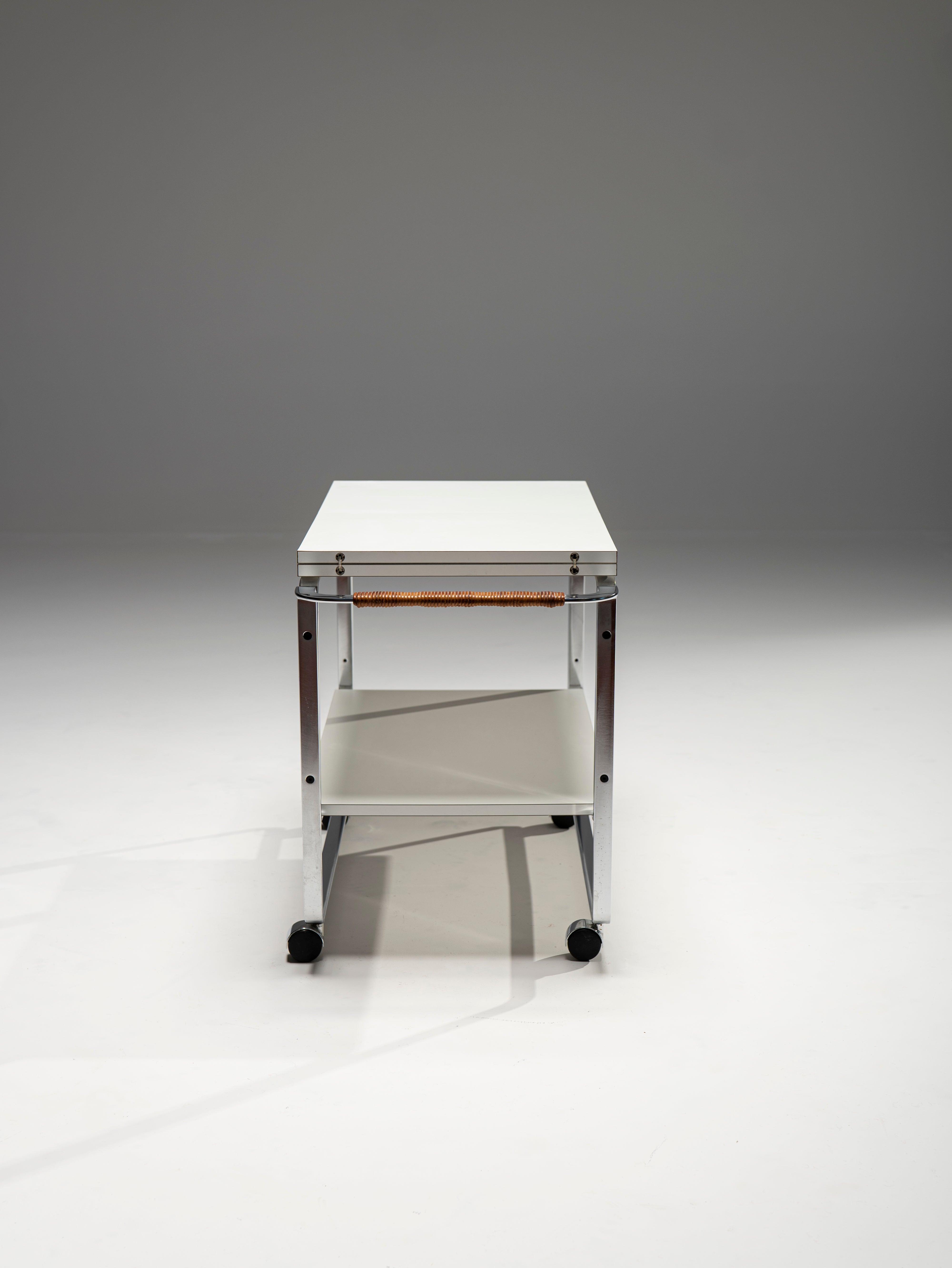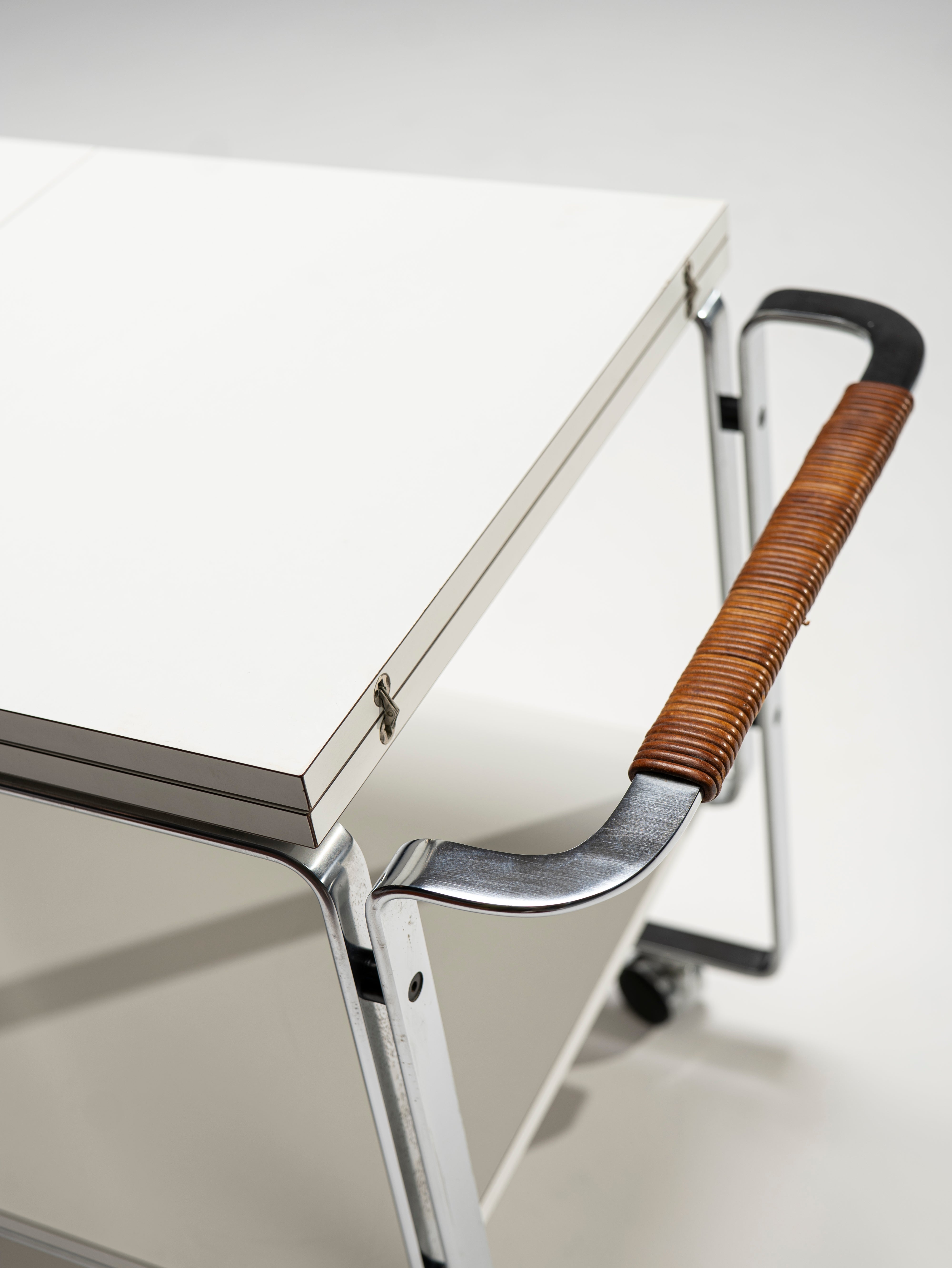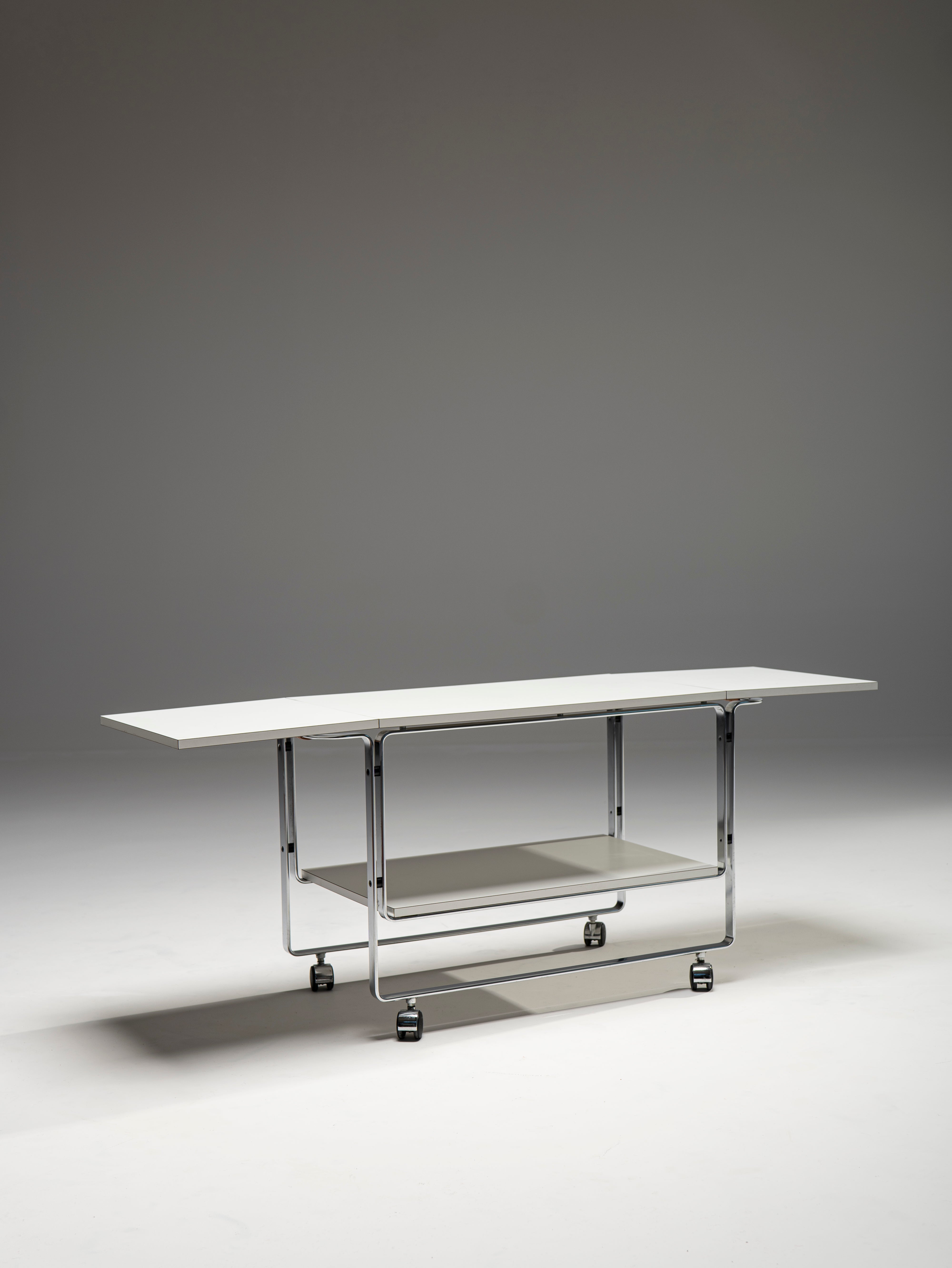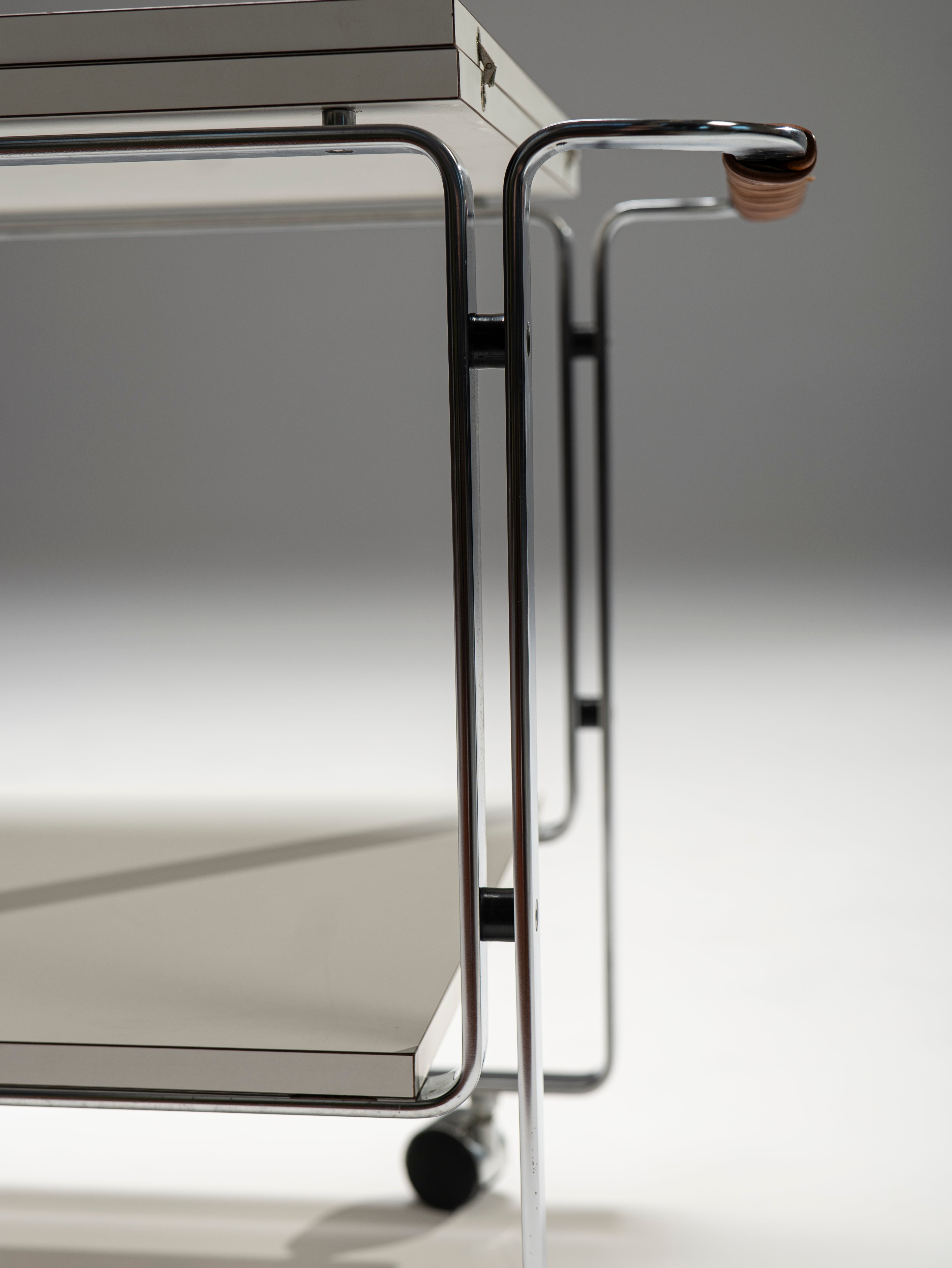 This powerful example of Bauhaus furniture comes not from the 1930s, but was designed by Horst Brüning in the 60s. Nevertheles, this serving trolley displays the same preference for elegant, purposefully-bent steel frames and modern materials, in this case, laminate wood for the plates. The top blate can be extended to reach a length of 156 cm. A personal touch of Brüning's are the leather-wrapped handles which, apart for ensuring a better, warmer grip, provide an organic material to the otherwise cold composition.