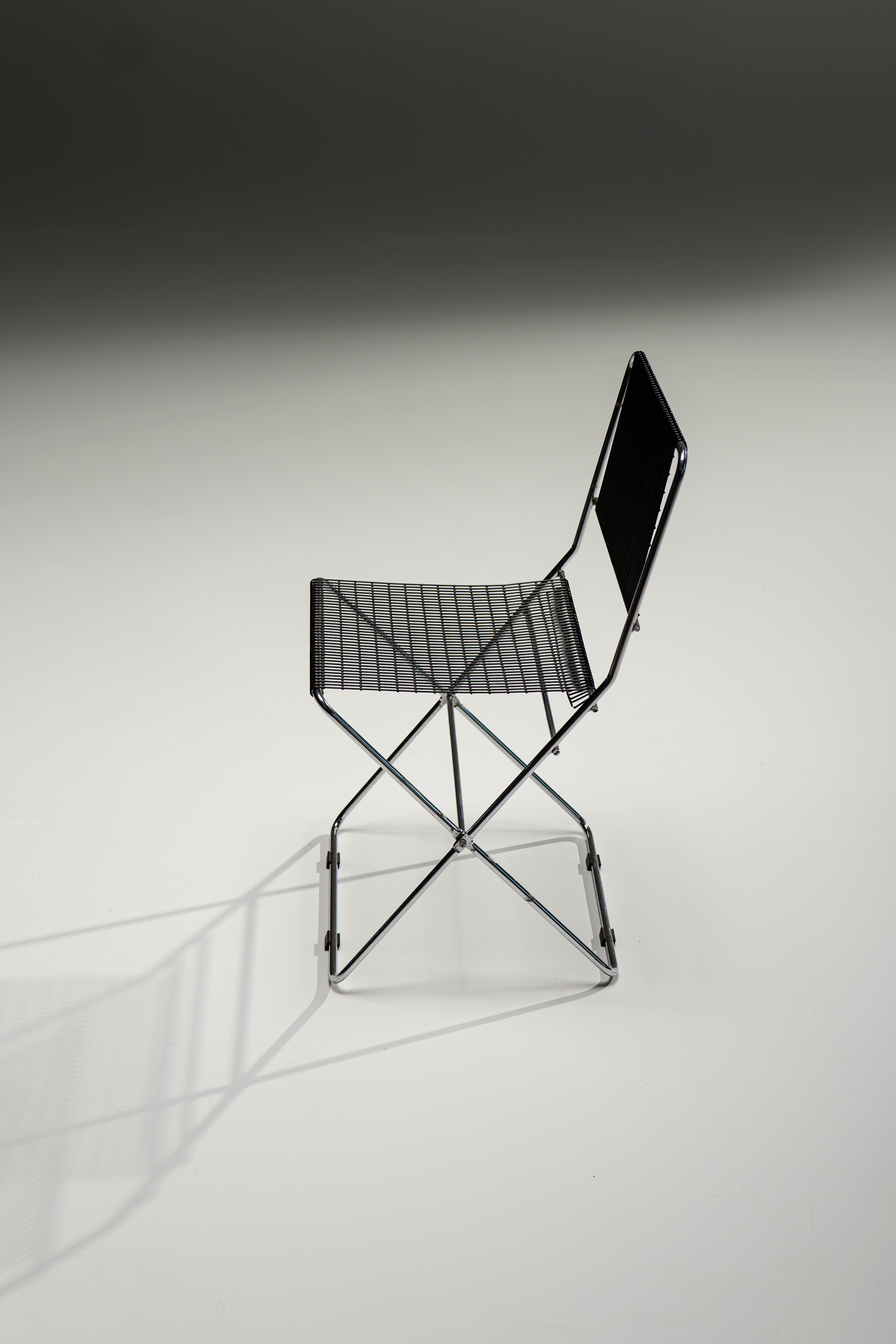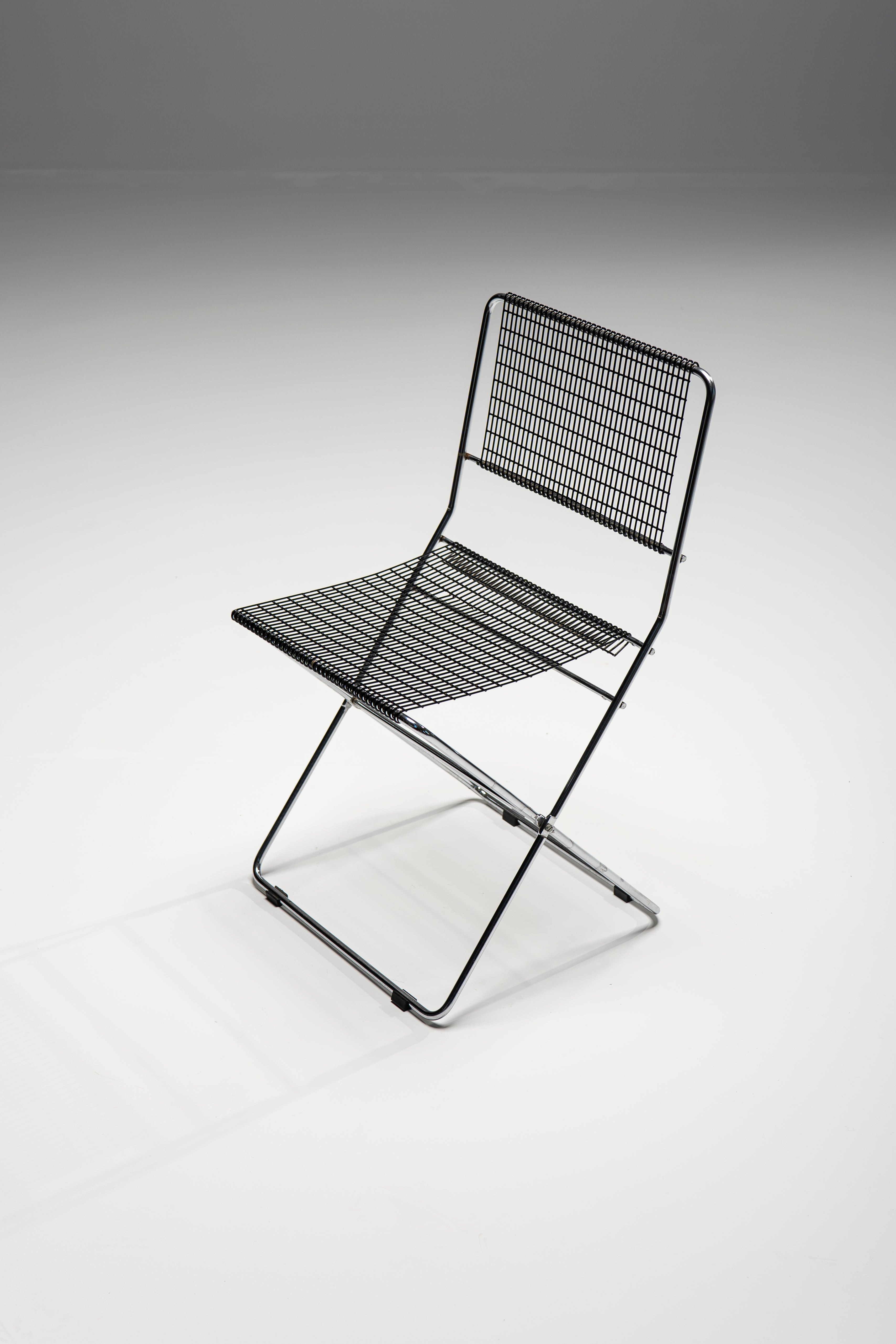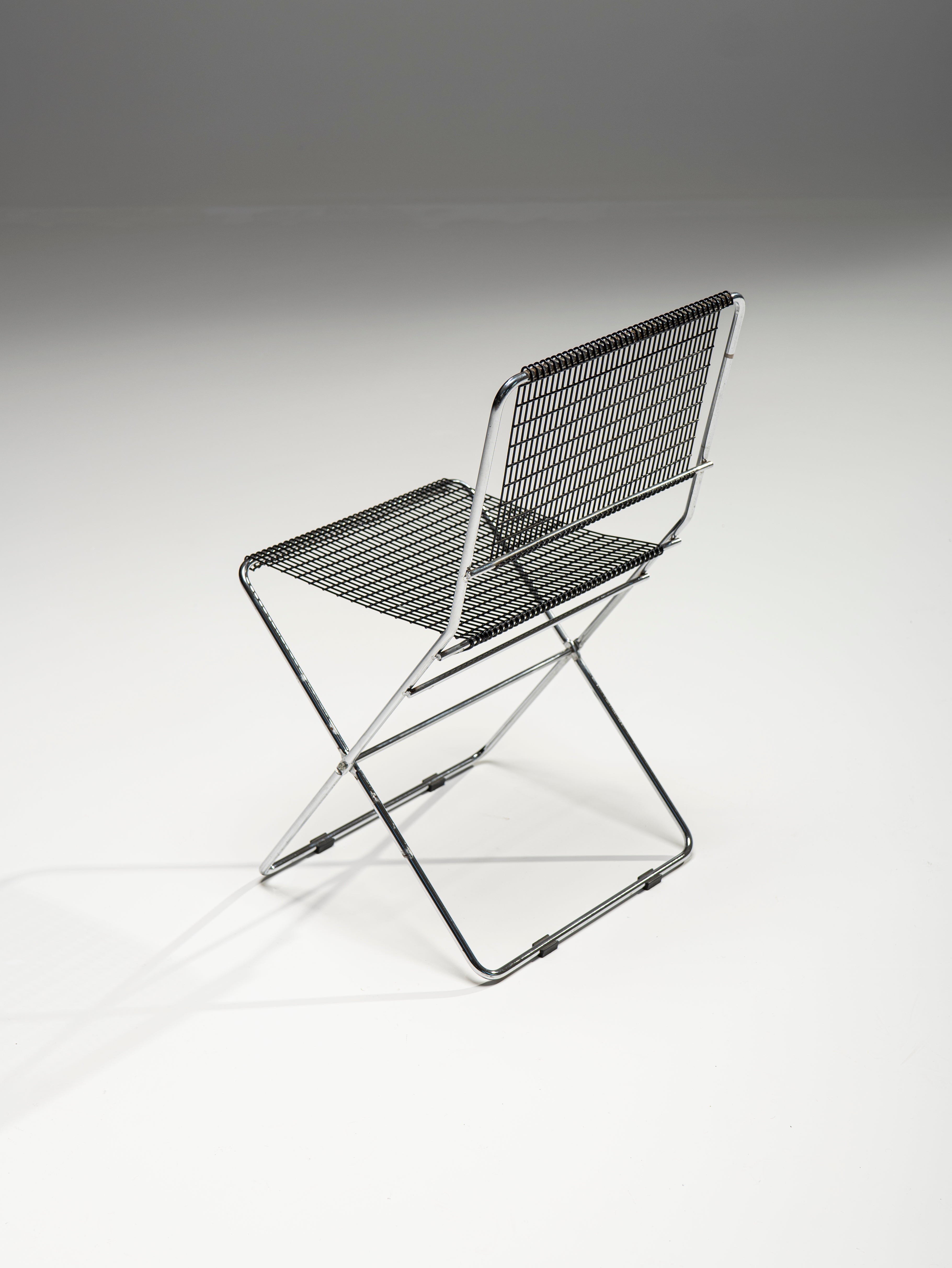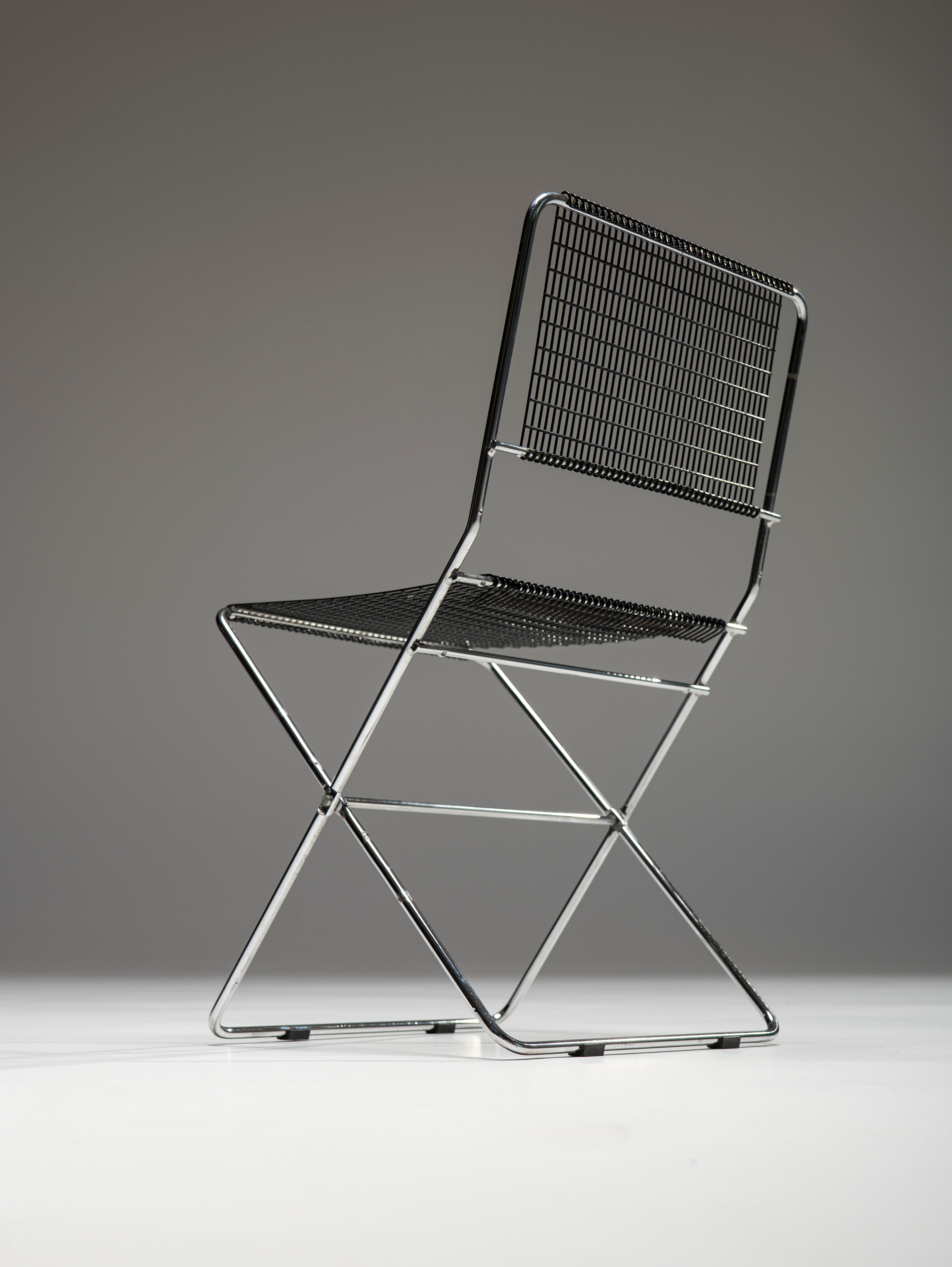 Designed by Guido De Marco and Roberto Rebolini for the Italian manufacturer Robots, these light metal chairs can be used in two positions: one normal and one more laid back, and they can also be folded all the way, for easy storage and transport. The frame is chrome-plated, and the seat and backrest are made of black metal mesh, covered in black paint so that they don't feel cold to the touch. The metal mesh is quite malleable and makes for a surprisingly comfortable sitting experience.
