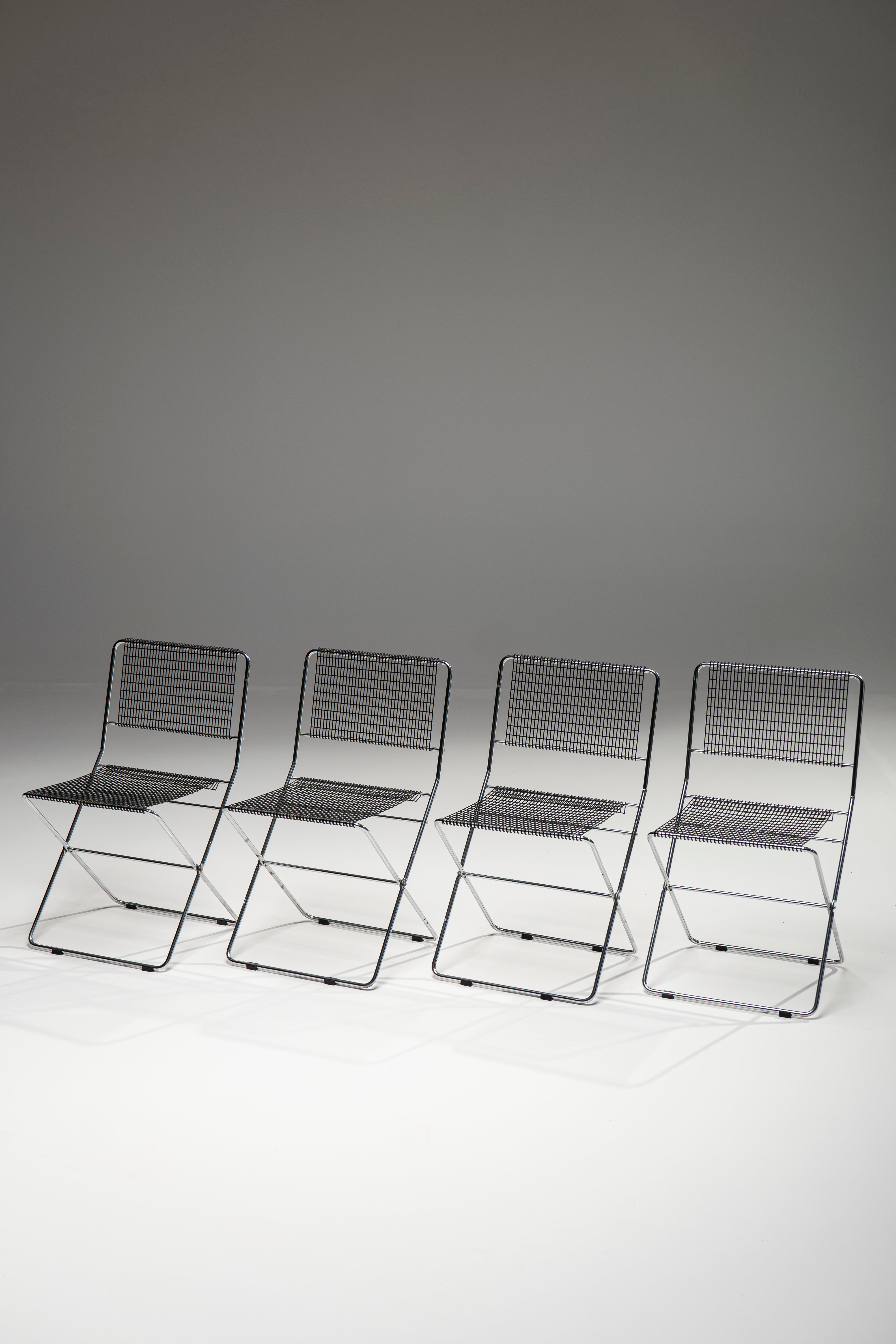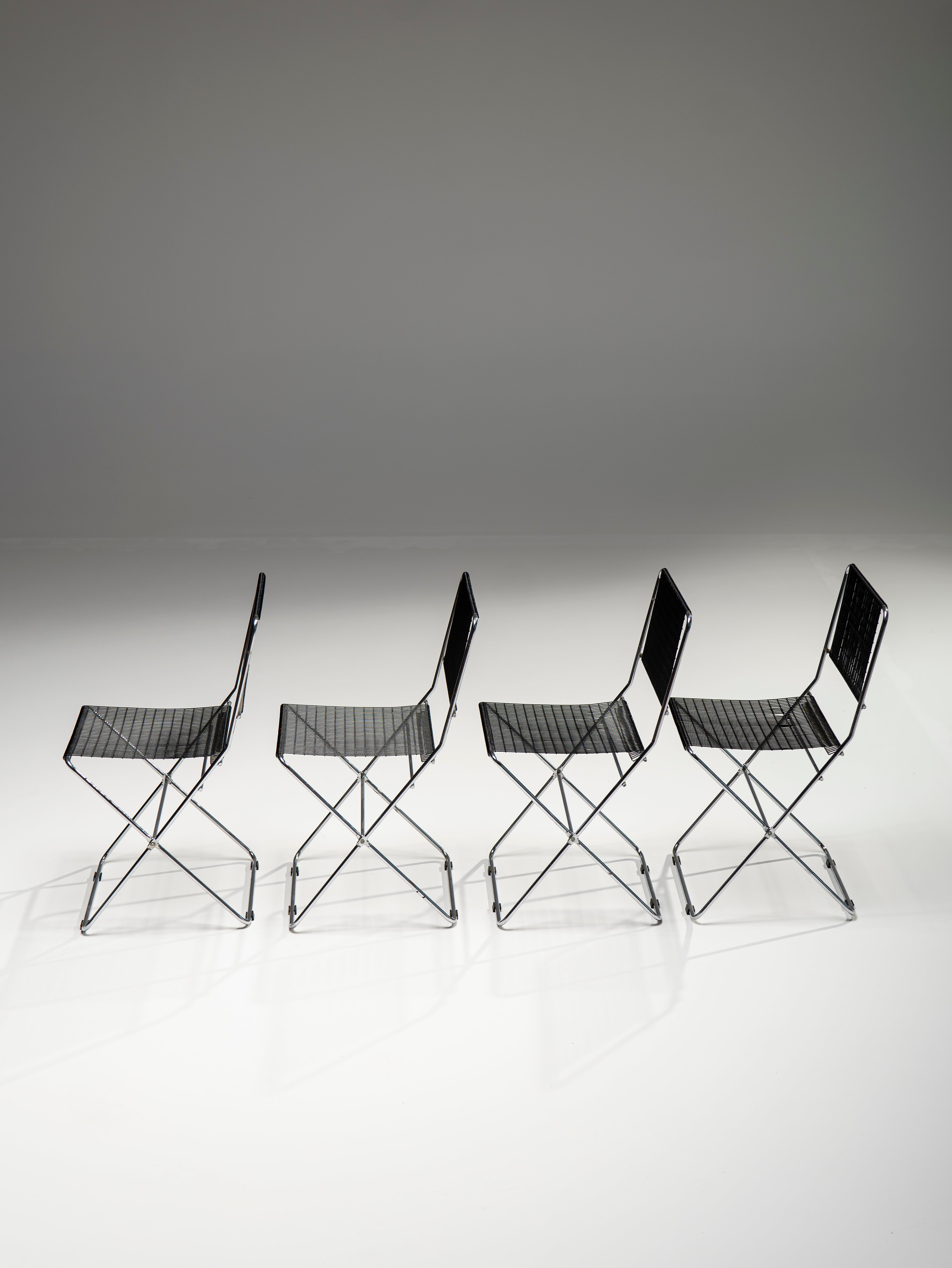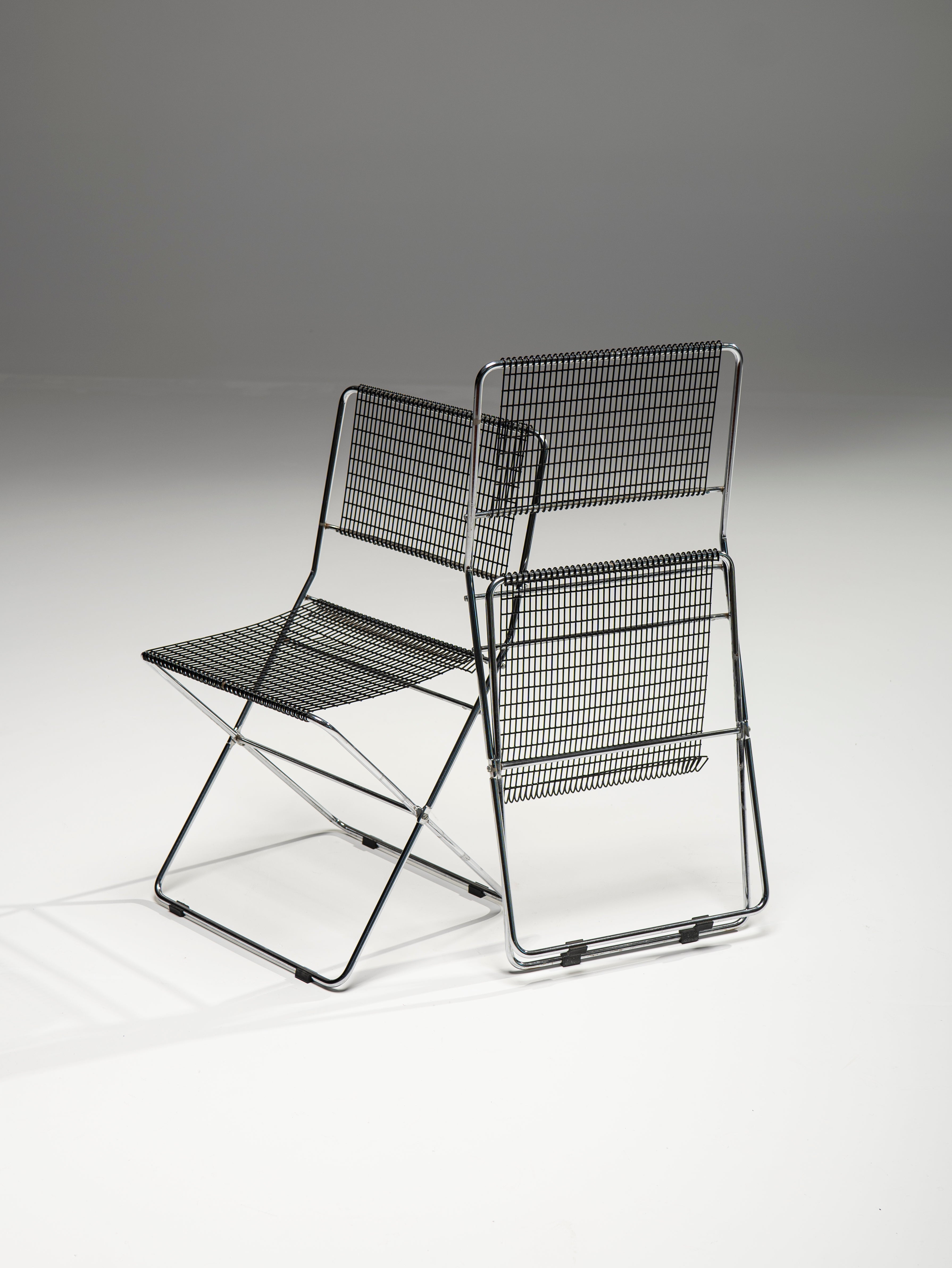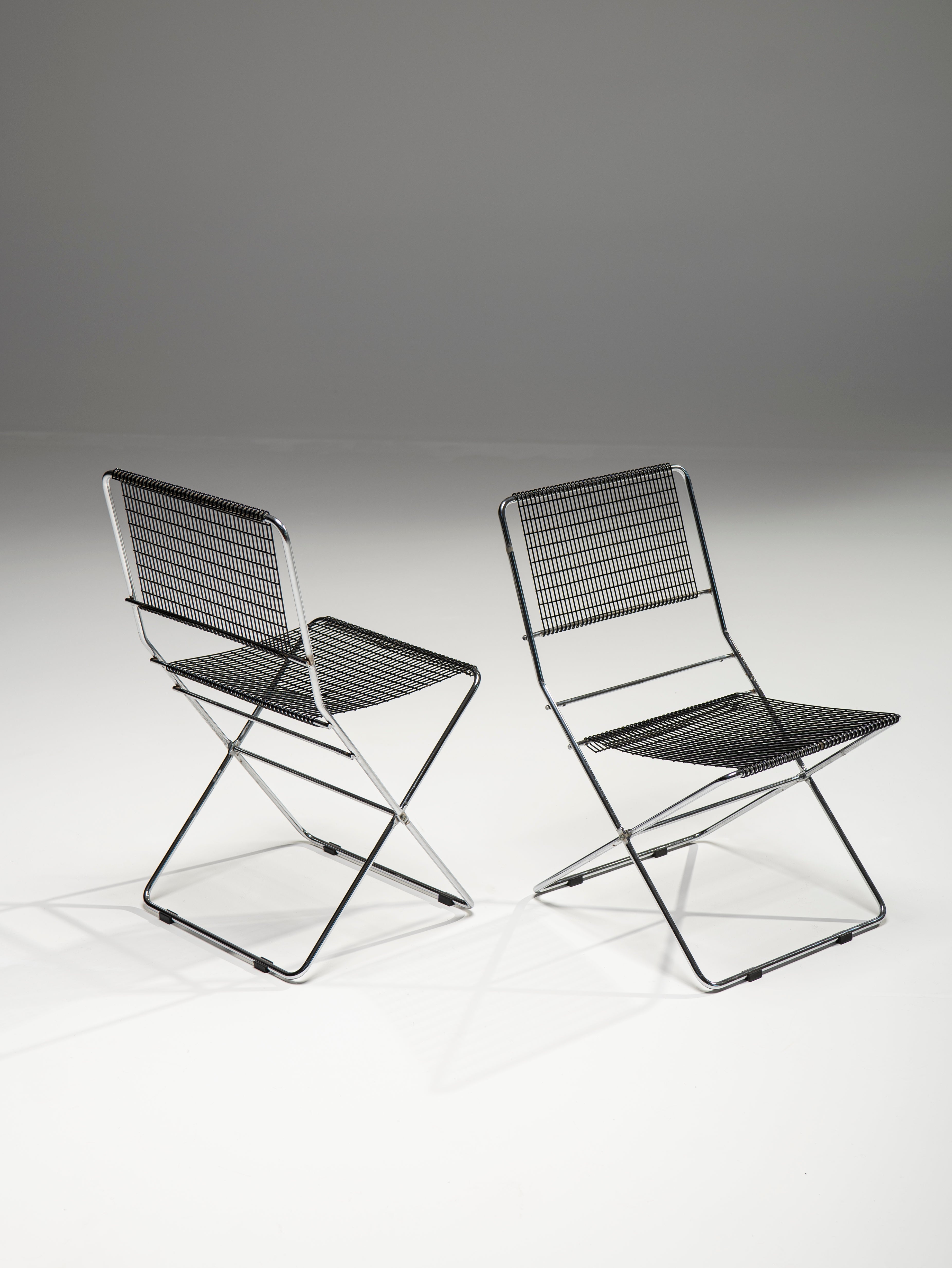 Designed by Guido De Marco and Roberto Rebolini for the Italian manufacturer Robots, these light metal chairs can be used in two positions: one normal and one more laid back, and they can also be folded all the way, for easy storage and transport. The frame is chrome-plated, and the seat and backrest are made of black metal mesh, covered in black paint so that they don't feel cold to the touch. The metal mesh is quite malleable and makes for a surprisingly comfortable sitting experience.