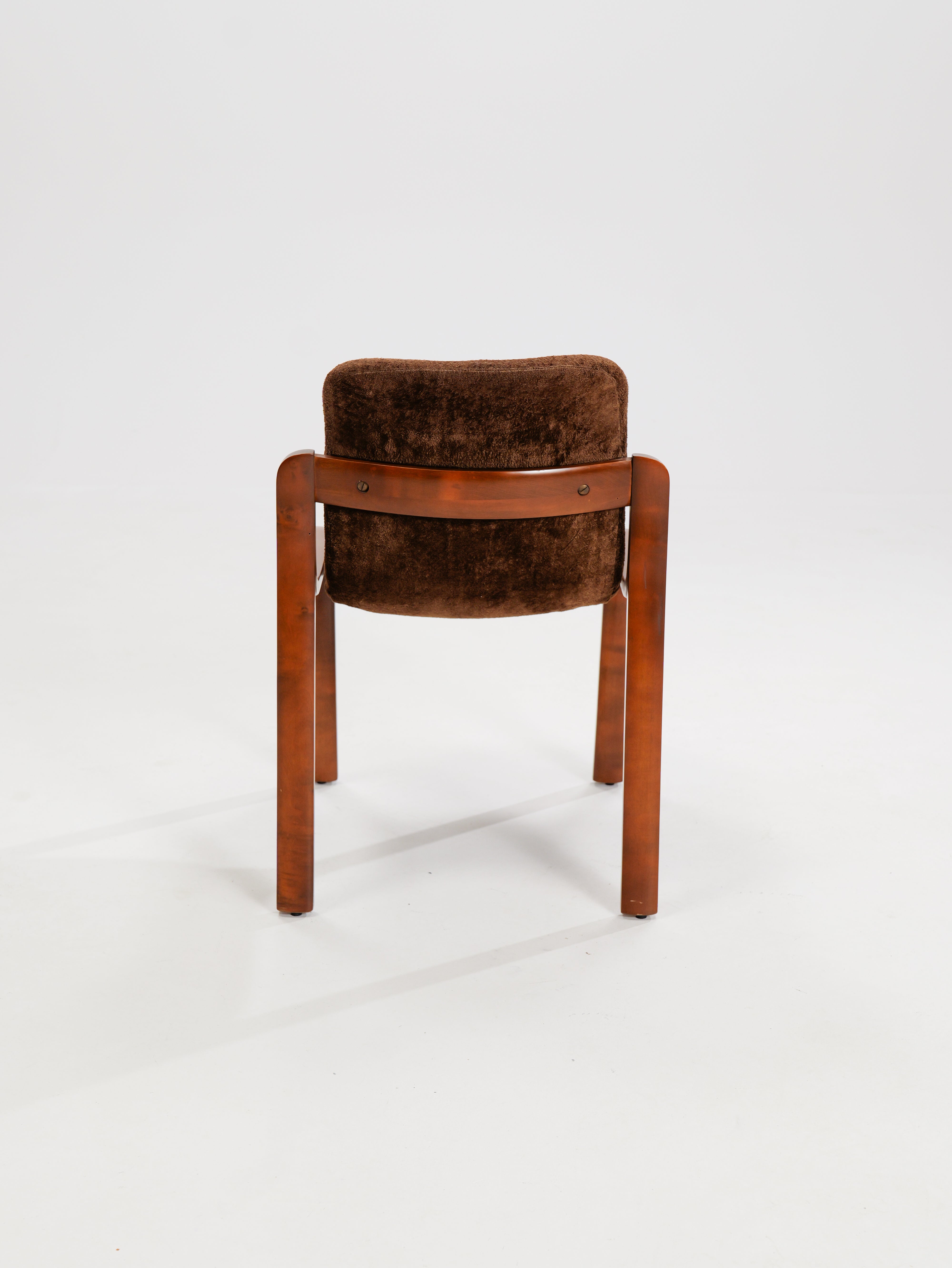 The seat and backrest are upholstered in a soft, fur-like fabric that is pleasant to the touch and highly comfortable, in a rich chocolate-brown tone that harmonizes beautifully with the wood. The slightly curved backrest provides ergonomic support, while the wooden armrests add both stability and a refined visual presence.