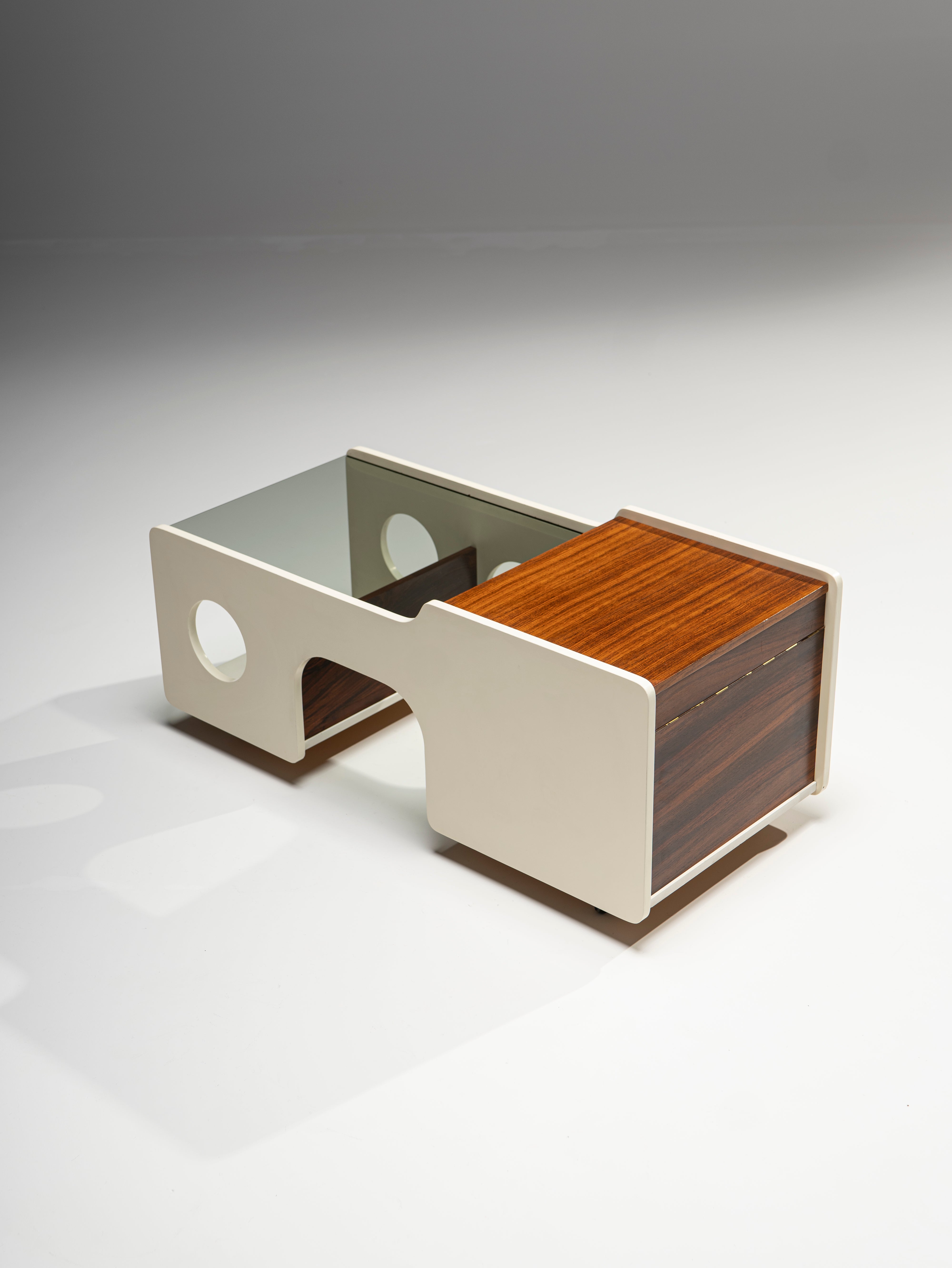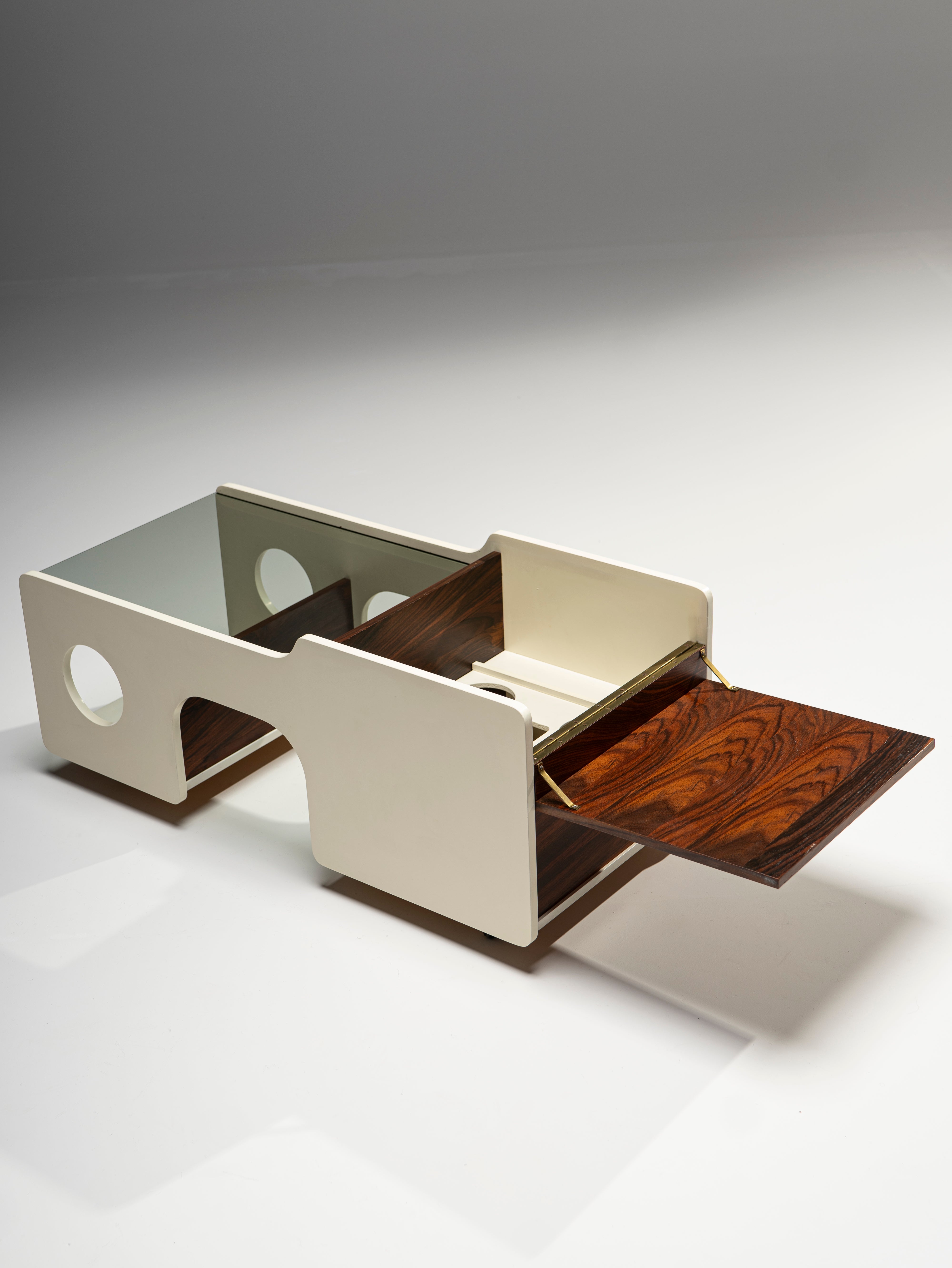 The three purposes this piece serves are highlighted by the designer's materials of choice: the trolley, structural bit is done in white lacquered wood, the coffee table consists of a sheet of smoked glass, and the bar is treated in dark wood veneer. The ensemble rests on four chrome and rubber futuristic wheels which make it easy to shift around. Upon opening the bar lid, one is presented with a generous compartment capable of providing a good time and, due to the low placement of the lid's hinge and its two reinforcements, the lid can serve as a temporary mixing table, if one should wish to use it as such.