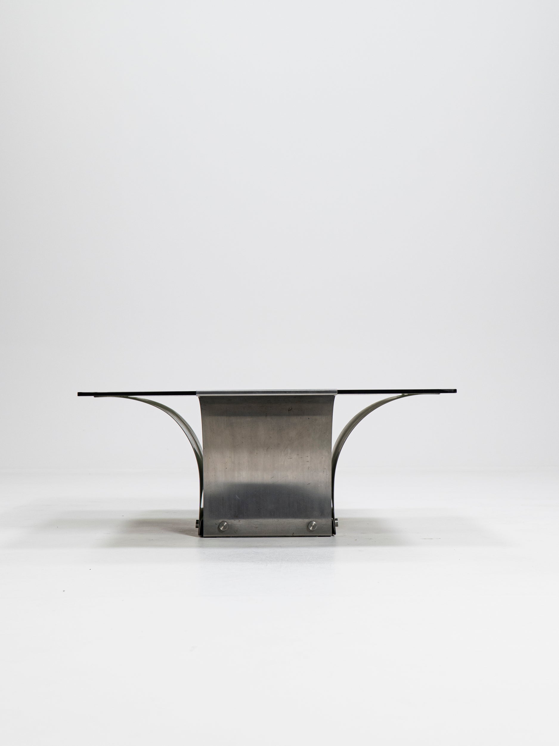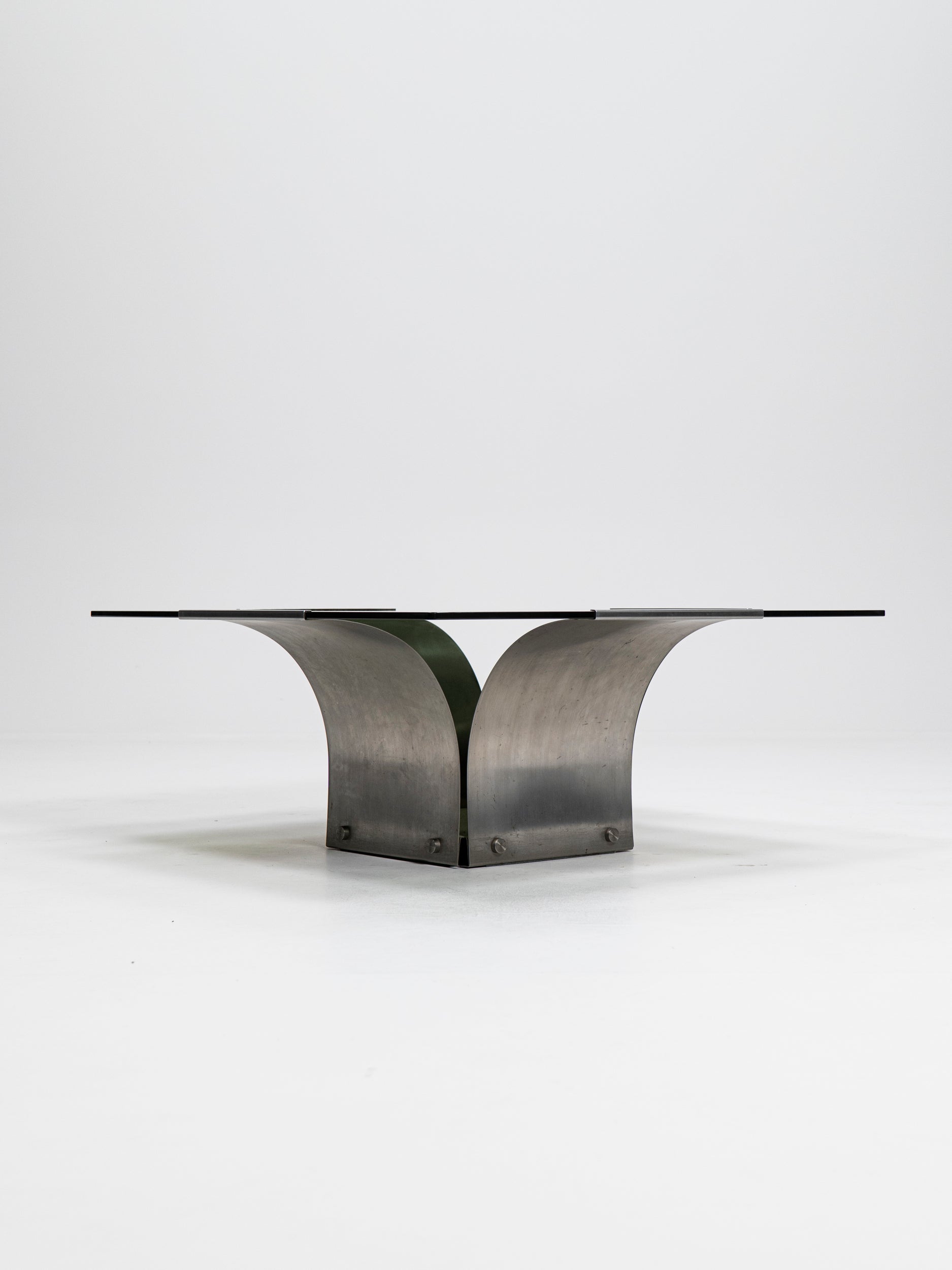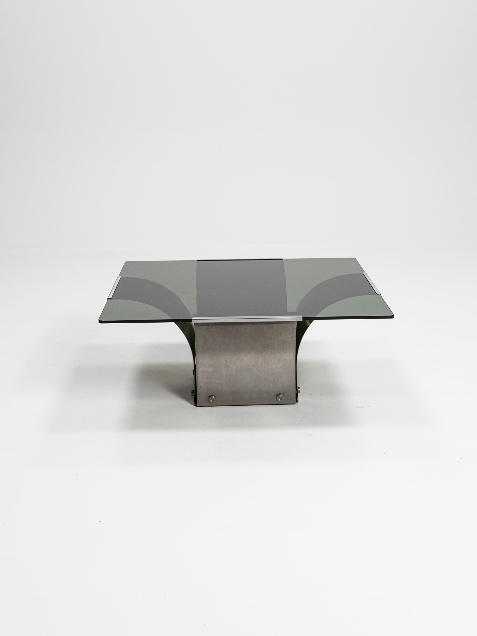Composed out of four identical bent sheet metal pieces holding up a square smoked glass tabletop, this particular coffee table is one of François Monnet many iterations for Kappa featuring simple but effective design experiments. The sheets are bolted to a square frame at the bottom, and bent at the top so as to hold the glass pane. The magic happens in between, effortlessly so.