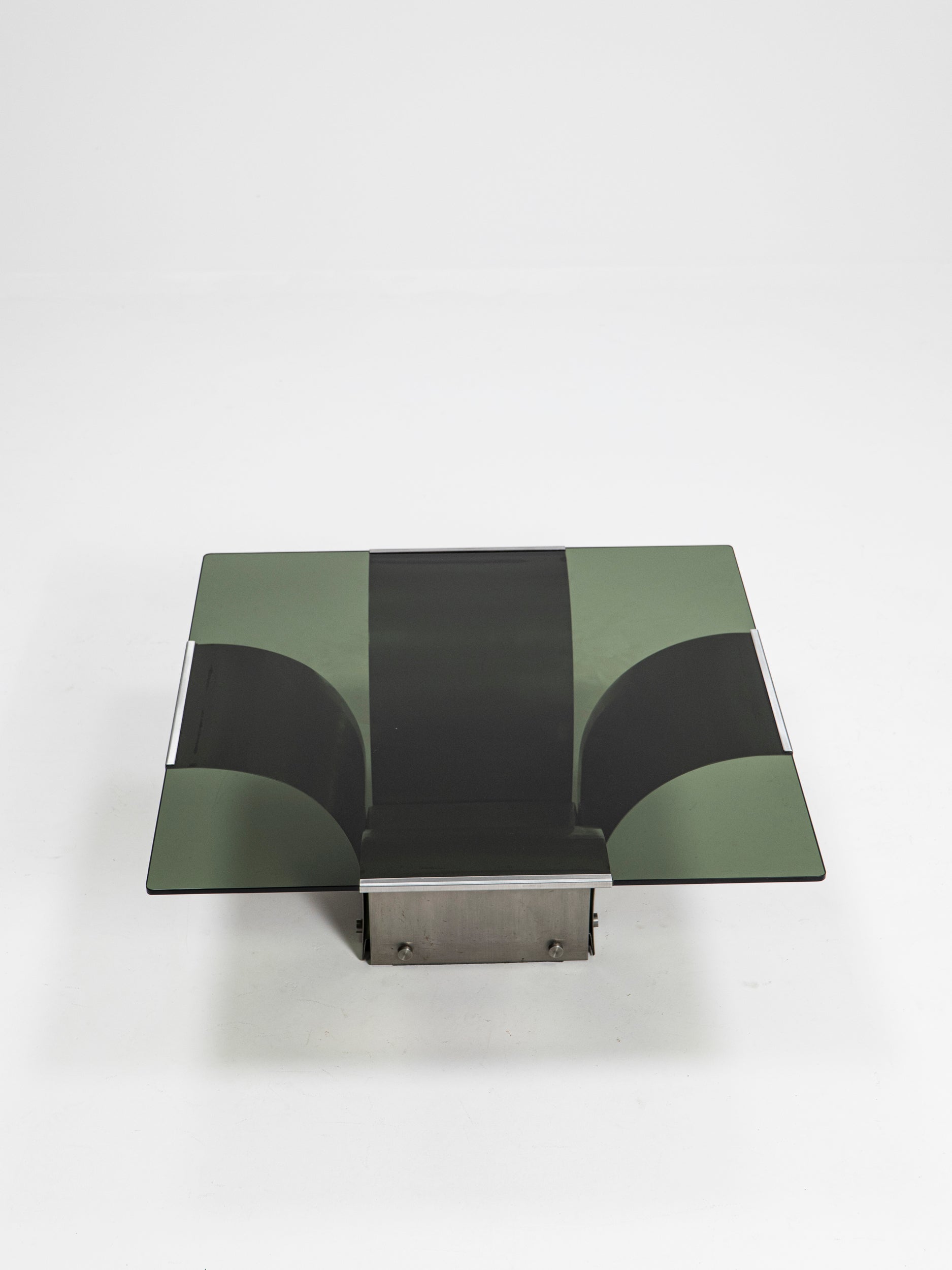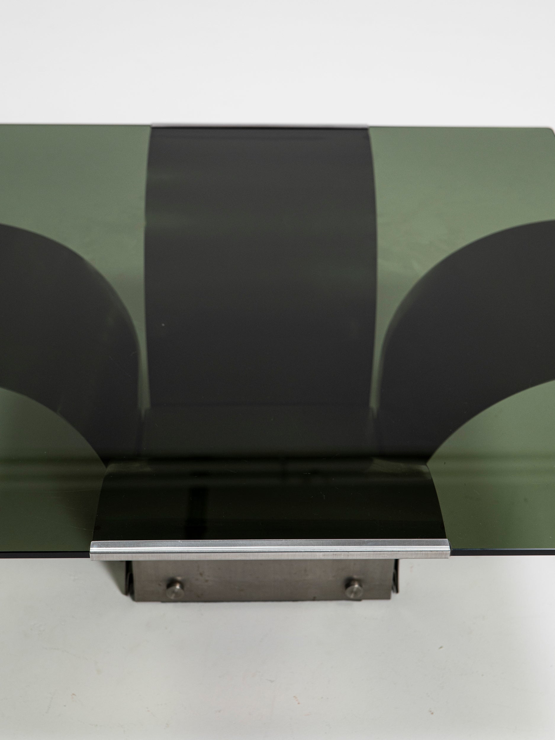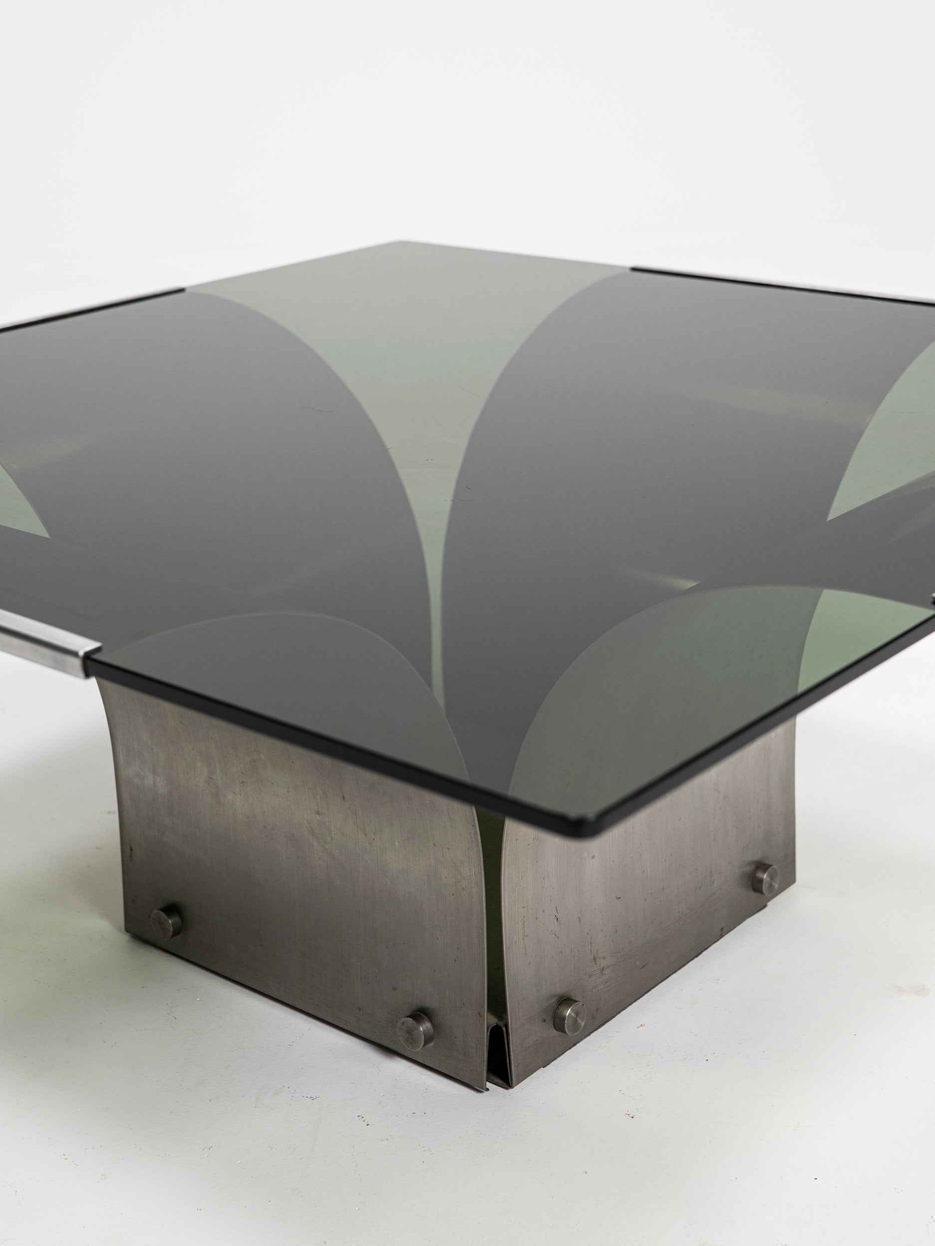 Composed out of four identical bent sheet metal pieces holding up a square smoked glass tabletop, this particular coffee table is one of François Monnet many iterations for Kappa featuring simple but effective design experiments. The sheets are bolted to a square frame at the bottom, and bent at the top so as to hold the glass pane. The magic happens in between, effortlessly so.