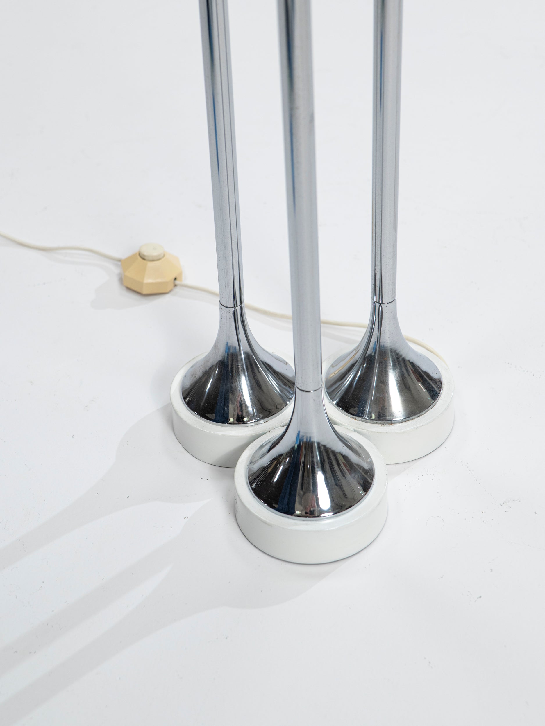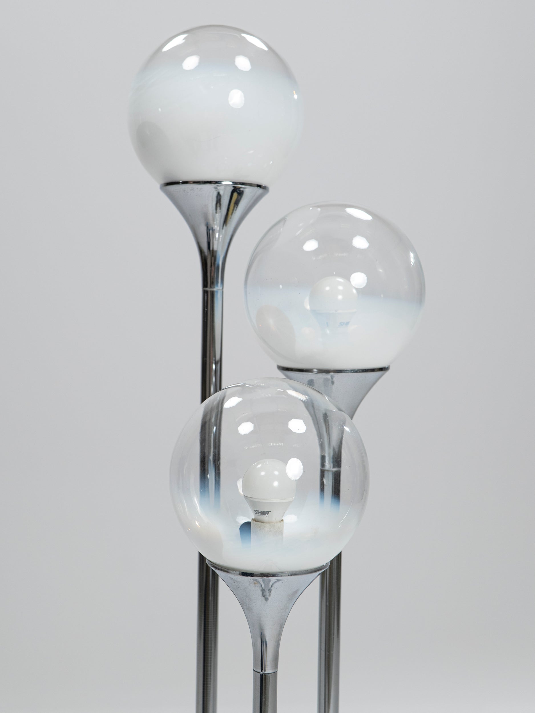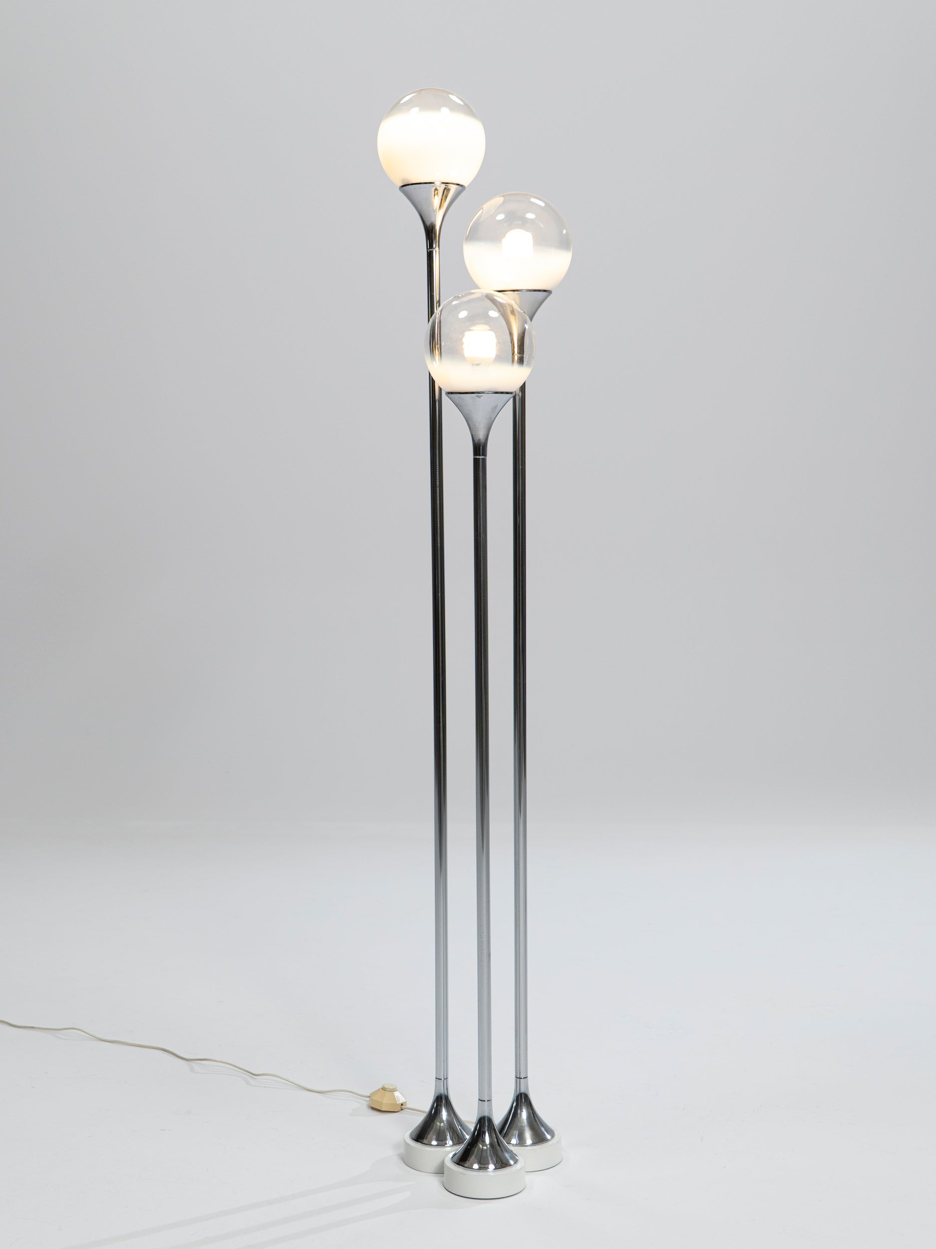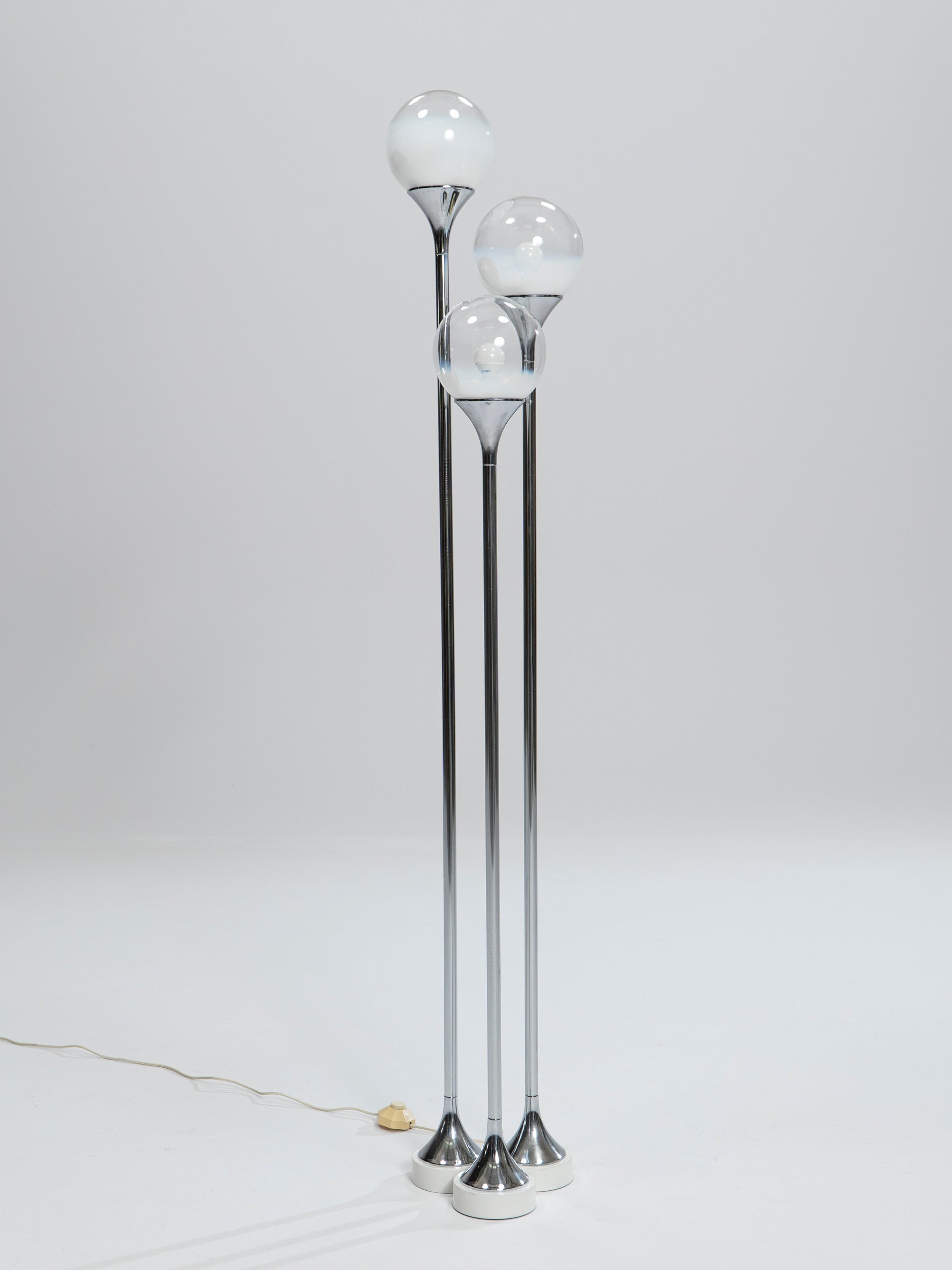 This charming floor lamp produced by Targetti features a lovely design, and does it three times over. Starting from a bottom, the lamp's chrome base squeezes into a slim column which rises up, then flares out to hold a lovely 17 cm diameter glass globe. The globe's bottom part is whitened, so that it casts diffuse light to the sides, and clear light upwards. Multiply this by three, at different heights, and what you get is nothing short of lovely. The lamp is in perfect working order, and it is turned on and off using its footswitch.