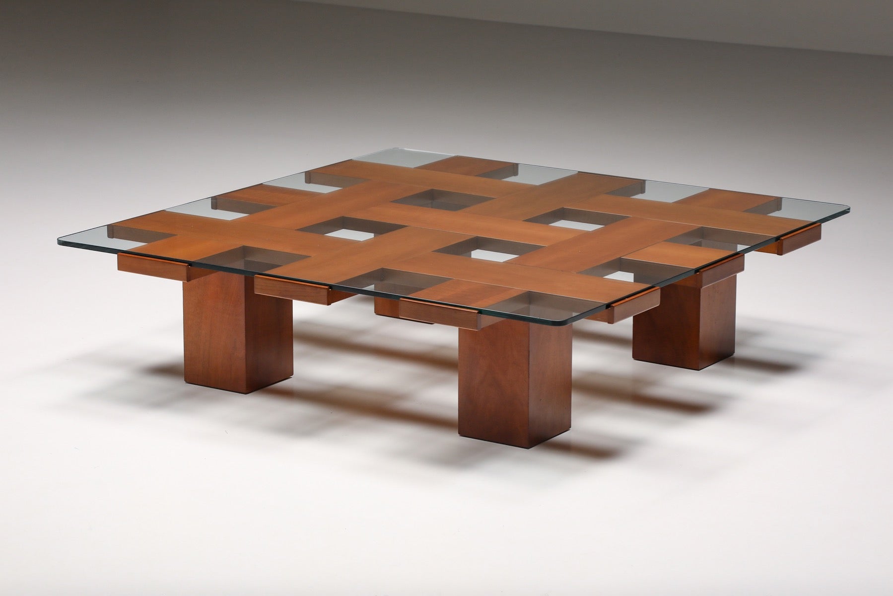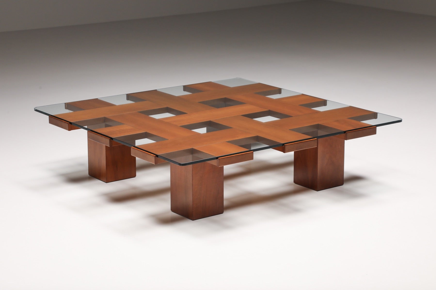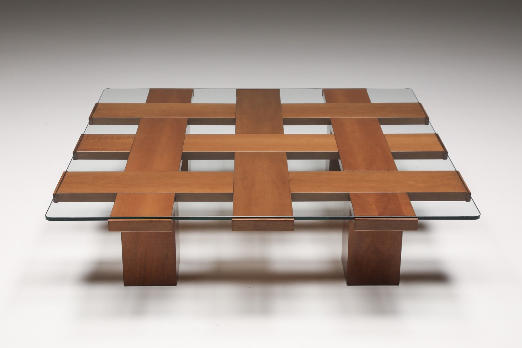 It takes noting more than a quick look to see the sheer class displayed by this coffee table. Its designer, unknown to us today, had a taste for simplicity, an eye for details, and a firm understanding of proportions. The thick glass tabletop is held in place by sleek elements placed at the ends of the intertwined walnut boards that make up this exquisite table's frame. The frame, in turn, rests upon four square-section legs and that completes what we consider to be a series of excellent design choices.