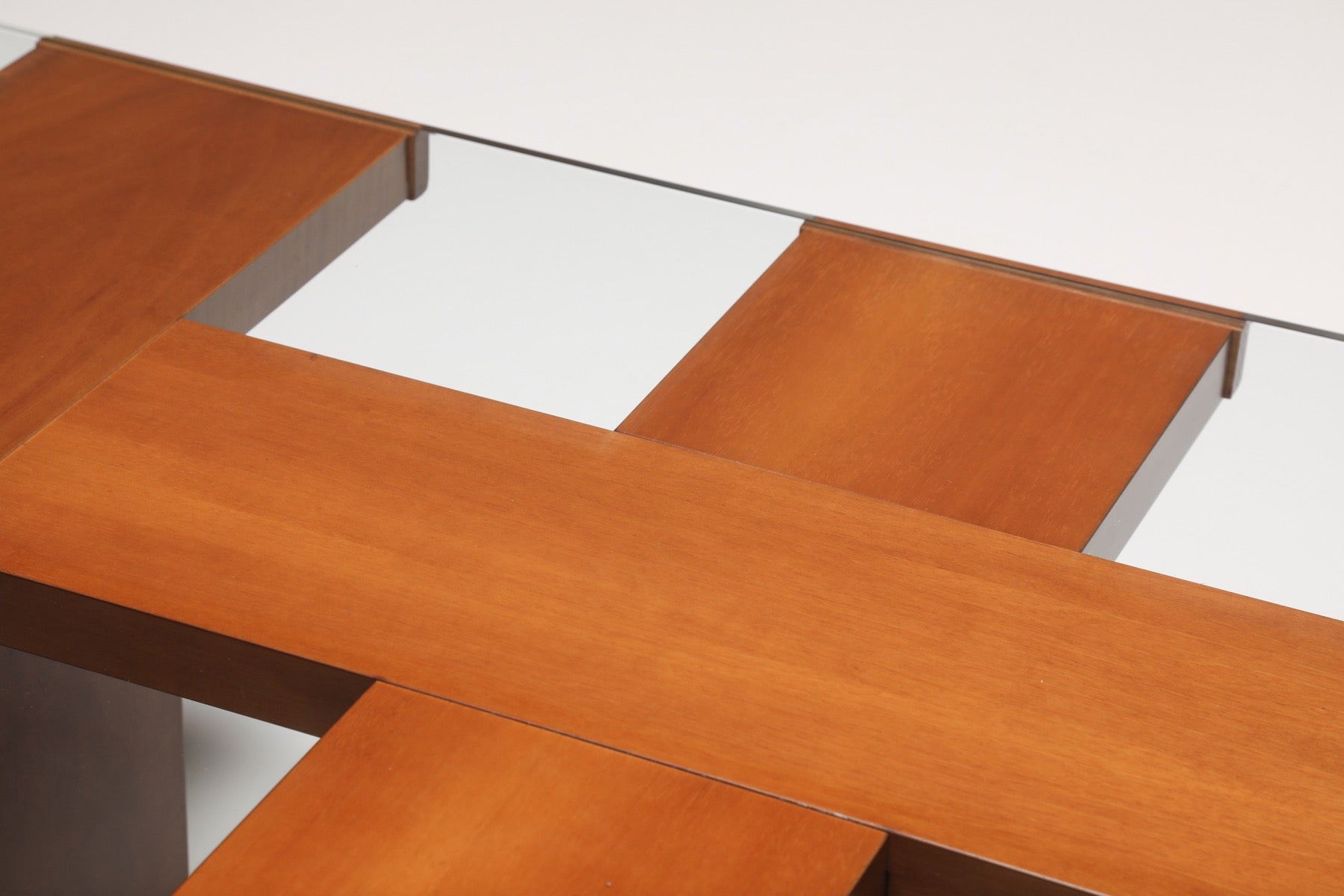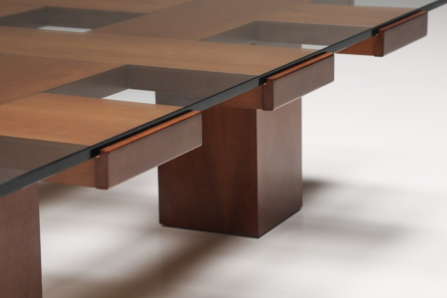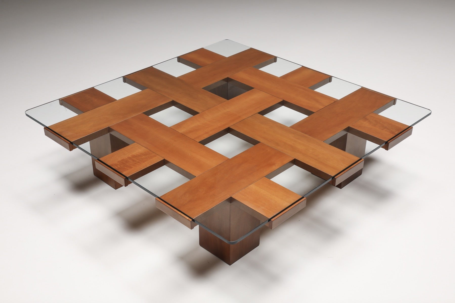 It takes noting more than a quick look to see the sheer class displayed by this coffee table. Its designer, unknown to us today, had a taste for simplicity, an eye for details, and a firm understanding of proportions. The thick glass tabletop is held in place by sleek elements placed at the ends of the intertwined walnut boards that make up this exquisite table's frame. The frame, in turn, rests upon four square-section legs and that completes what we consider to be a series of excellent design choices.
