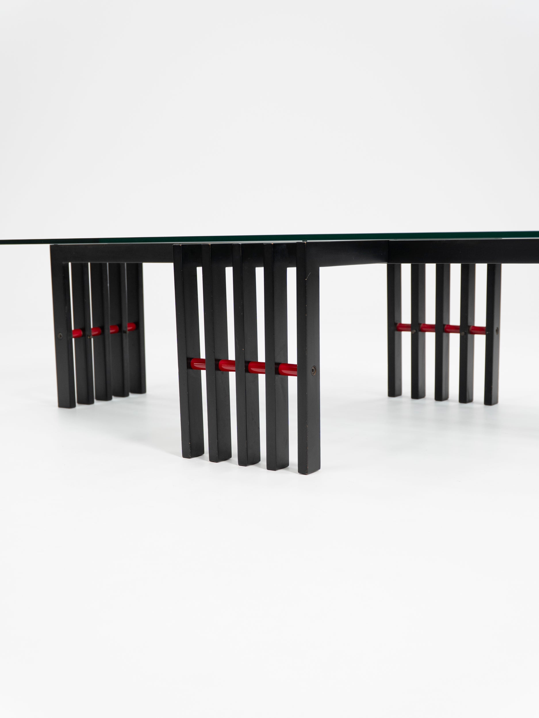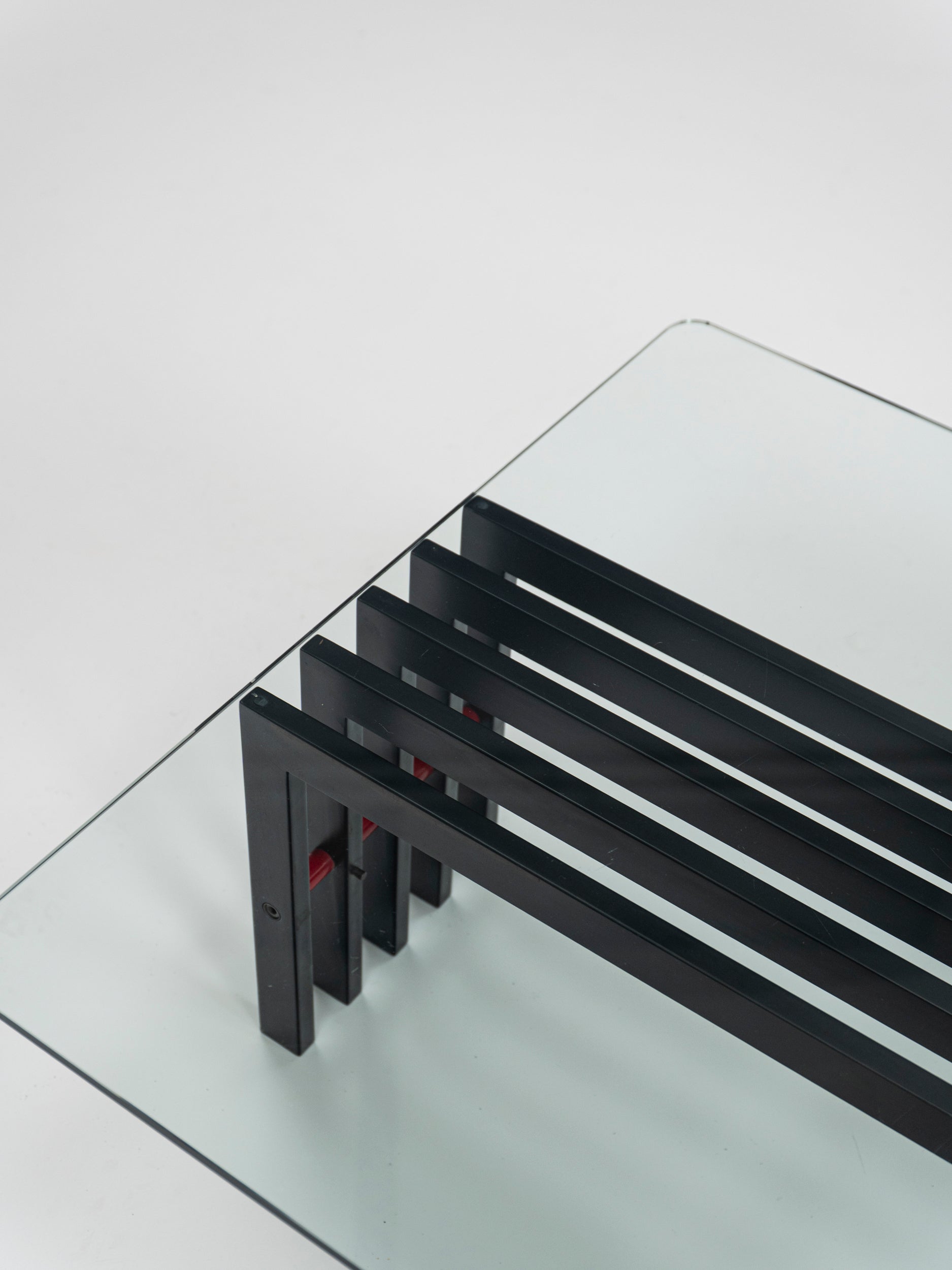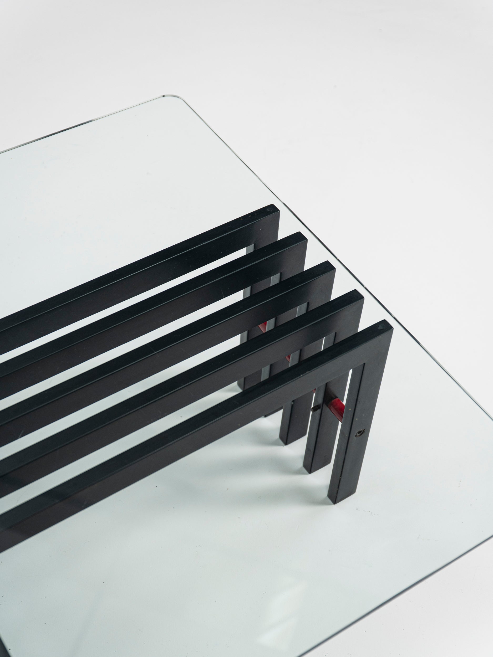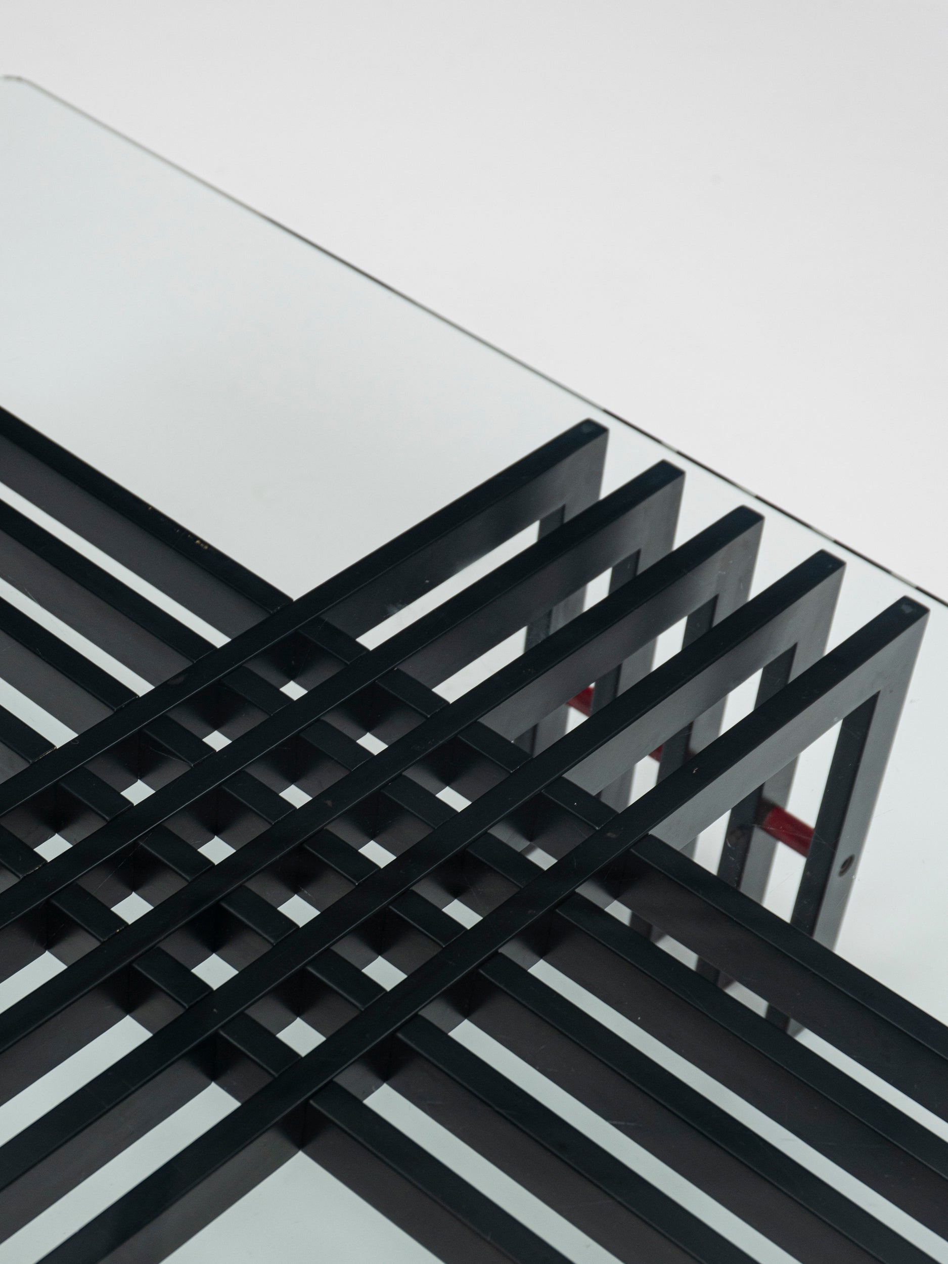 This 70s Italian coffee table's design features constructive solutions taken straight out of architectural joinery's playbook. The slender wooden beams, in packs of five, interlock in the middle, then go off to the sides, where they turn 90° towards the floor. Halfway down, a metal crossbeam connects them together, ensuring that the whole structure is sound. The materials used are colour-coded: black for wood and red for metal. The wooden bits are rectangular, the metal ones cylindrical, and thick smoked glass, featuring gently beveled corners, tops everything. The resulting piece is as much rational as it is elegant.