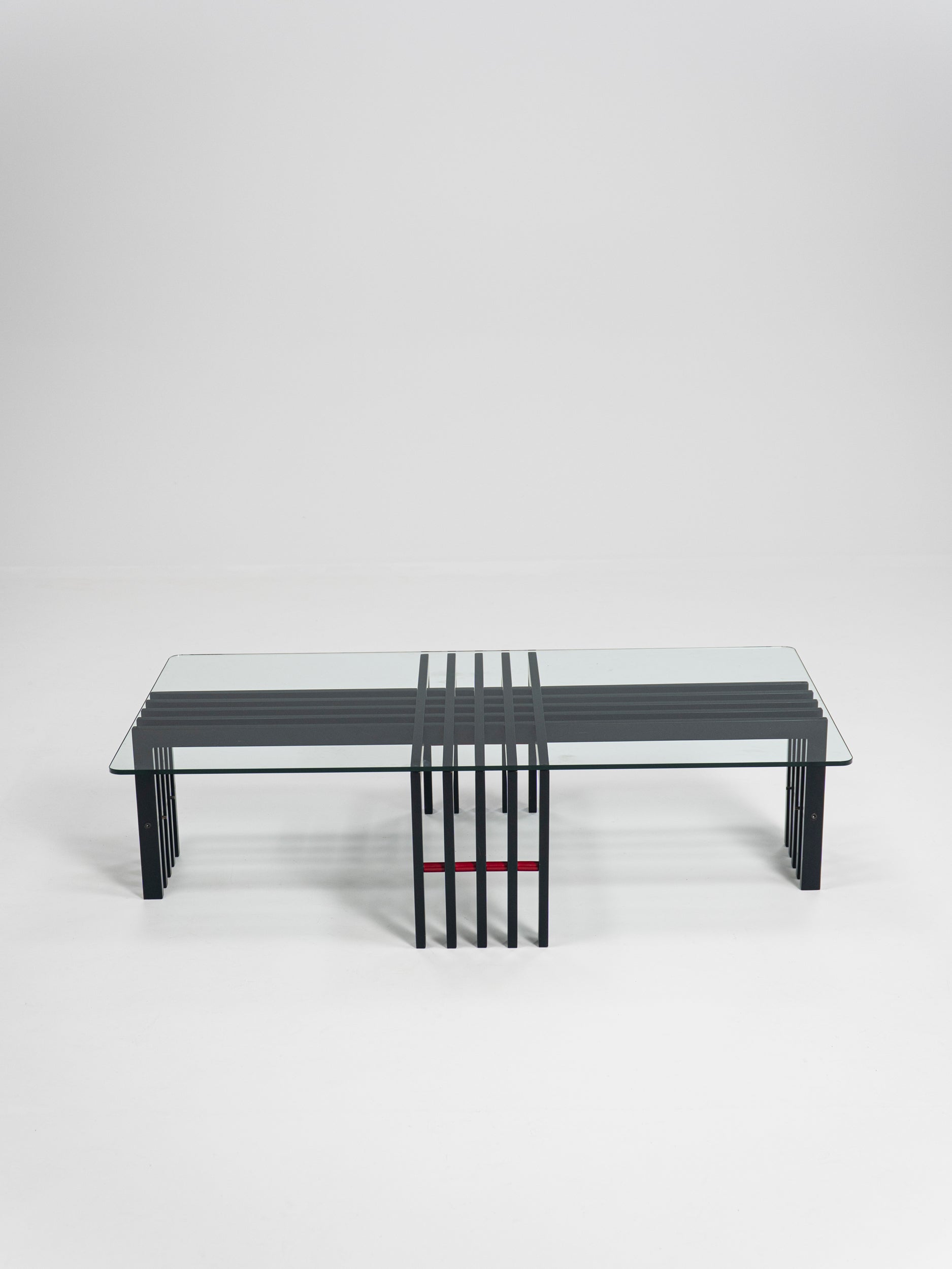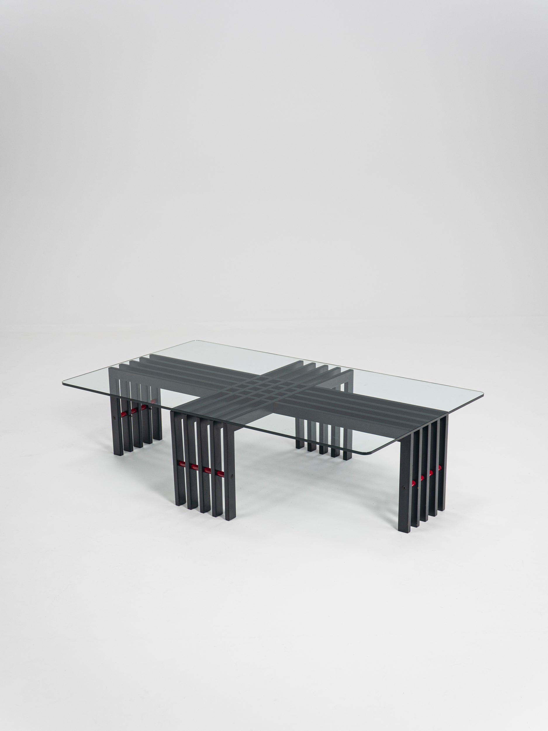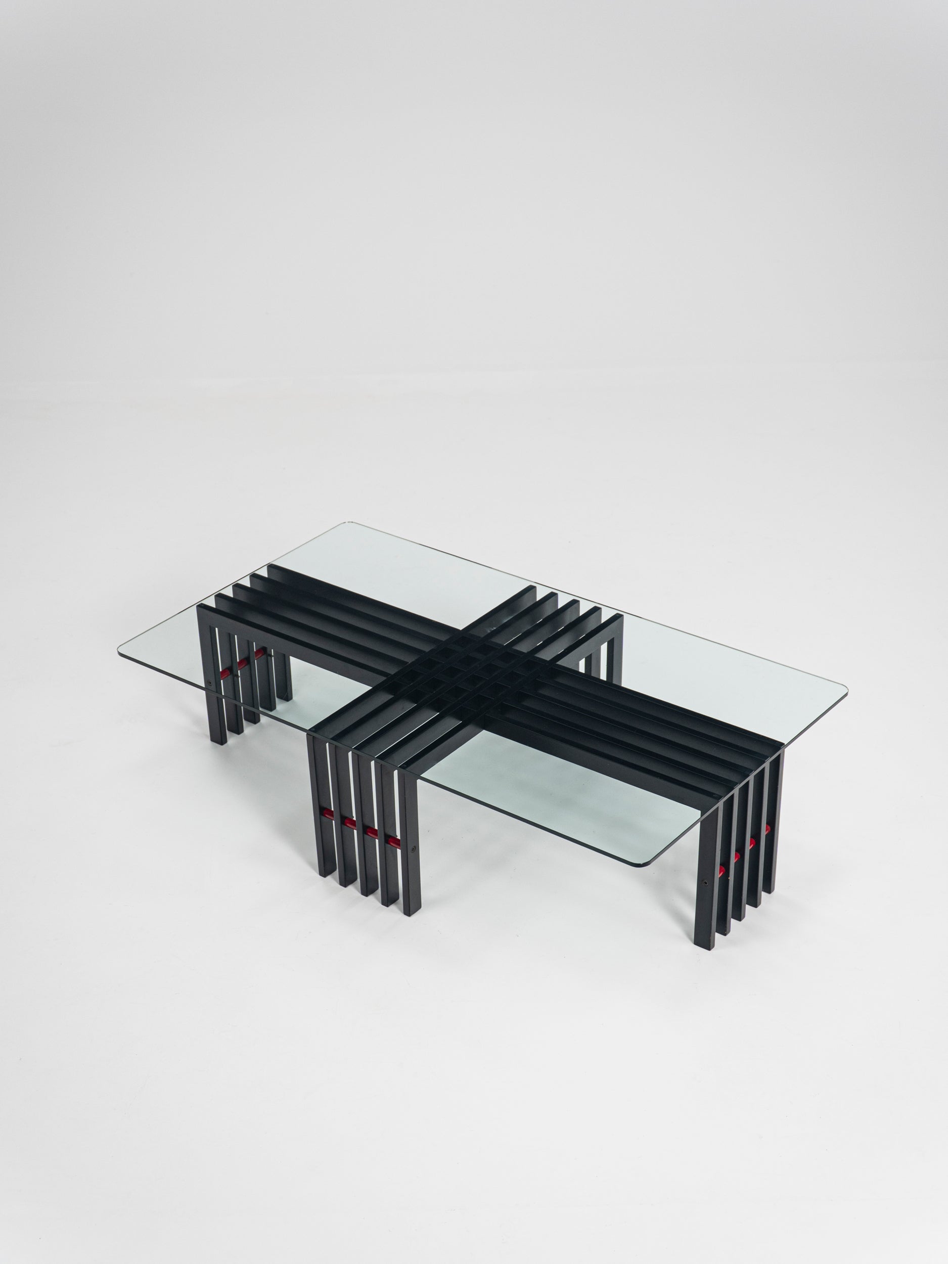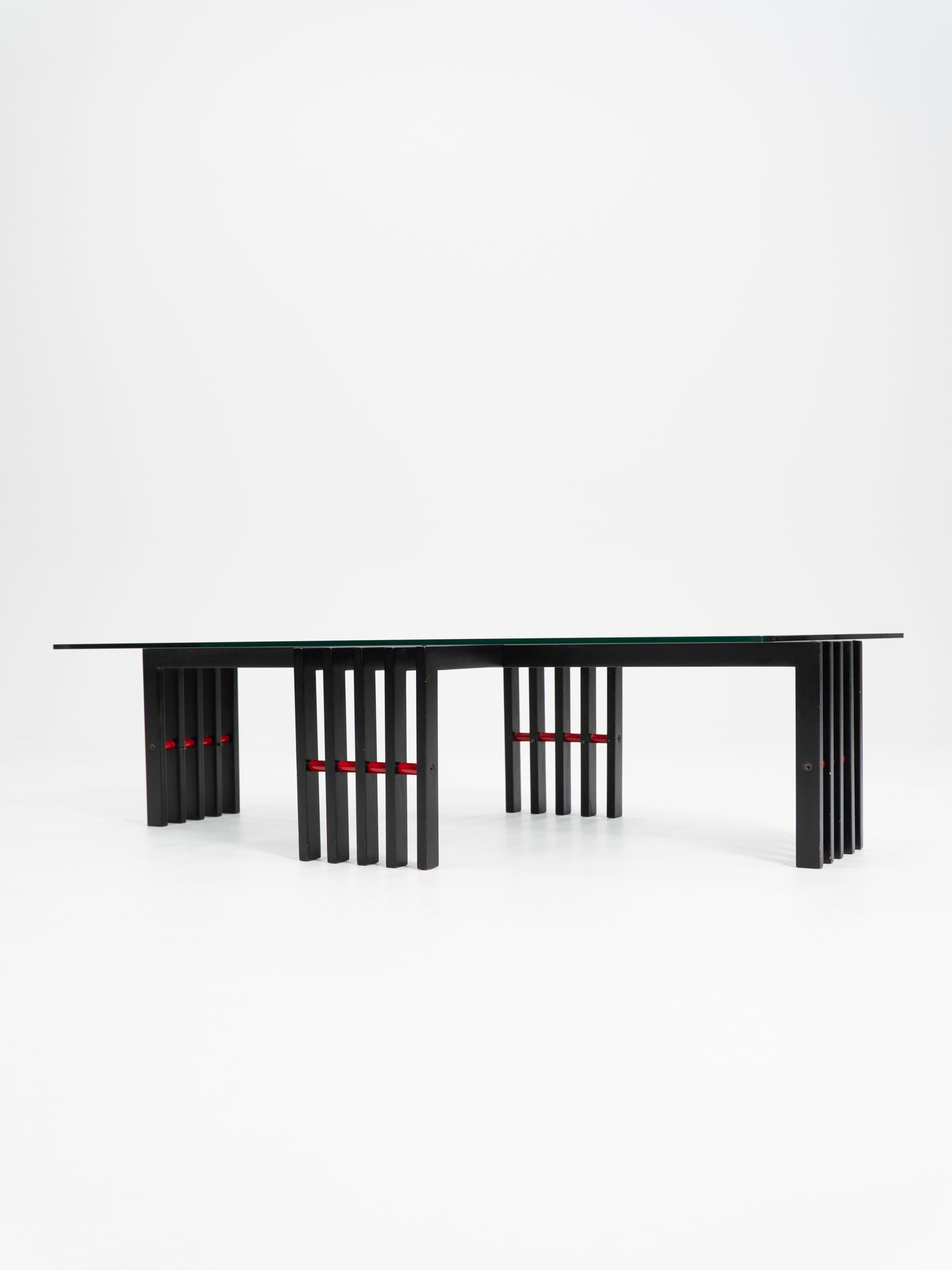 This 70s Italian coffee table's design features constructive solutions taken straight out of architectural joinery's playbook. The slender wooden beams, in packs of five, interlock in the middle, then go off to the sides, where they turn 90° towards the floor. Halfway down, a metal crossbeam connects them together, ensuring that the whole structure is sound. The materials used are colour-coded: black for wood and red for metal. The wooden bits are rectangular, the metal ones cylindrical, and thick smoked glass, featuring gently beveled corners, tops everything. The resulting piece is as much rational as it is elegant.